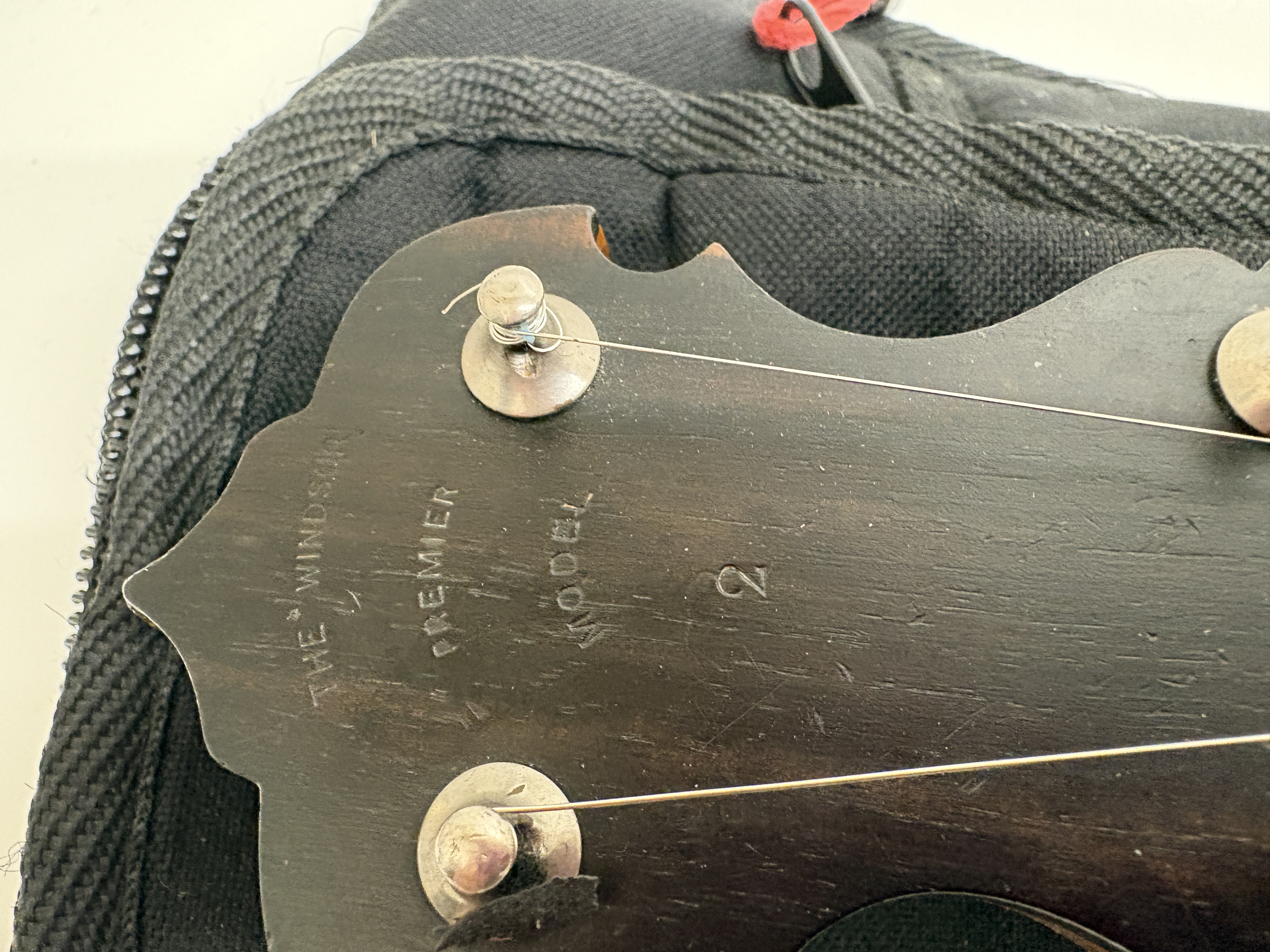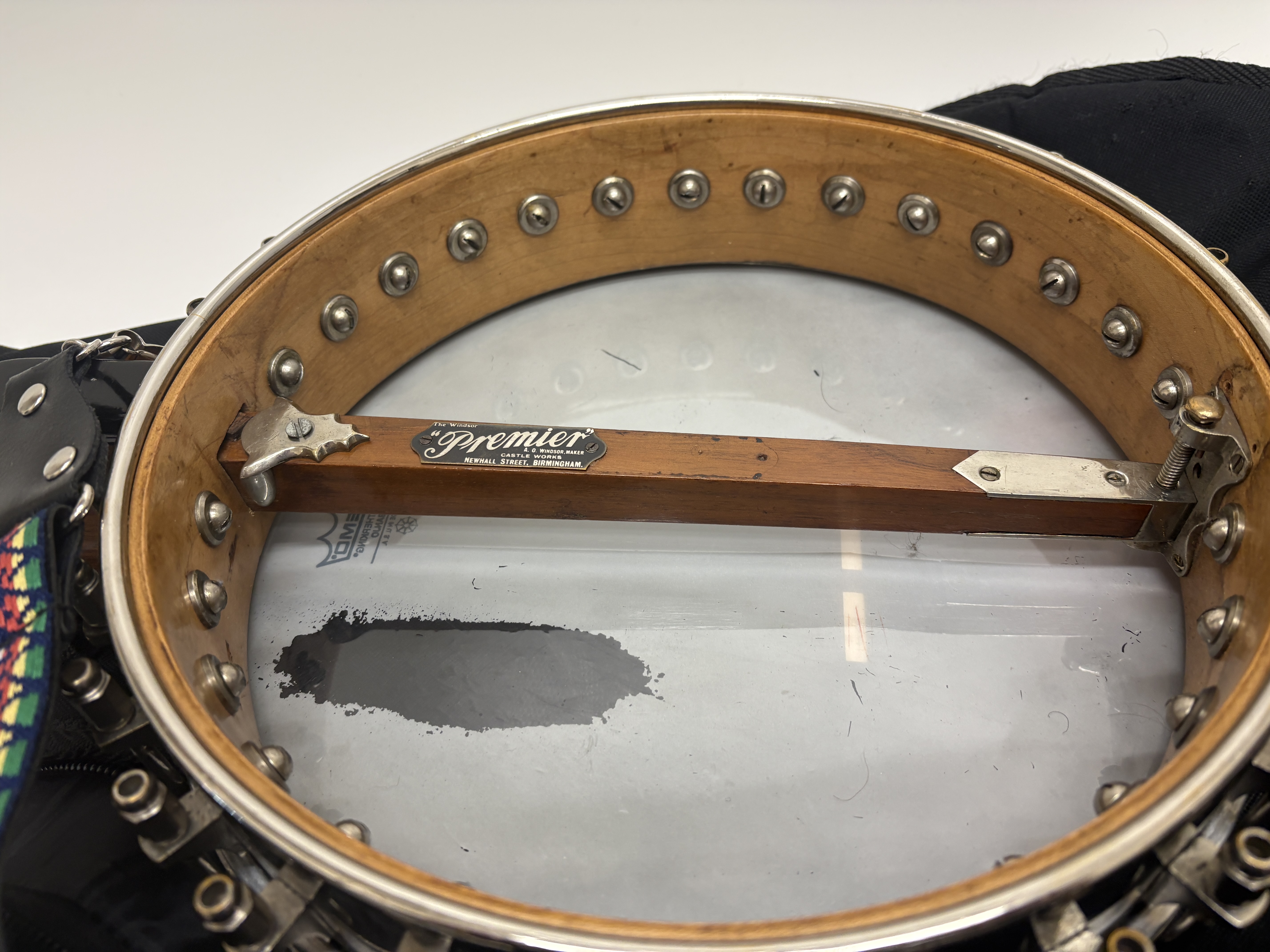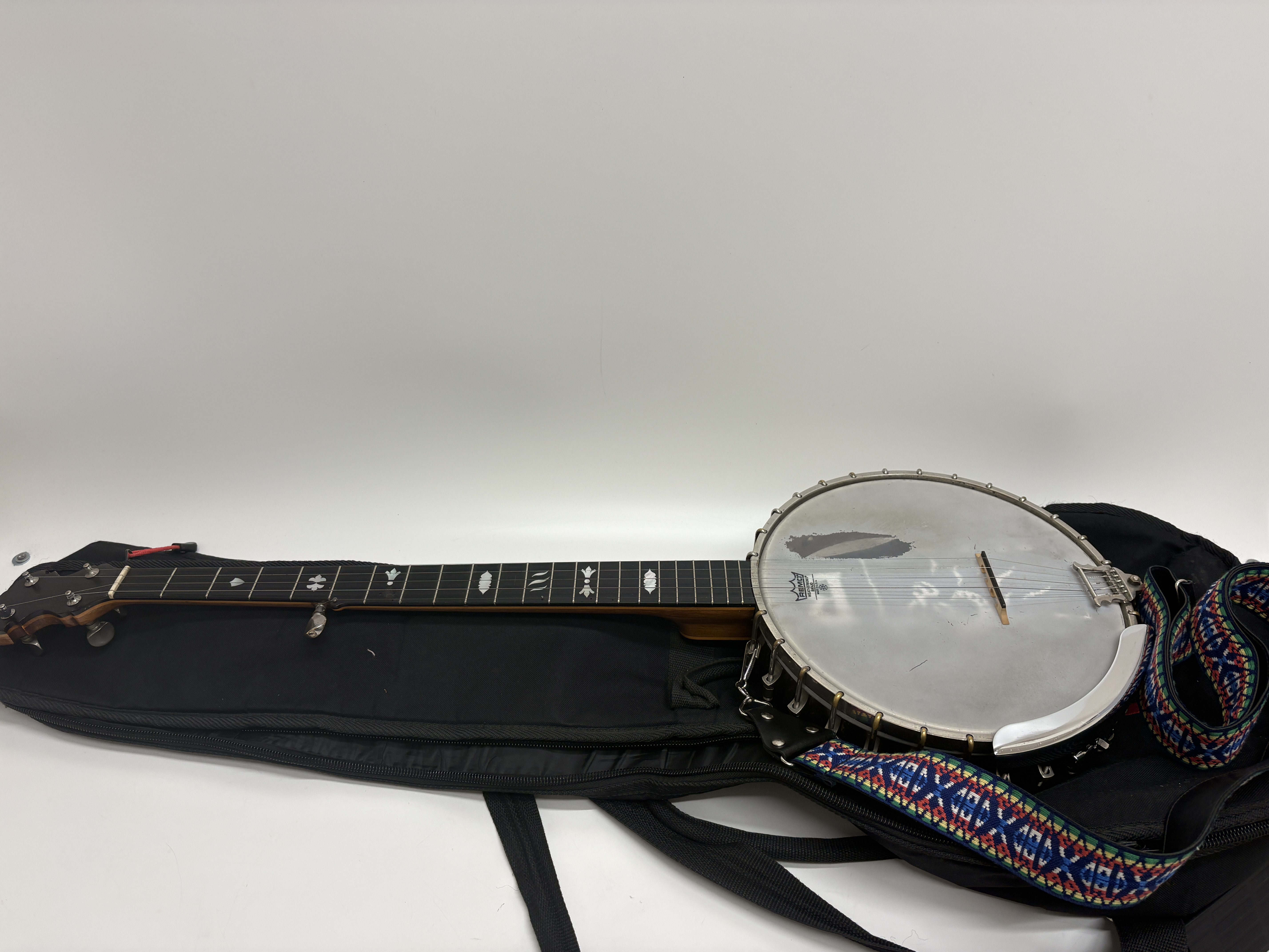 This vintage five-string banjo is a notable product of the A. O. Windsor company, manufactured at the Castle Works on Newhall Street in Birmingham, England. Designated as The Windsor Premier Model 2, the instrument features a wooden neck embellished with ornate mother-of-pearl floral and geometric inlays across the fretboard. The shaped headstock is clearly stamped with the model identification on the reverse. The construction includes a wooden rim with a series of metal tension hooks and an internal wooden dowel stick bearing the maker’s authentic metal plaque. The instrument is equipped with a chrome-finished armrest and a metal tailpiece. It is sold with a patterned woven textile strap and a black soft gig bag. Measurements not provided.