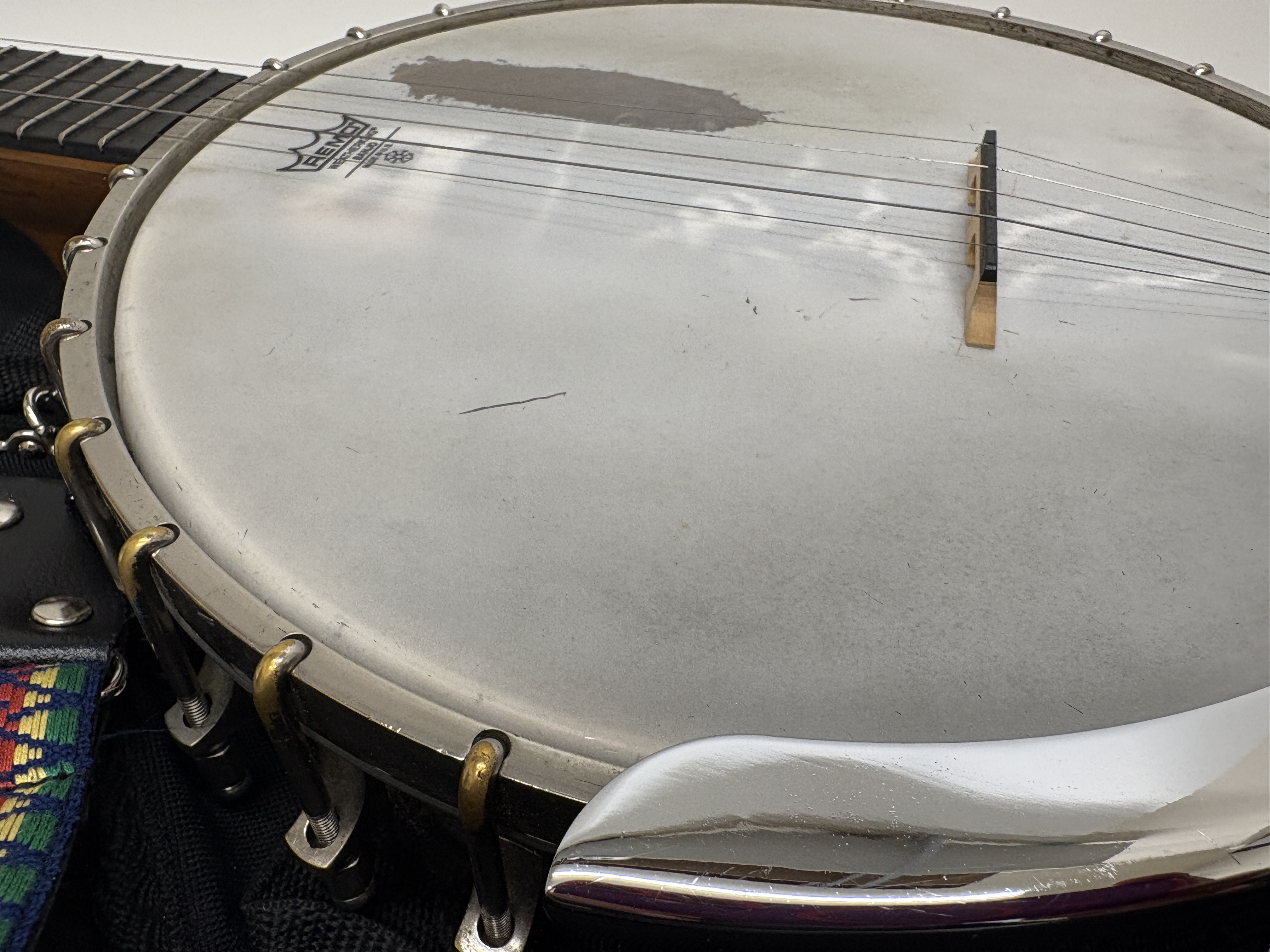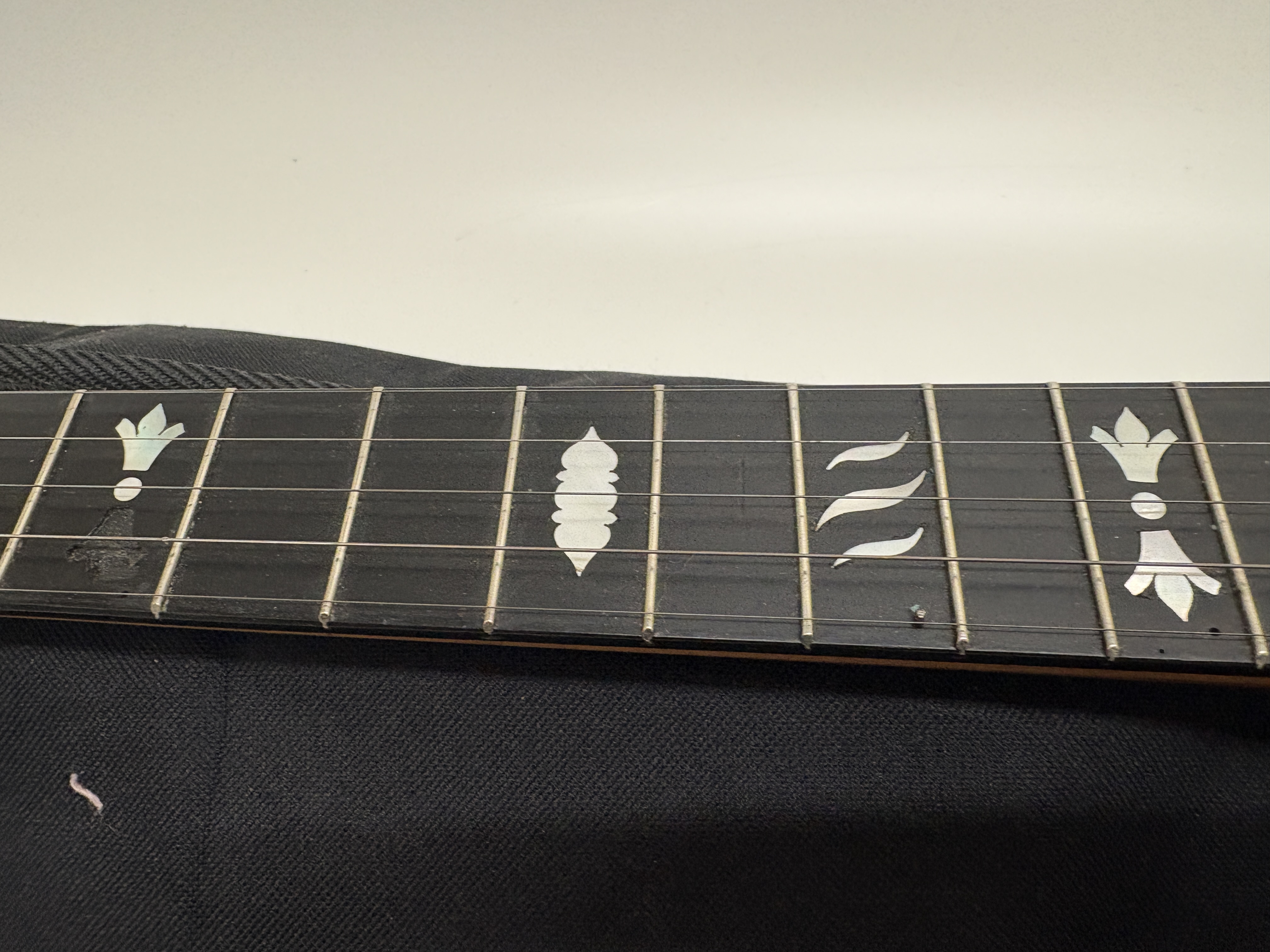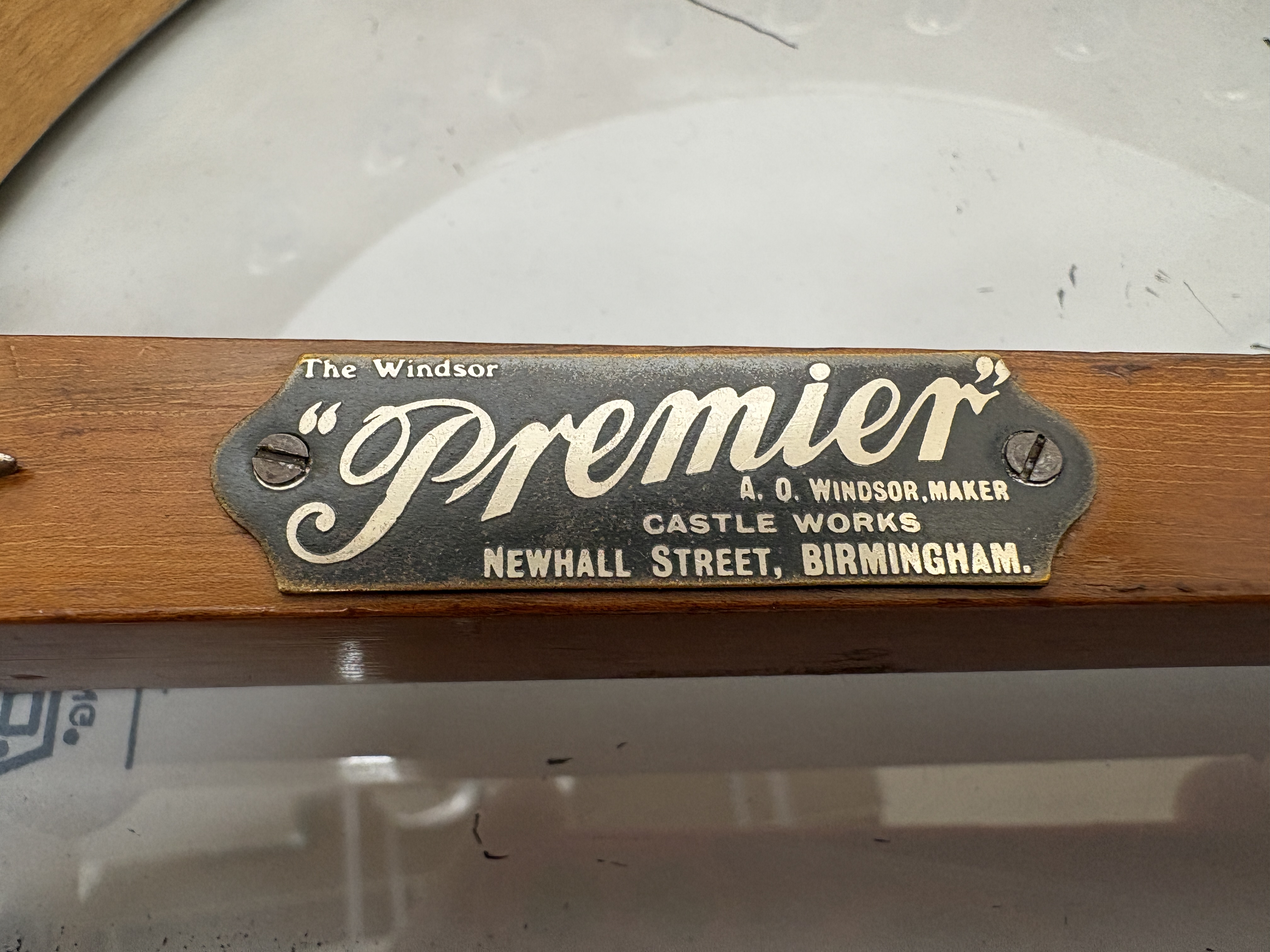 This vintage five-string banjo is a notable product of the A. O. Windsor company, manufactured at the Castle Works on Newhall Street in Birmingham, England. Designated as The Windsor Premier Model 2, the instrument features a wooden neck embellished with ornate mother-of-pearl floral and geometric inlays across the fretboard. The shaped headstock is clearly stamped with the model identification on the reverse. The construction includes a wooden rim with a series of metal tension hooks and an internal wooden dowel stick bearing the maker’s authentic metal plaque. The instrument is equipped with a chrome-finished armrest and a metal tailpiece. It is sold with a patterned woven textile strap and a black soft gig bag. Measurements not provided.