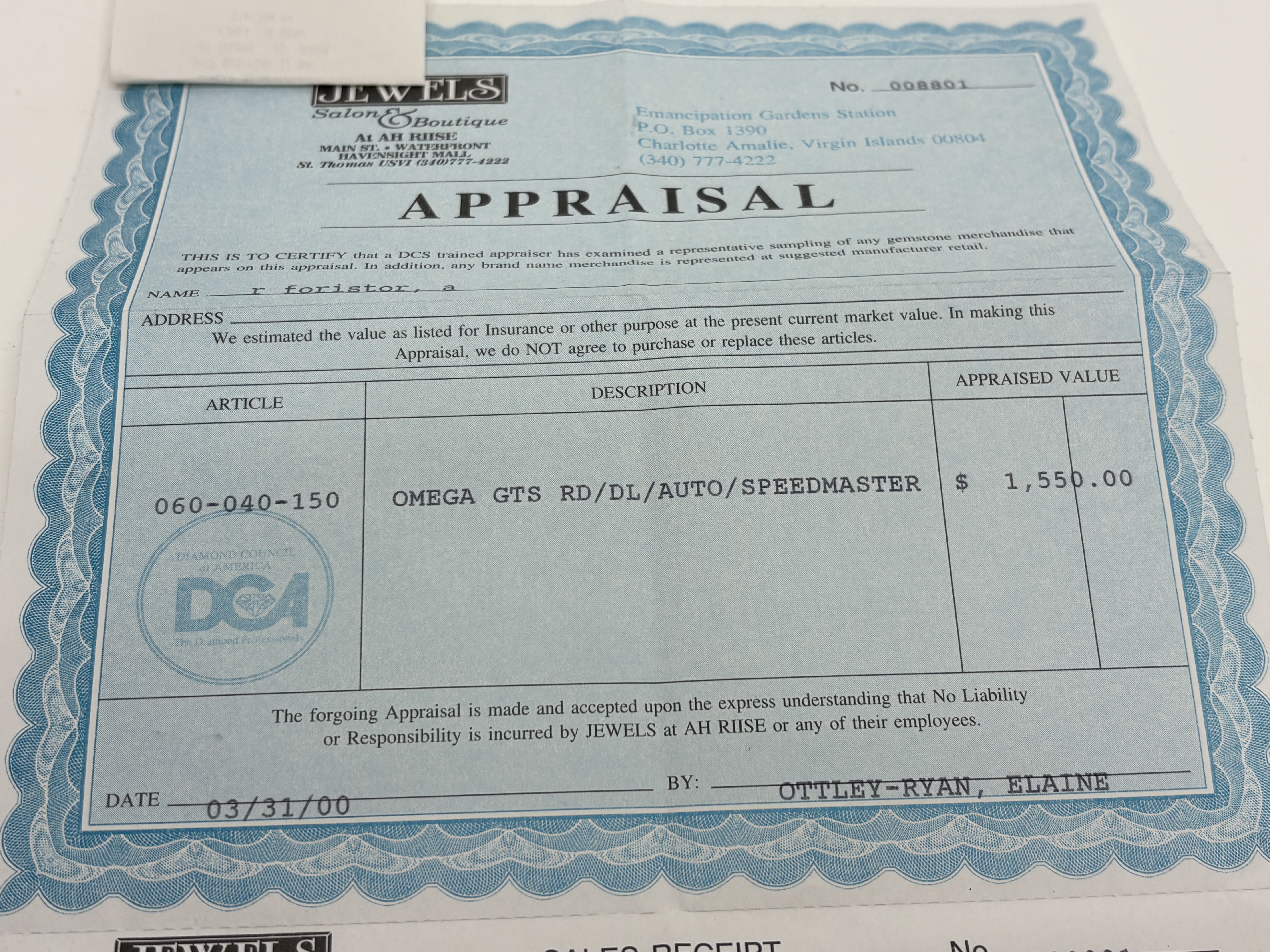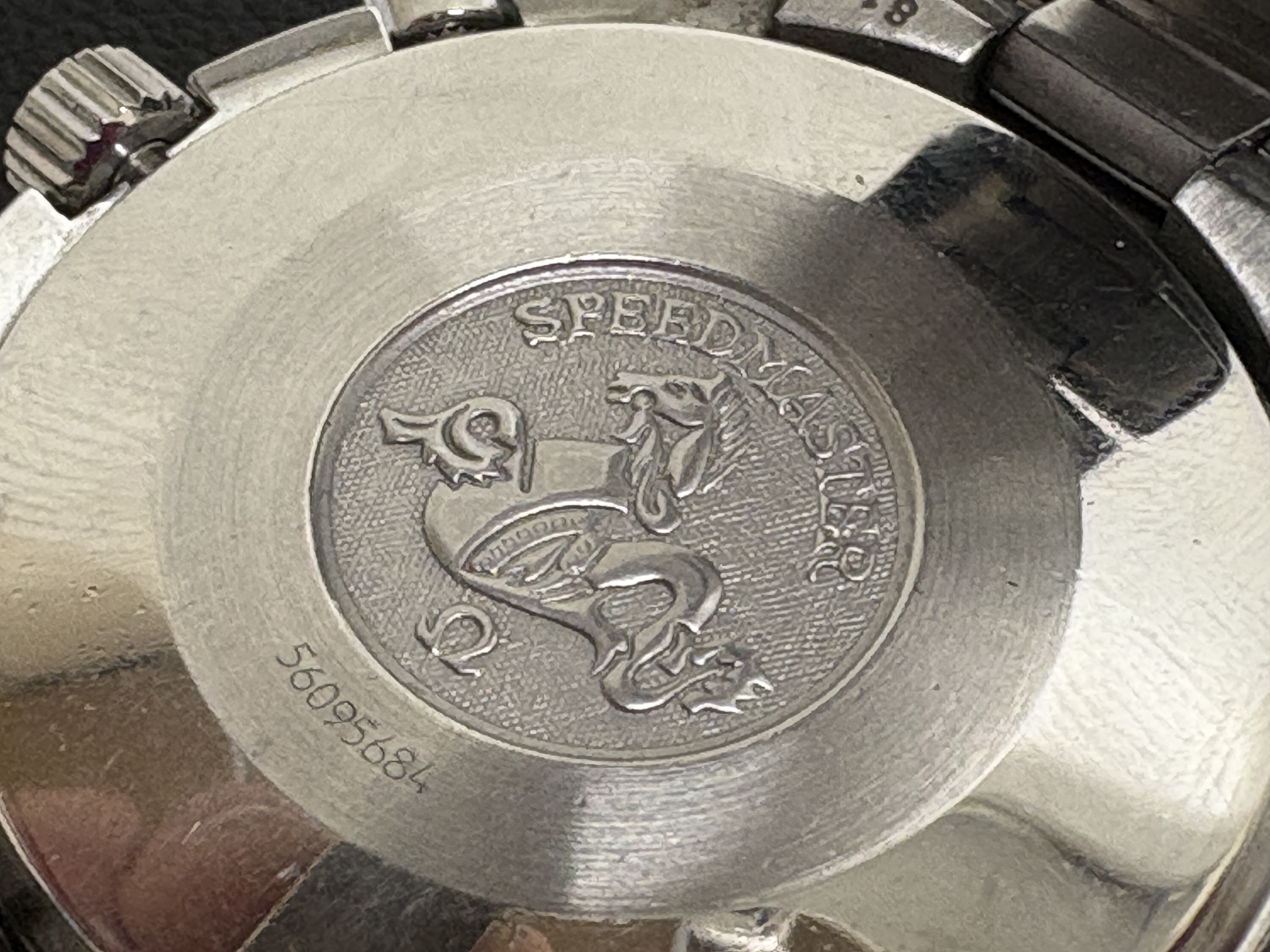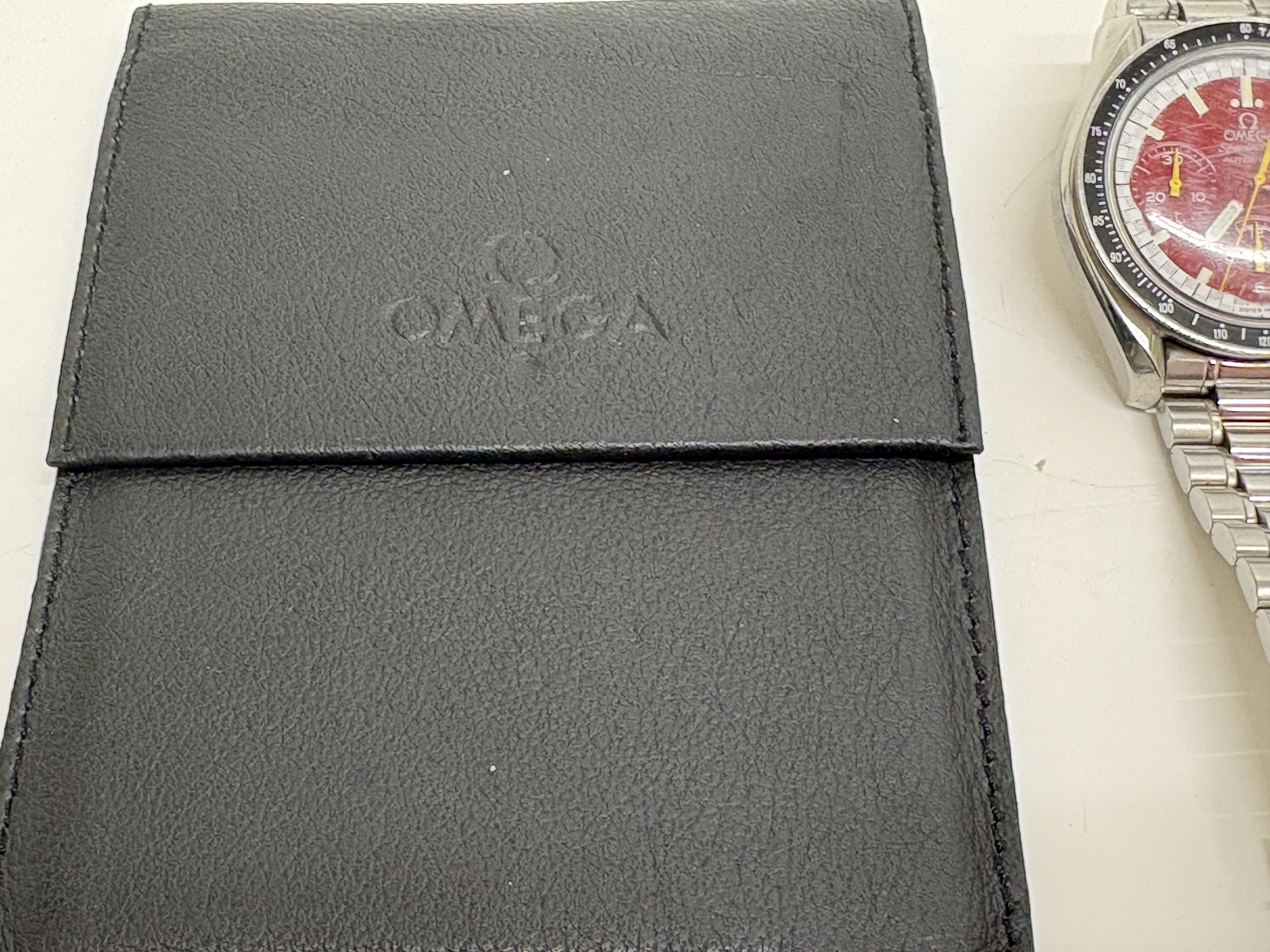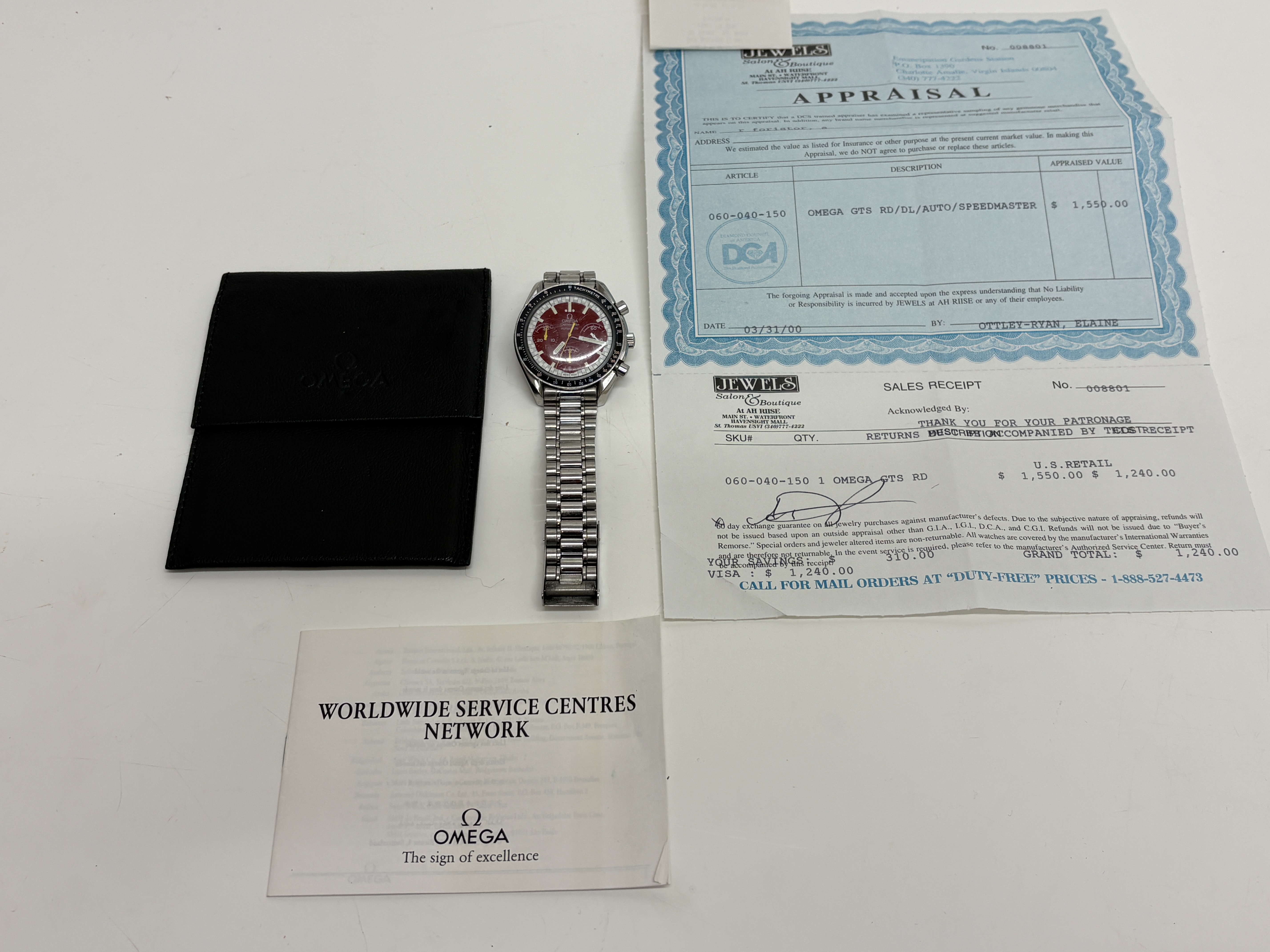 An Omega Speedmaster Automatic Racing wristwatch featuring a stainless steel case and a red dial with white and yellow accents. The dial includes three sub-dials and is surrounded by a black tachymeter bezel. The watch is mounted on a stainless steel link bracelet with a signed deployment clasp. The case back features the Omega hippocampus logo and the serial number 56095684. This lot includes the original sales receipt and an appraisal dated March 2000 from a jeweller in the U.S. Virgin Islands, a Worldwide Service Centres Network booklet, and a black Omega-branded storage pouch.