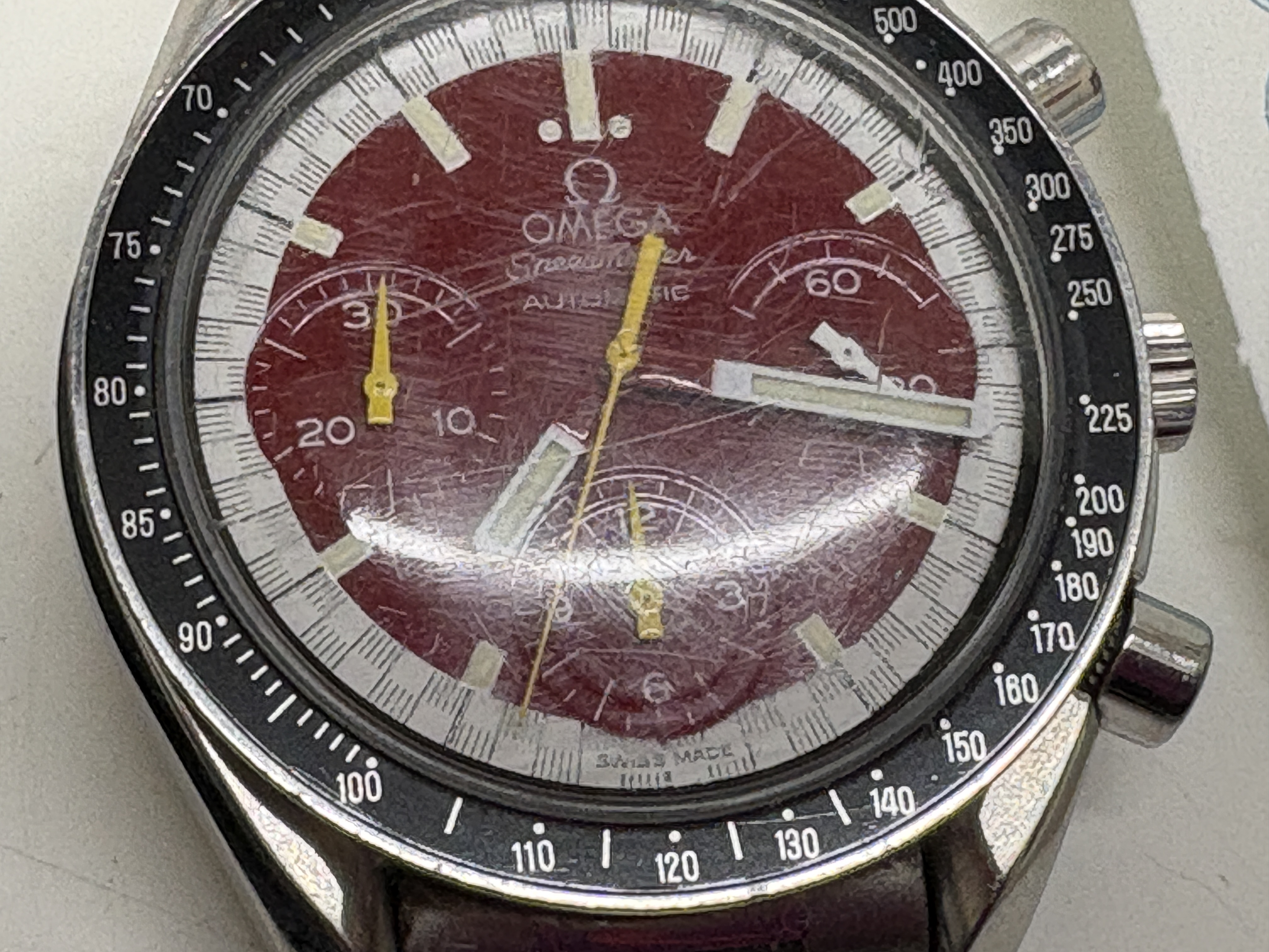 The timepiece shows visible surface wear throughout, consistent with age and regular use. There are noticeable scratches to the crystal, bezel, case, and bracelet.