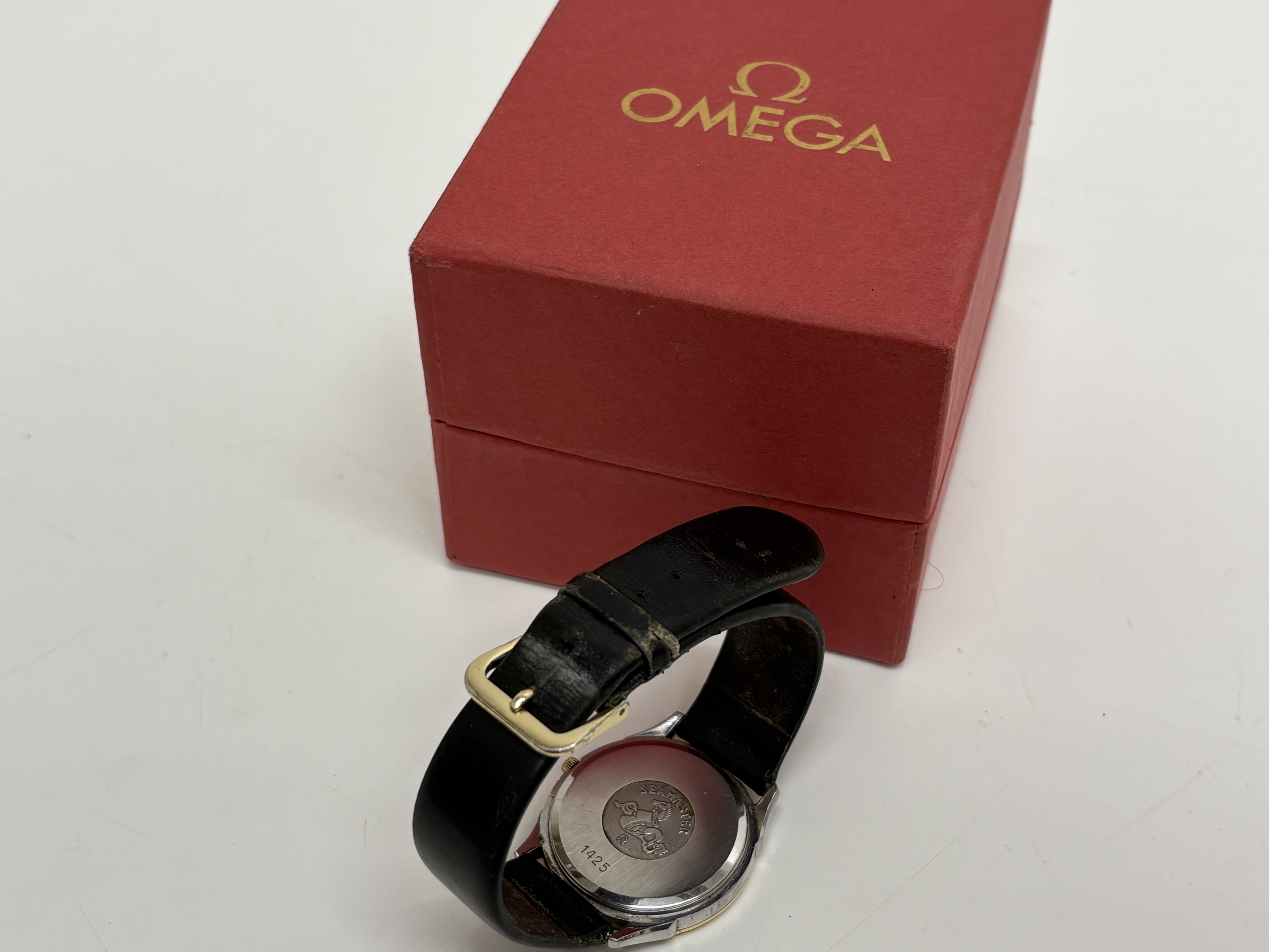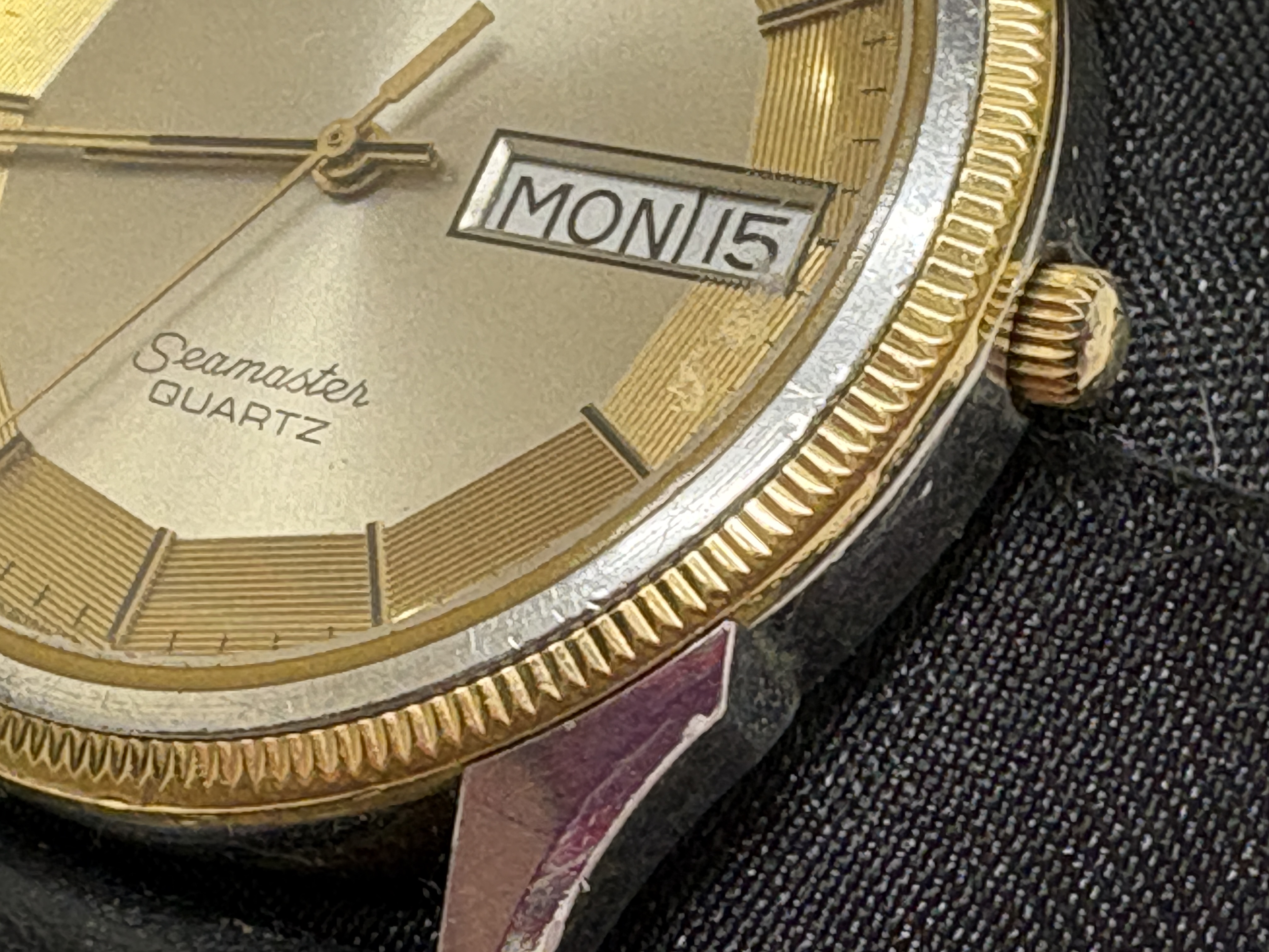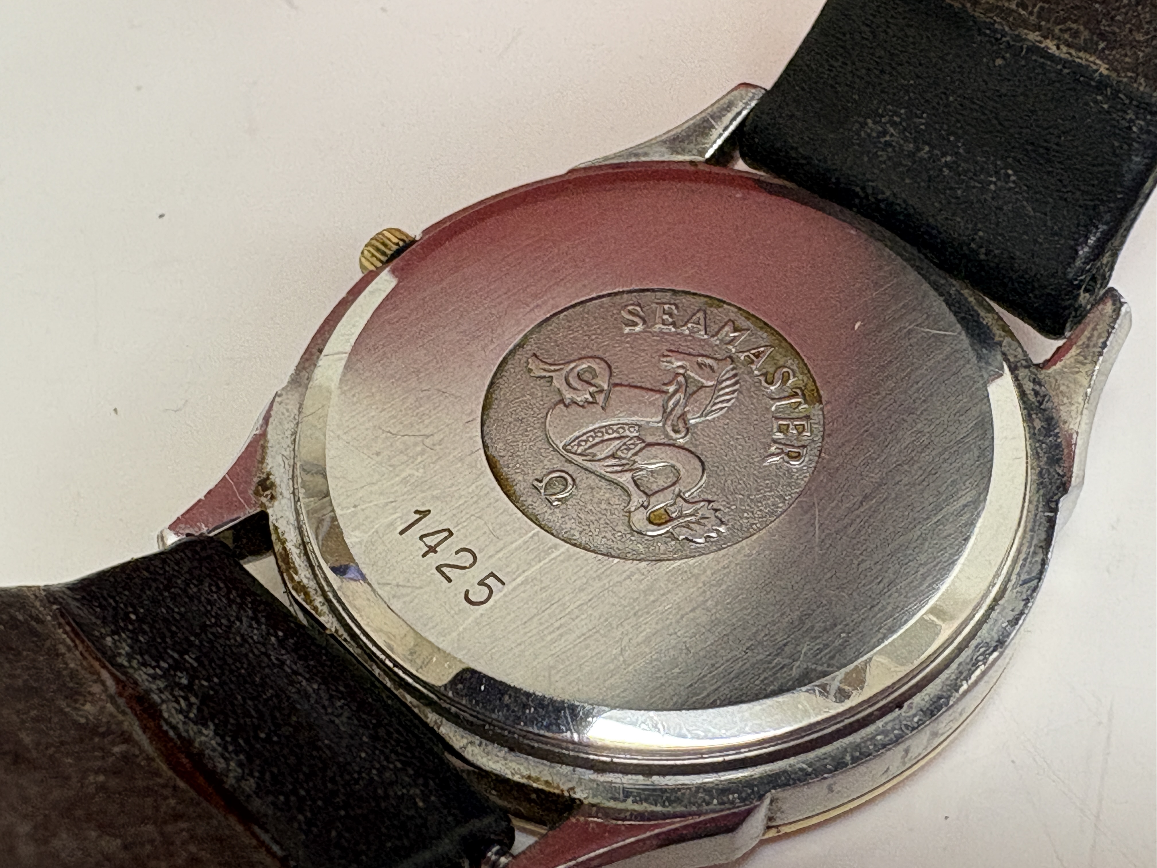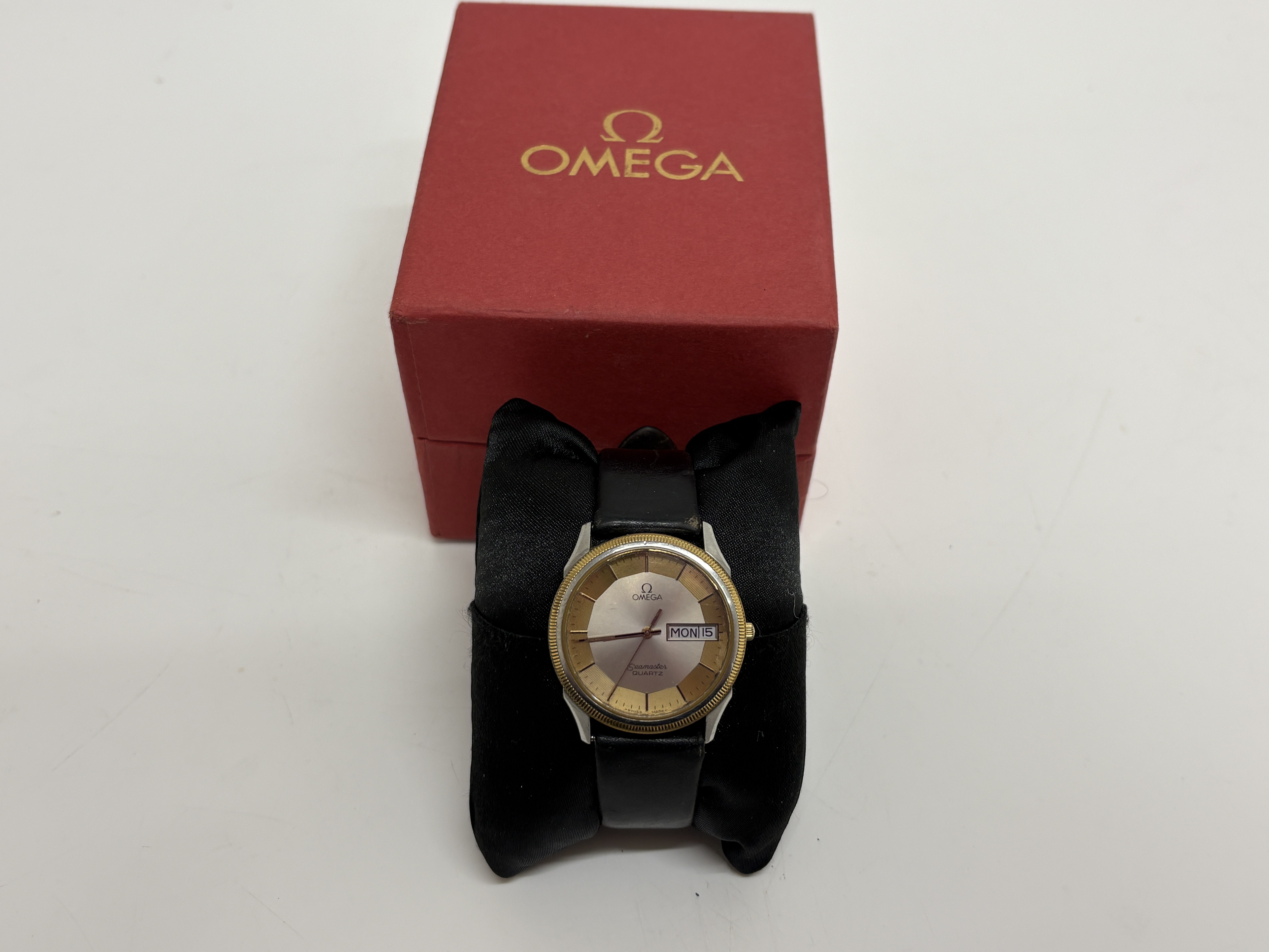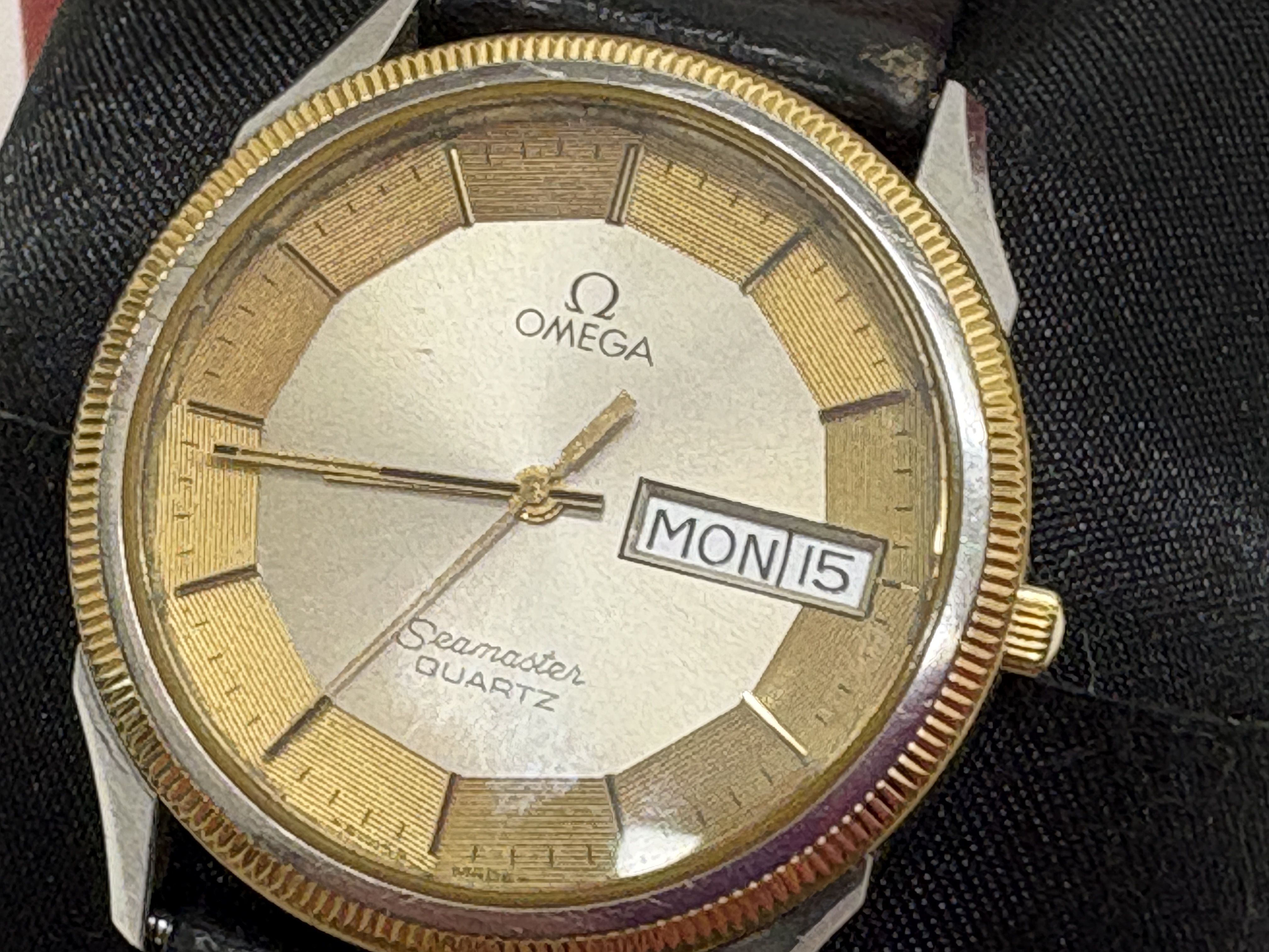 An Omega Seamaster Quartz wristwatch, reference 196.0246, featuring a stainless steel case and a gold-toned fluted bezel. The two-tone dial is finished in silver and gold with a stepped pie-pan configuration, applied baton indices, and a day-date window at the 3 o’clock position. The dial is marked with the Omega logo and Seamaster Quartz. The stainless steel case back is embossed with the Seamaster hippocampus logo and the number 1425, corresponding to the movement calibre. The watch includes a gold-toned crown and is presented on a black leather strap with a gold-toned buckle. Accompanied by a red Omega presentation box.