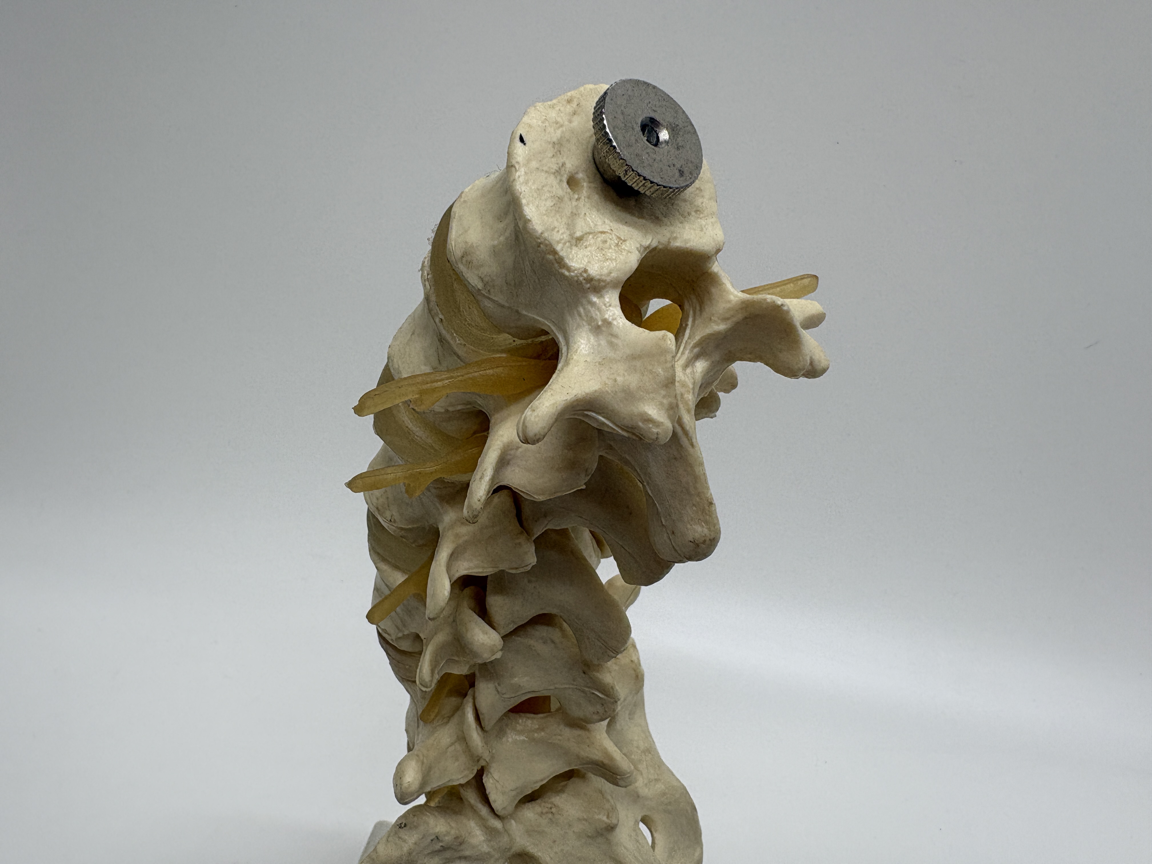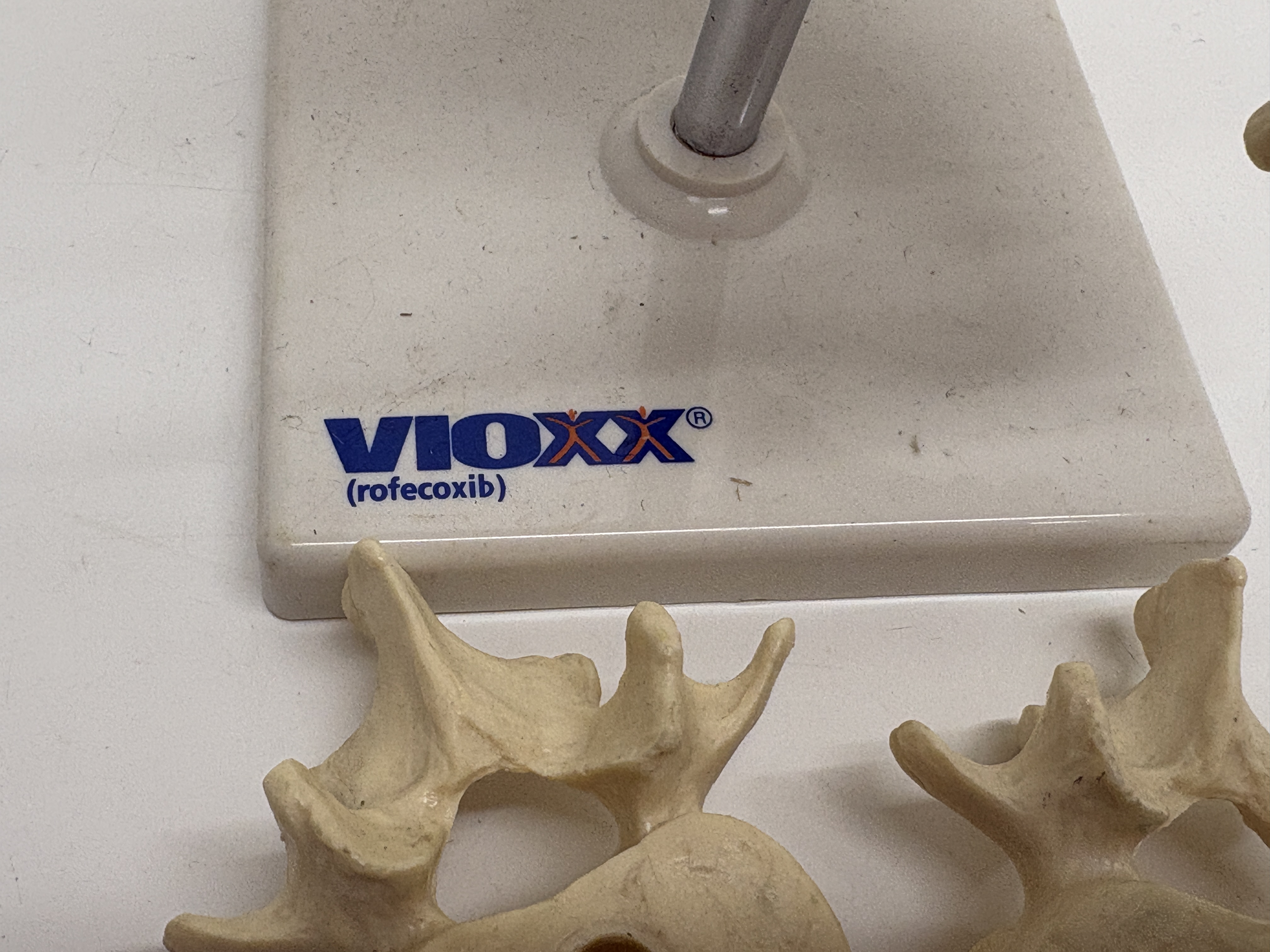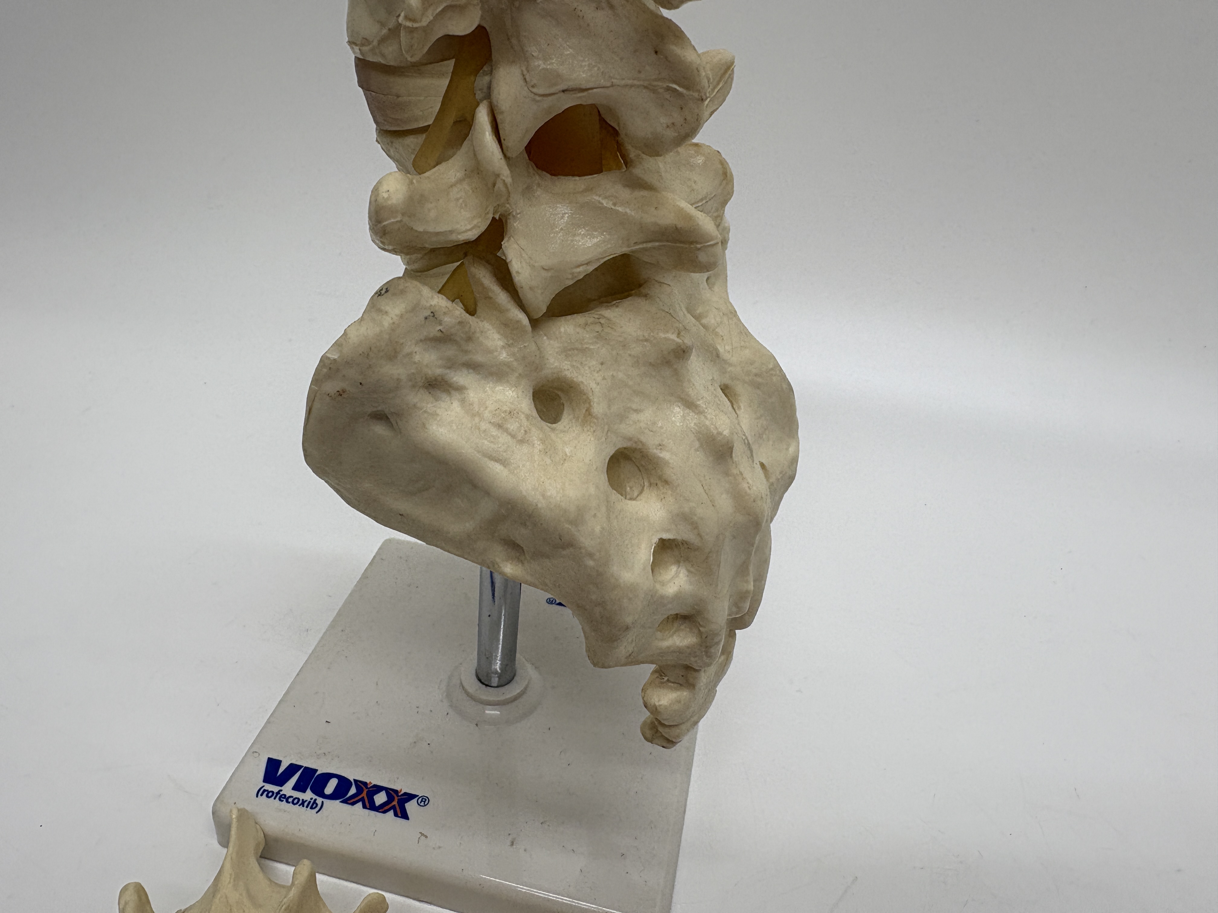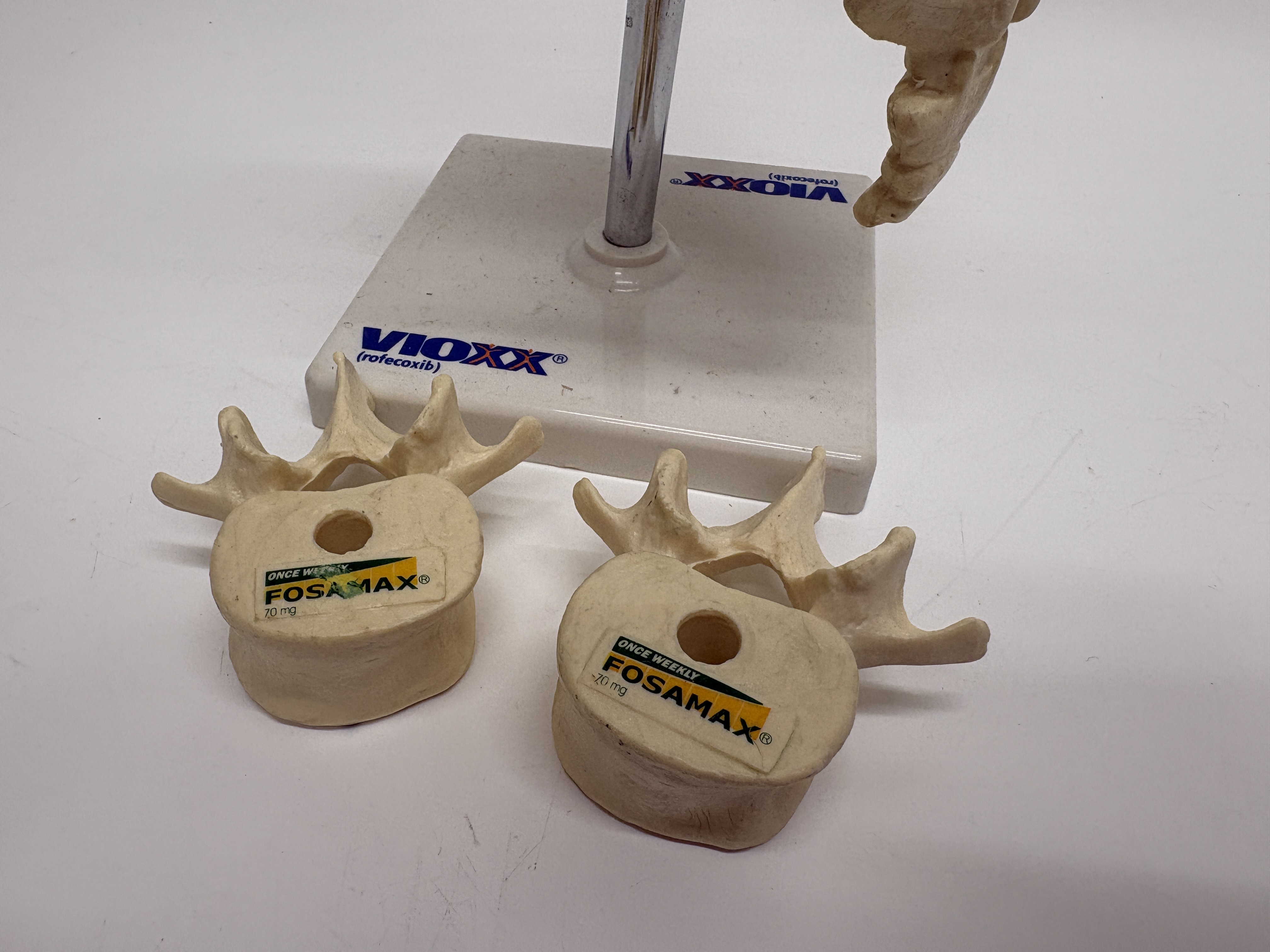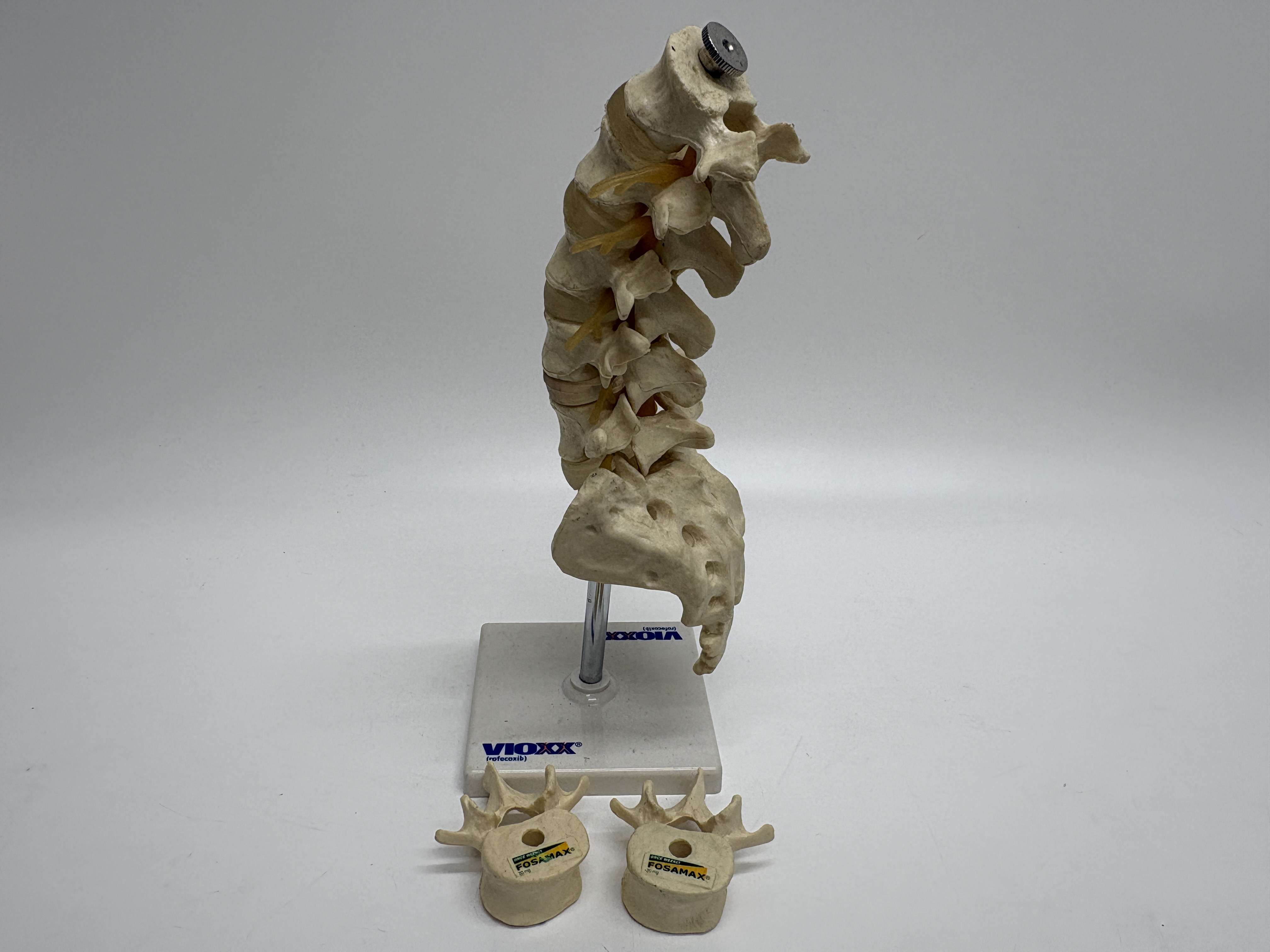 This lot comprises an assortment of pharmaceutical promotional anatomical models depicting the human lumbar spinal column and individual vertebrae. The primary model features a cast resin or plastic representation of the lower spine and sacrum, complete with translucent amber-coloured nerve root simulators. This assembly is mounted on a white plastic base by a metal rod. The base is prominently marked with the branding VIOXX (rofecoxib). Accompanying the main model are separate vertebrae pieces, each bearing a label for ONCE WEEKLY FOSAMAX 70 mg. These items serve as professional medical demonstration aids and are constructed from durable synthetic materials.