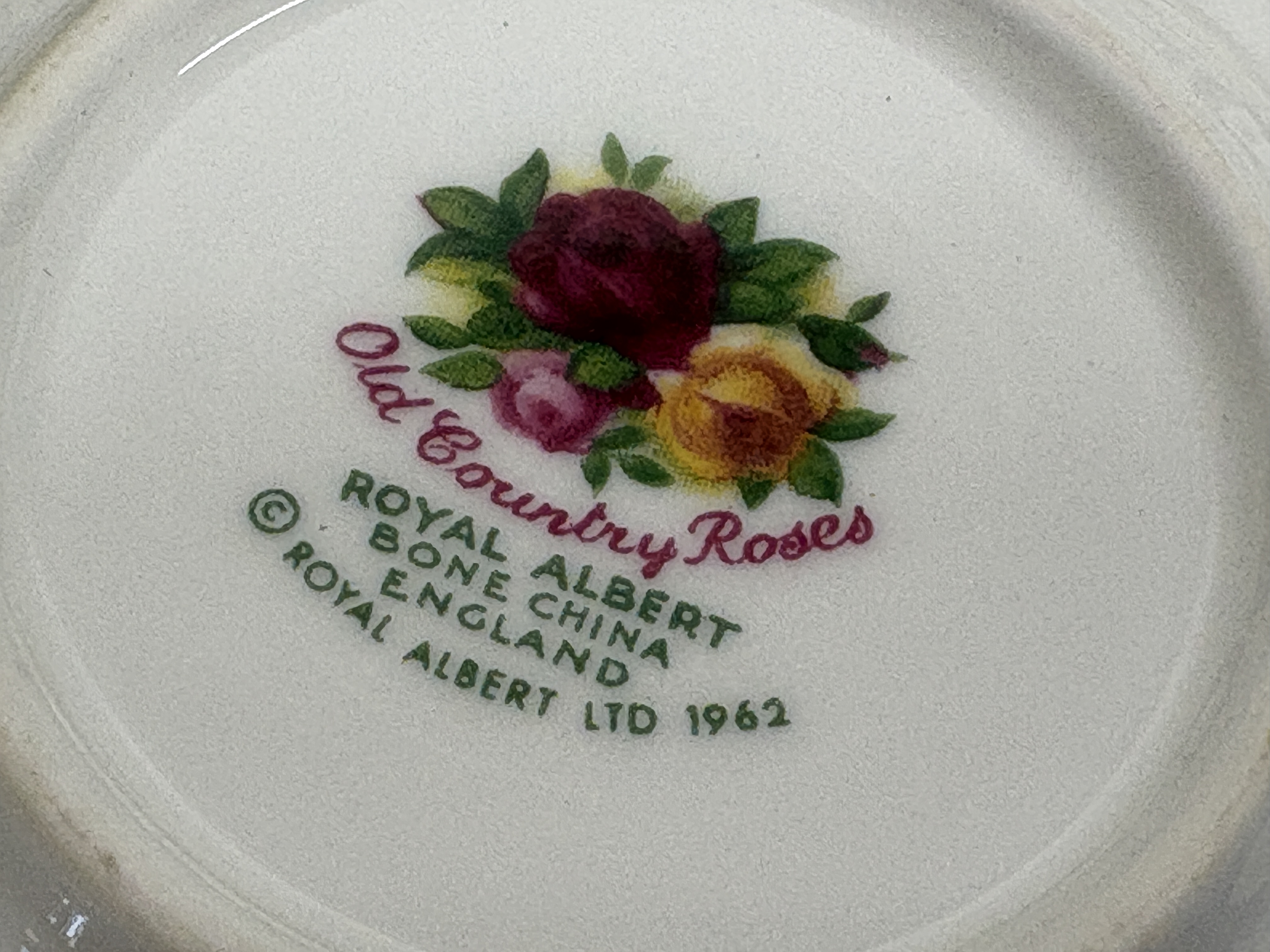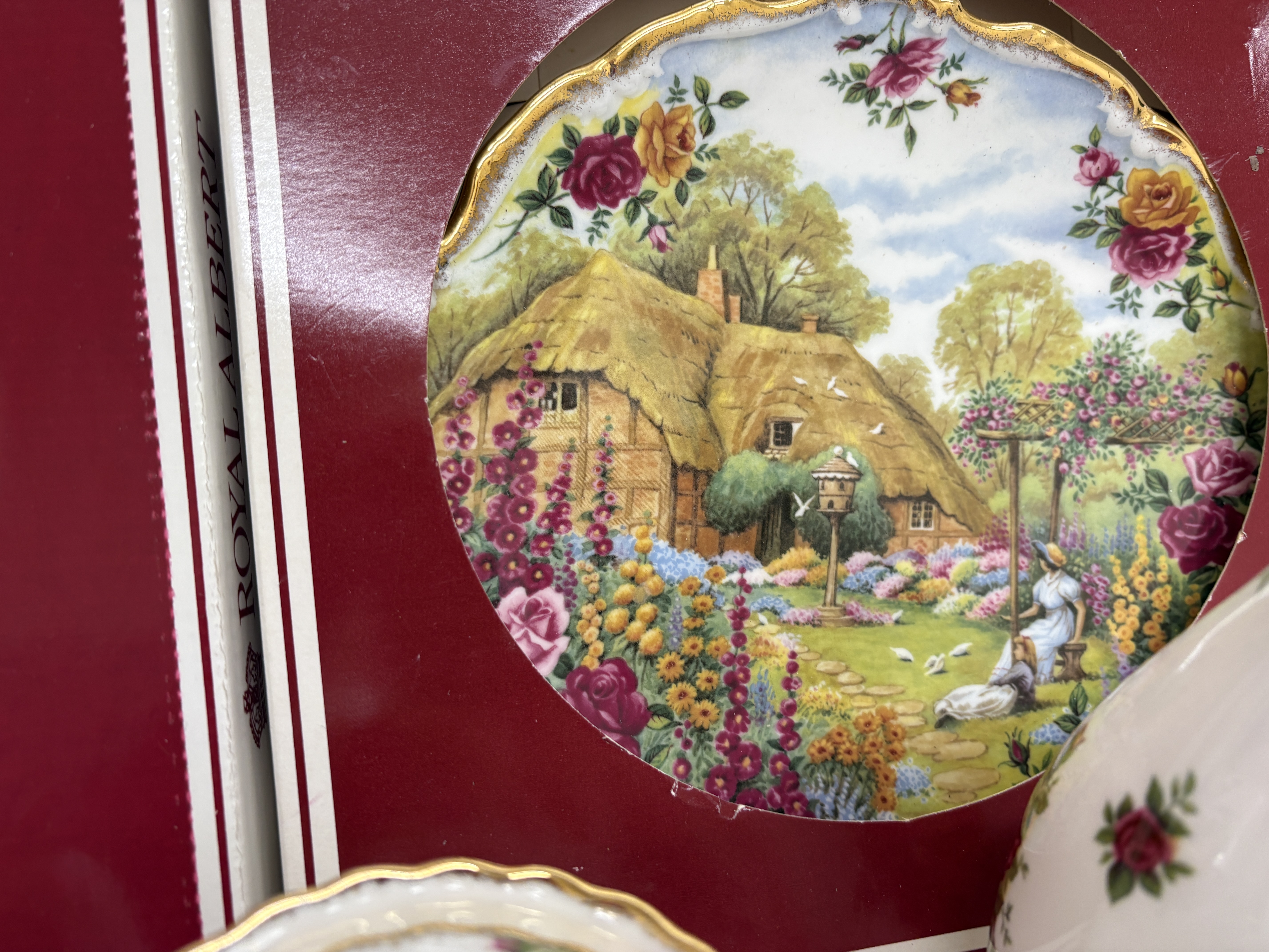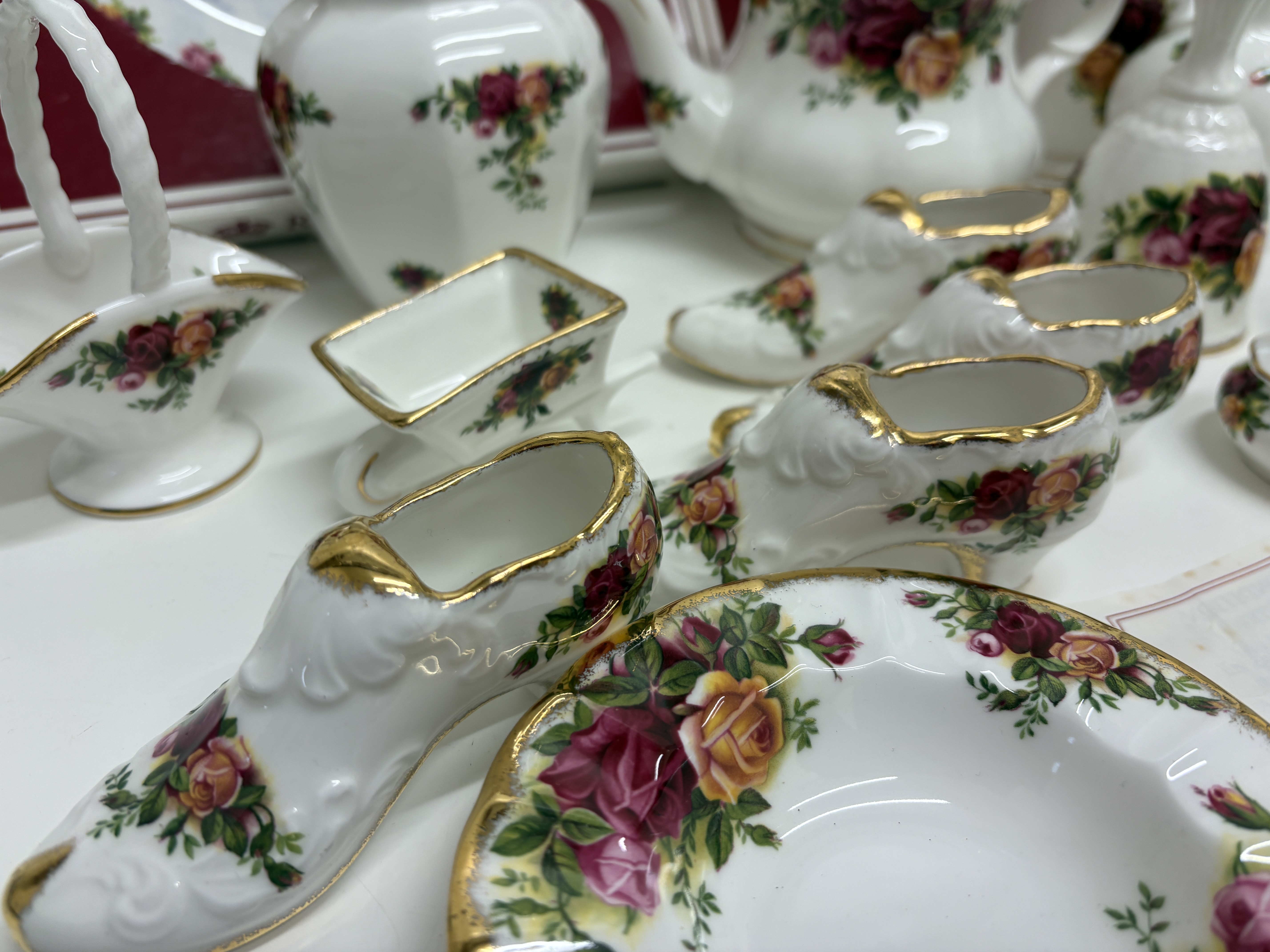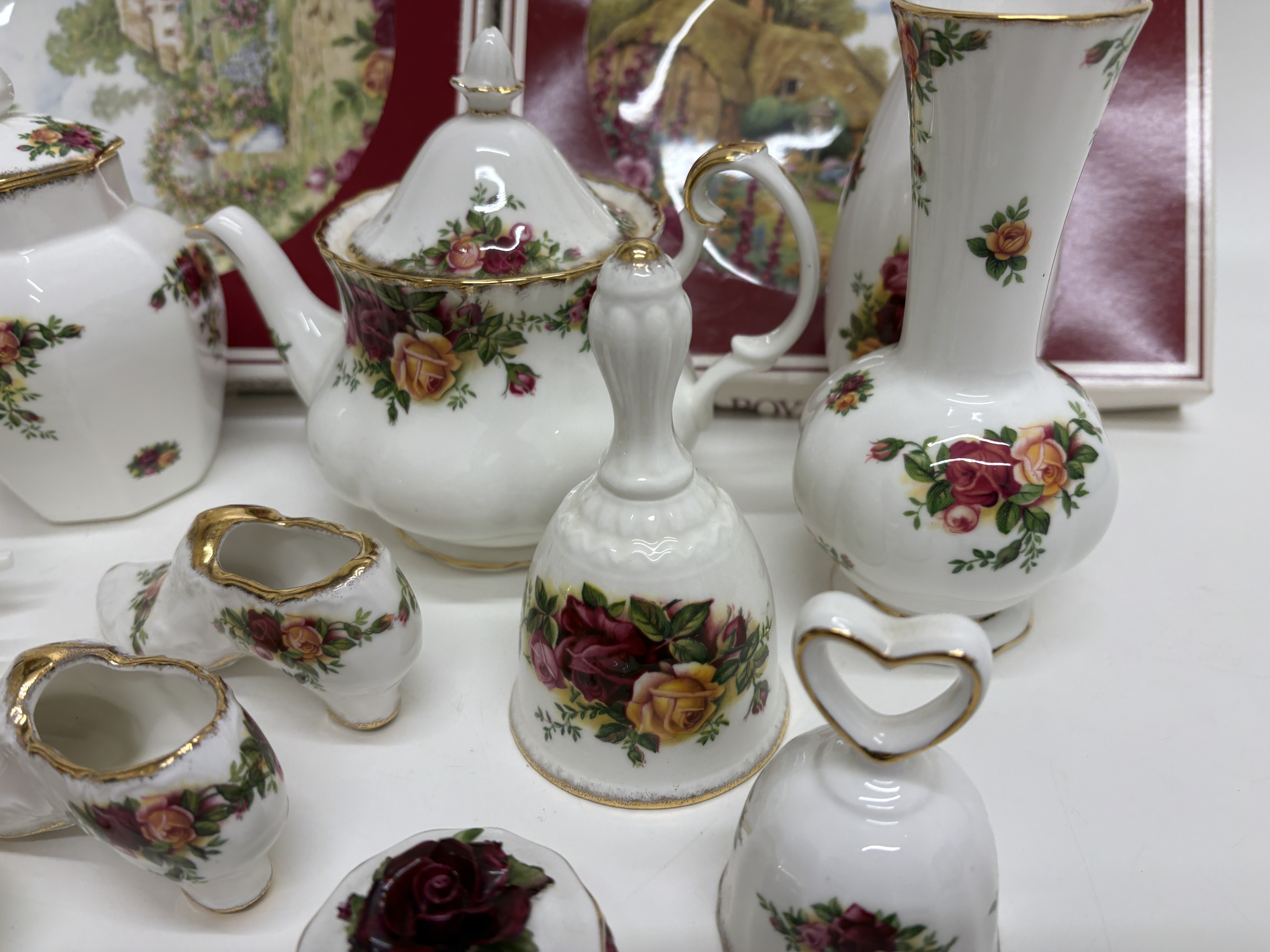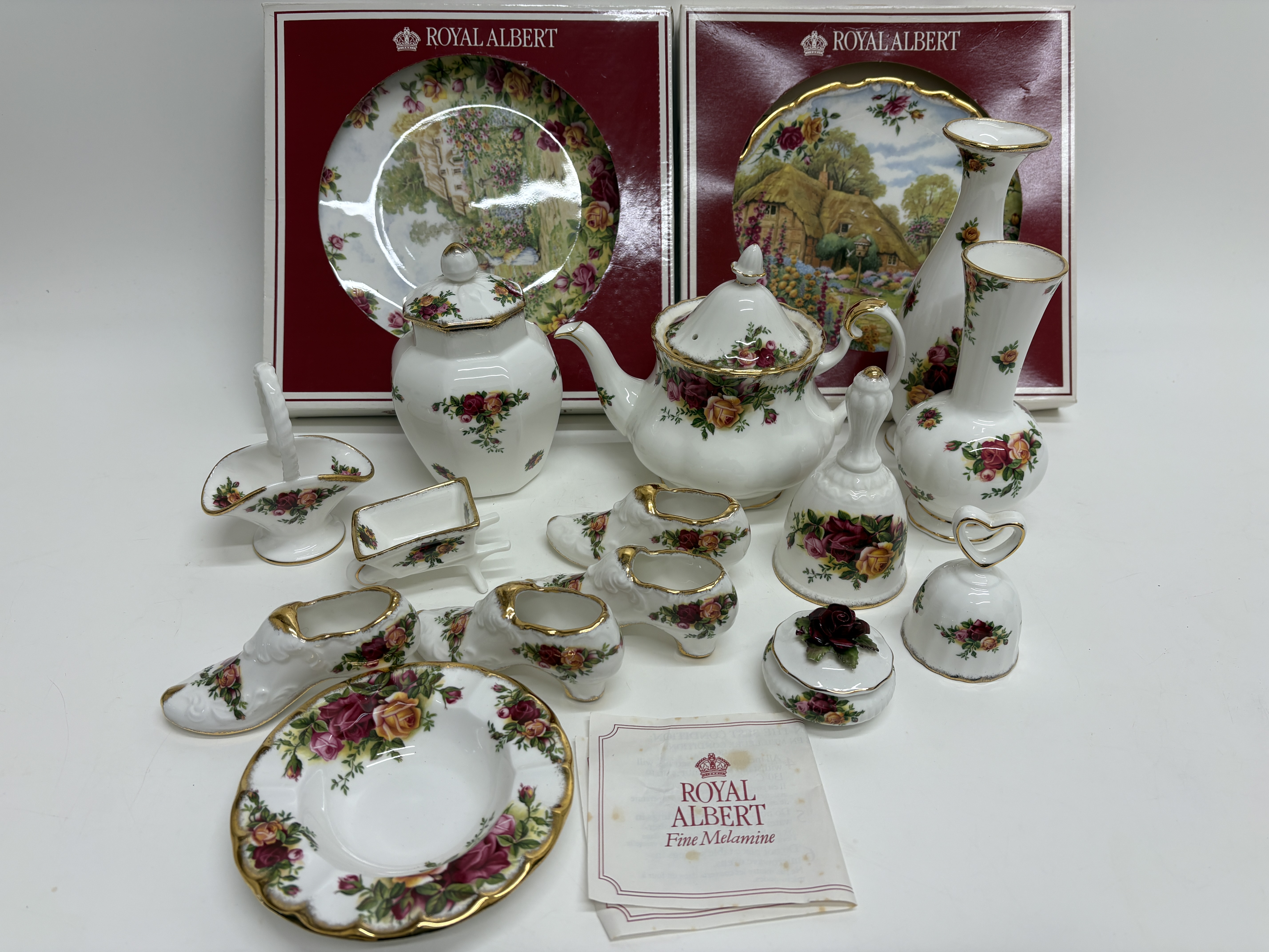 A collection of Royal Albert fine bone china in the Old Country Roses pattern, featuring transfer-printed floral motifs in shades of red, pink, and yellow with sponged gold-tone rims. The assortment includes a teapot, a lidded sugar bowl, decorative vases, bells, a trinket box, a small bowl, and several miniatures including shoes, a wheelbarrow, and a basket. Also present are two plates depicting cottage landscape scenes, housed in original red Royal Albert presentation boxes. The pieces bear the maker backstamp identifying the pattern and a copyright date of 1962. The lot is accompanied by printed materials for Royal Albert Fine Melamine.