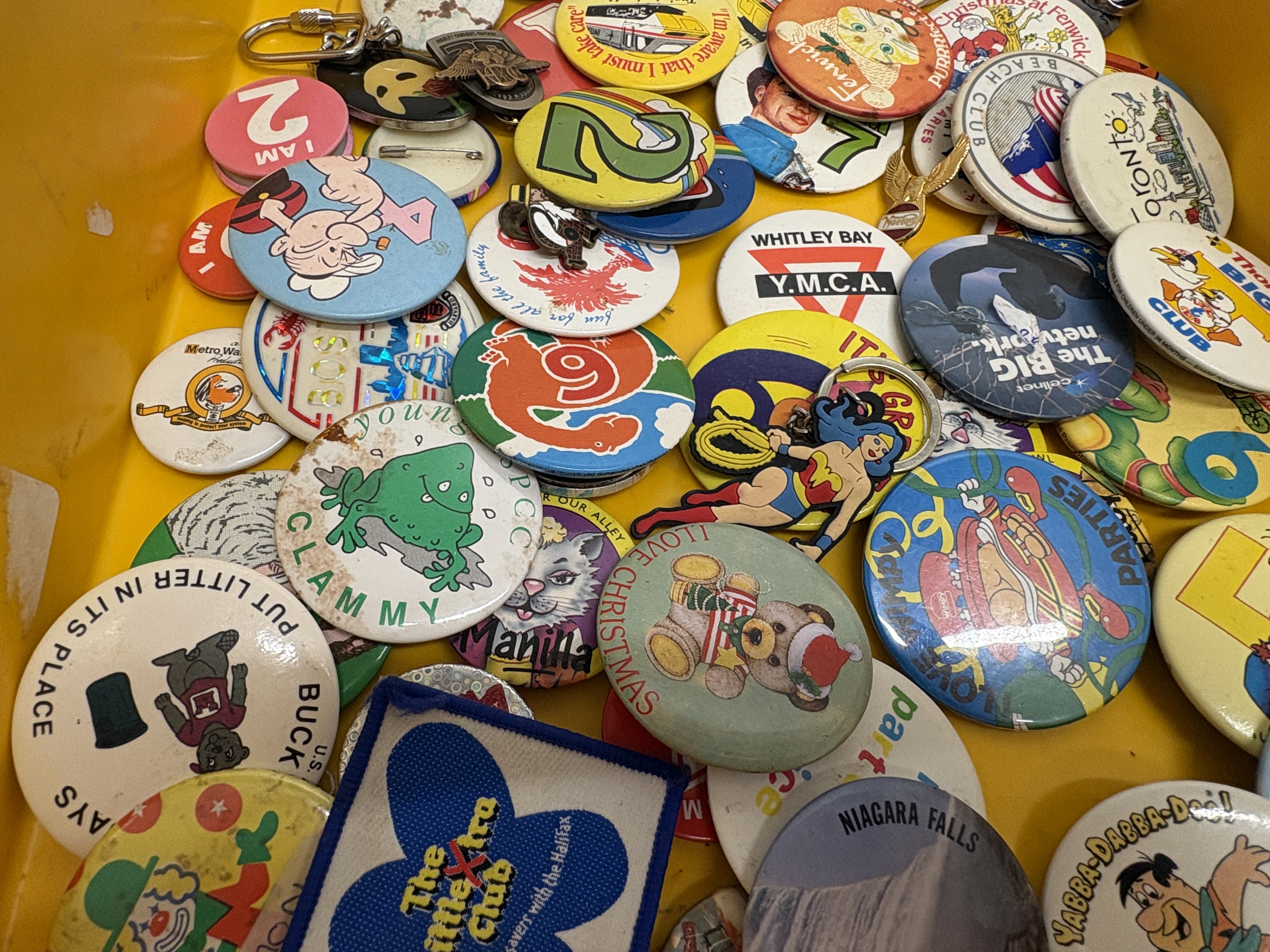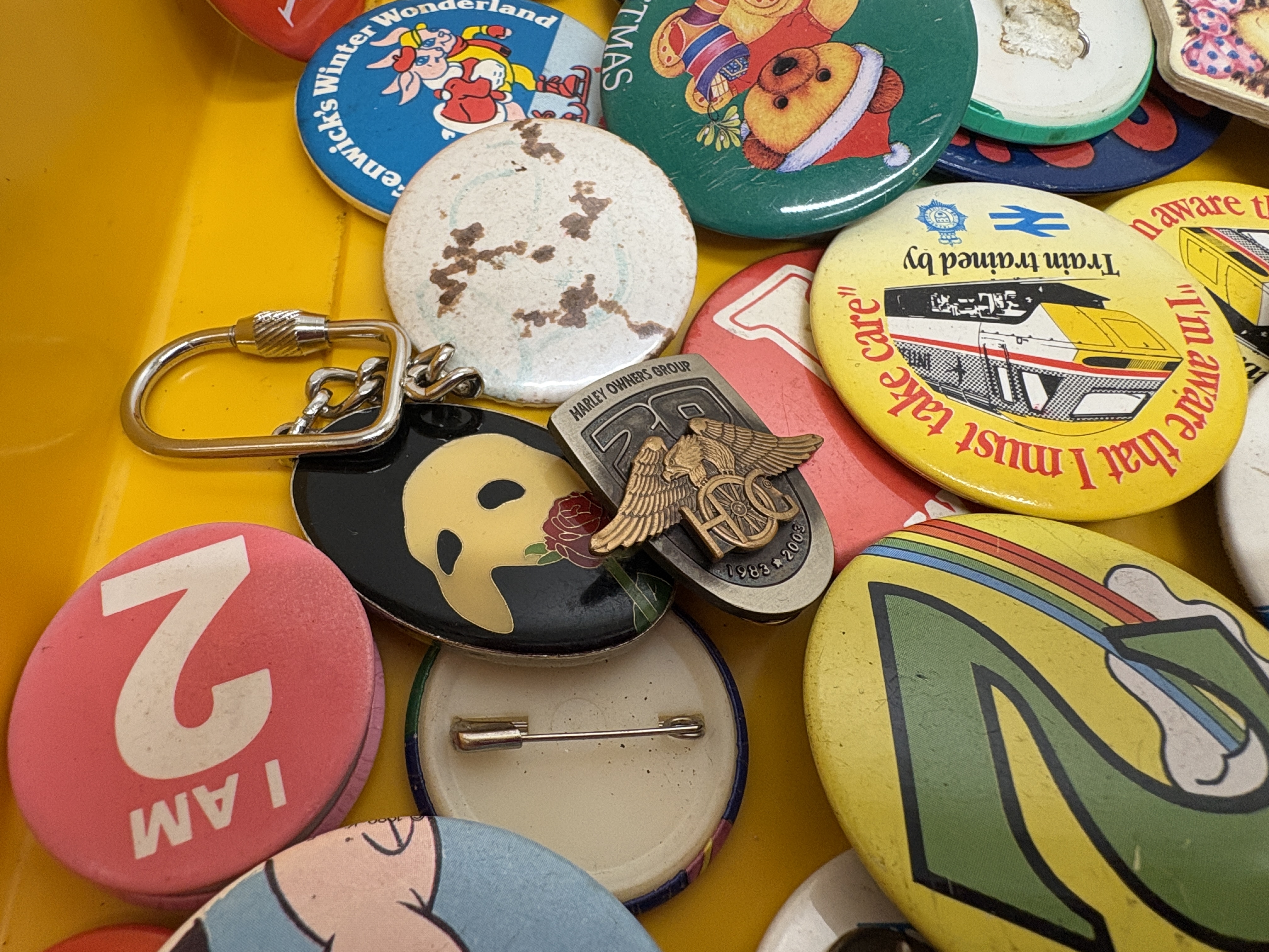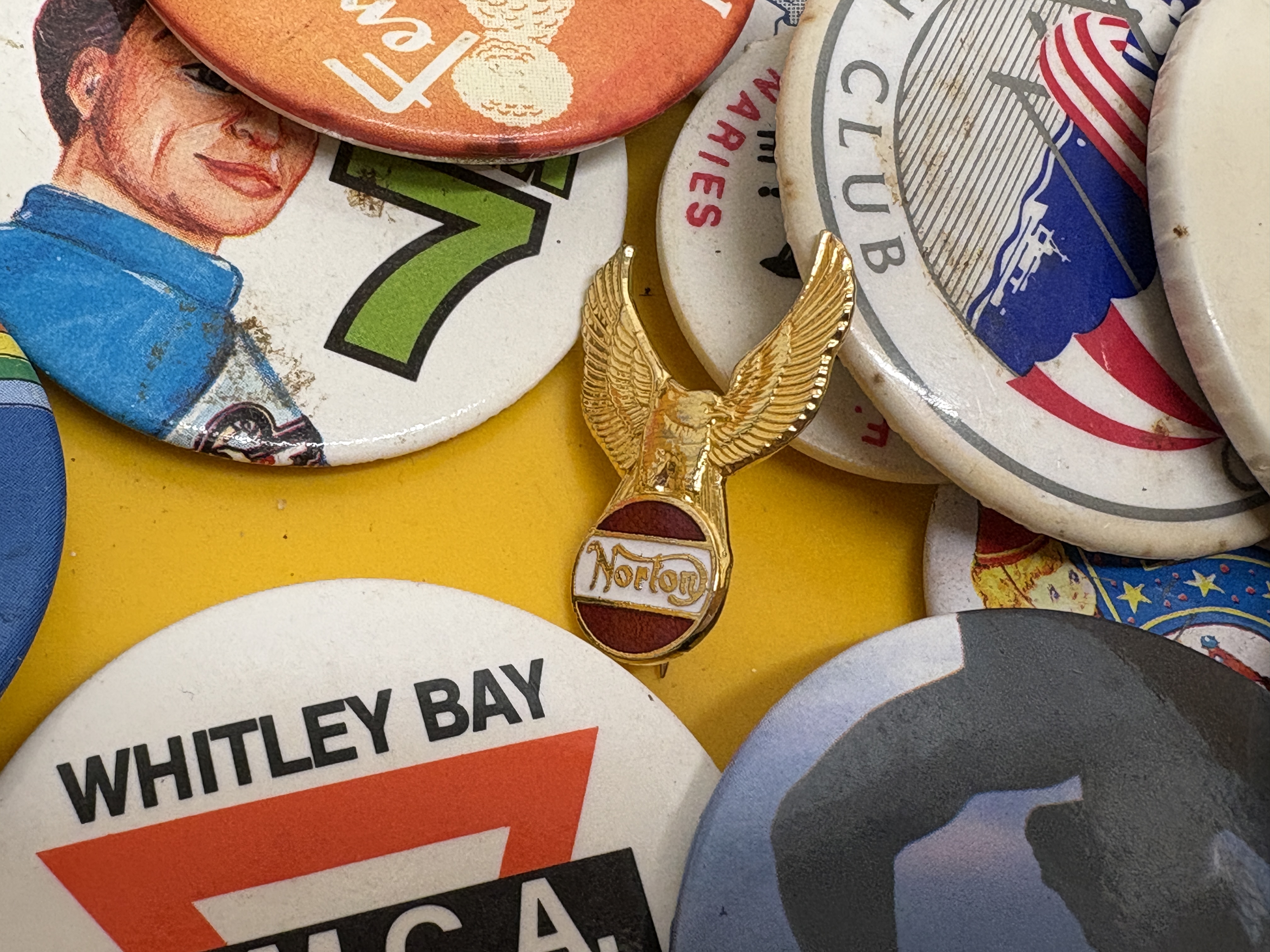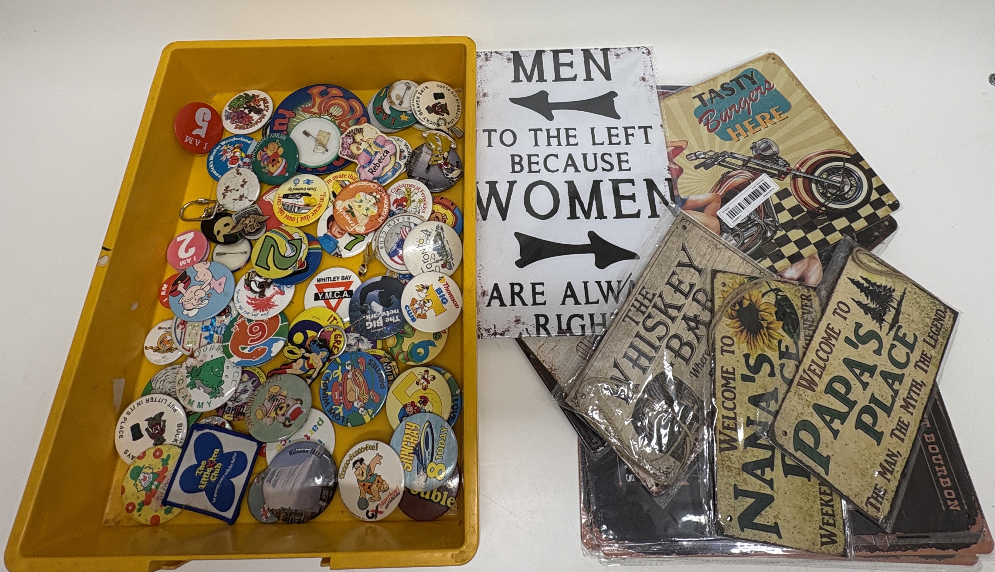 A mixed collection of collectable items comprising an assortment of pinback buttons, lapel pins, keychains, and a small embroidered fabric patch, together with several decorative metal signs. The pinback buttons feature various subjects including cartoon characters, tourist souvenirs such as Niagara Falls, and organisations including the YMCA and British Rail. Notable metal pins include a Harley Owners Group 20th Anniversary (1983-2003) pin and a Norton eagle lapel pin. The decorative signs, many in original plastic packaging with barcode labels, display retro-style and novelty themes including Jim Beam bourbon, beer advertisements, Route 66 motifs, and various humorous sayings.