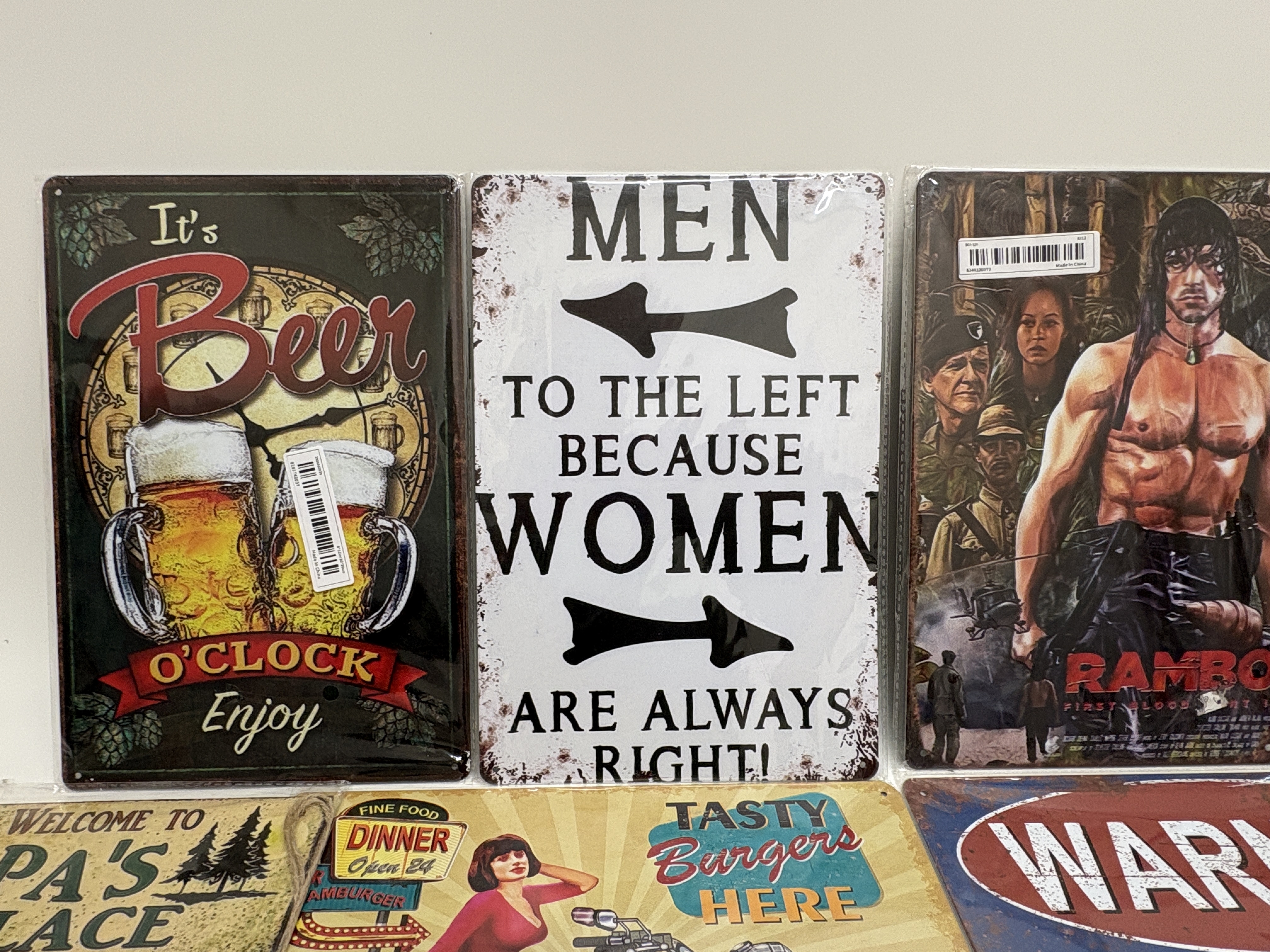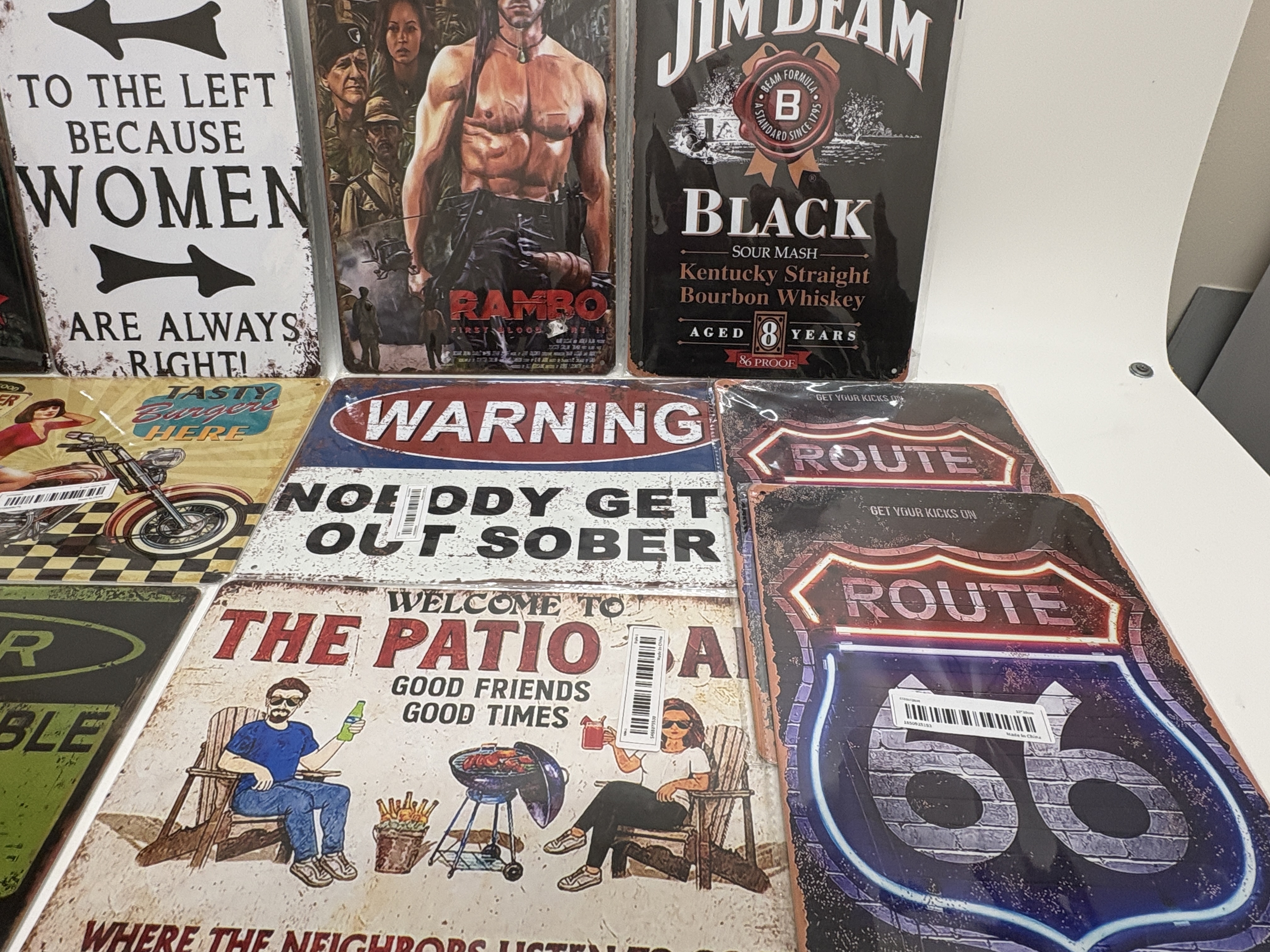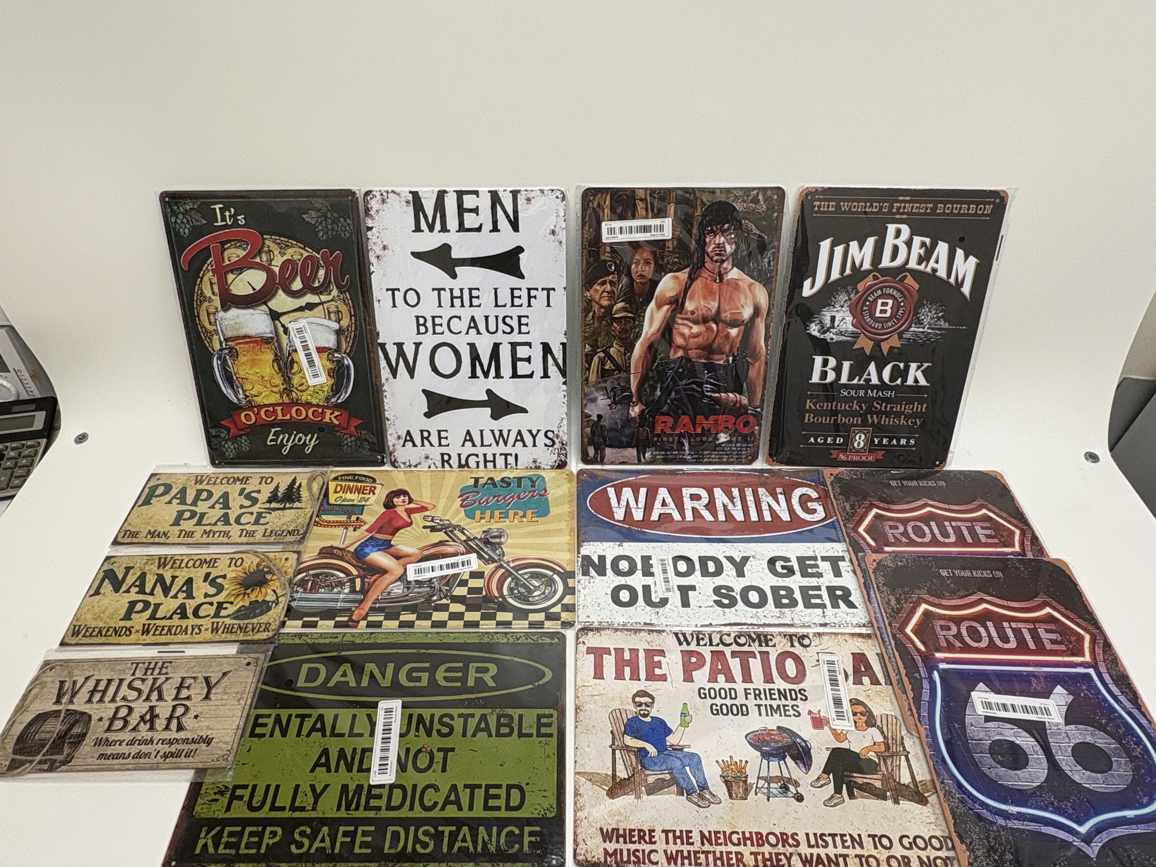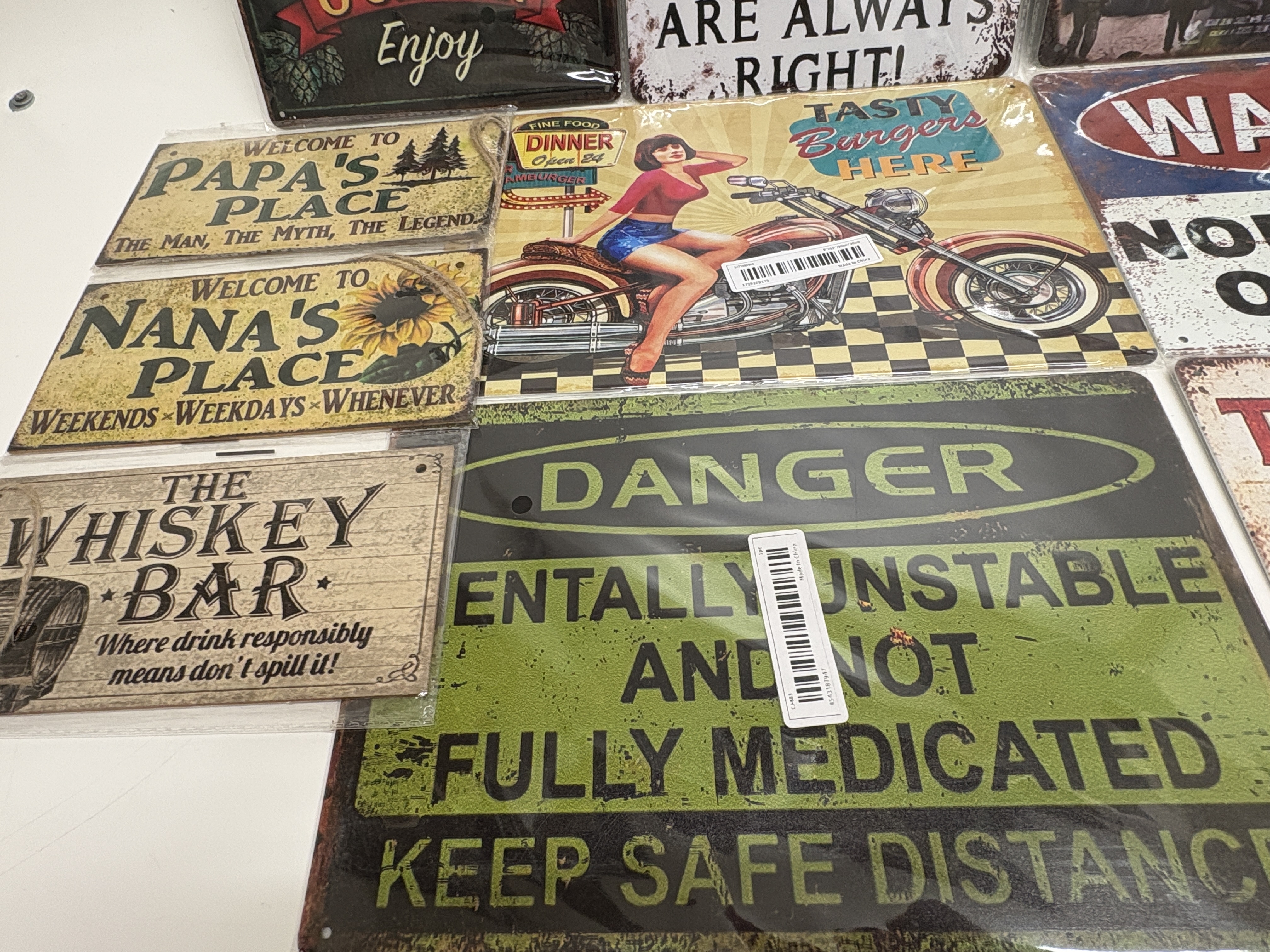 A mixed collection of collectable items comprising an assortment of pinback buttons, lapel pins, keychains, and a small embroidered fabric patch, together with several decorative metal signs. The pinback buttons feature various subjects including cartoon characters, tourist souvenirs such as Niagara Falls, and organisations including the YMCA and British Rail. Notable metal pins include a Harley Owners Group 20th Anniversary (1983-2003) pin and a Norton eagle lapel pin. The decorative signs, many in original plastic packaging with barcode labels, display retro-style and novelty themes including Jim Beam bourbon, beer advertisements, Route 66 motifs, and various humorous sayings.