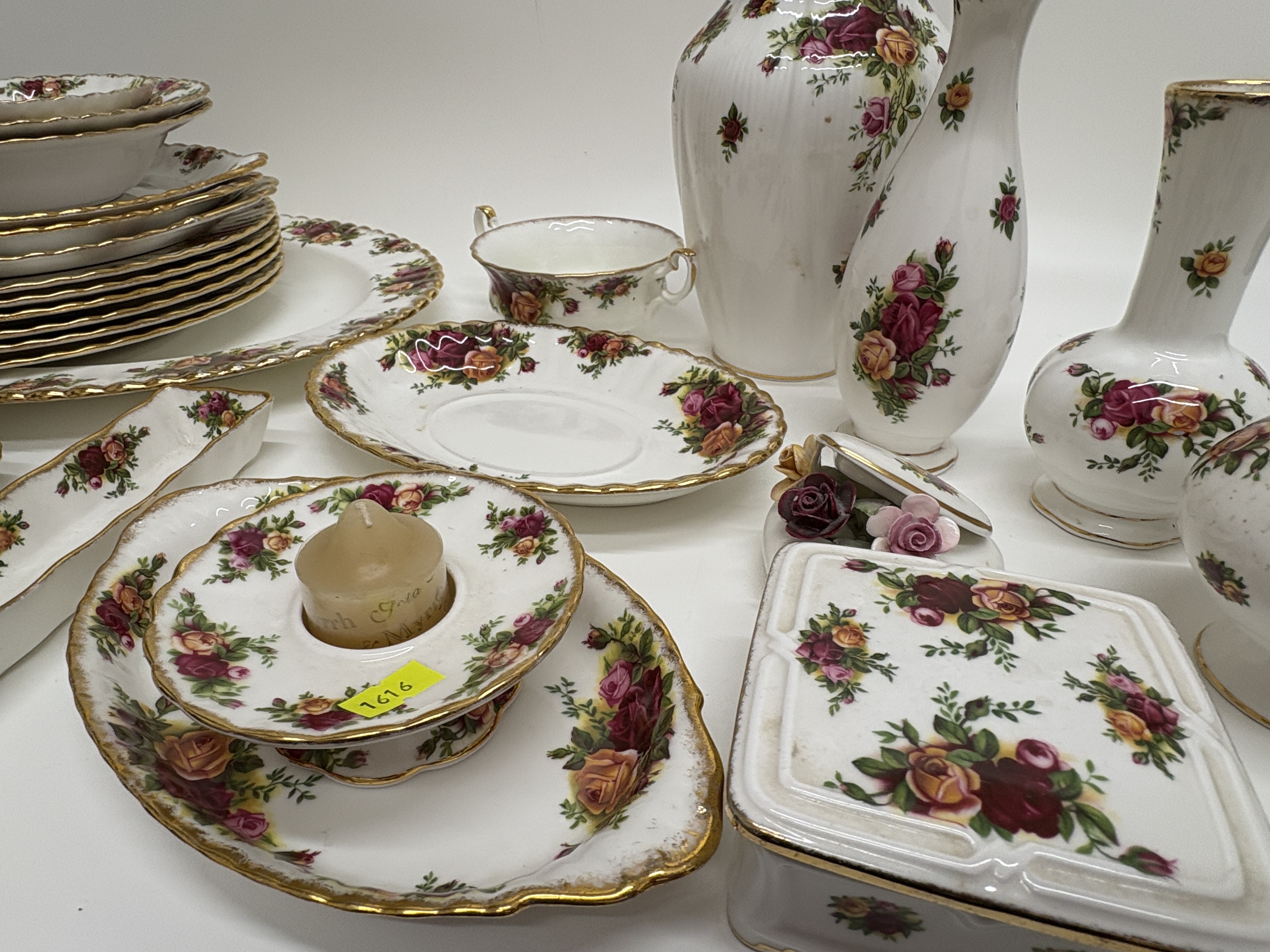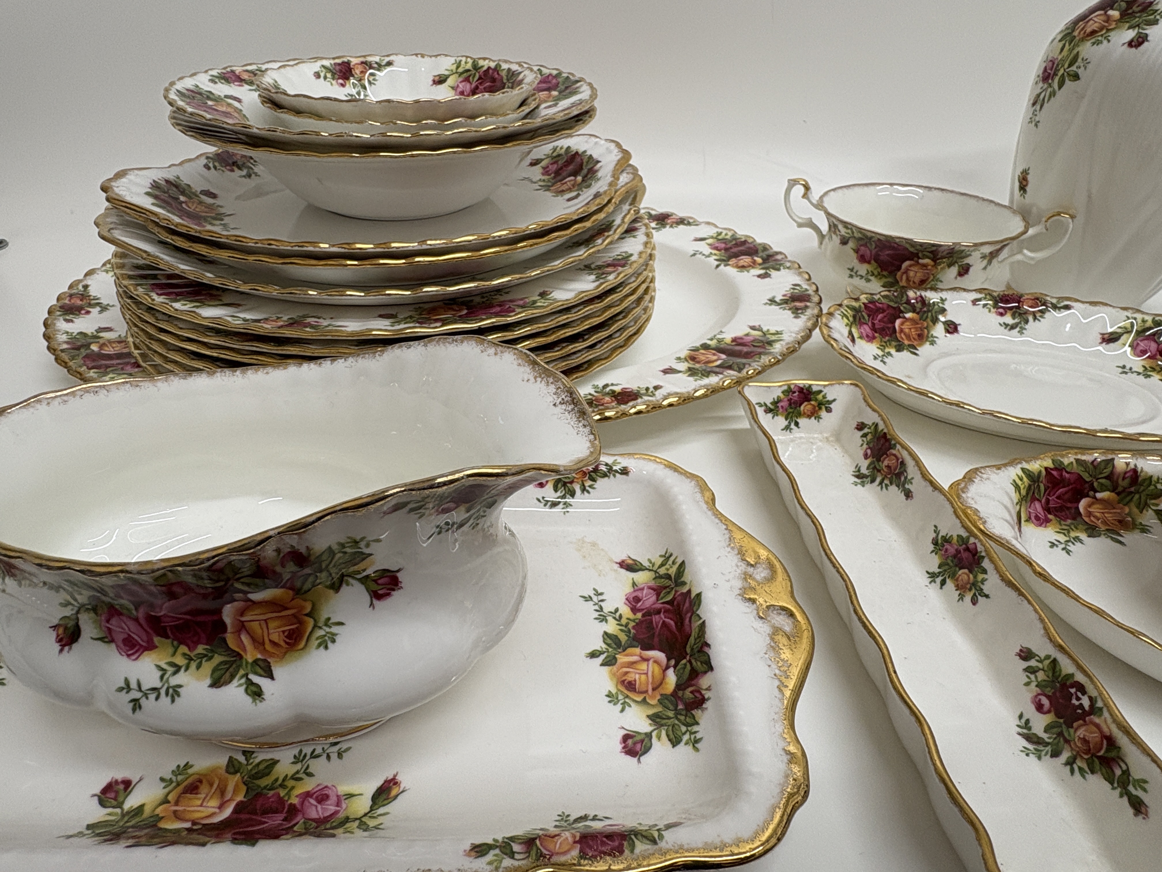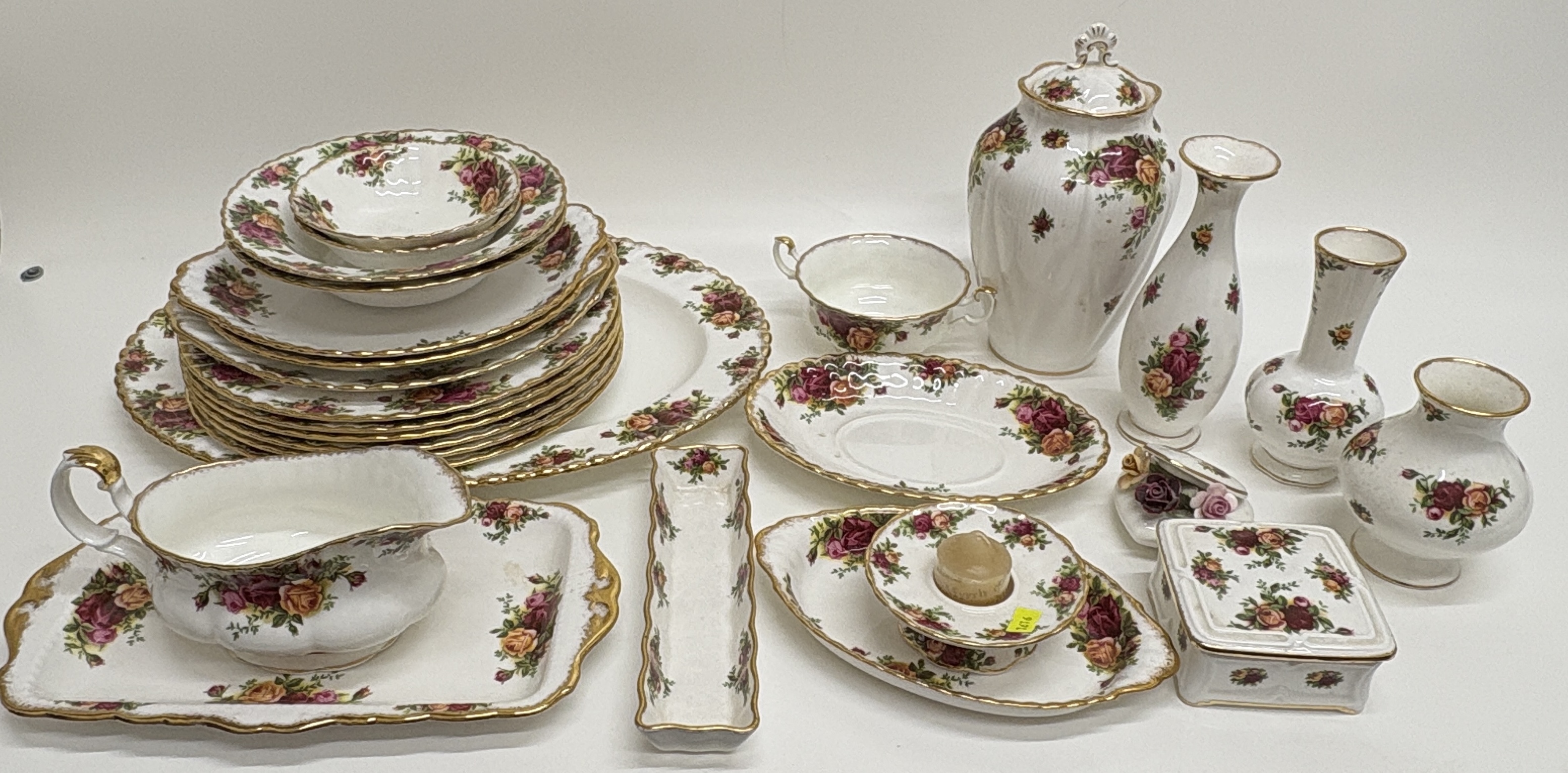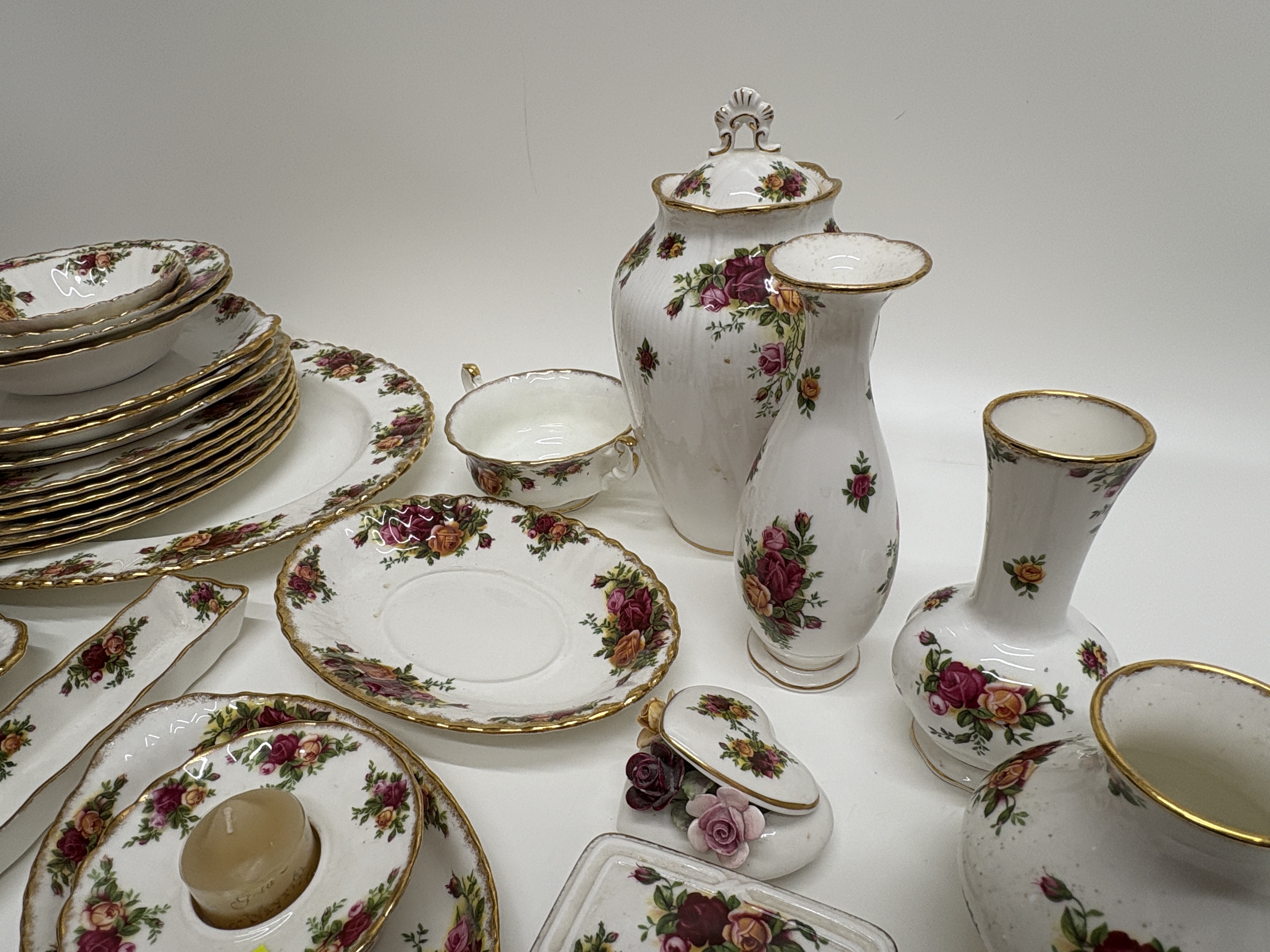 An extensive collection of Royal Albert English bone china in the iconic Old Country Roses pattern, originally designed by Harold Holdcroft in 1962. The service features the signature transfer-printed clusters of burgundy, pink, and yellow roses with green foliage set against a white ground. Each piece is designed with a classic scalloped rim and finished with heavy, hand-applied stippled gilding. The comprehensive grouping includes a variety of tableware and cabinet pieces: multiple dinner plates, salad plates, bowls, a large oval serving platter, and a gravy boat with a matching underplate. The decorative assortment comprises three vases of varying silhouettes, a lidded ginger jar, a rectangular trinket box, a small floral-encrusted heart-shaped box, and a candle holder. All items feature the standard Royal Albert Old Country Roses backstamp to the base. Platter measures approximately 33cm in length; dinner plates approximately 26cm diameter.