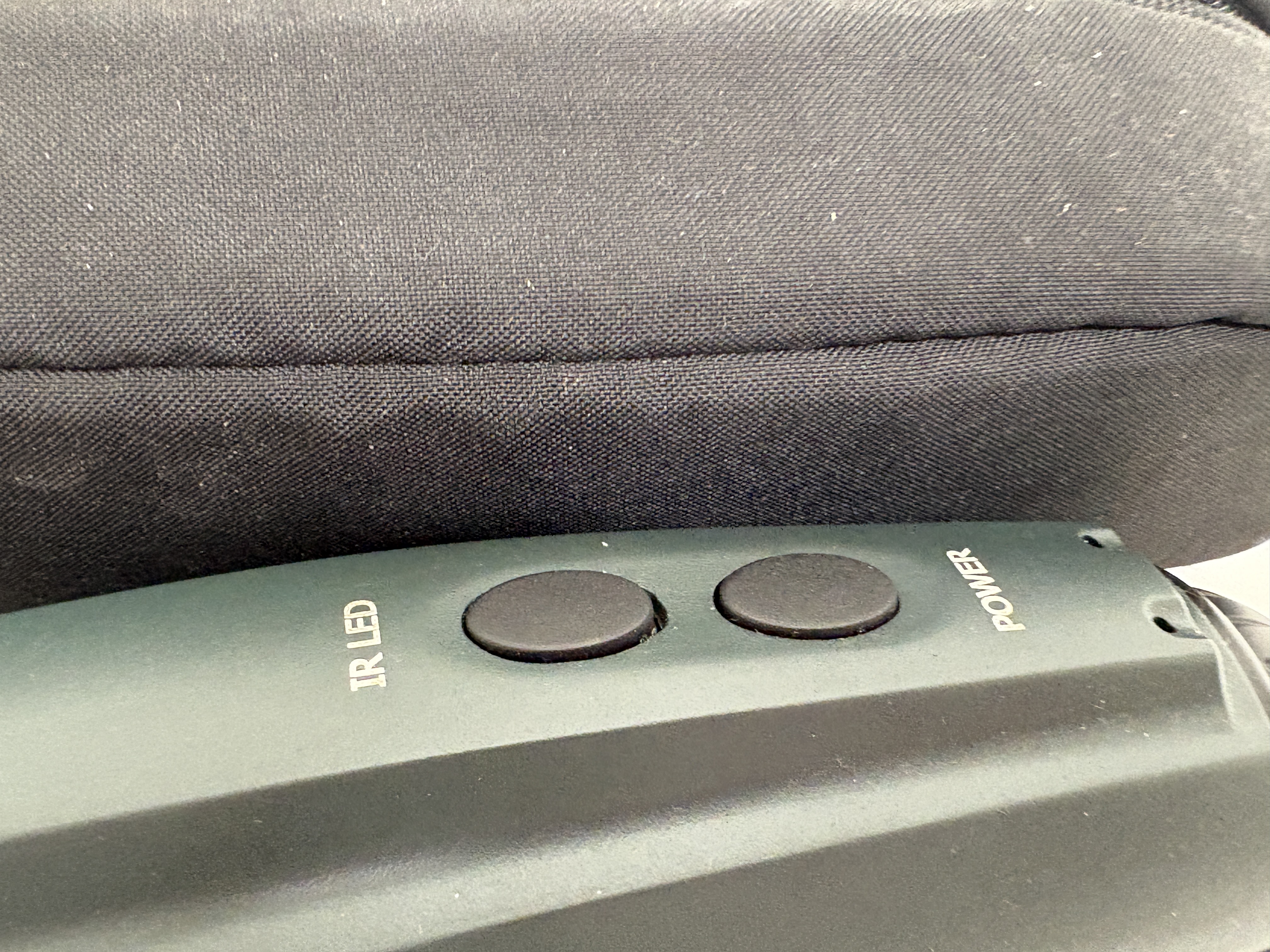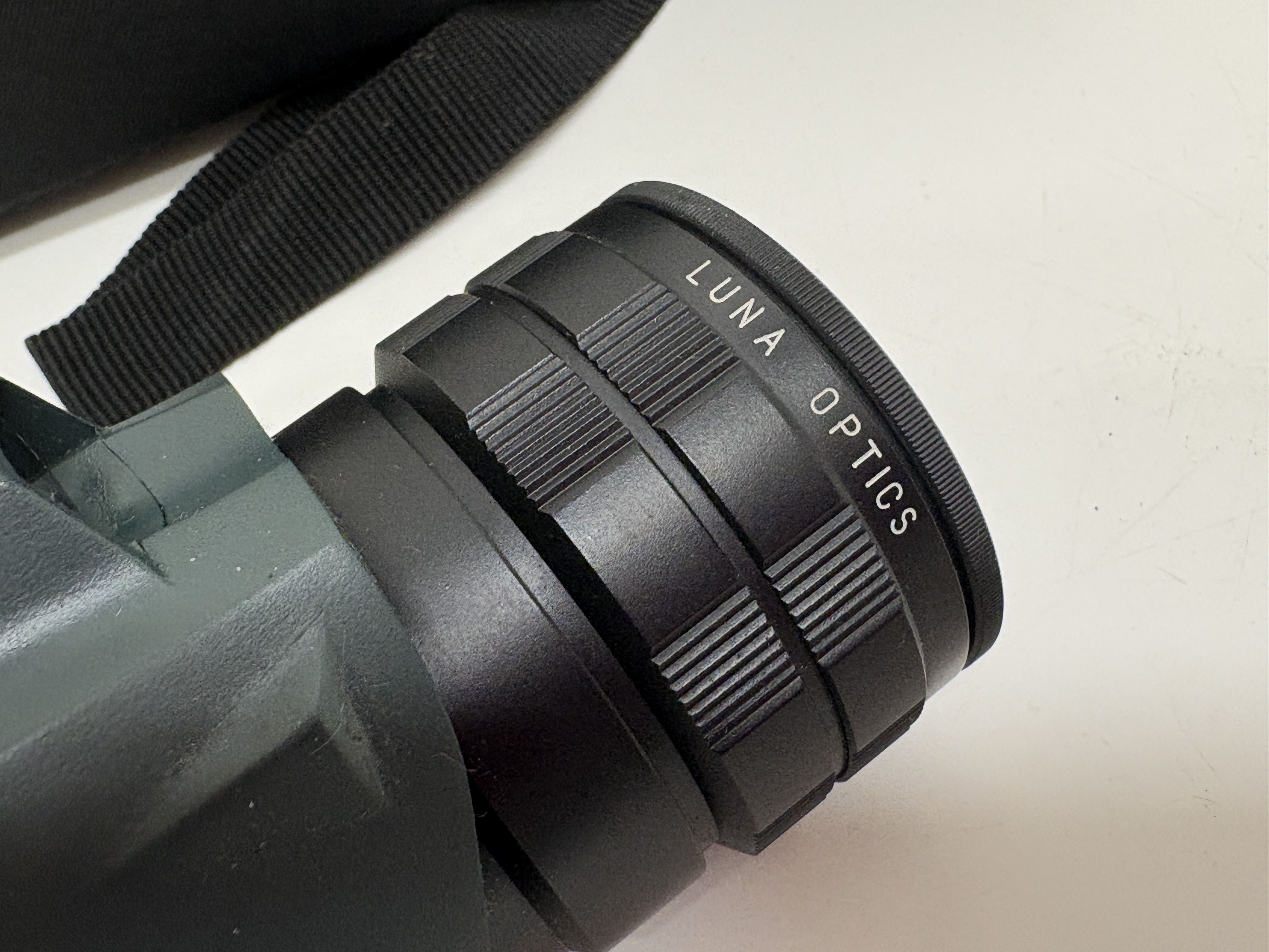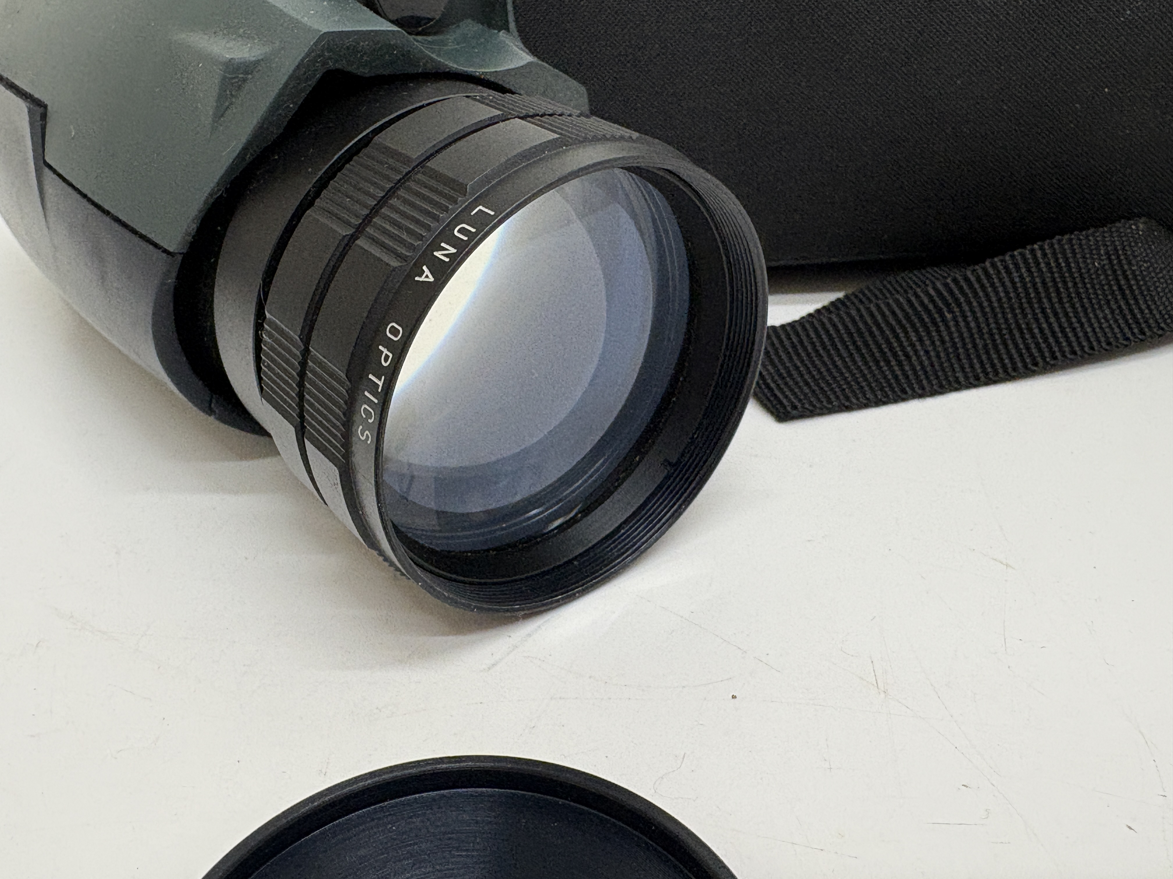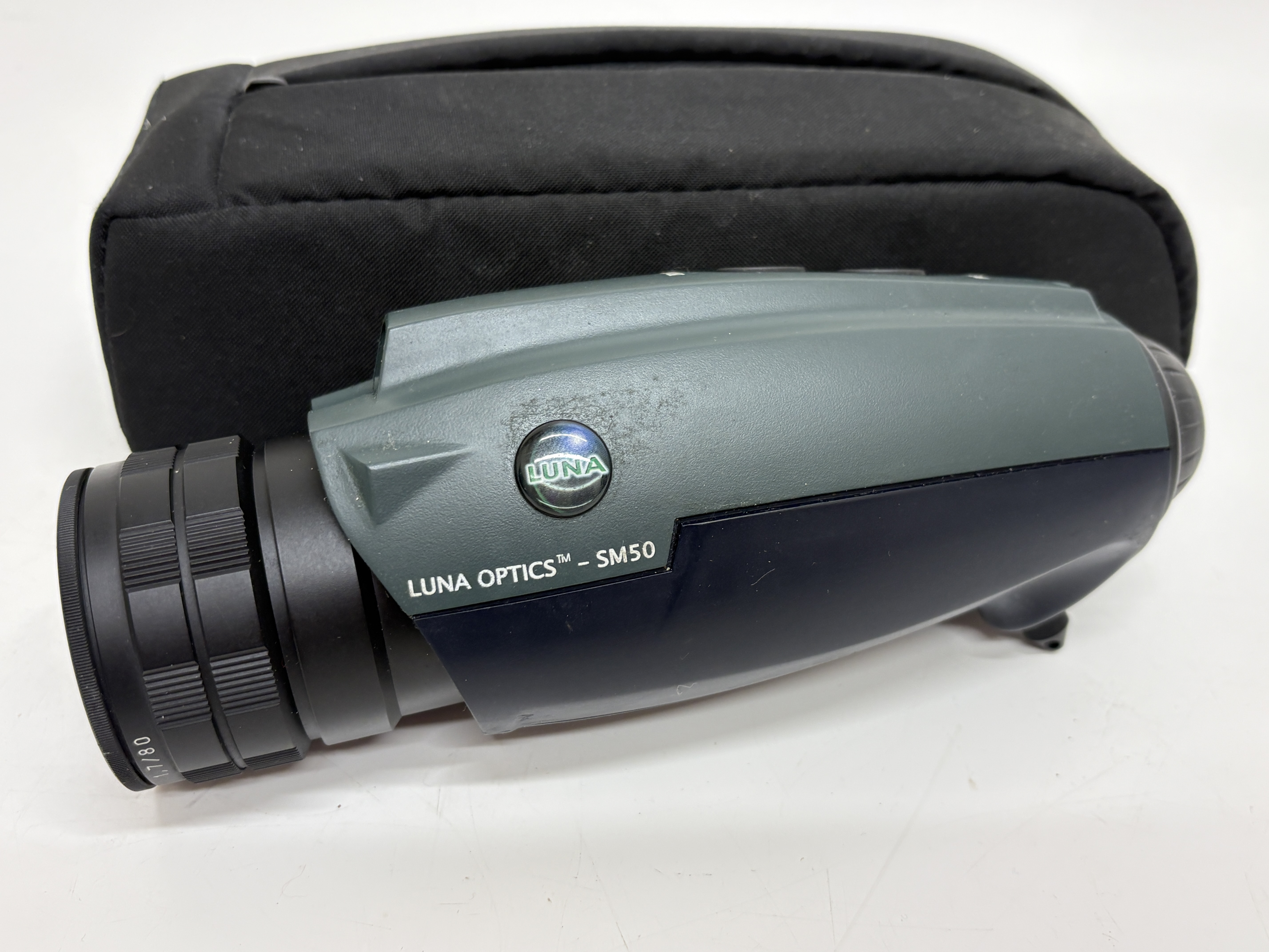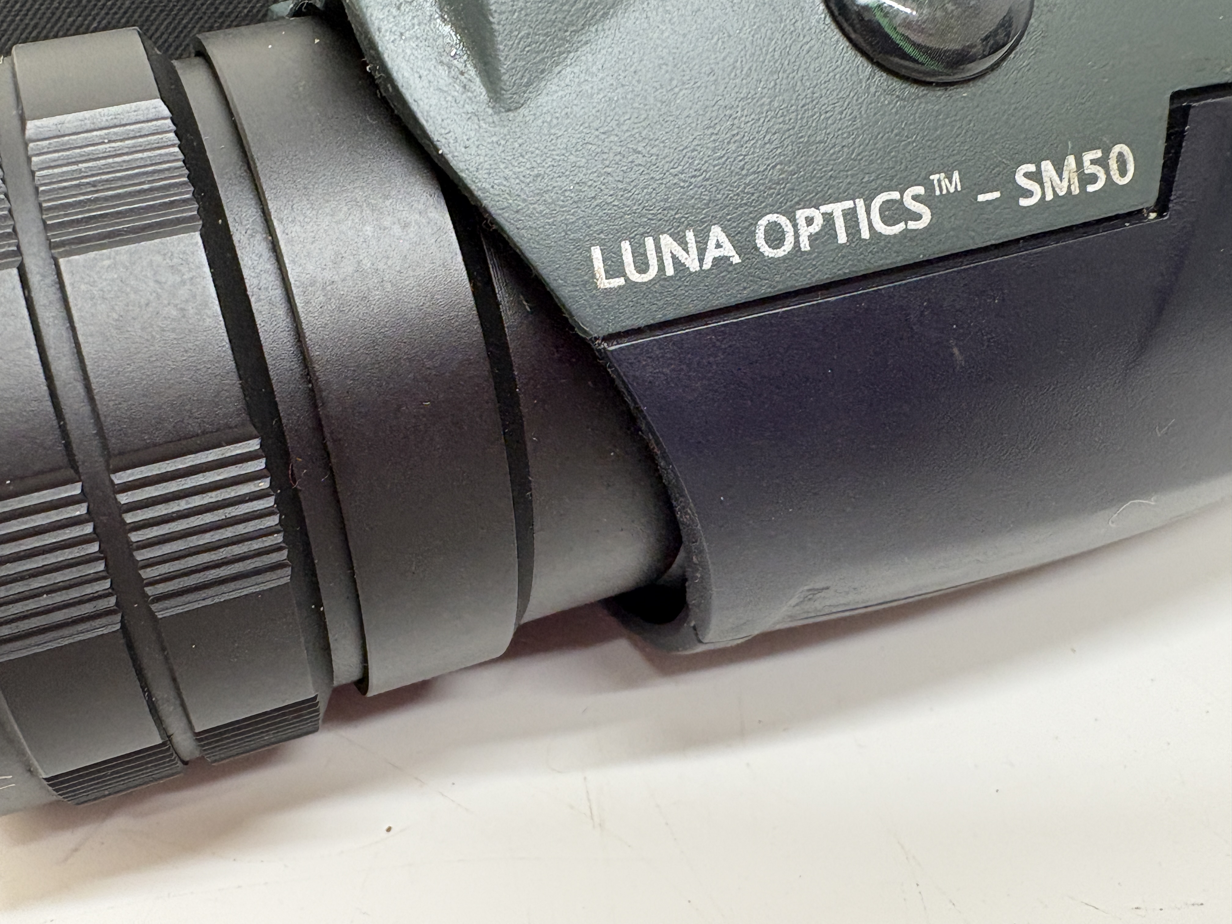 This lot features a Luna Optics SM50 night vision monocular, a professional-grade Generation 1 device designed for nocturnal observation. The unit is constructed with a two-tone dark green and black rubberised housing, providing a weather-resistant and tactile grip. The flank of the device displays a circular LUNA emblem and white printed text identifying the model as LUNA OPTICS – SM50. The upper surface is equipped with two tactile buttons for IR LED and POWER operation. The objective lens assembly is marked LUNA OPTICS and 1,7/80, incorporating a ridged focus adjustment ring for precision focusing. This model was recognised as a Grade-A Gen 1 device, offering superior image quality and light amplification within its technological class. The monocular is supplied with a black padded textile carrying case featuring a shoulder strap and a black plastic objective lens cap.