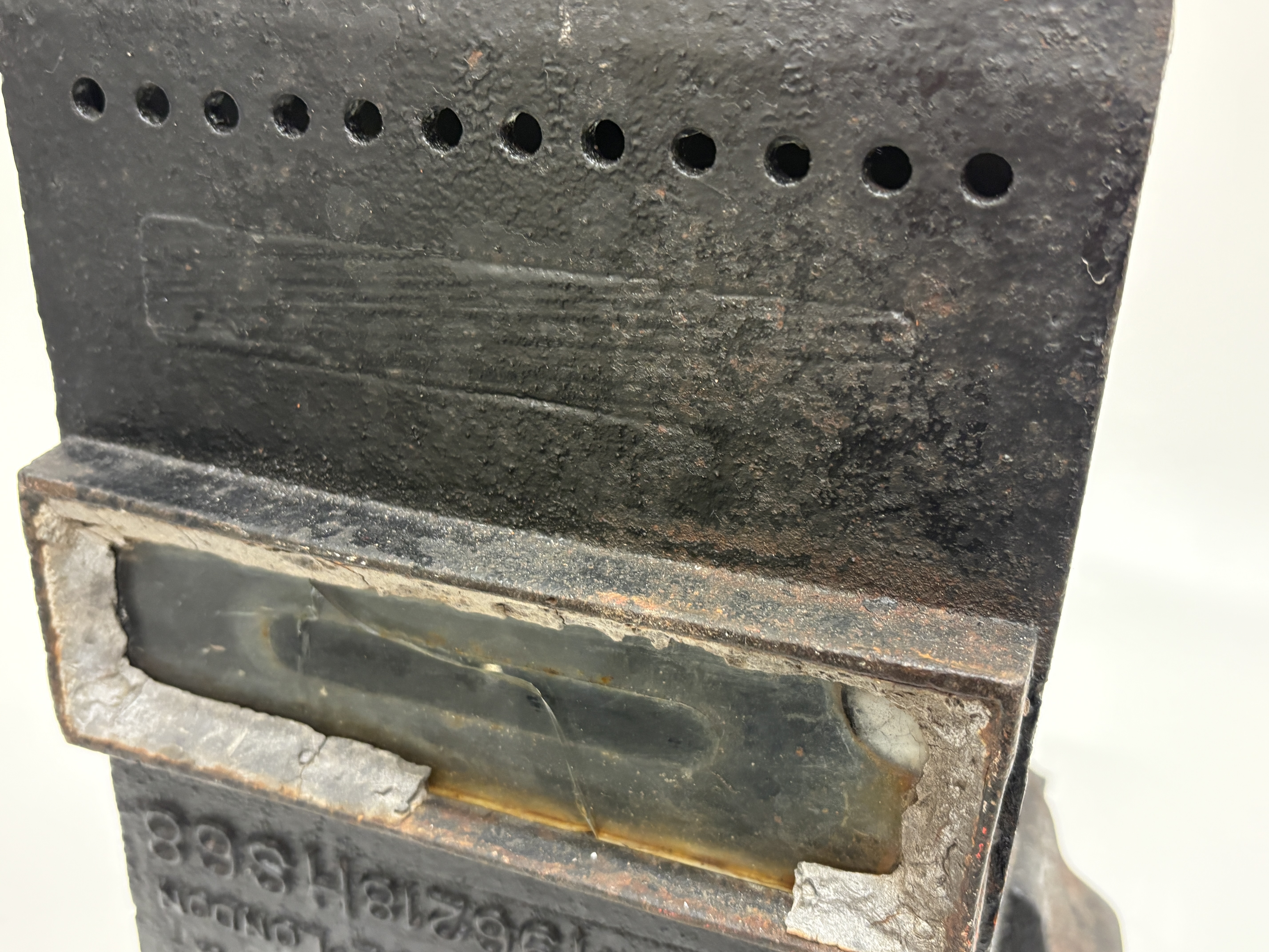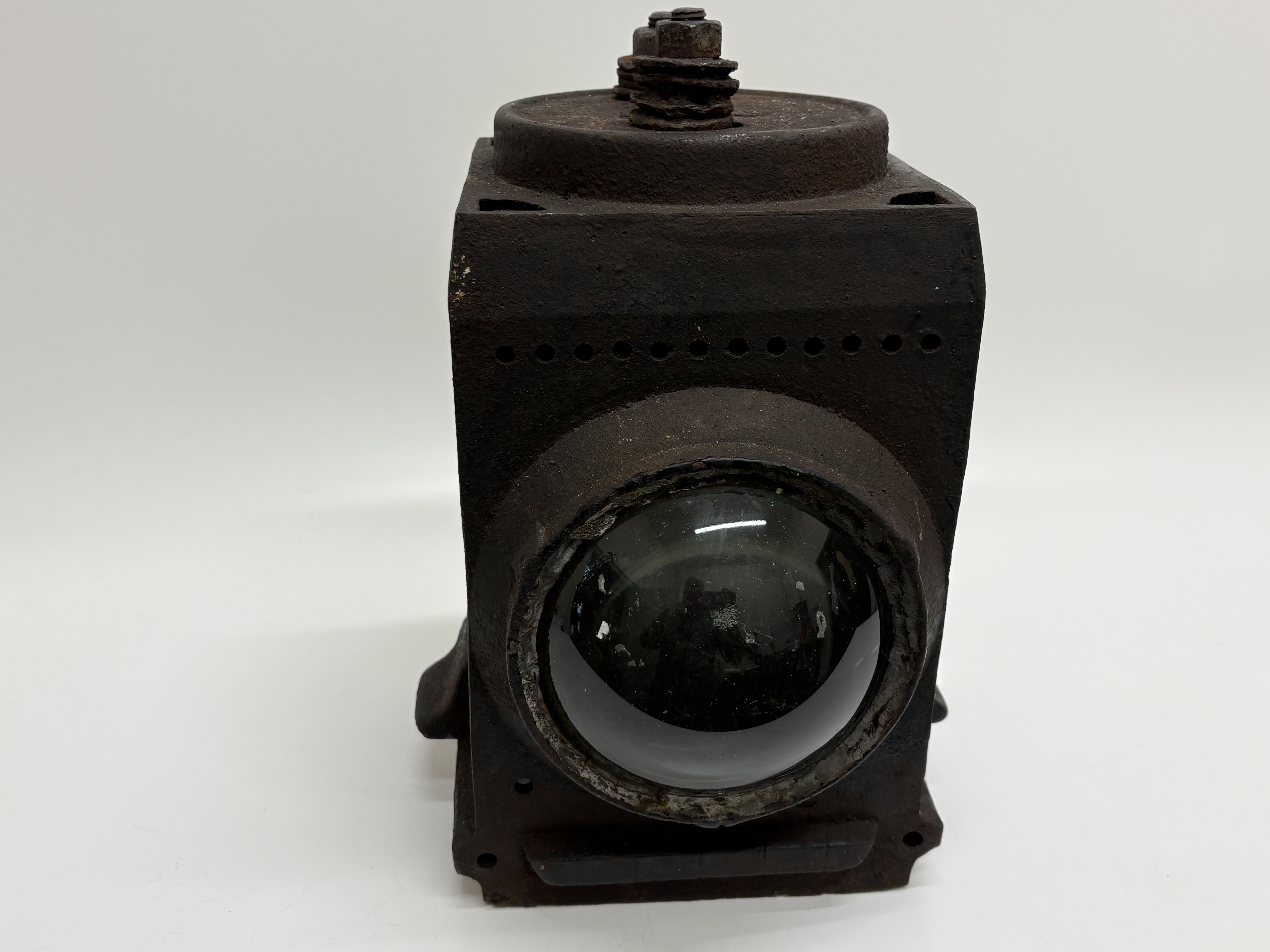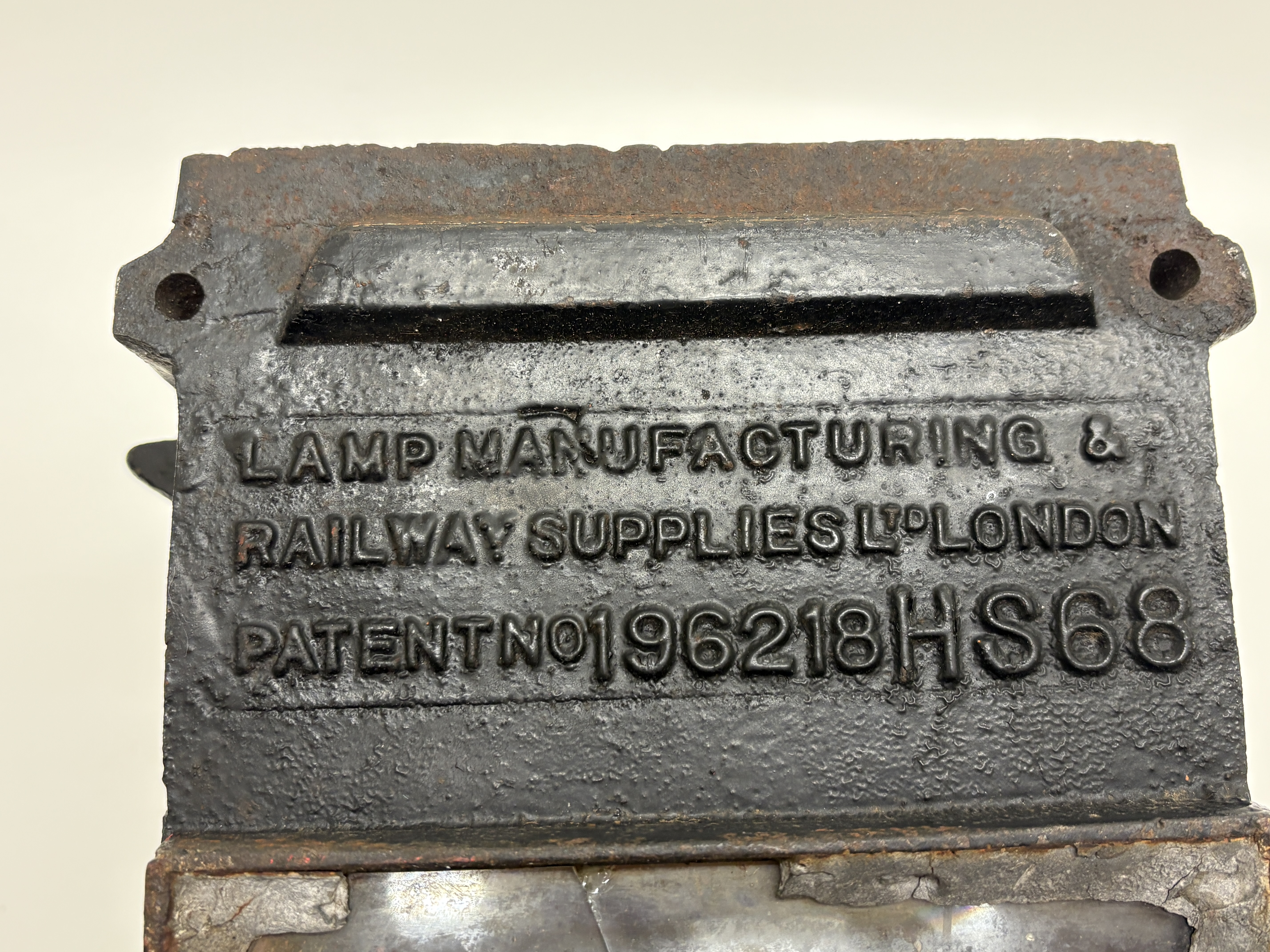 This industrial railway ground signal lamp was manufactured by Lamp Manufacturing & Railway Supplies Ltd, London. The unit features a heavy rectangular cast iron body with a prominent convex bullseye glass lens to the front. The top is fitted with a circular cap secured by two large bolts and nuts, positioned above a row of circular ventilation holes. The reverse is embossed with the manufacturer name and includes the inscription PATENT NO 196218 HS68. Below the lettering is a rectangular glass viewing pane. The lamp includes mounting brackets to the sides and base.