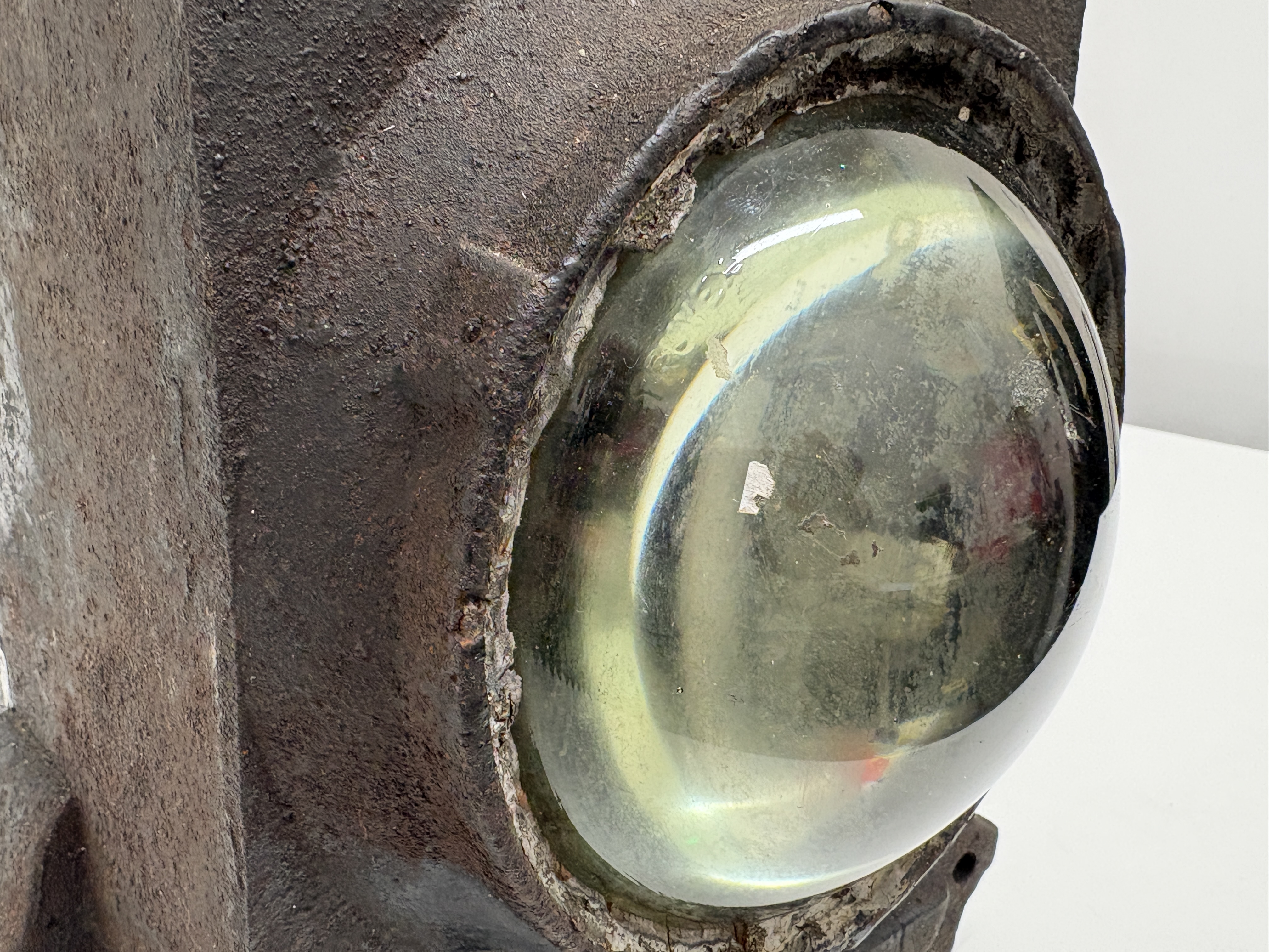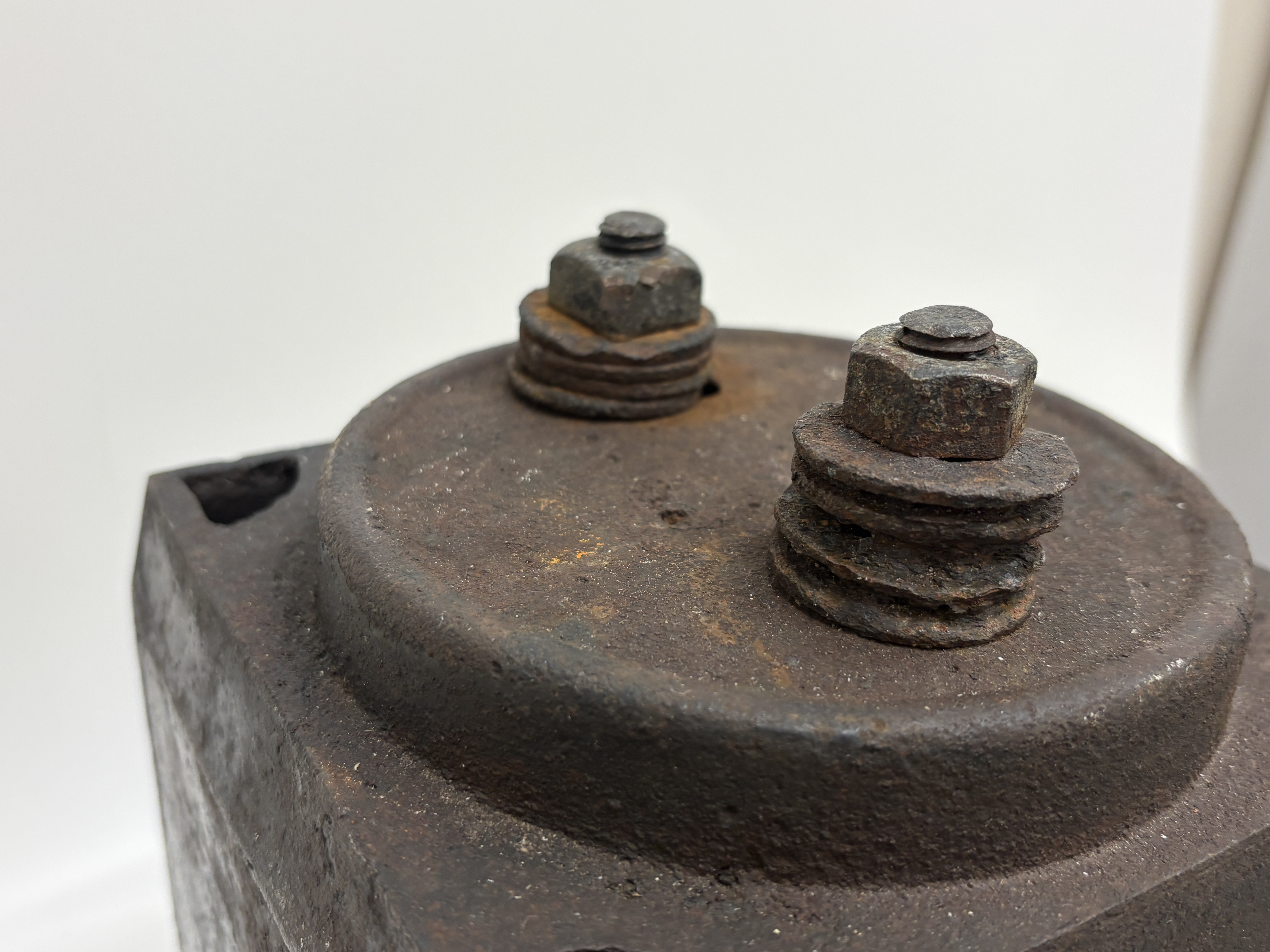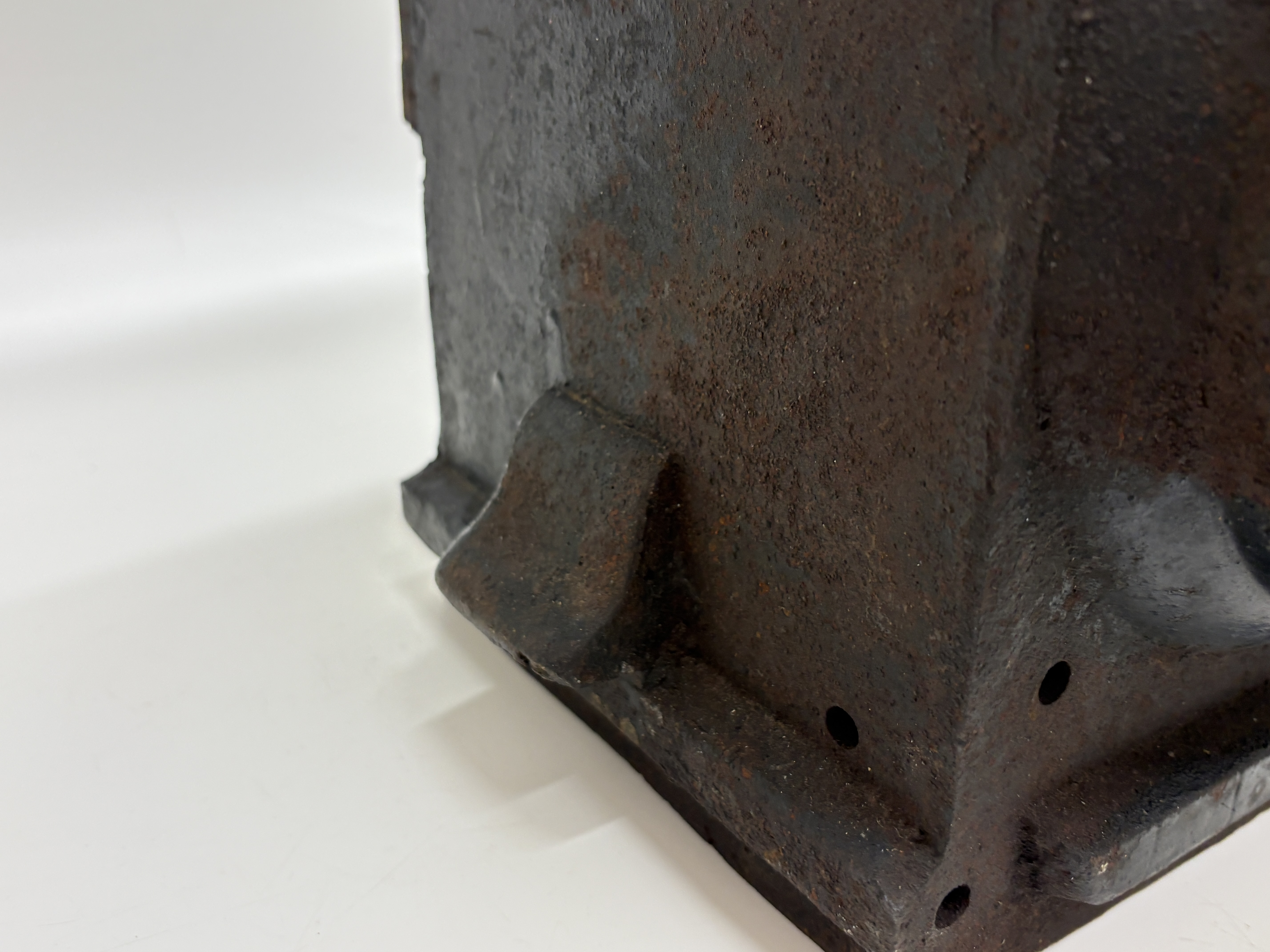 This industrial railway ground signal lamp was manufactured by Lamp Manufacturing & Railway Supplies Ltd, London. The unit features a heavy rectangular cast iron body with a prominent convex bullseye glass lens to the front. The top is fitted with a circular cap secured by two large bolts and nuts, positioned above a row of circular ventilation holes. The reverse is embossed with the manufacturer name and includes the inscription PATENT NO 196218 HS68. Below the lettering is a rectangular glass viewing pane. The lamp includes mounting brackets to the sides and base.