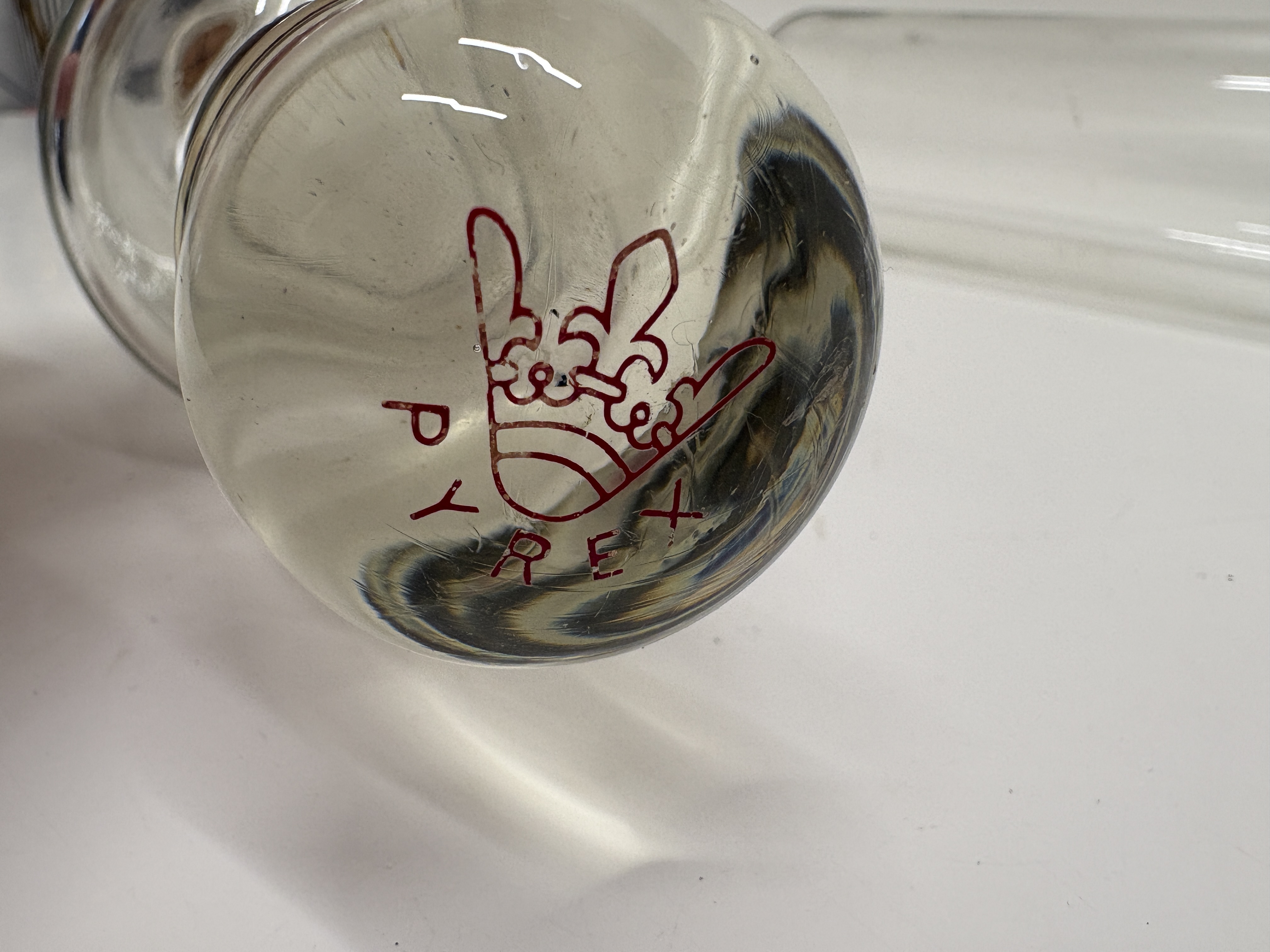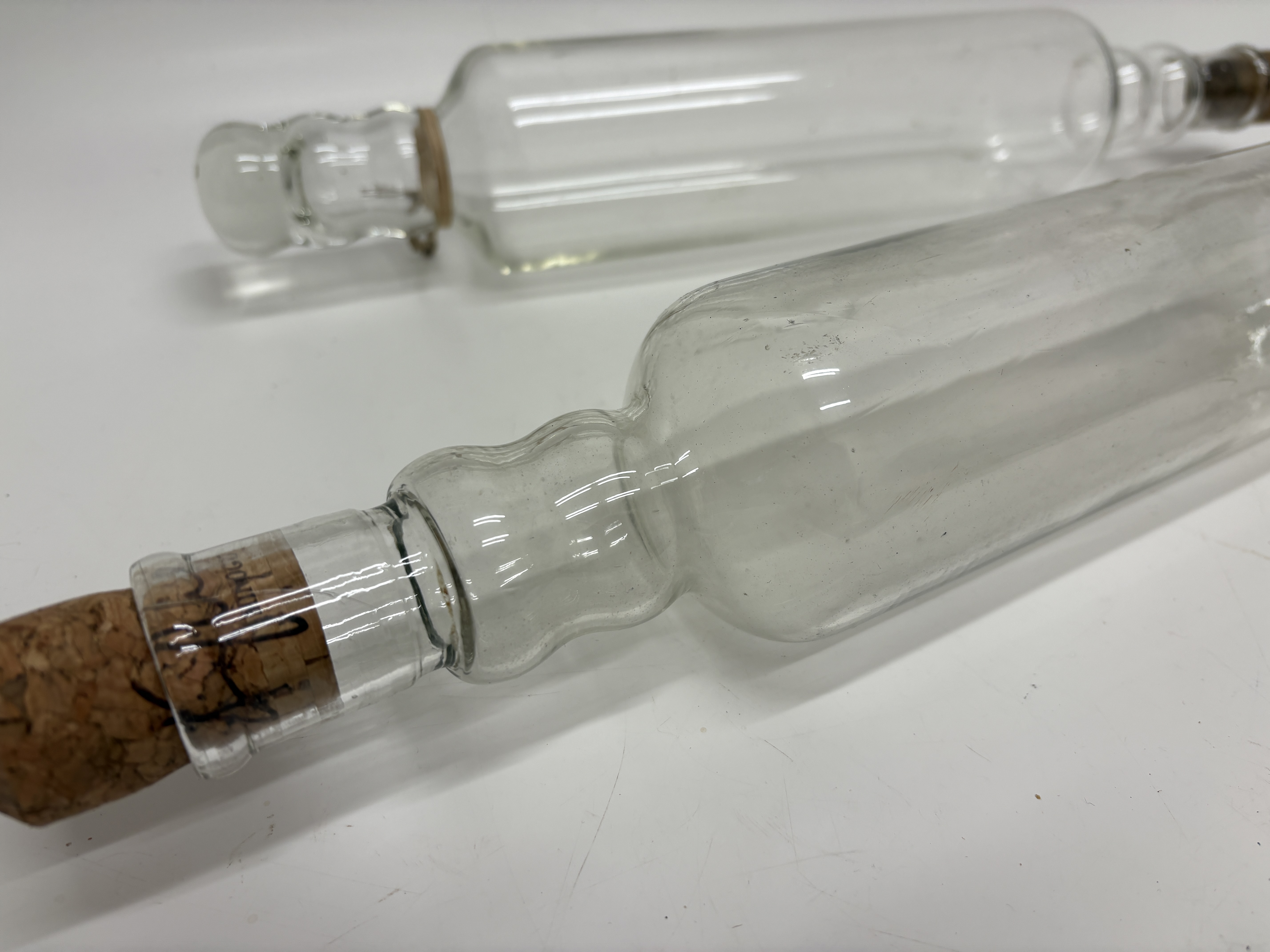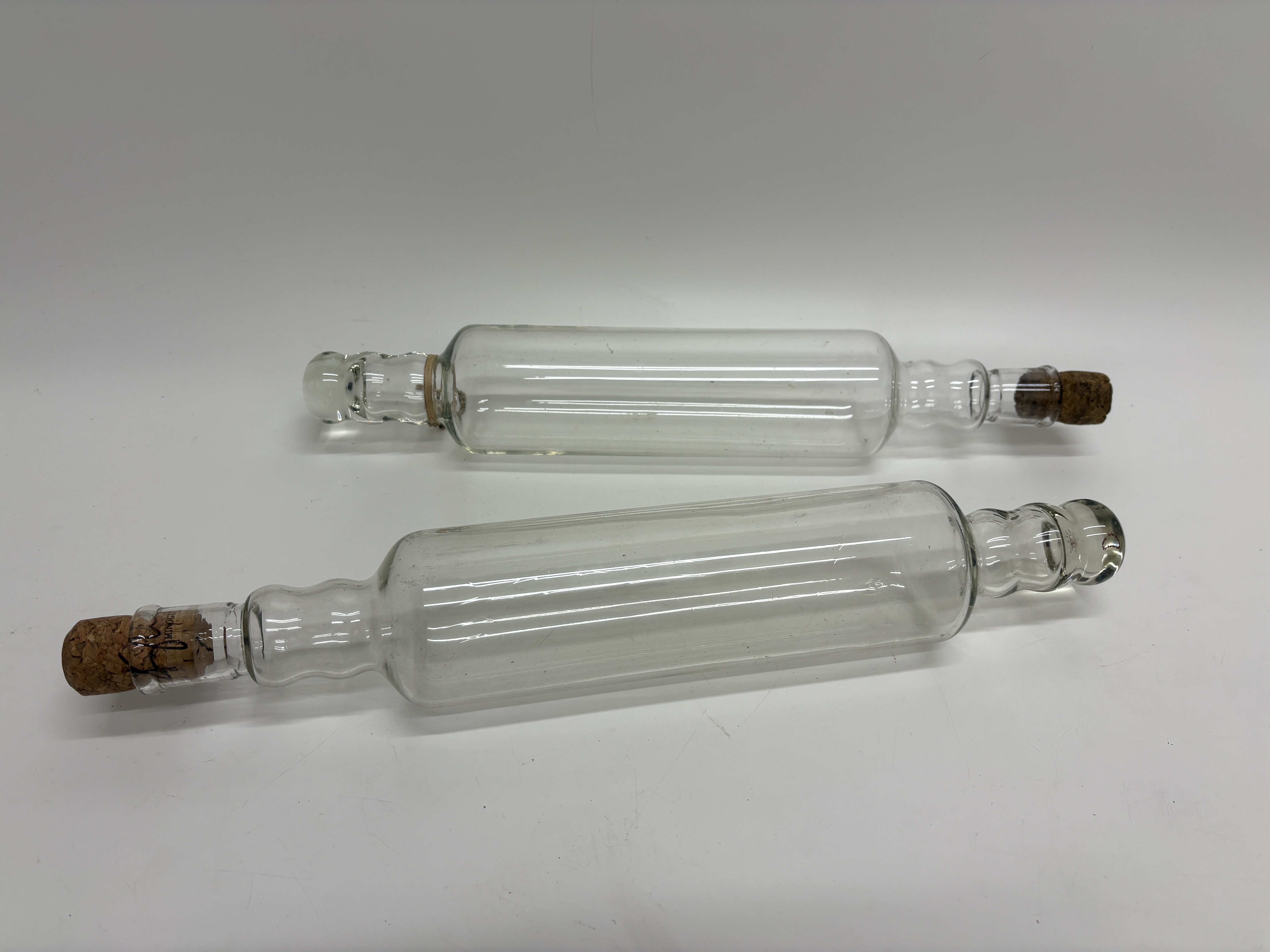 A pair of vintage Pyrex clear glass hollow rolling pins, constructed from borosilicate glass. Each kitchen implement features a cylindrical body with tapered, ribbed handles at either end, designed to be filled with cold water for the preparation of delicate pastries. The items are marked with a red Pyrex brand logo featuring a crown motif on one end and a green circular stamp reading MADE IN ENGLAND and PYREX on the other. Each pin is fitted with a natural cork stopper.