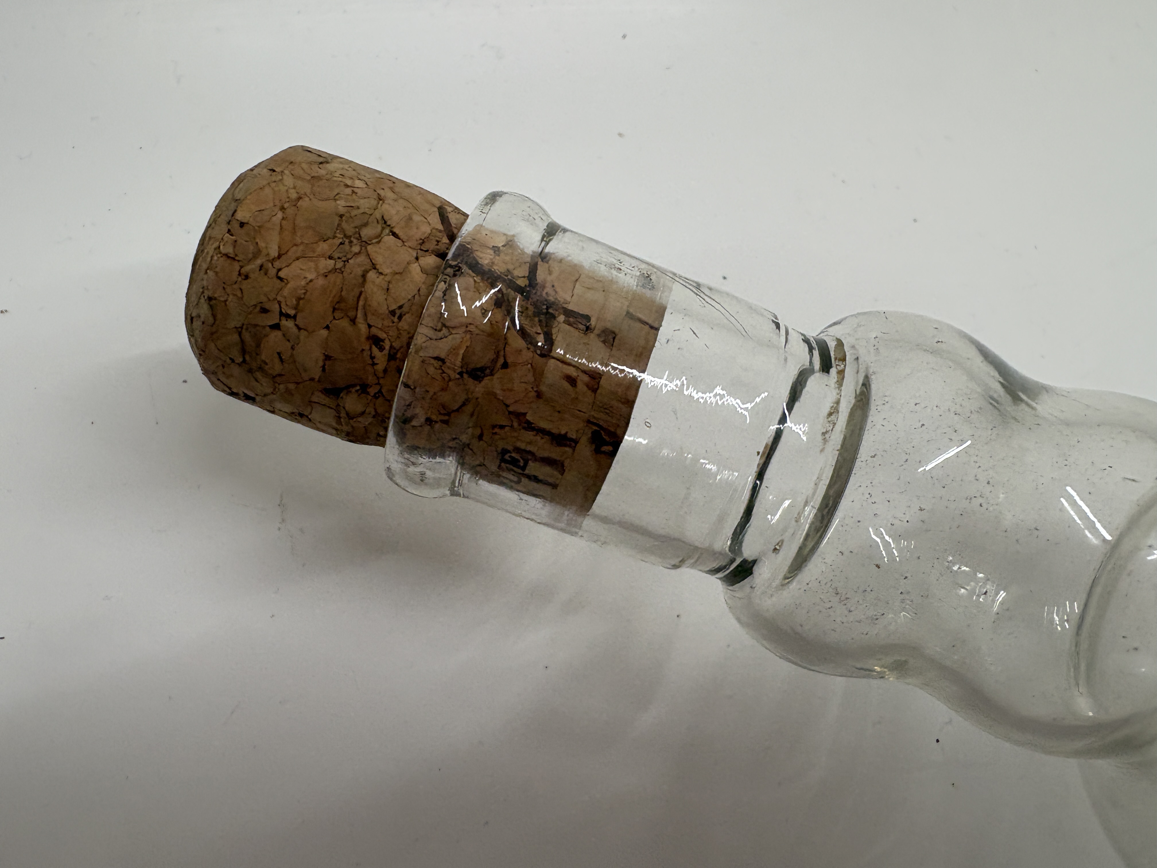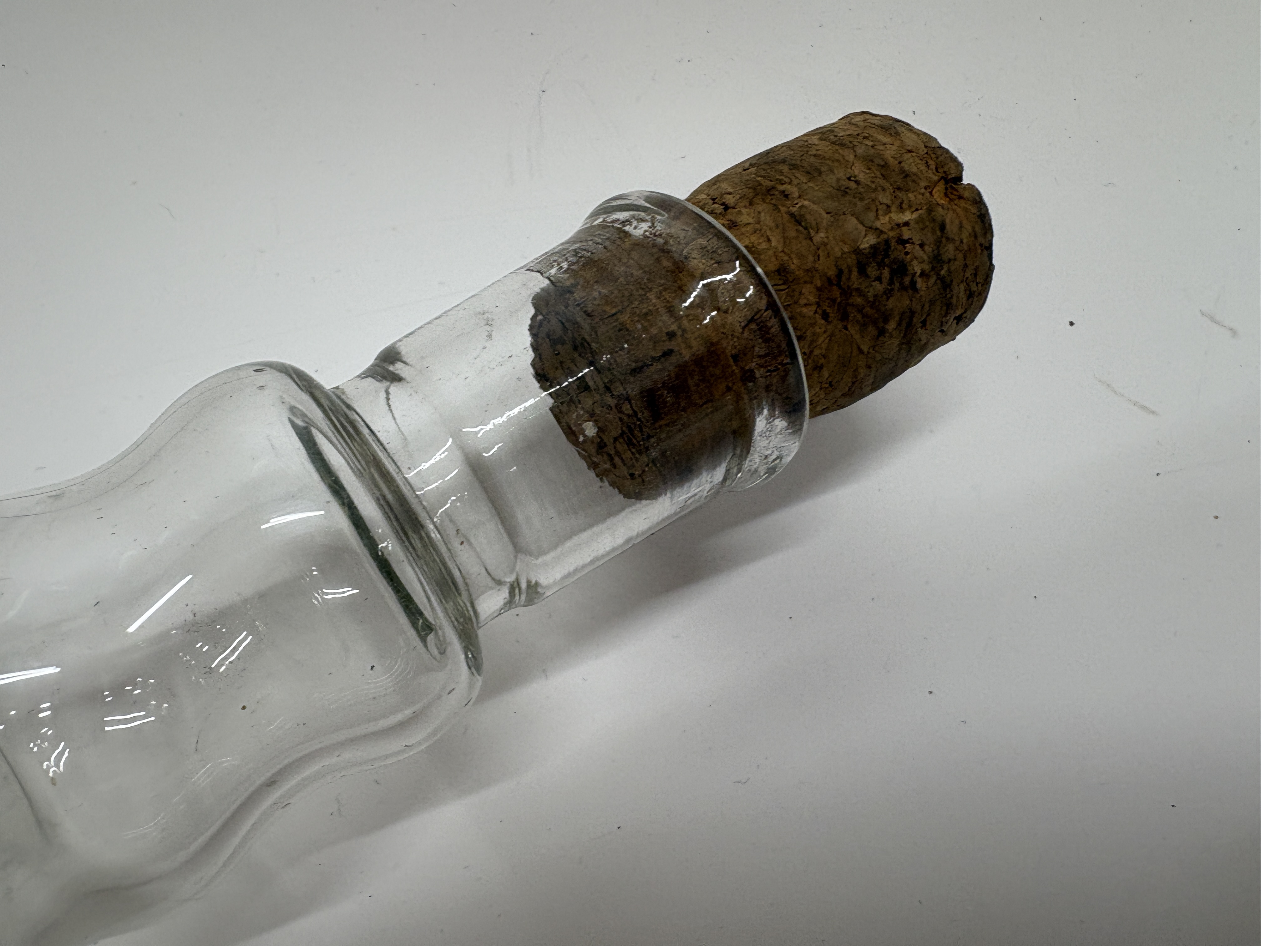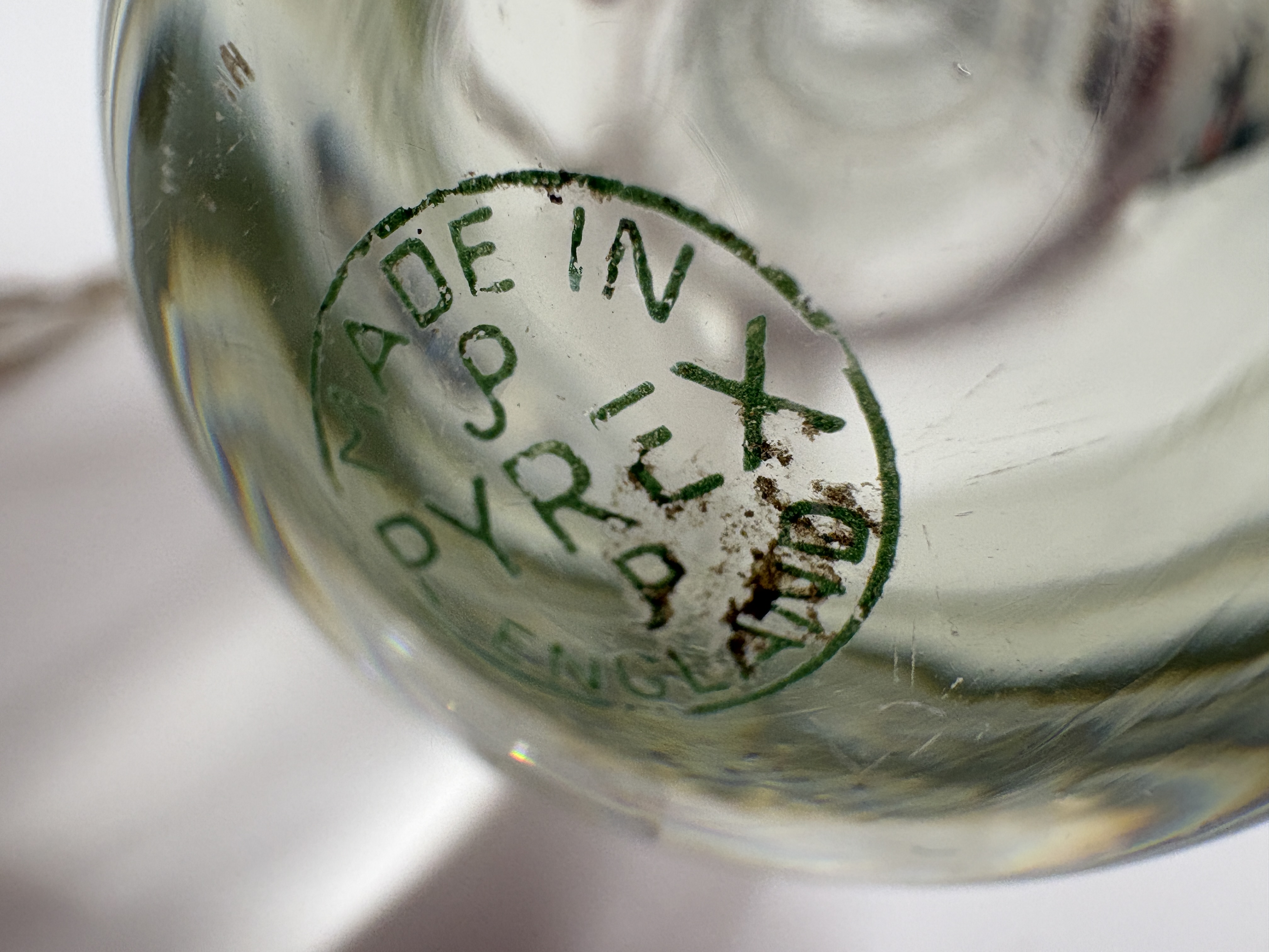 A pair of vintage Pyrex clear glass hollow rolling pins, constructed from borosilicate glass. Each kitchen implement features a cylindrical body with tapered, ribbed handles at either end, designed to be filled with cold water for the preparation of delicate pastries. The items are marked with a red Pyrex brand logo featuring a crown motif on one end and a green circular stamp reading MADE IN ENGLAND and PYREX on the other. Each pin is fitted with a natural cork stopper.