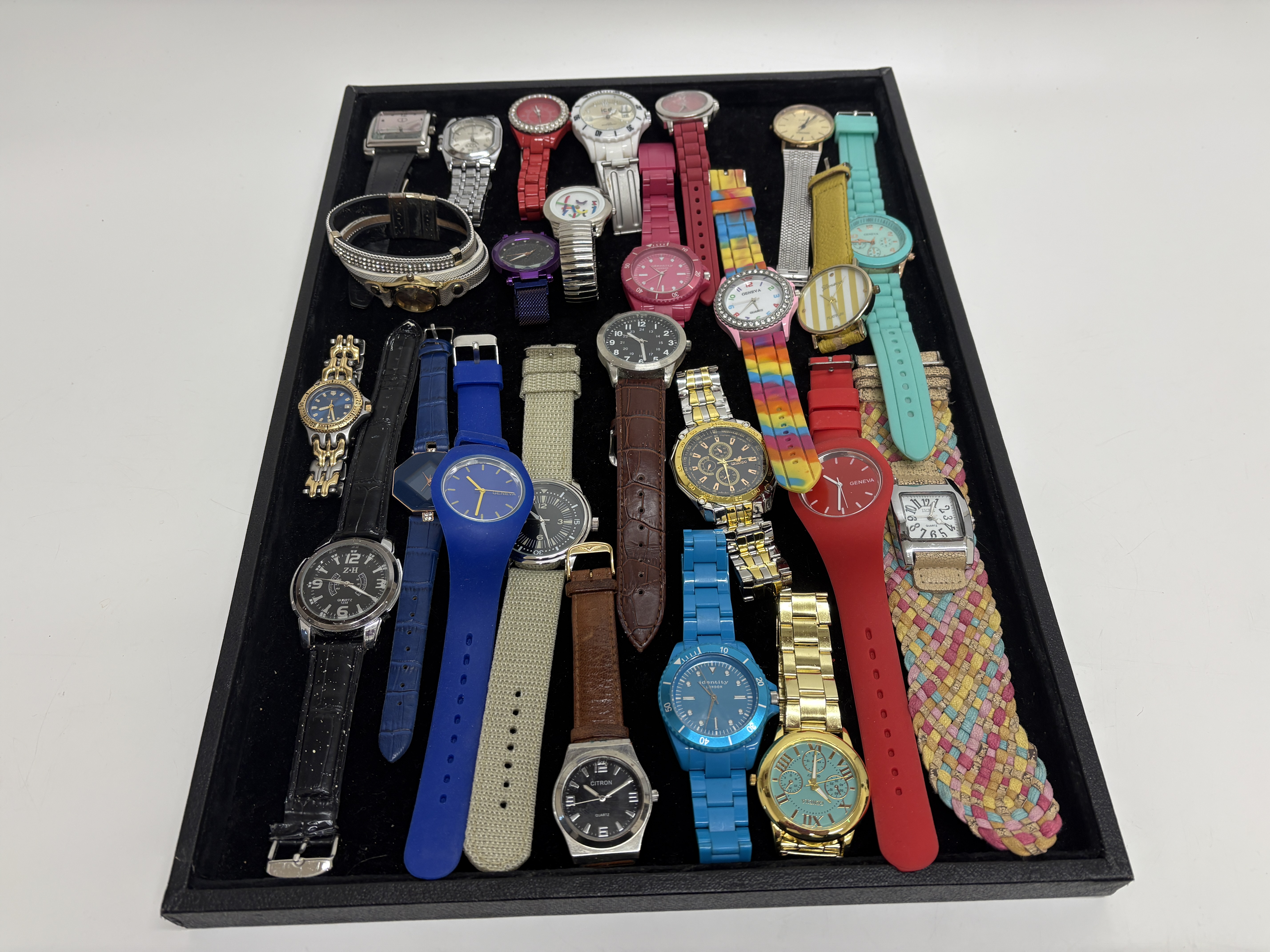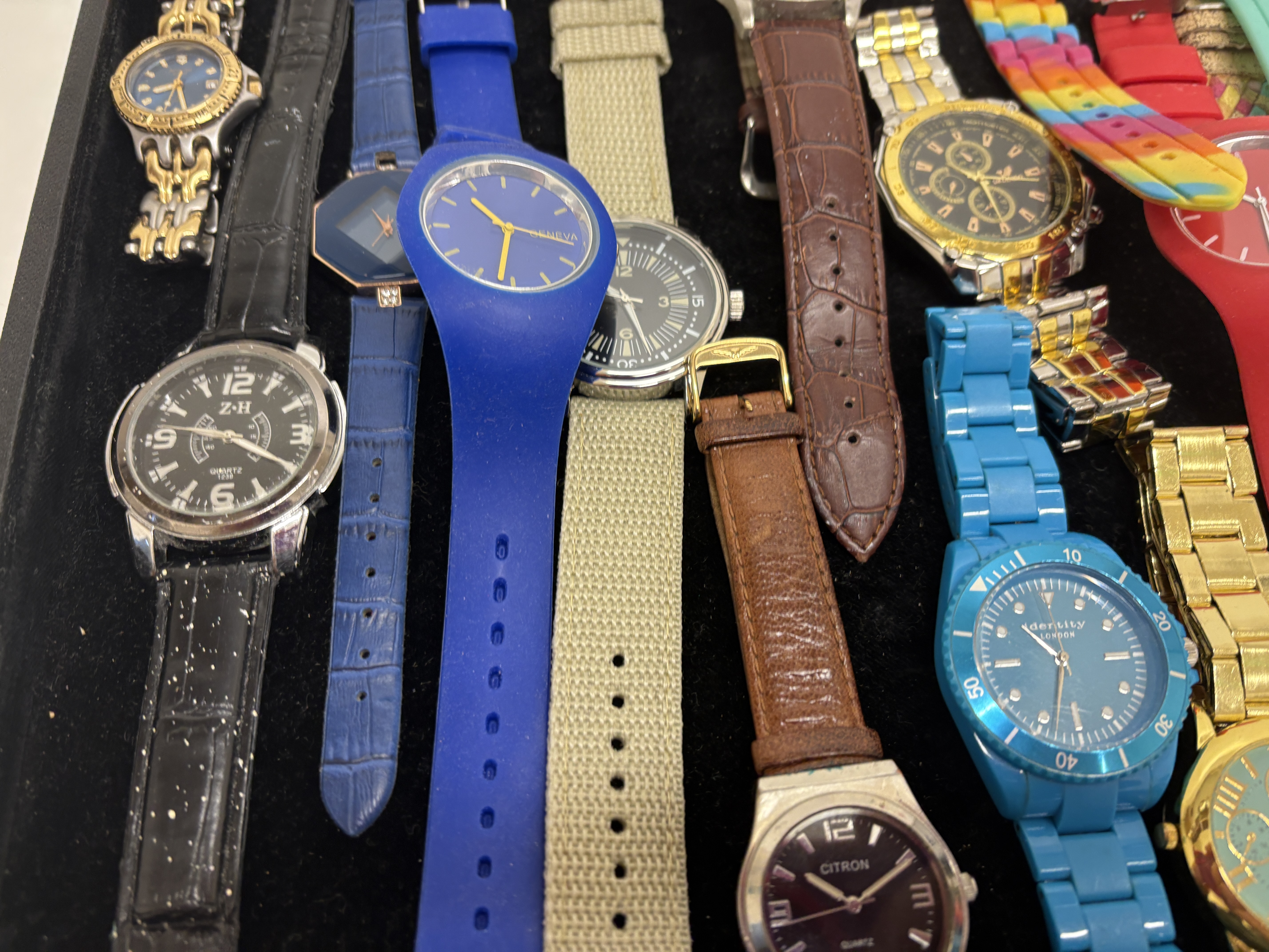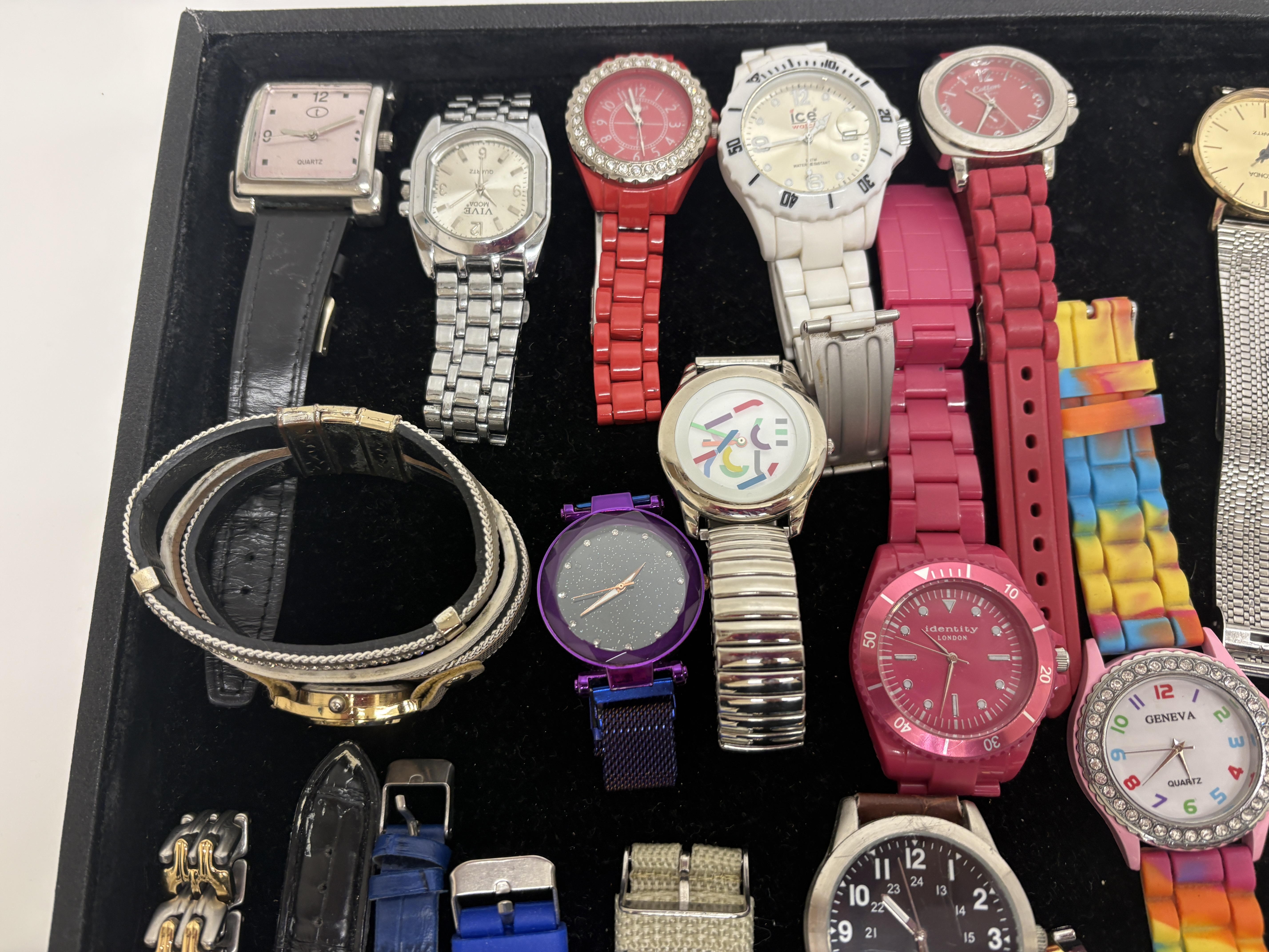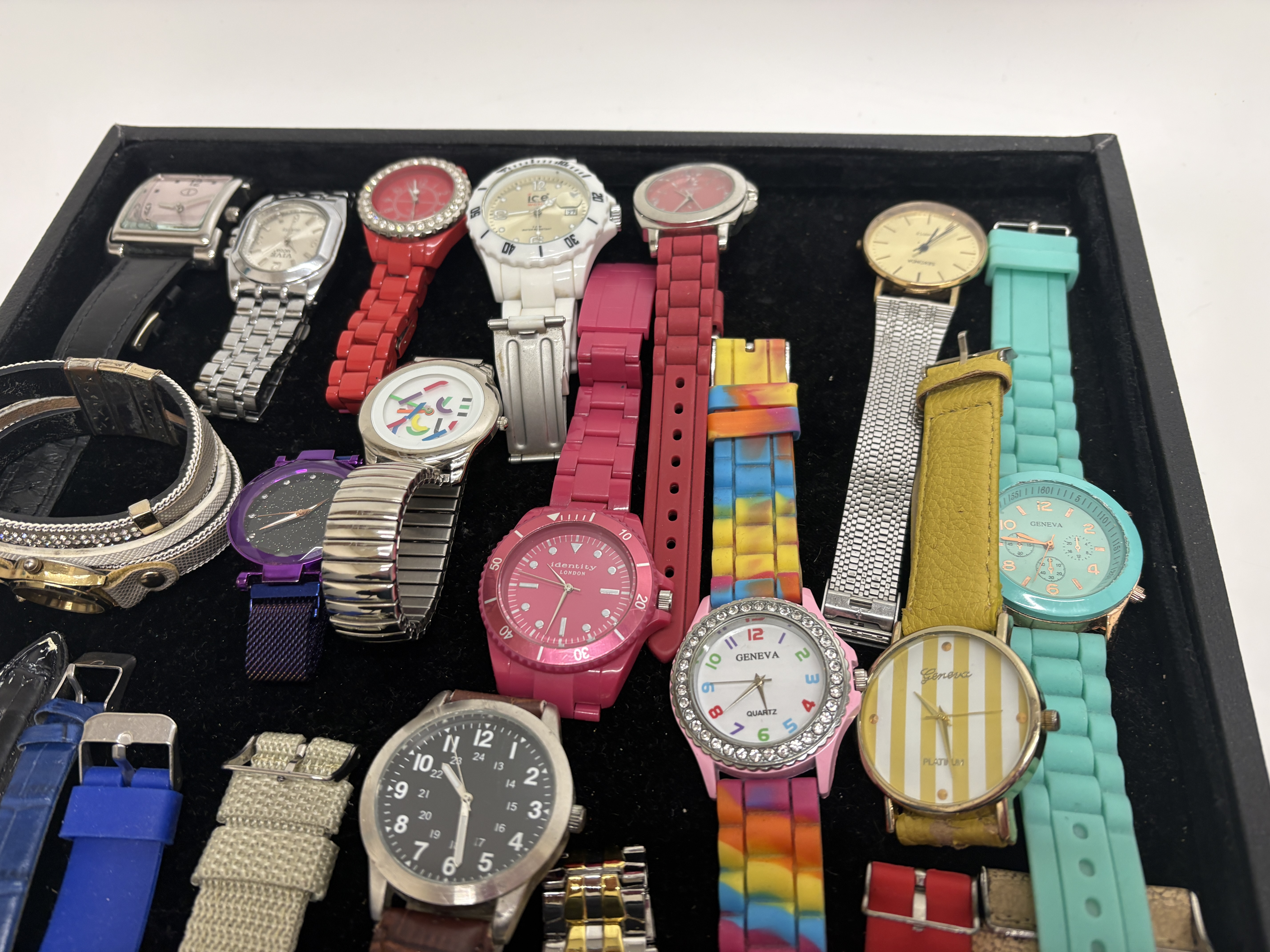 A diverse assortment of approximately 28 contemporary fashion wristwatches from various brands including Geneva, Identity London, Citron, Orlando, Vive Moda, and Geneva Platinum. The movements are primarily quartz. Case materials range from base metals with gold and silver-toned plating to plastic and silicone. Dials feature a variety of colours and designs, including minimalist styles, decorative sub-dials, and stone-set bezels. Straps and bracelets include leather, synthetic leather, silicone, woven fabric, and metal link styles. No reference numbers or serial numbers are visible. Box and papers are not included. Case sizes range from approximately 25mm to 45mm.