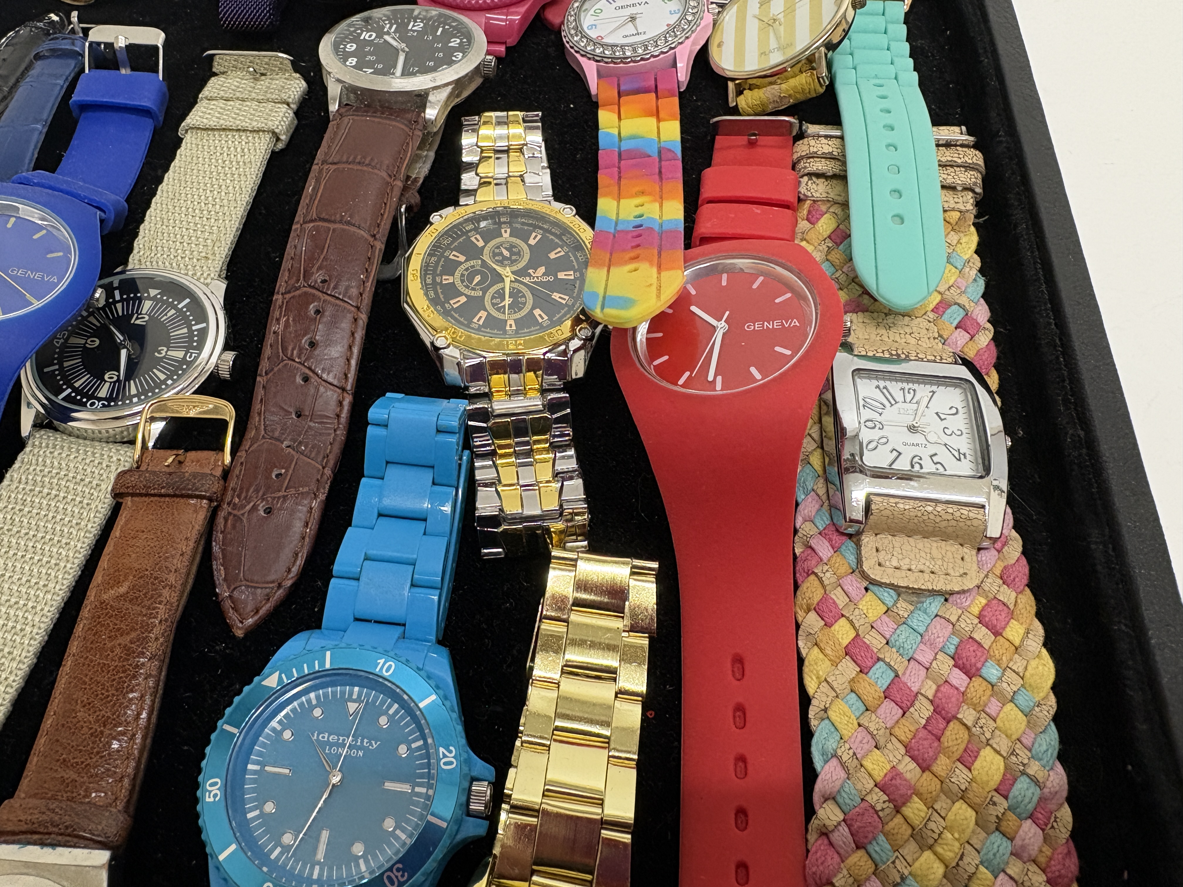 Lot 150: A collection of approximately 28 fashion wristwatches including Geneva, Identity London and Orlando.