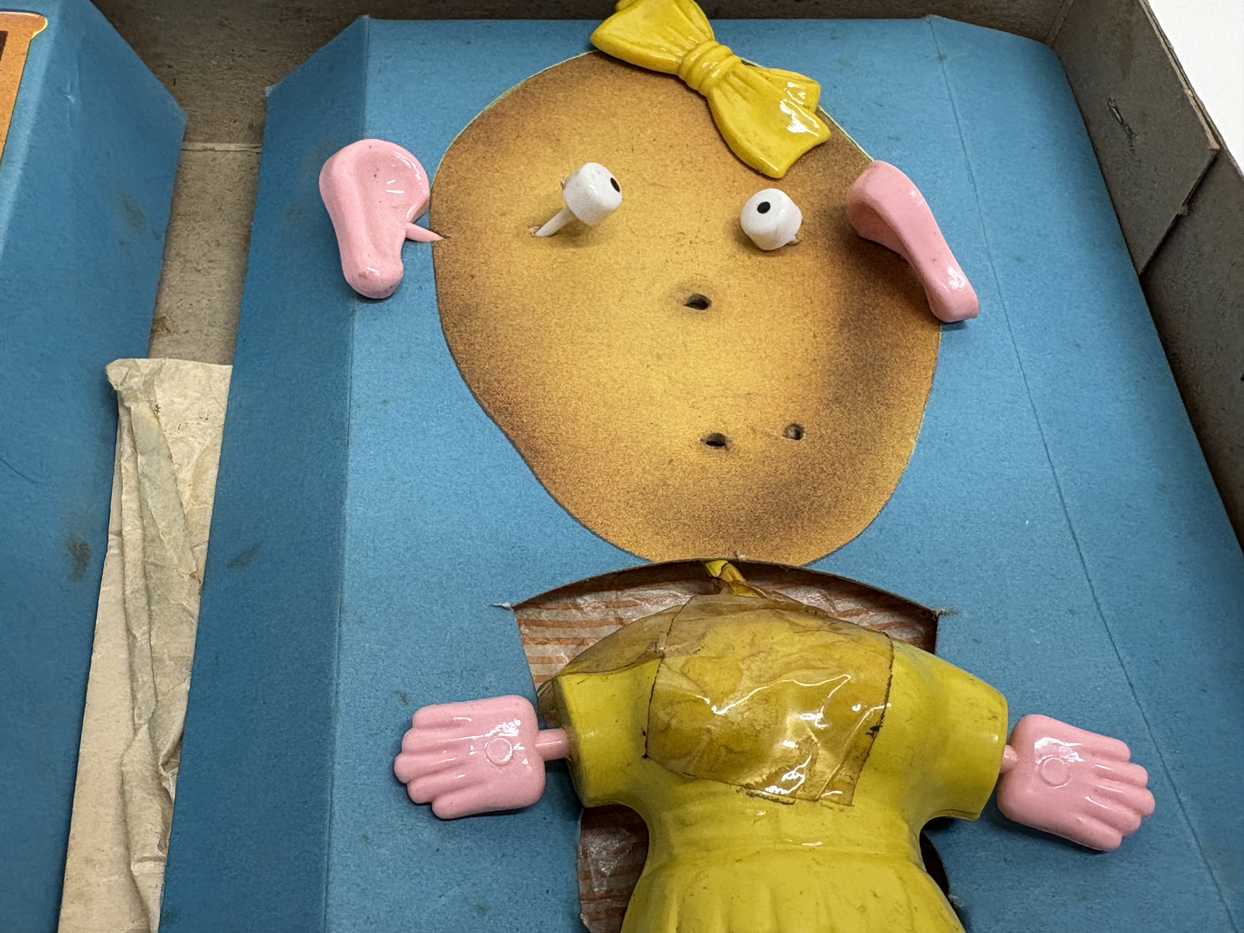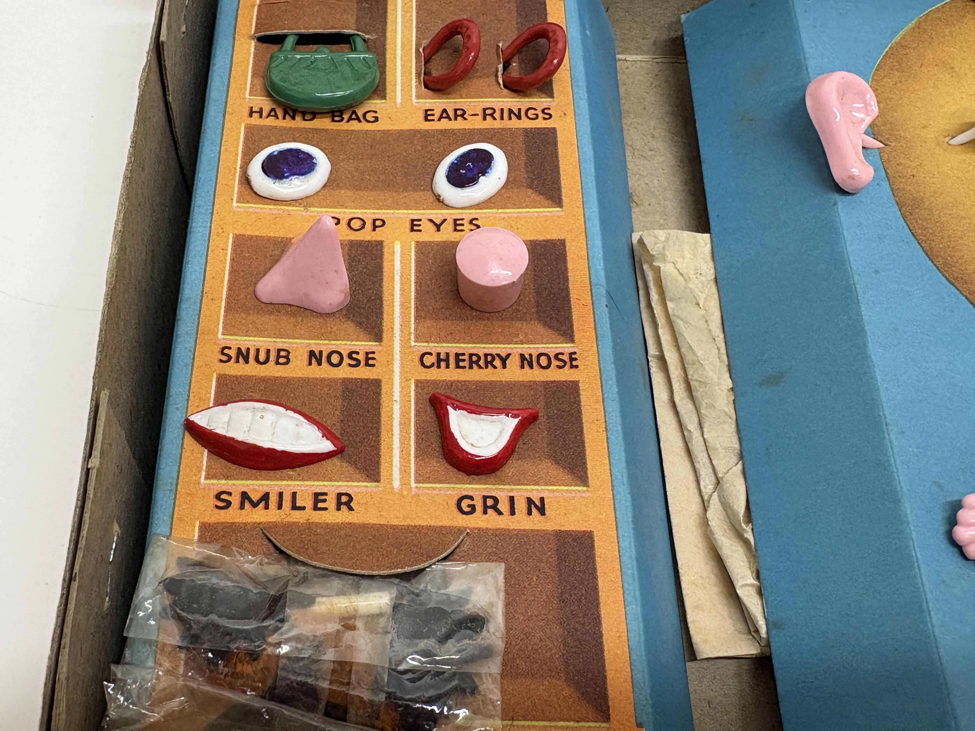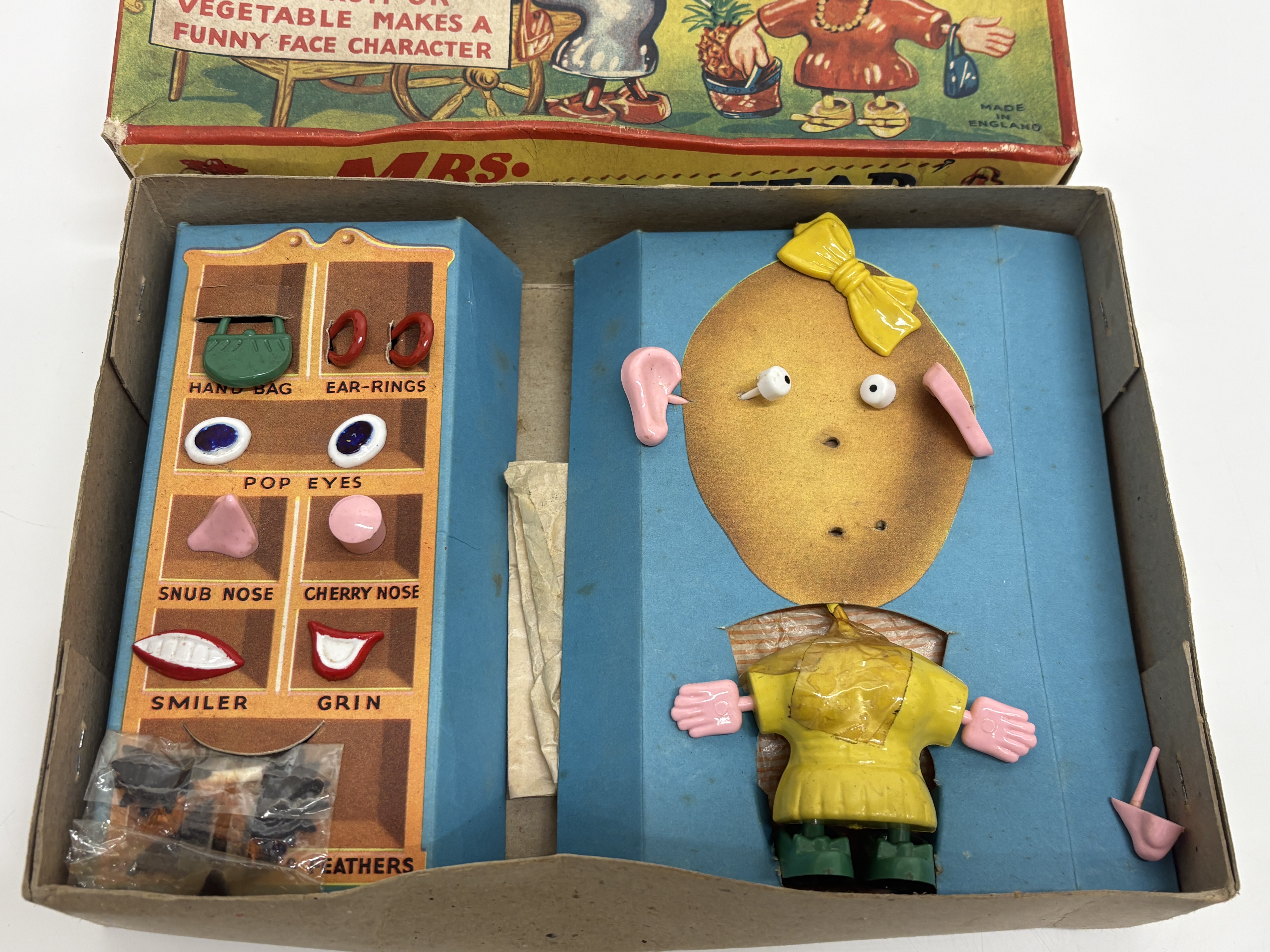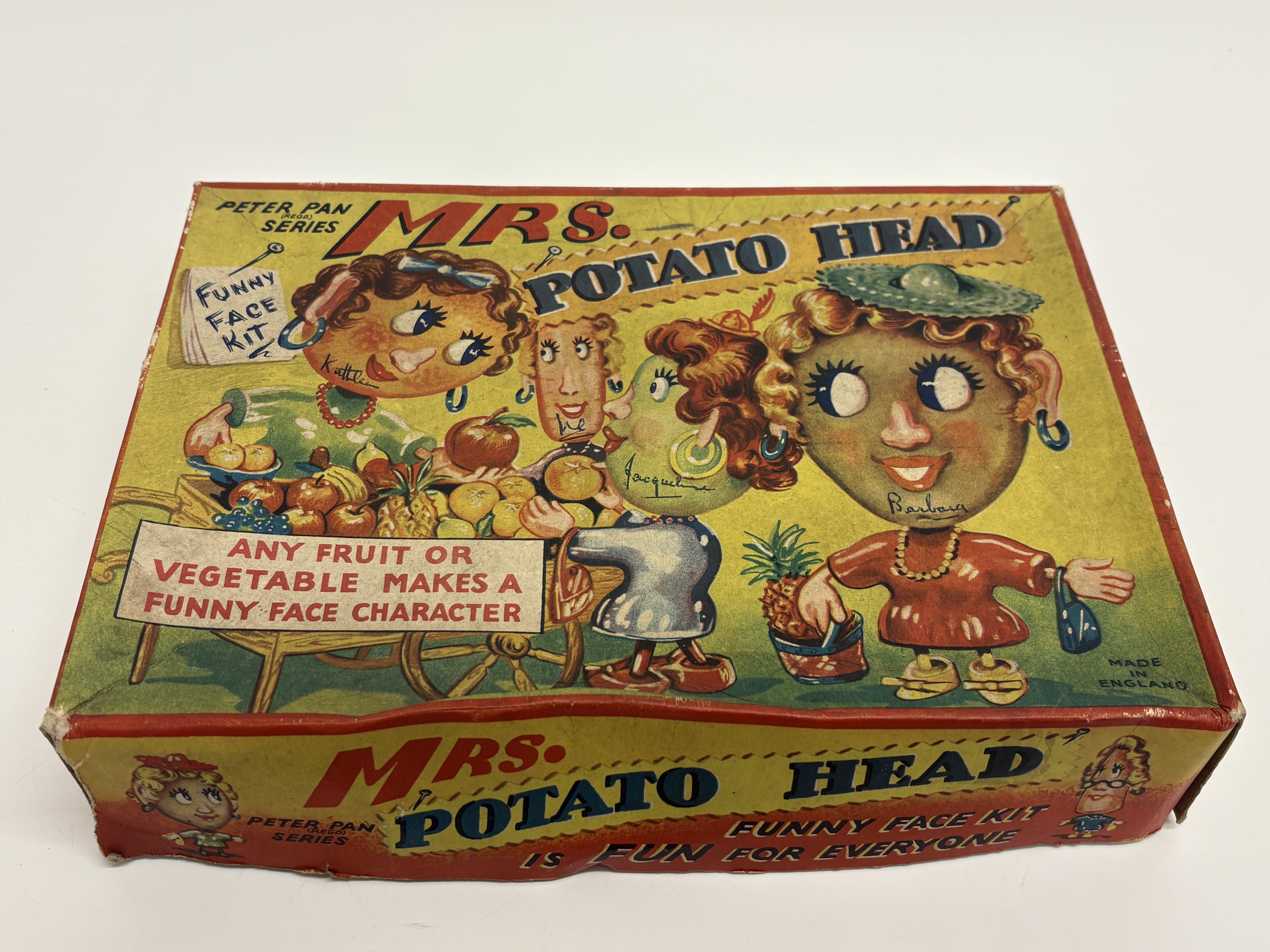 Manufactured by Peter Pan Series (ASGD) in England, this is a vintage Mrs. Potato Head “Funny Face Kit” dating from the circa 1950s. This creative assembly toy comprises various moulded plastic accessory pieces designed to be plugged into real fruit or vegetables to create characters. The set includes its original illustrated cardboard lid and base, along with internal display inserts. As a manual assembly kit, there are no mechanical parts.