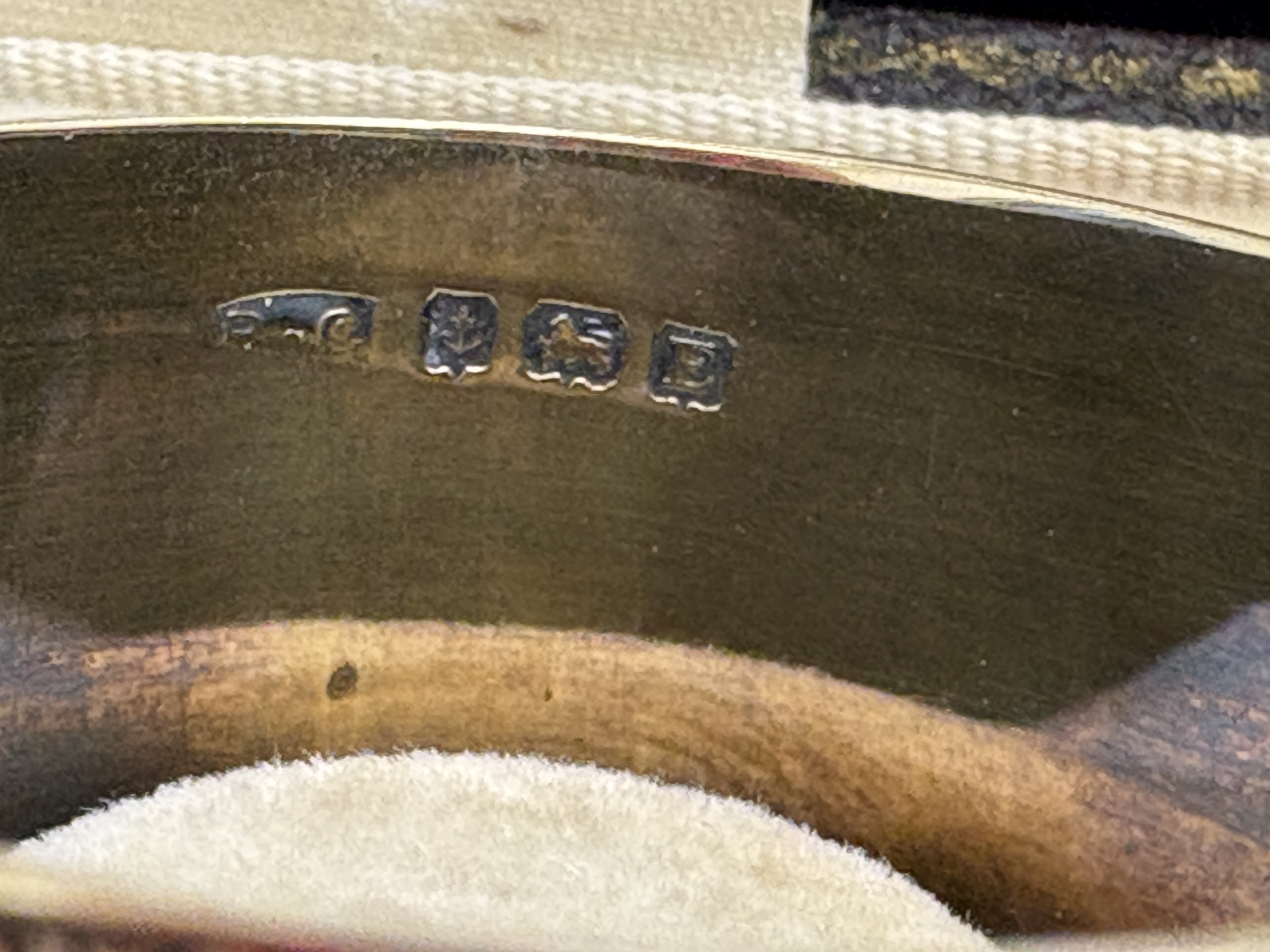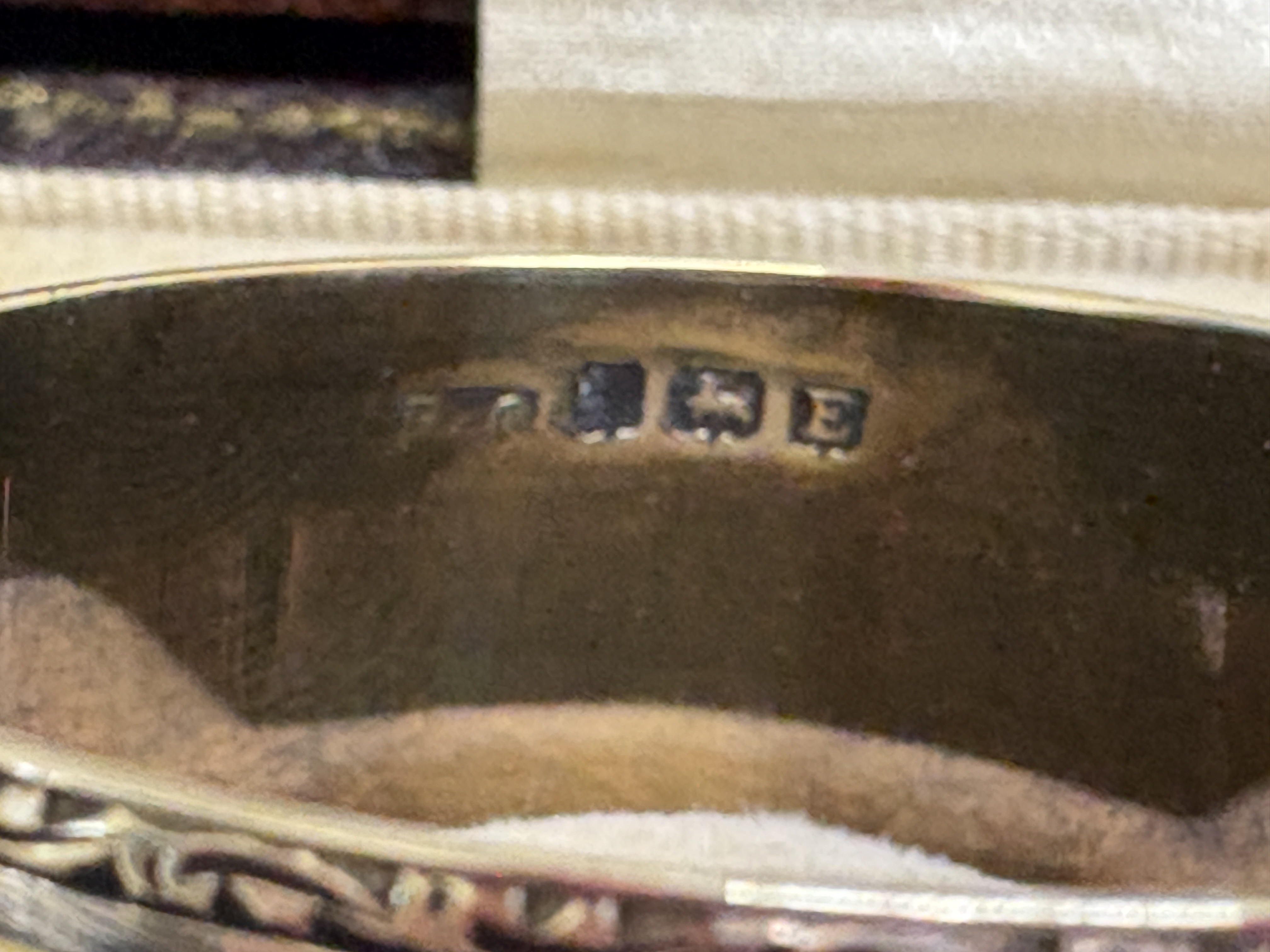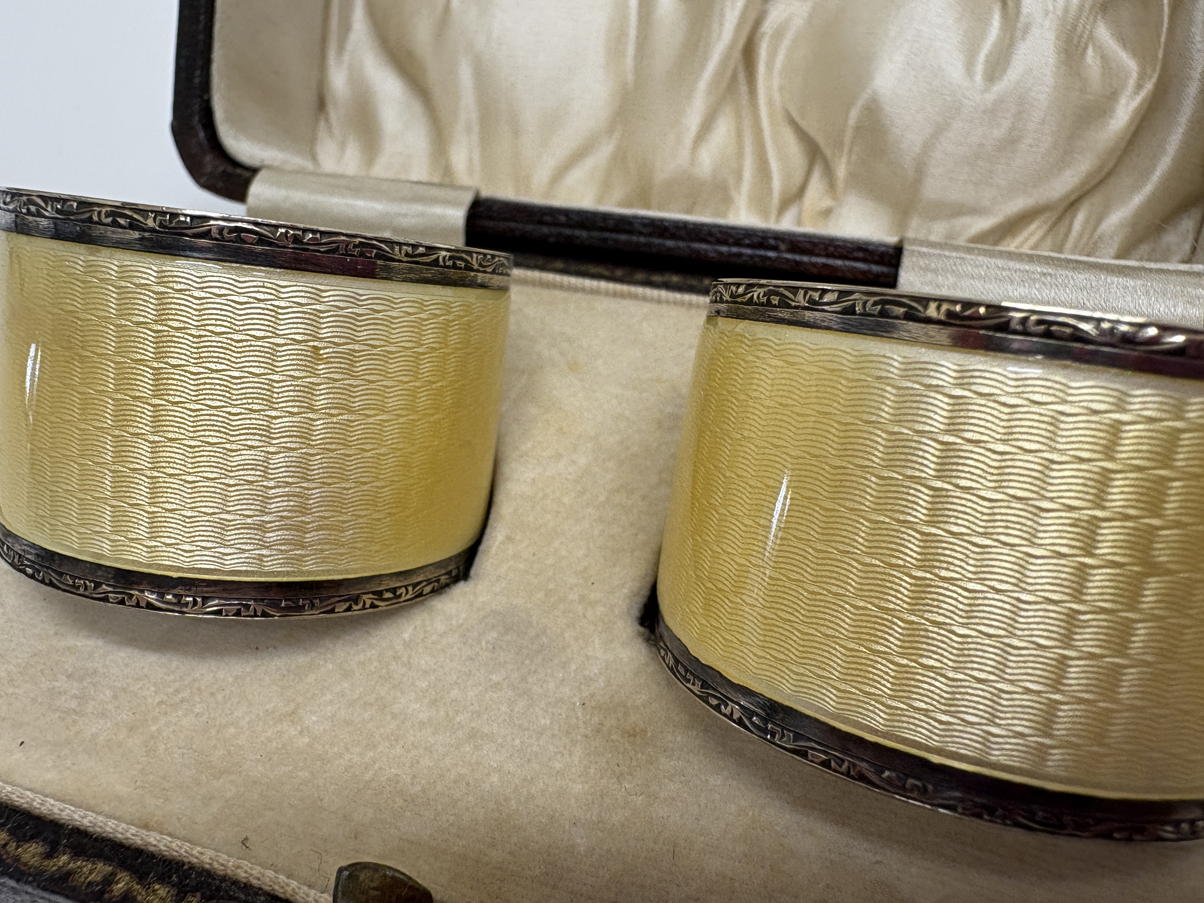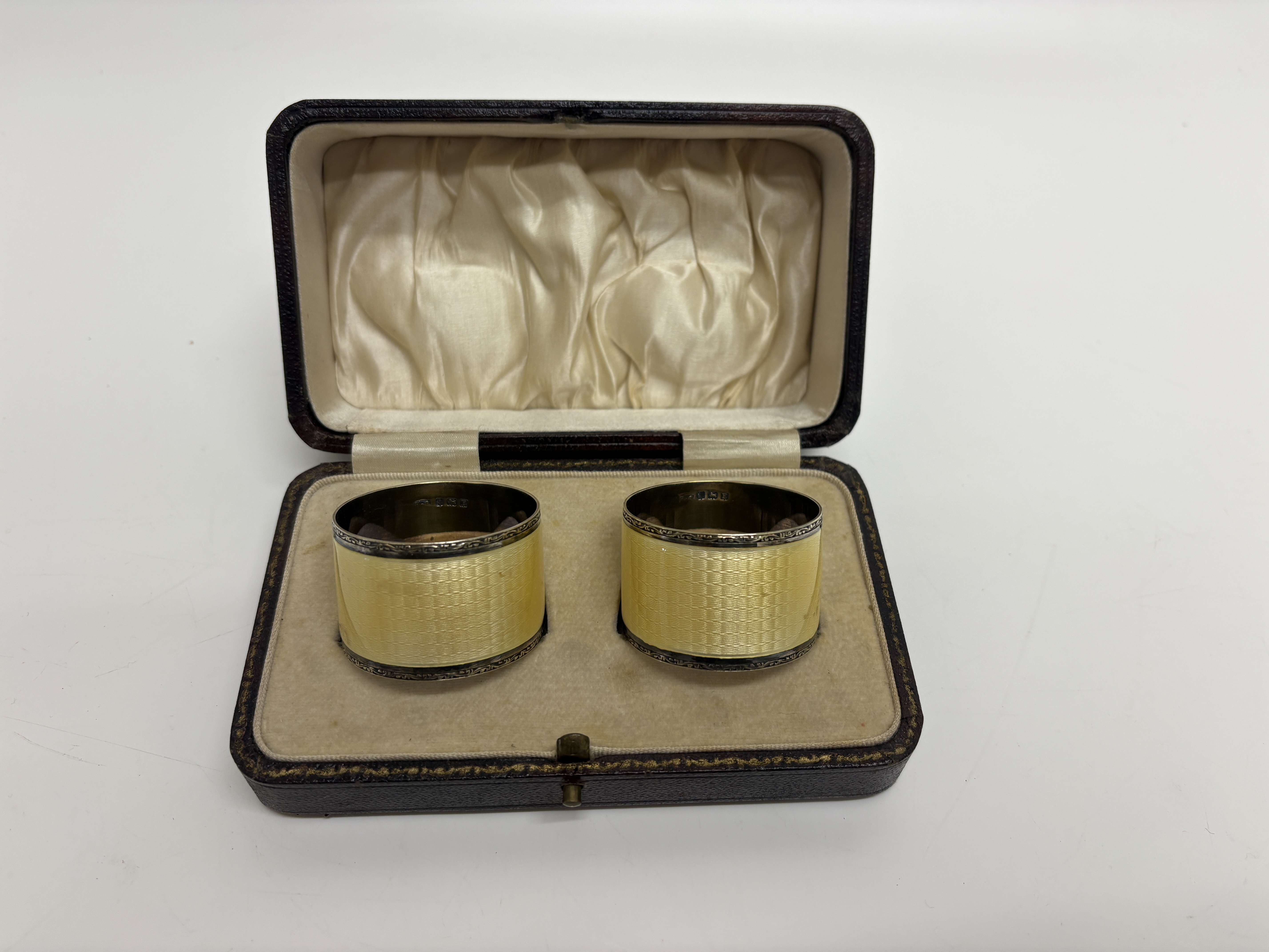 A fine pair of Art Deco sterling silver and guilloché enamel napkin rings, manufactured by the renowned silversmiths Sanders & Mackenzie. Each cylindrical ring features a broad band of translucent pale yellow enamel applied over a delicate wavy engine-turned ground, creating a shimmering effect. The enamel is bordered by narrow silver rims featuring chased foliate decoration. The interiors are finished in a natural silver and bear a full suite of English hallmarks. Marks include the maker’s mark S&M for Sanders & Mackenzie, the anchor for the Birmingham assay office, the lion passant indicating sterling silver fineness, and the date letter E for 1929. The pair is housed in its original rectangular leatherette presentation case with a cream silk and velvet-lined interior. Dimensions: Approximately 45mm diameter each.