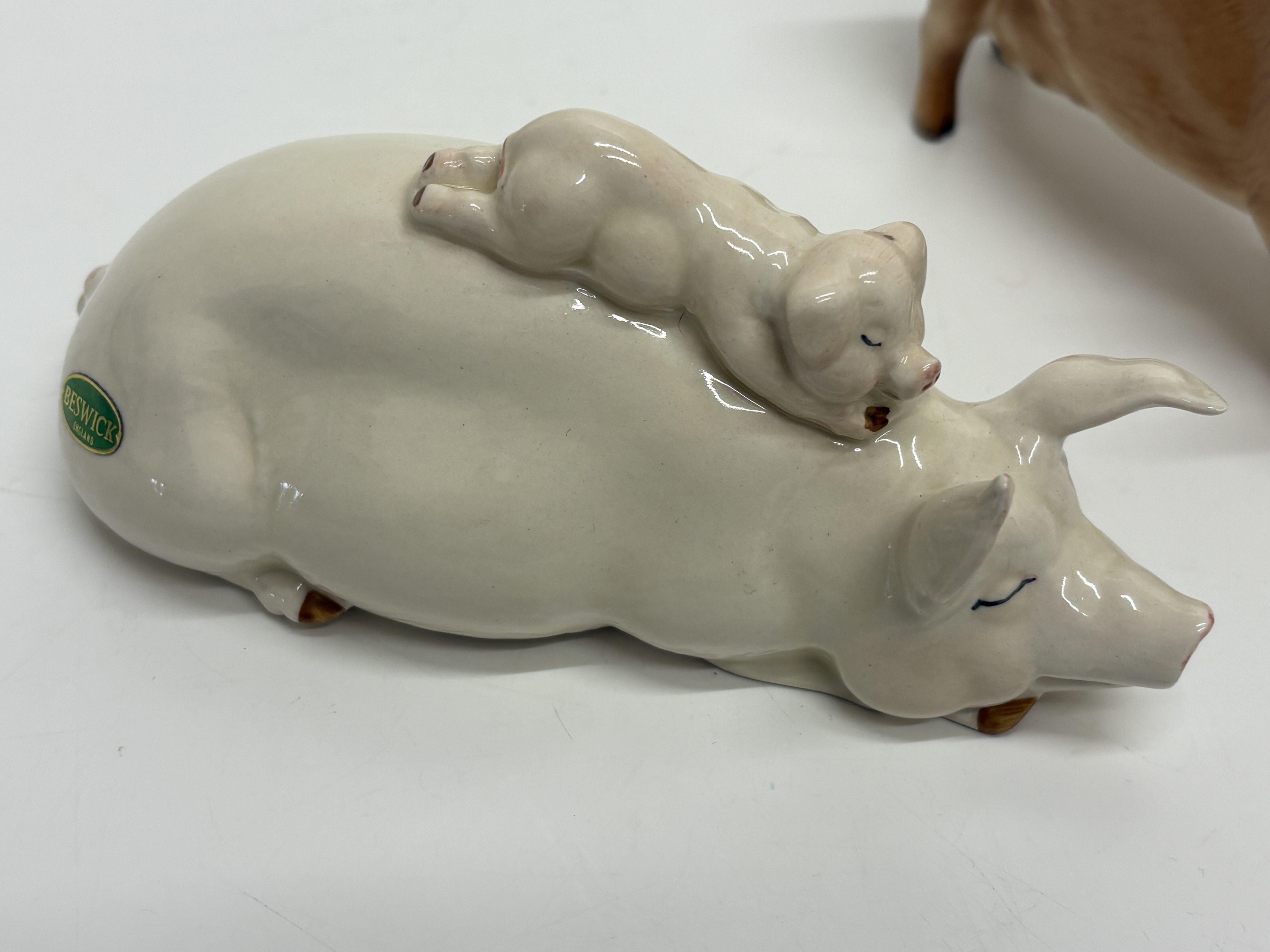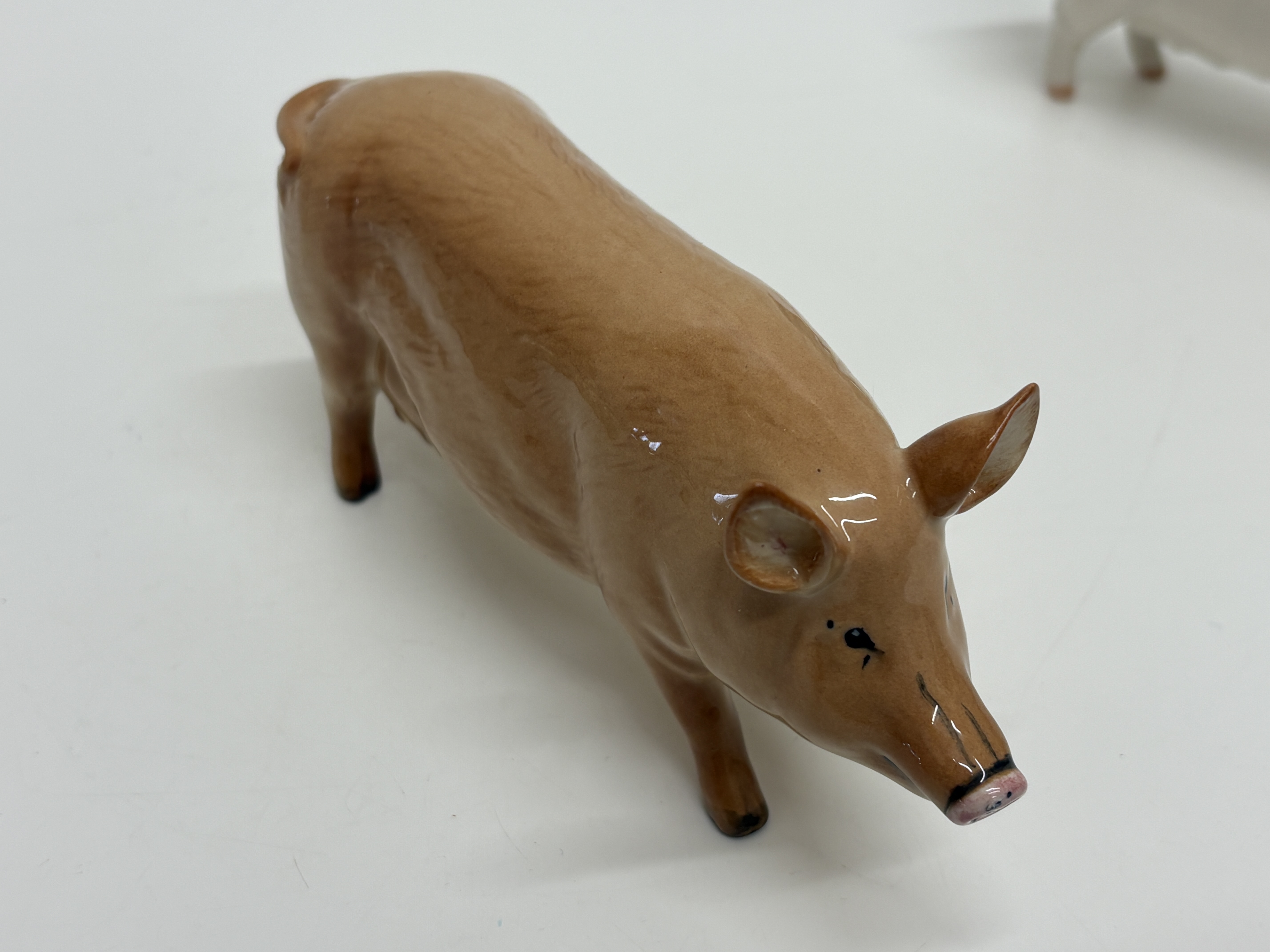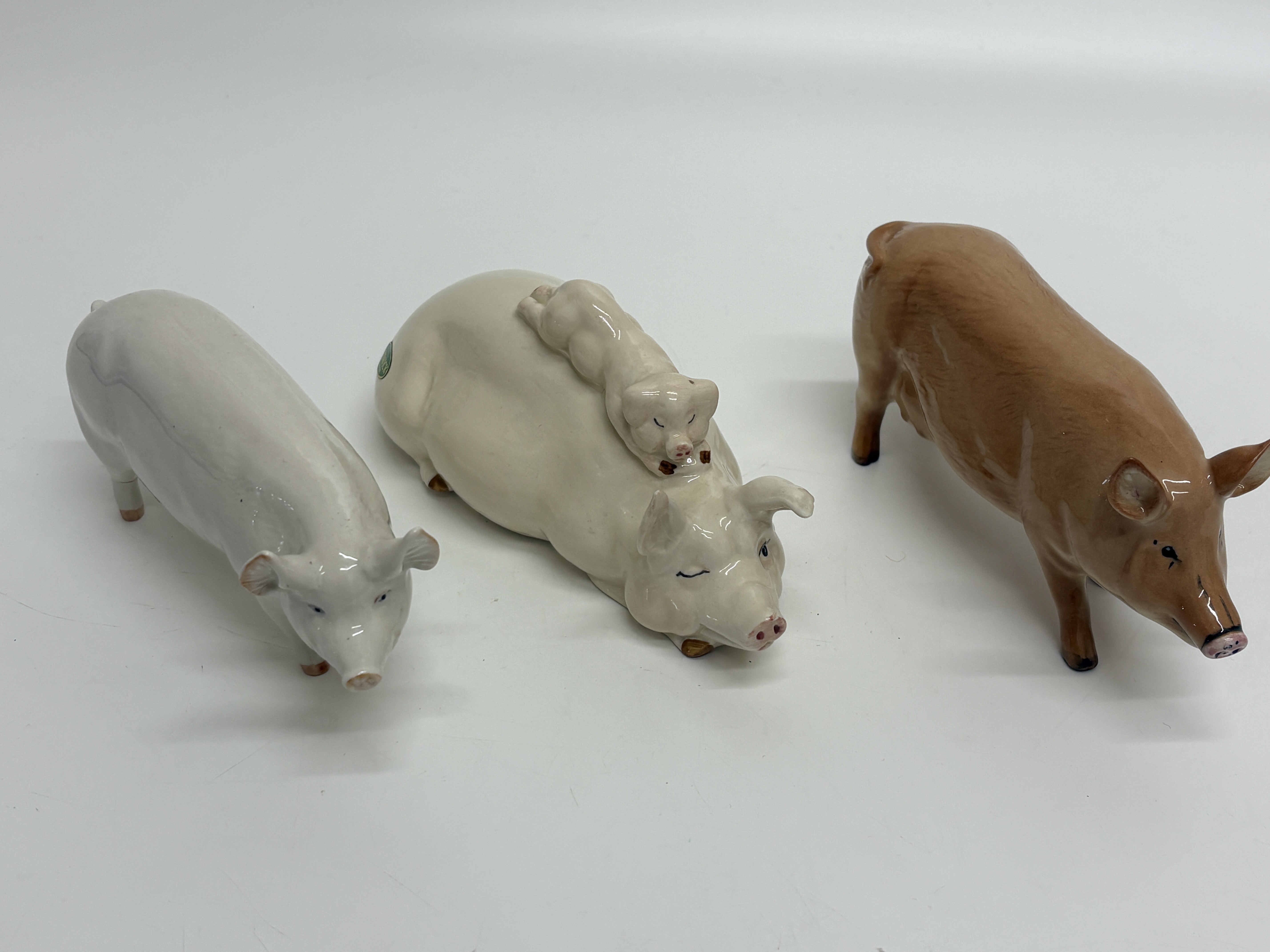 A collection of three vintage English ceramic pig figurines from noted manufacturers. The lot includes a Beswick standing sow “Champion Wall Queen 40th” in a white gloss glaze, marked with a black underglaze stamp and hand-painted script identifying the prize-winning pedigree. Also included is a Beswick reclining sow with piglet, model number 106, featuring a creamy white finish, original green and gold foil label, and circular backstamp. The third piece is a Royal Doulton standing Tamworth pig, model DA 215, finished in a naturalistic tan gloss glaze with dark accents to the snout and eyes, bearing the blue lion and crown factory mark to the underside. Heights approximately 7cm to 10cm.