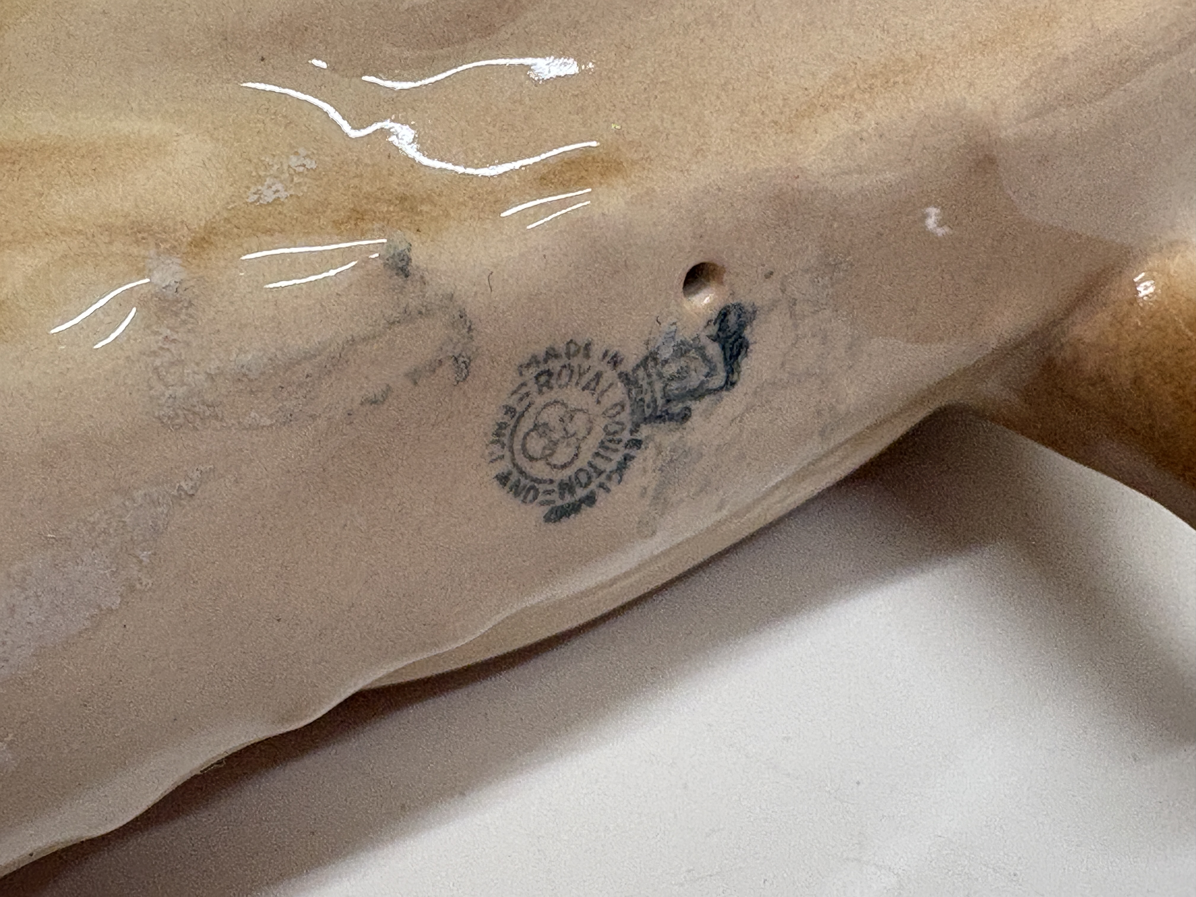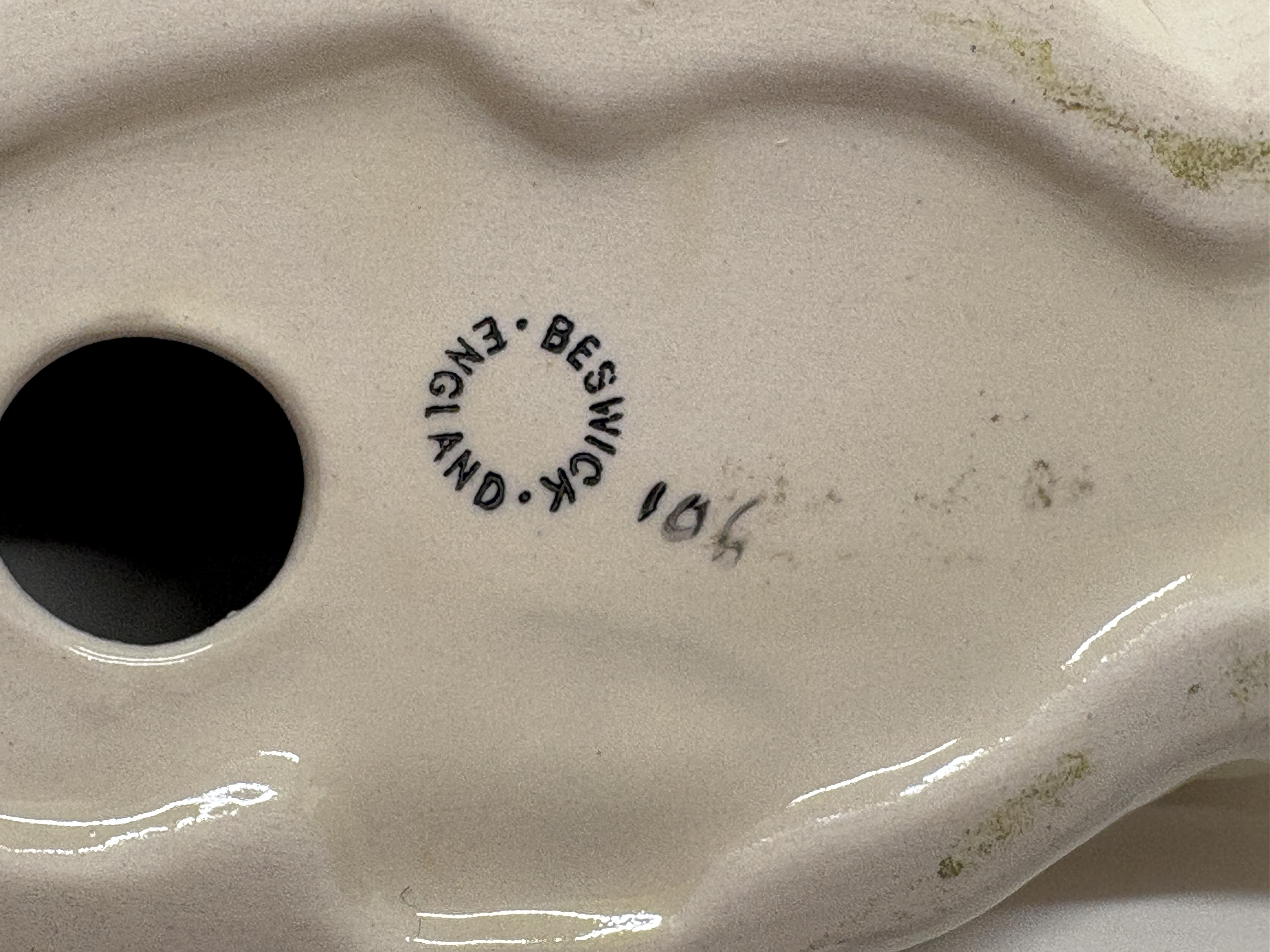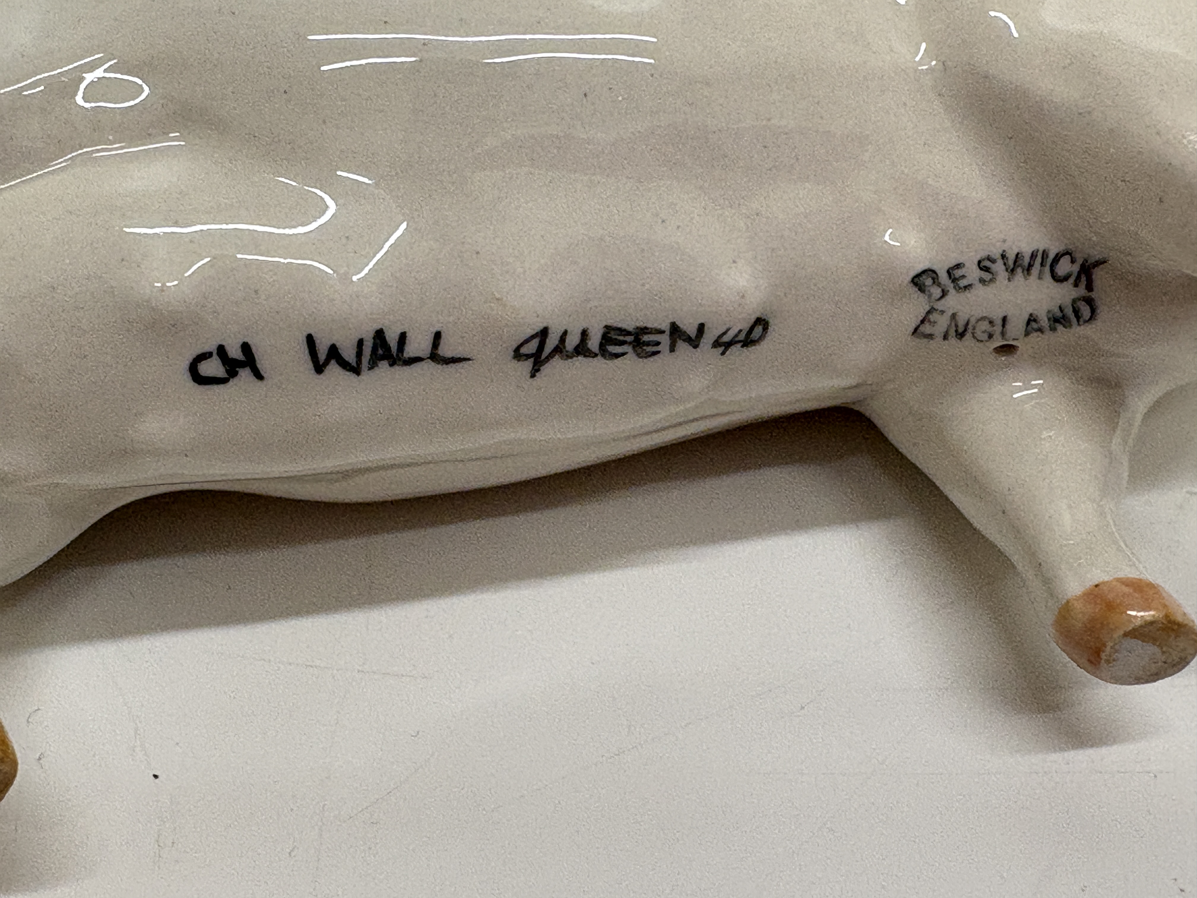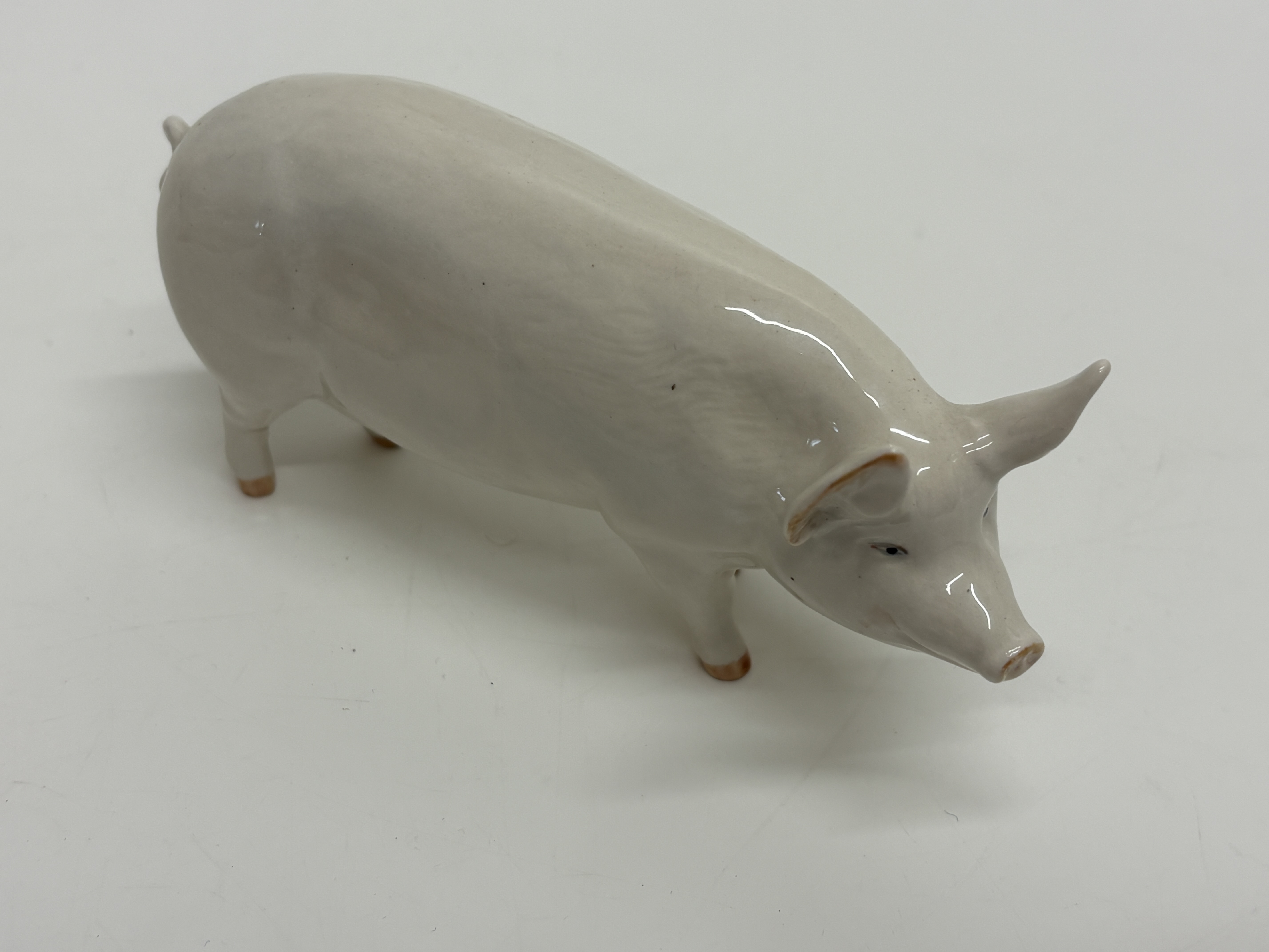 A collection of three vintage English ceramic pig figurines from noted manufacturers. The lot includes a Beswick standing sow “Champion Wall Queen 40th” in a white gloss glaze, marked with a black underglaze stamp and hand-painted script identifying the prize-winning pedigree. Also included is a Beswick reclining sow with piglet, model number 106, featuring a creamy white finish, original green and gold foil label, and circular backstamp. The third piece is a Royal Doulton standing Tamworth pig, model DA 215, finished in a naturalistic tan gloss glaze with dark accents to the snout and eyes, bearing the blue lion and crown factory mark to the underside. Heights approximately 7cm to 10cm.