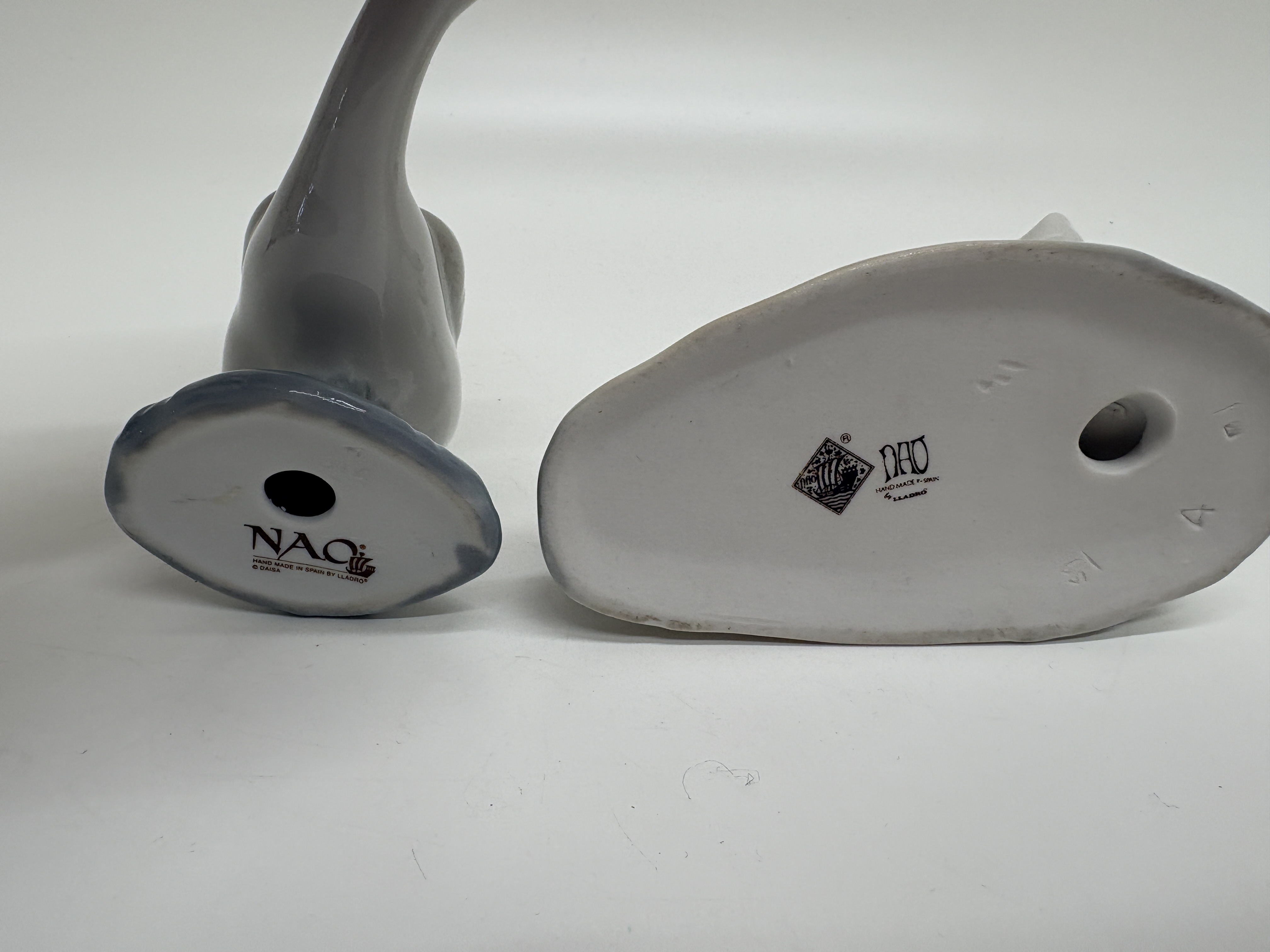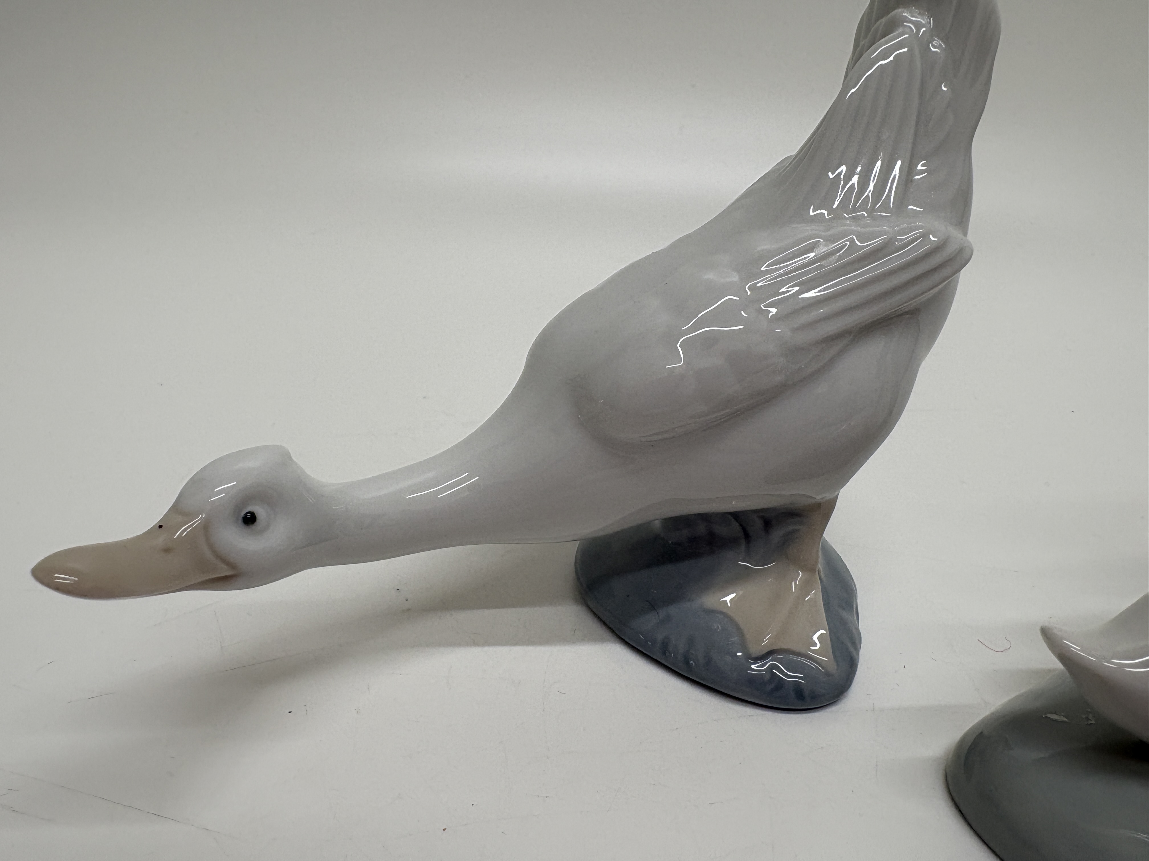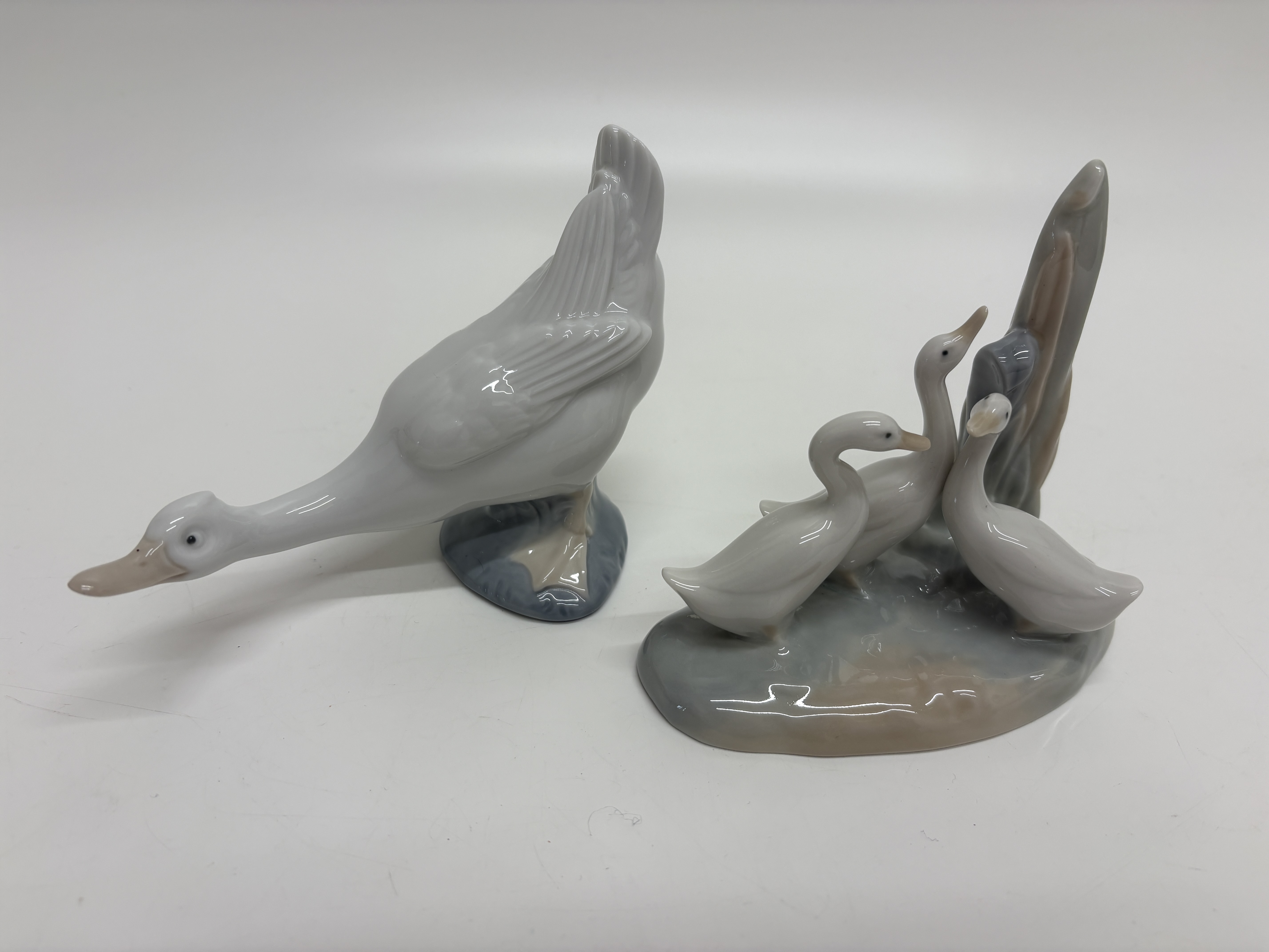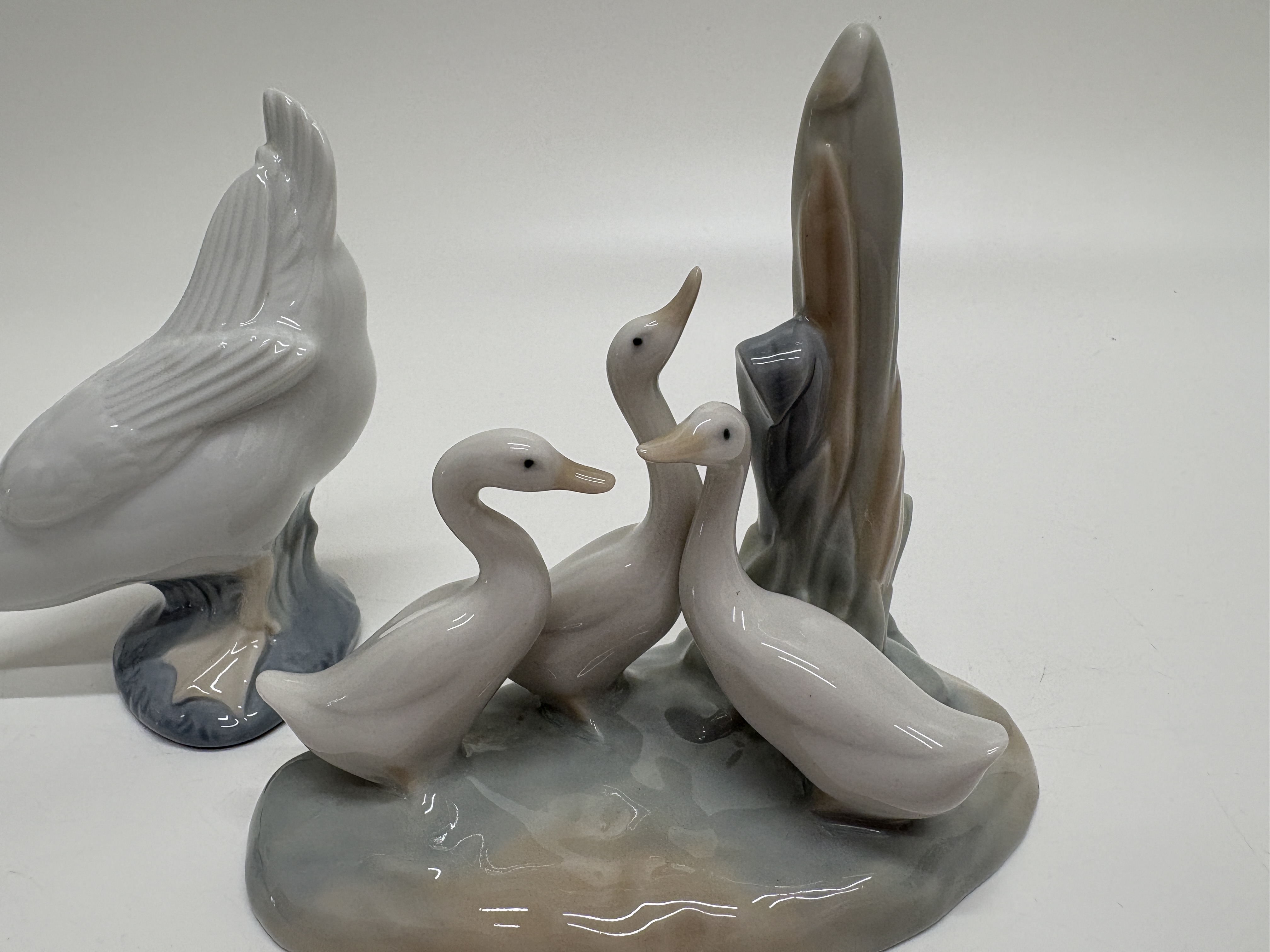 A set of two glazed porcelain bird figurines by NAO, a brand of the Lladró group. The first study depicts a single white goose in a dynamic, forward-leaning pose with its neck extended and head lowered, featuring delicate grey and blue shading and a pale peach beak. The second figurine depicts a group of three young goslings huddled together on a landscaped base with a vertical reed element, finished in glossy white with muted earth-tone washes to the base. Both items bear the printed NAO ship factory mark and HAND MADE IN SPAIN BY LLADRO to the underside. The gosling group also features impressed marks including 4 and S1. Height approx. 12cm.