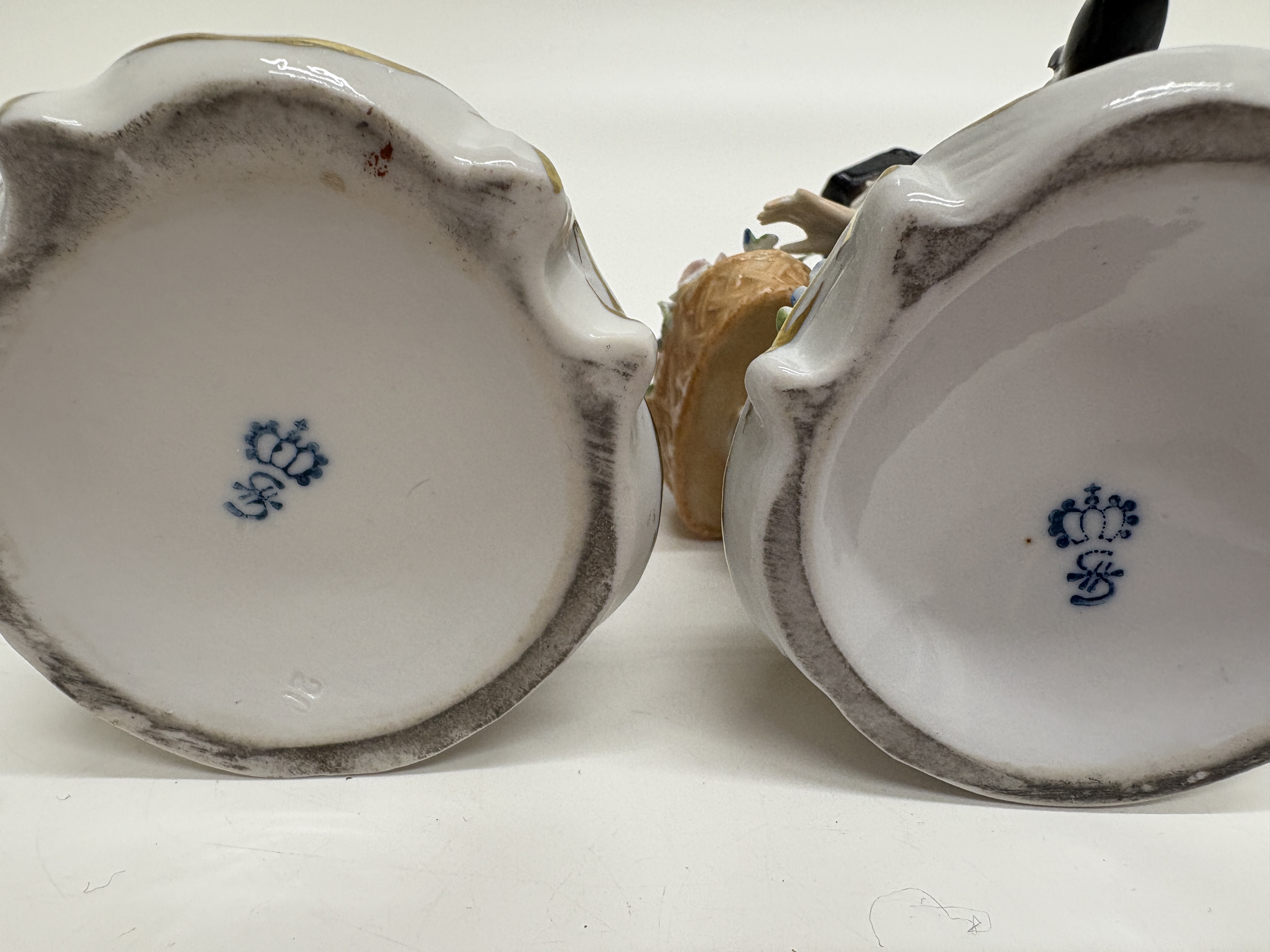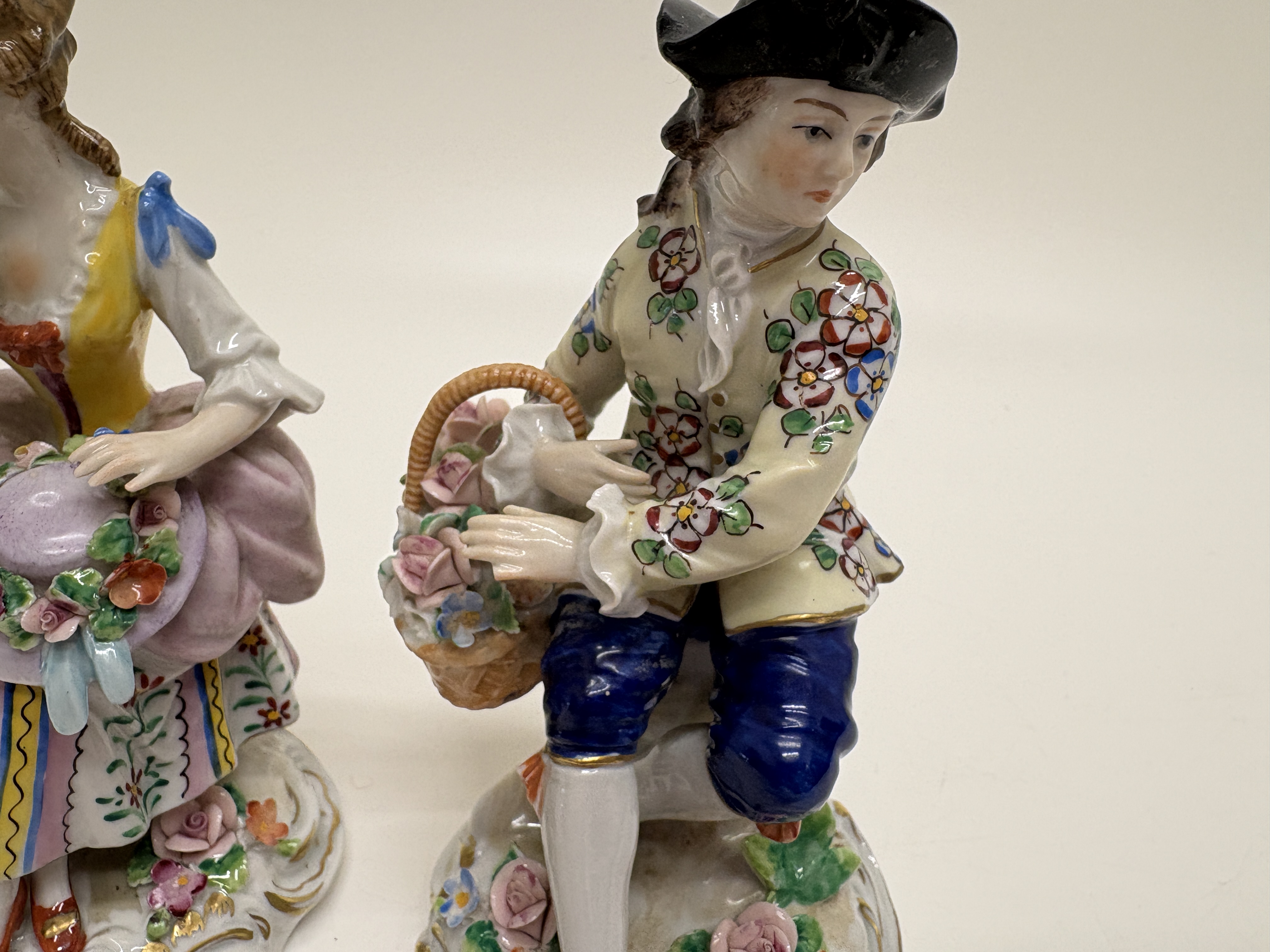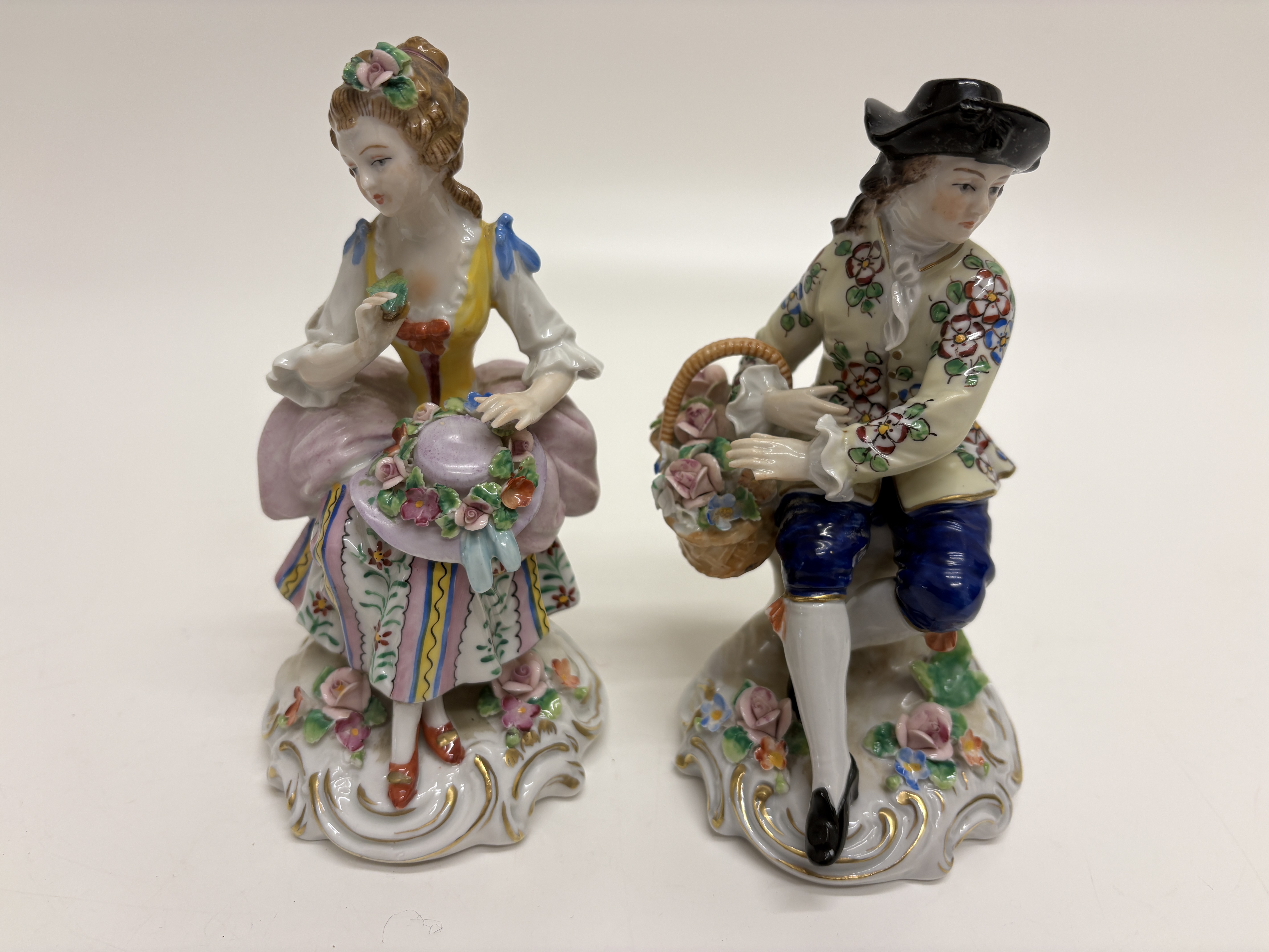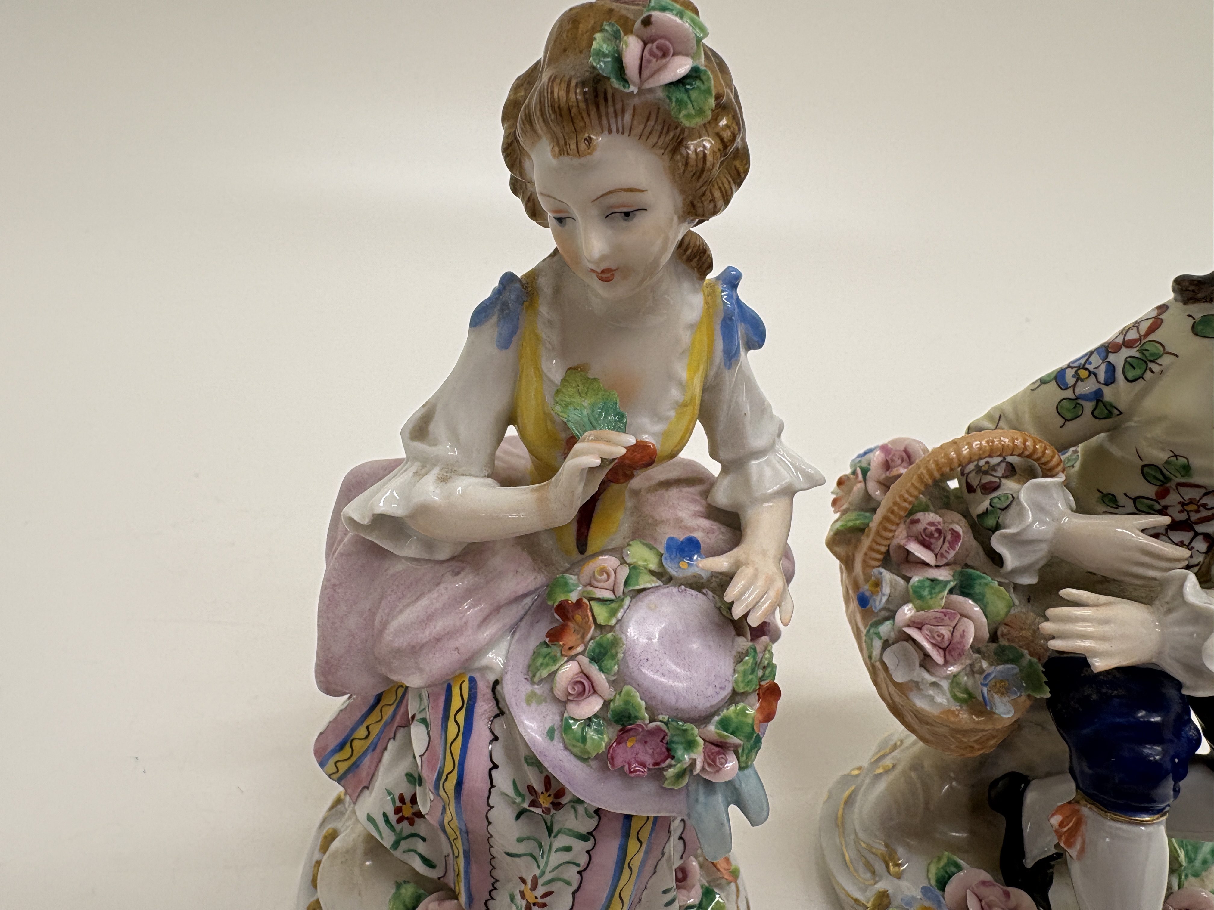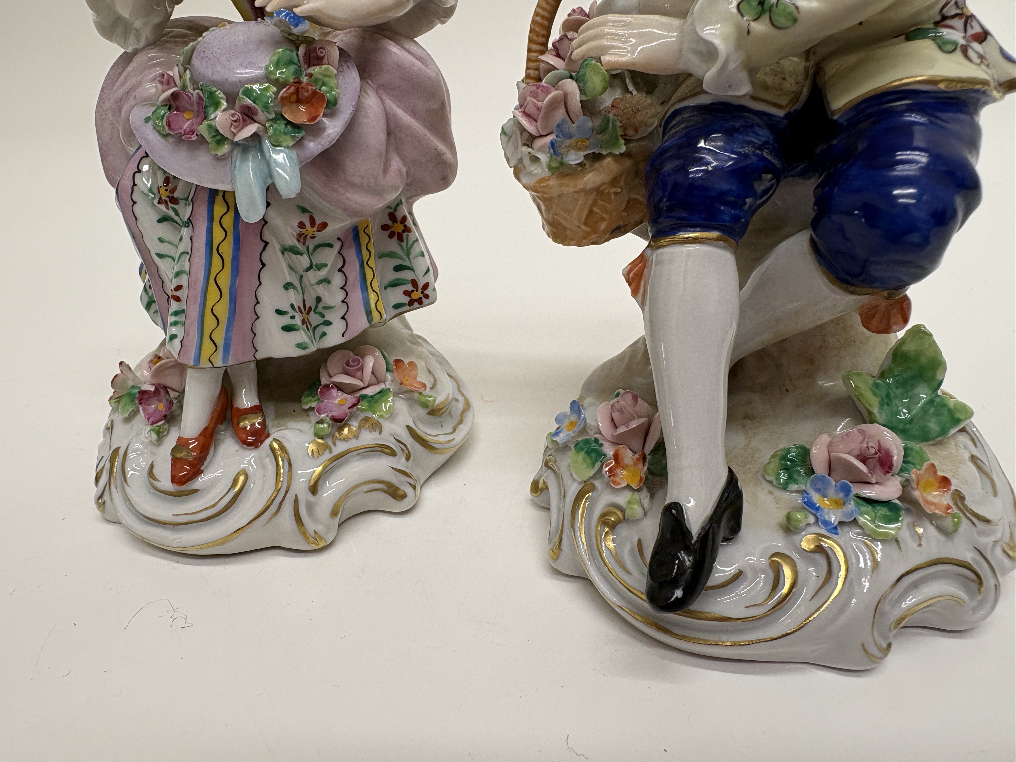 A pair of 18th-century style porcelain figurines produced by the Sitzendorf Porcelain Manufactory of Thuringia, Germany. The set comprises a seated lady and a seated gallant. The lady is depicted holding a single blossom, with a wide-brimmed bonnet overflowing with applied porcelain flowers resting on her lap. She is dressed in a yellow bodice with blue bows and a skirt featuring vertical pink and yellow stripes interspersed with hand-painted floral sprigs. The gallant wears a black tricorn hat, a cream-coloured frock coat decorated with polychrome floral motifs, blue breeches, and white stockings, while holding a large woven basket filled with an abundance of applied porcelain roses and blossoms. Both figures are set upon rococo-style scroll bases accented with gilt and encrusted with further applied flowers and foliage. Both pieces bear the underglaze blue factory mark on the underside consisting of a crown above a stylised S intersected by two horizontal lines. The female figure features an incised model number 20. Height: 13cm approx.