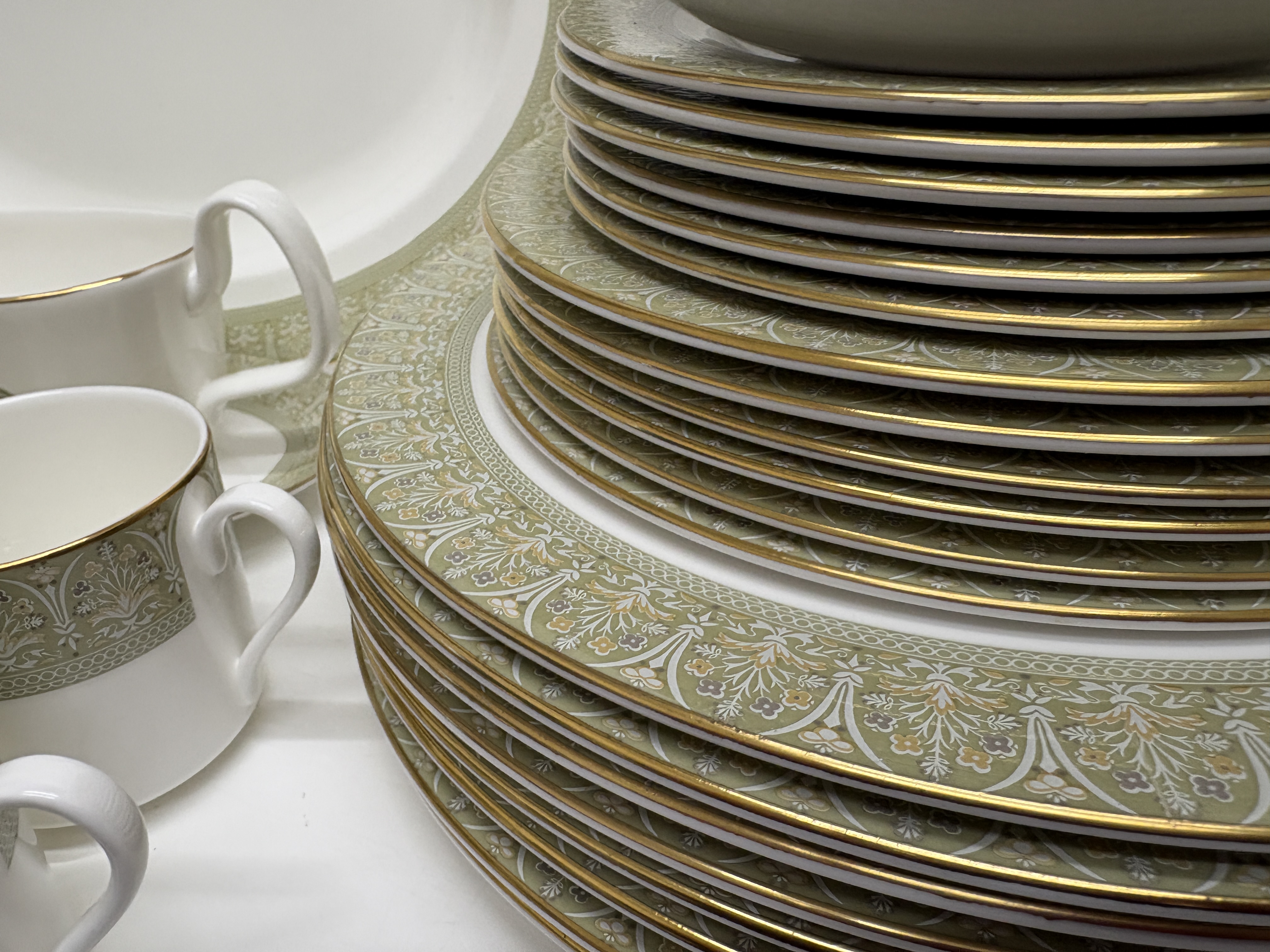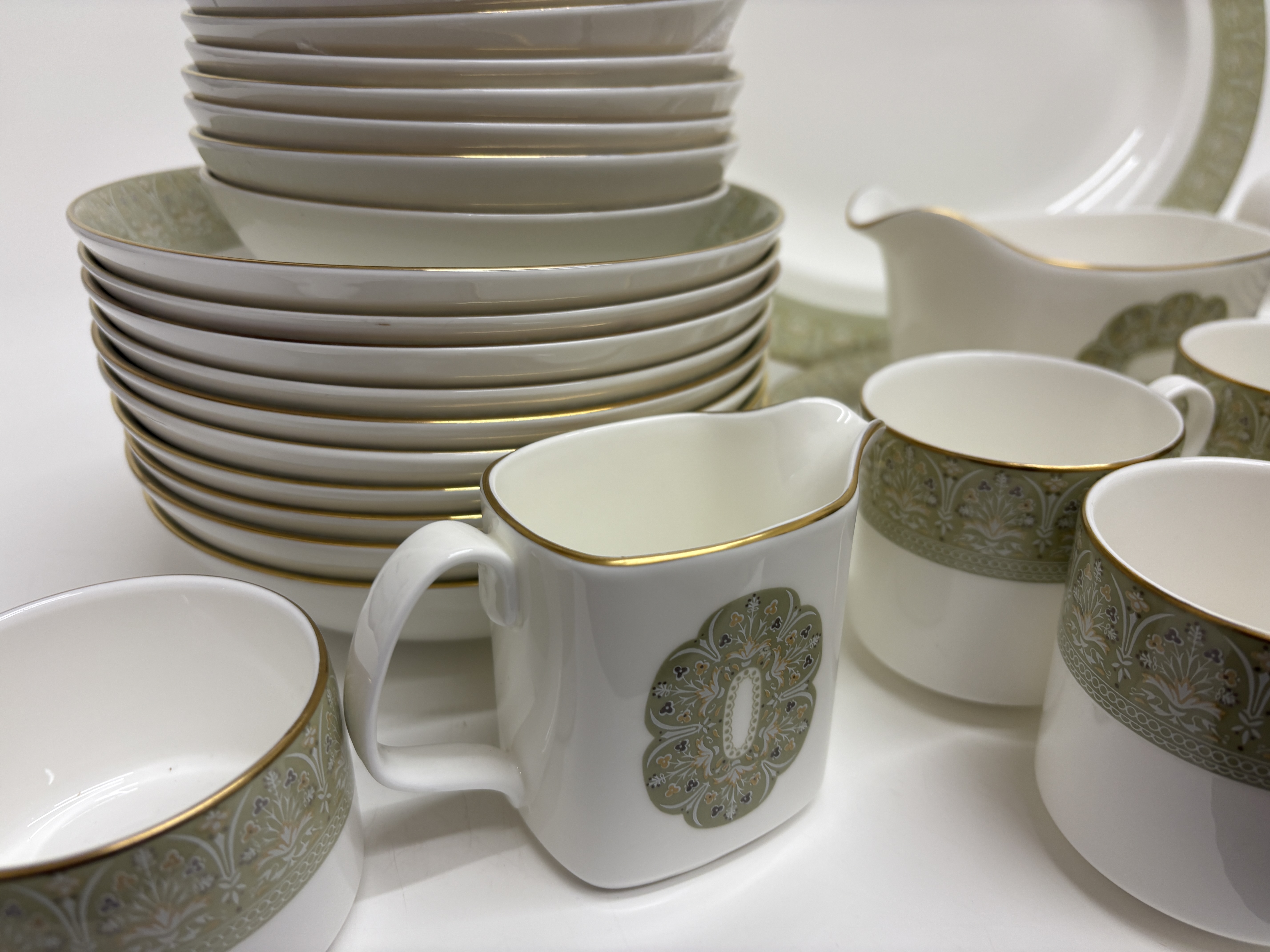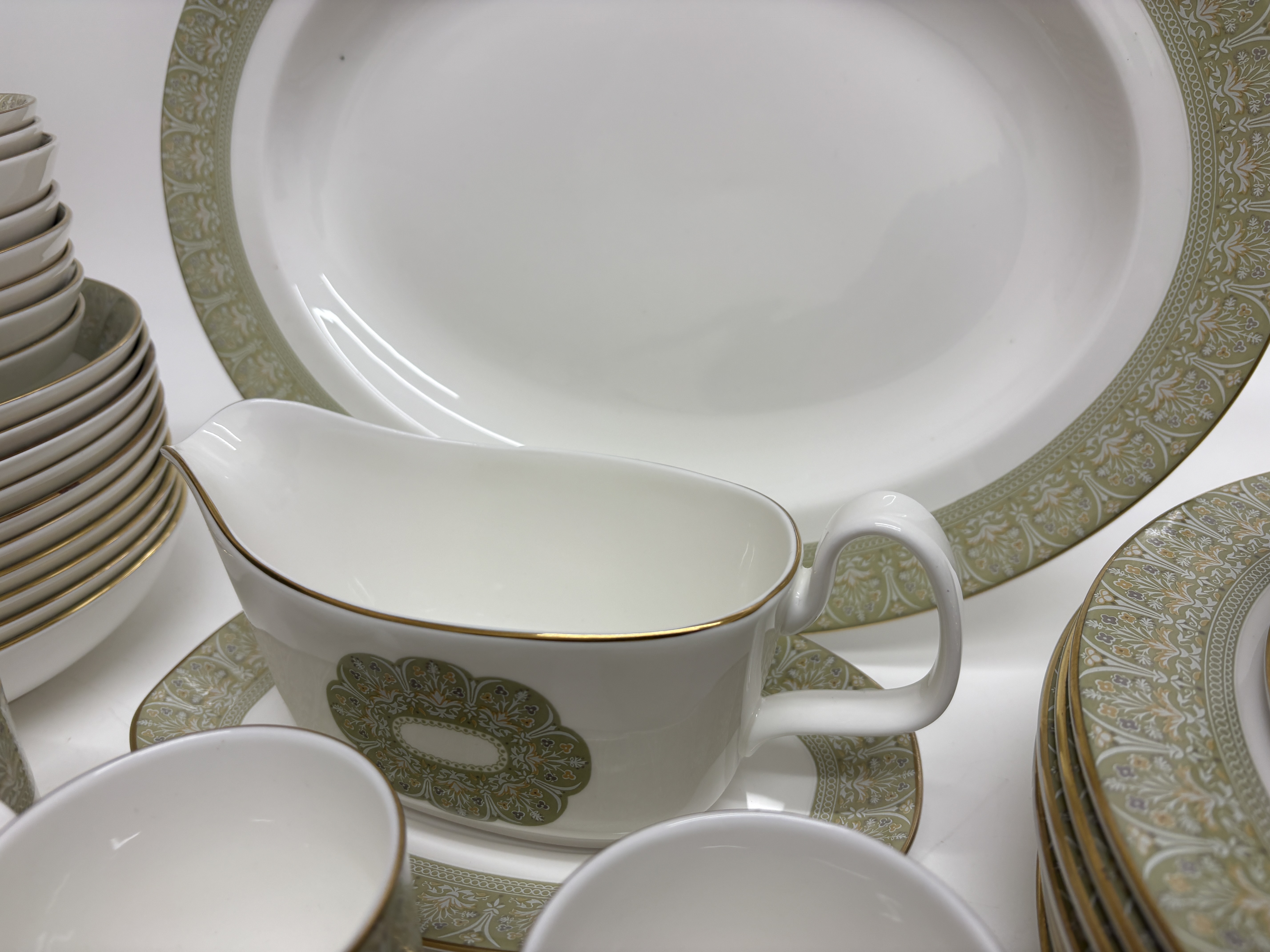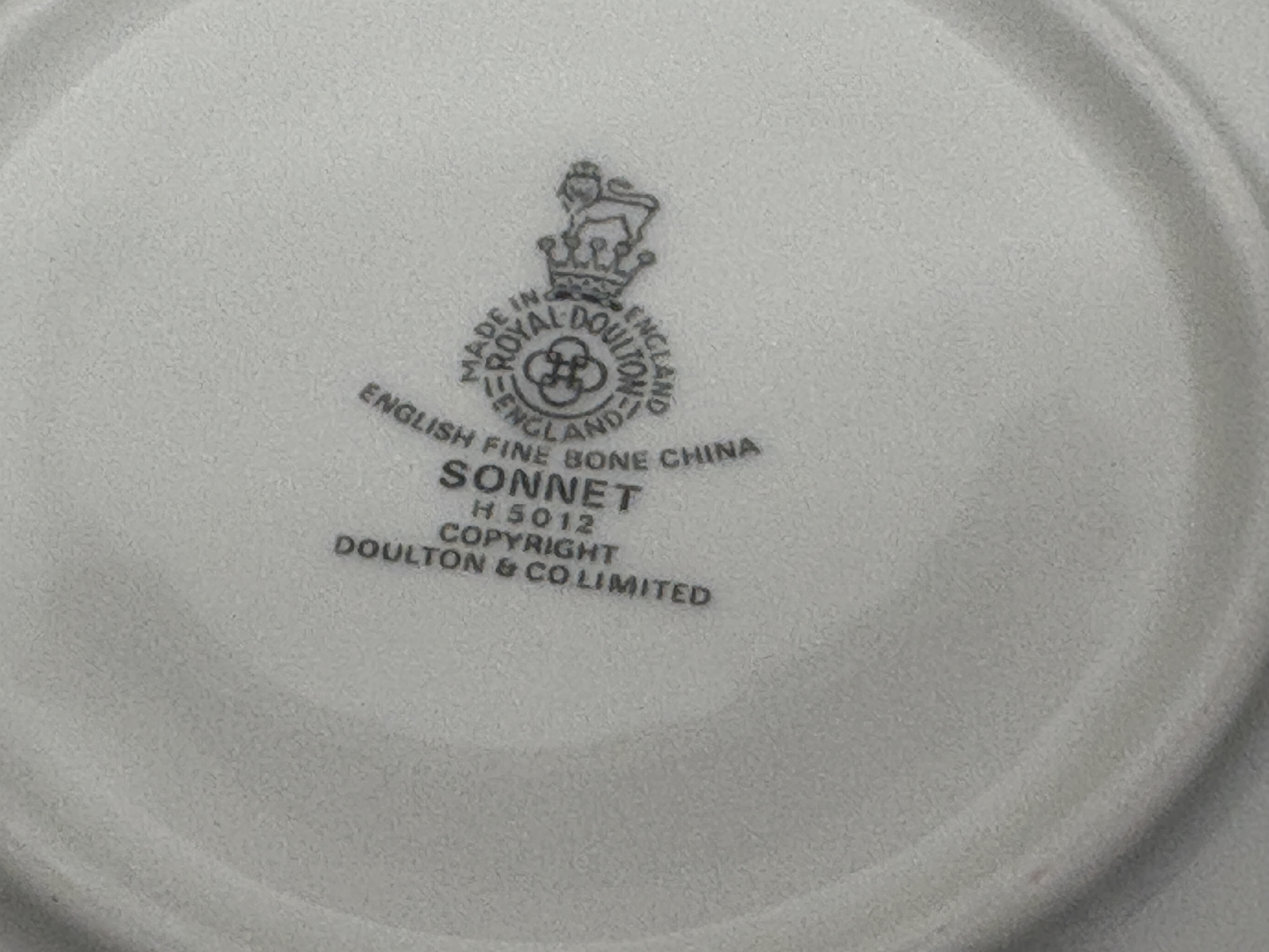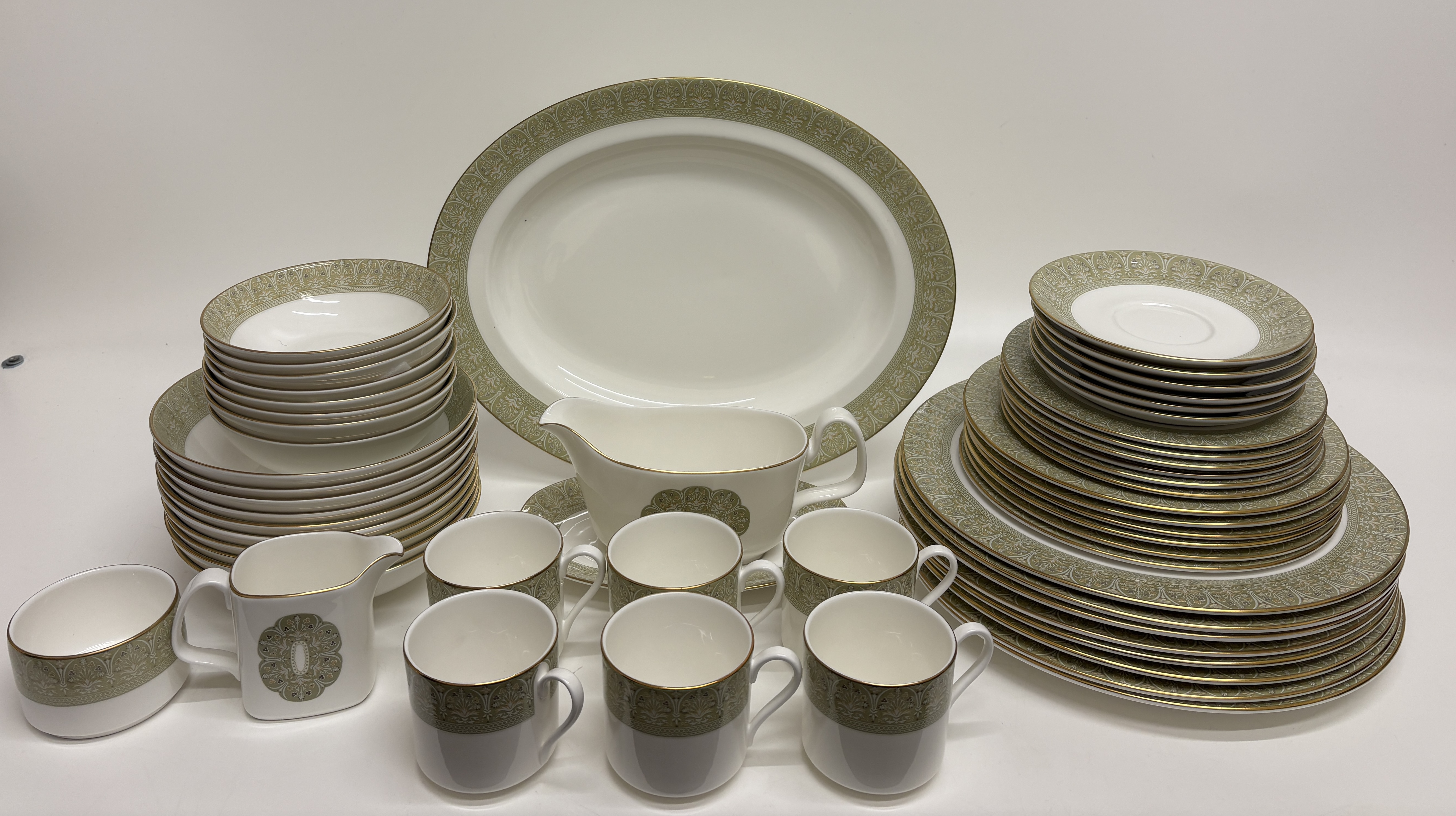 An extensive service of Royal Doulton fine bone china in the Sonnet pattern, reference H 5012. The set features a crisp white ground decorated with wide sage green borders and medallions containing intricate scrolling foliate and floral motifs, all finished with elegant gilded rims. The collection comprises a large oval serving platter, a sauce boat with a matching underplate, a creamer, and an open sugar bowl. The place settings include multiple stacks of dinner plates, salad plates, side plates, rimmed soup bowls, fruit bowls, and teacups. Each piece bears the official maker’s backstamp featuring a lion and crown over Royal Doulton England, English Fine Bone China, Sonnet H 5012, and Copyright Doulton and Co Limited. Dimensions unavailable as no scale was provided.