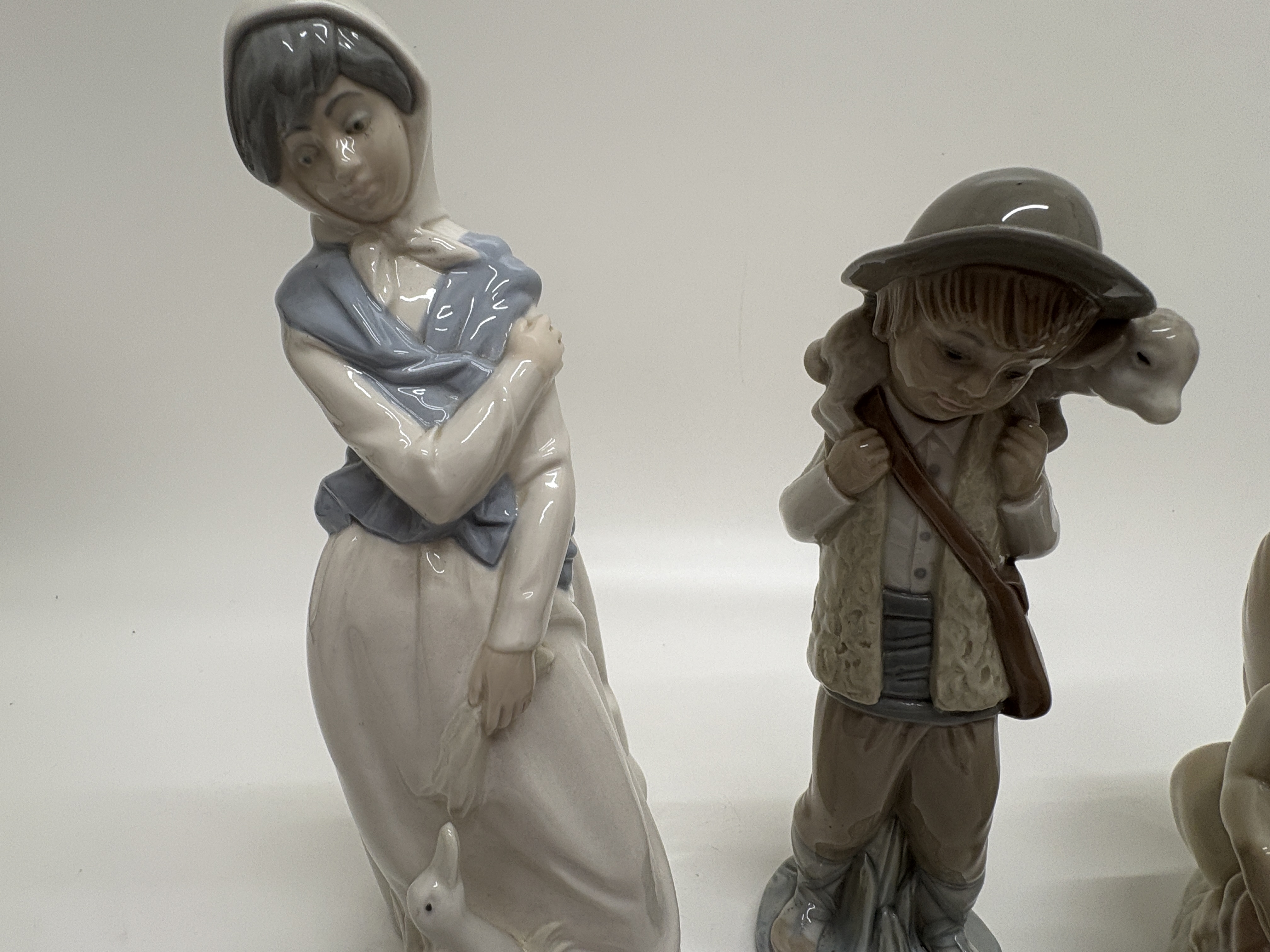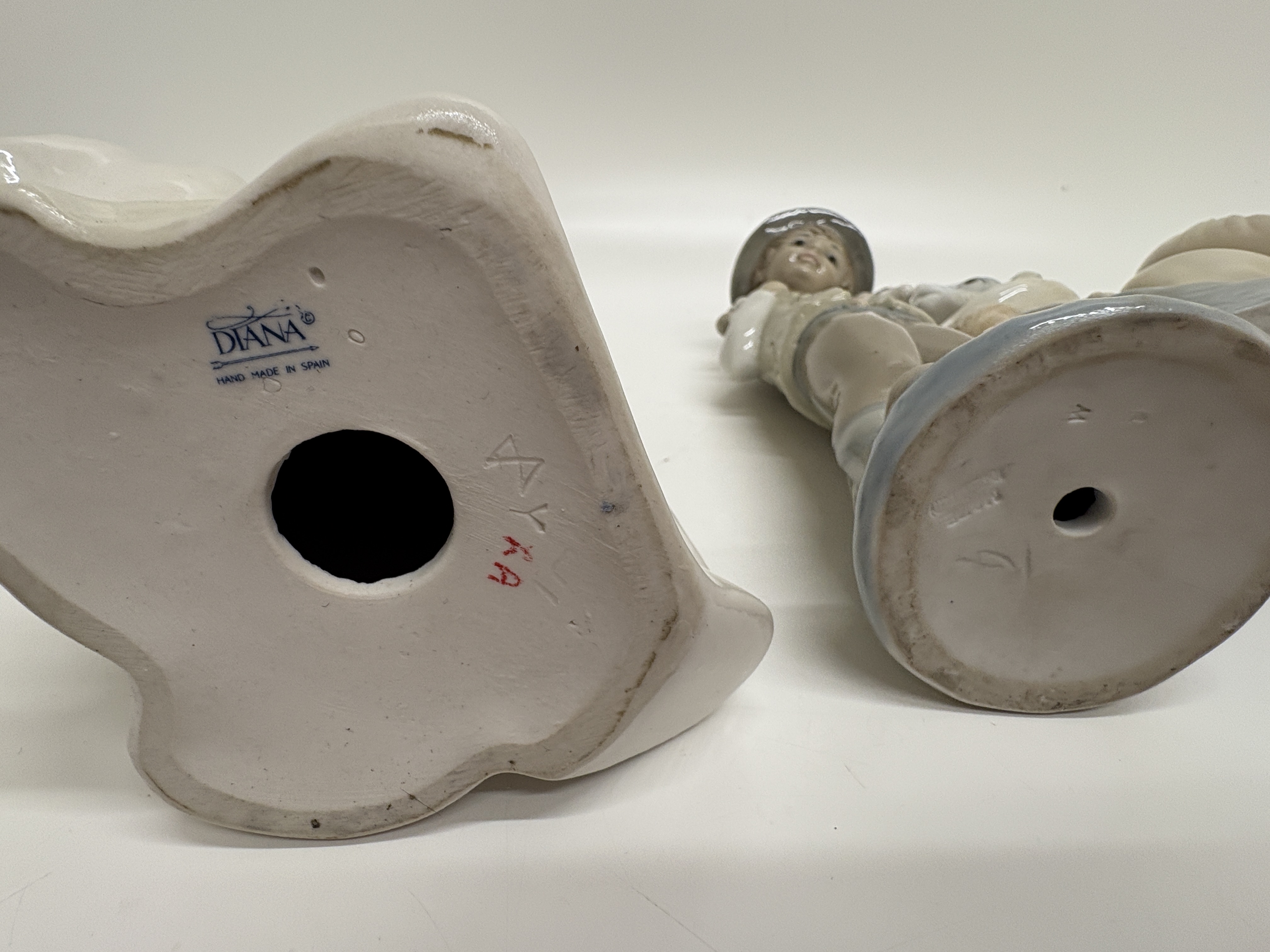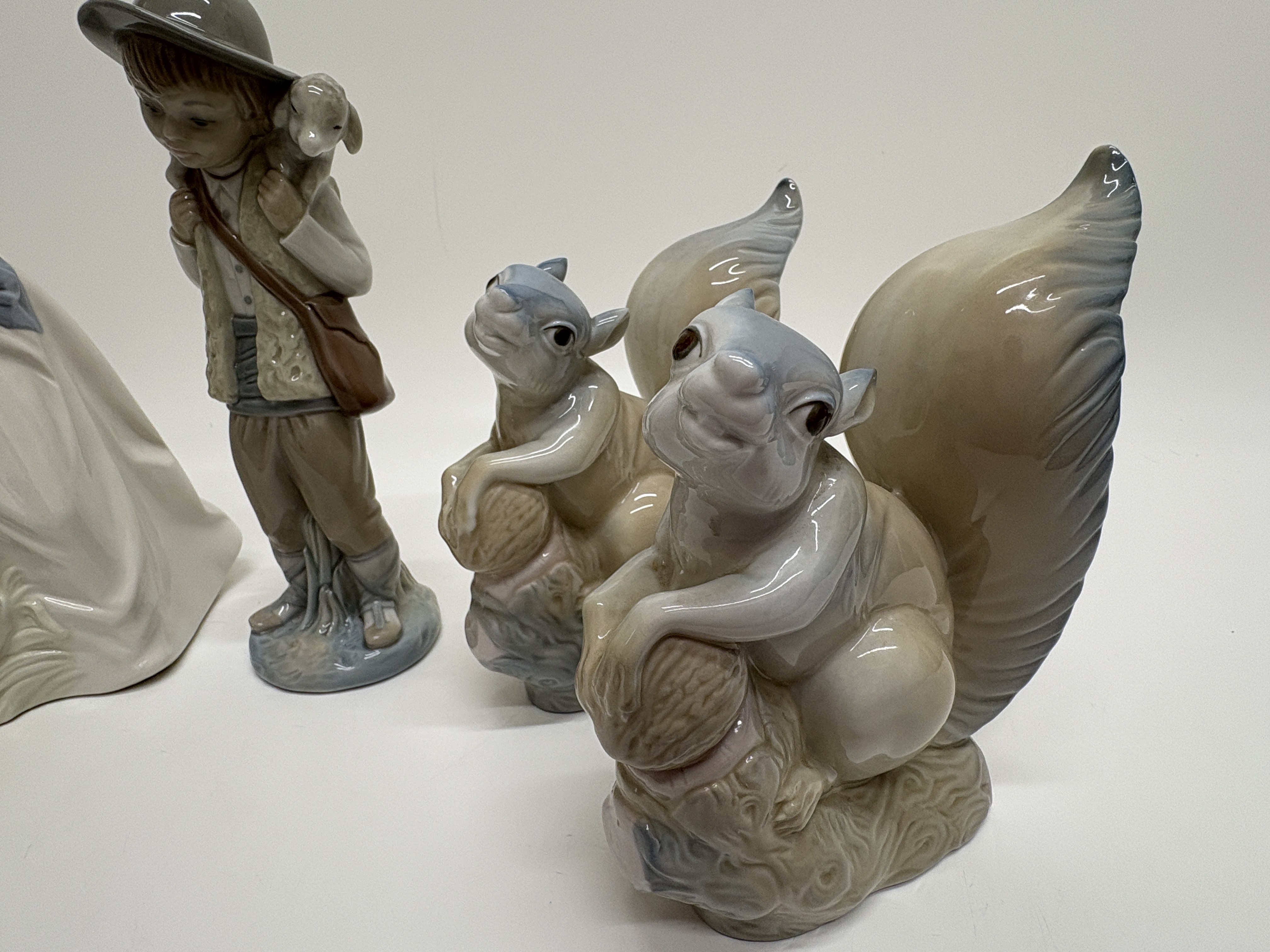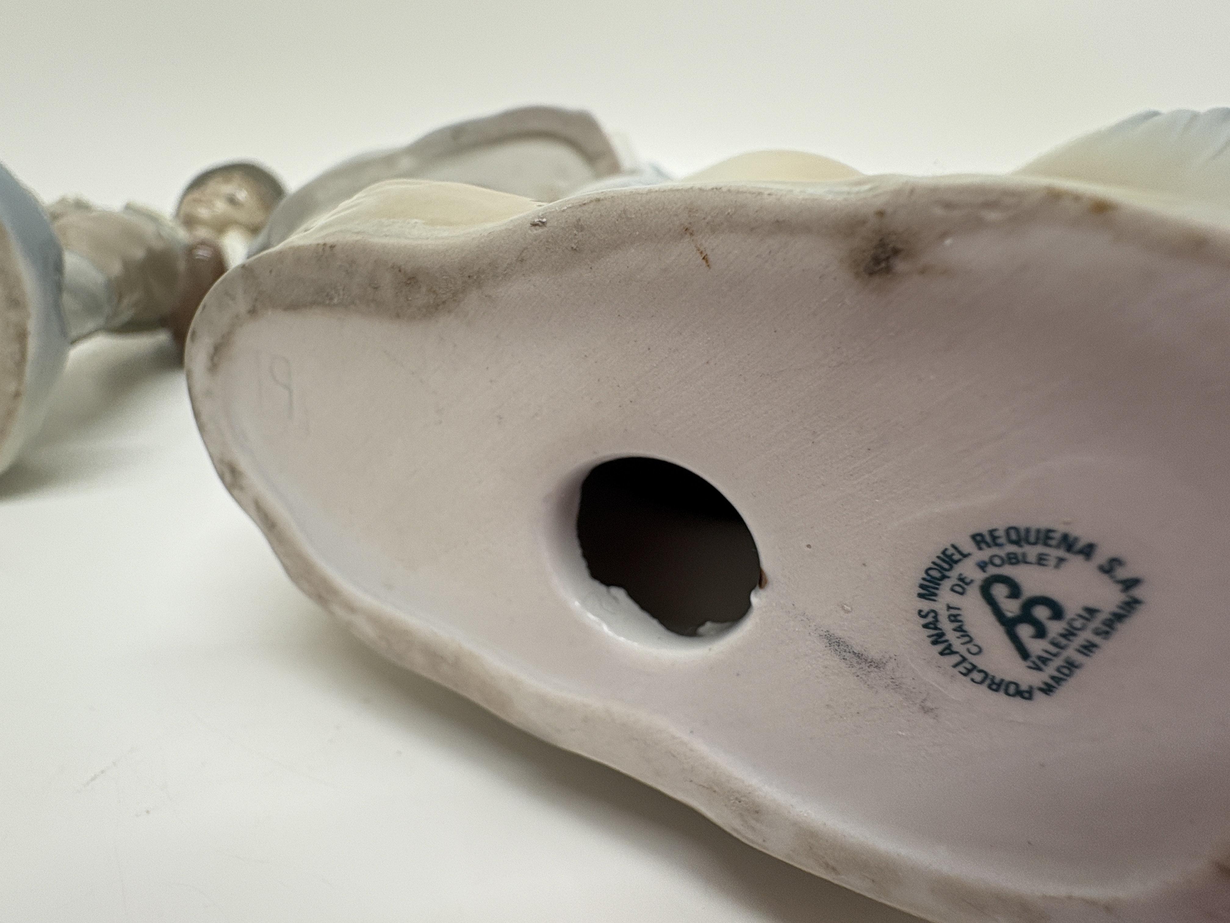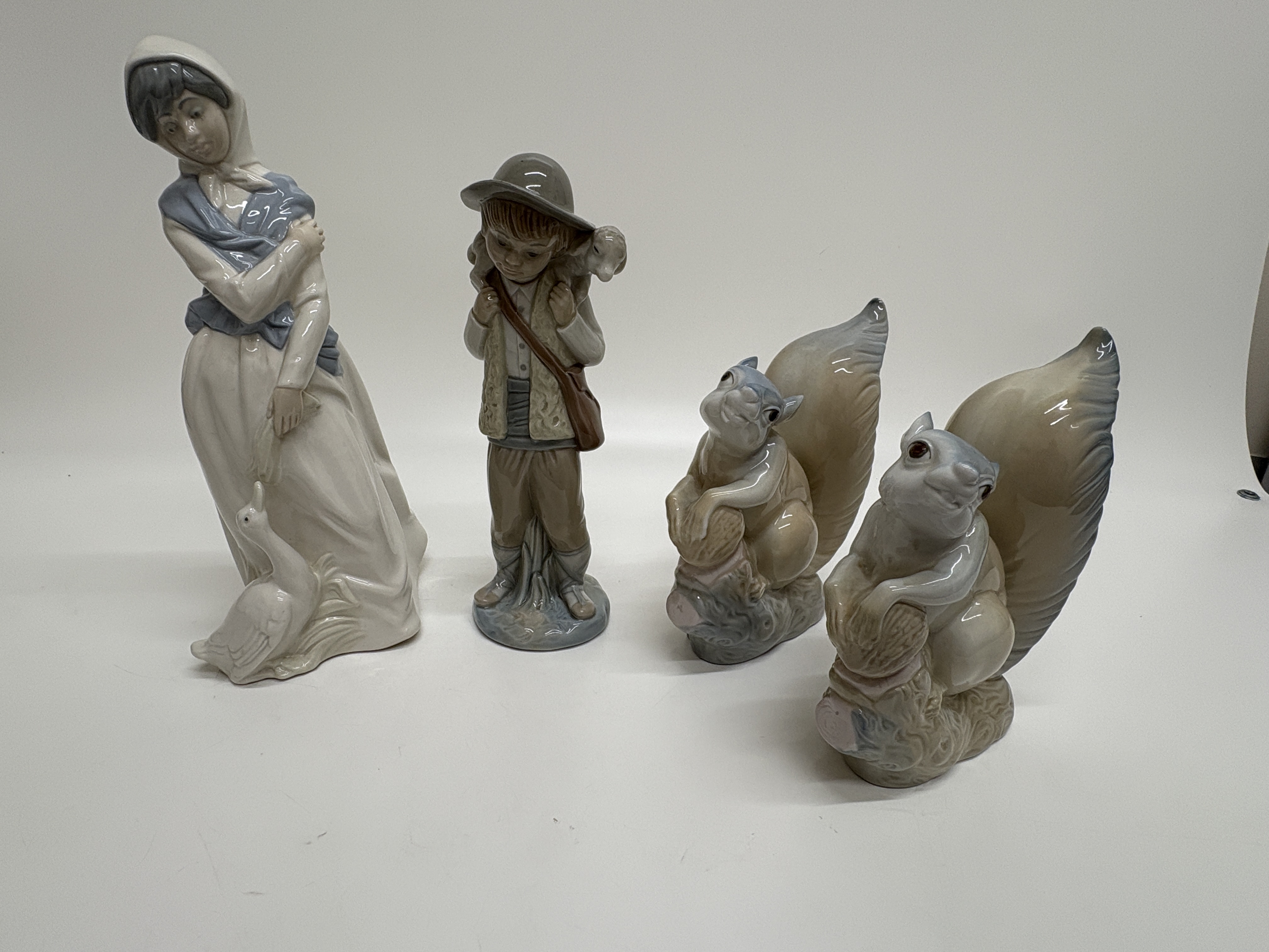 A collection of four vintage Spanish glazed porcelain figurines, characterised by the elongated forms and pastel colour palettes typical of the mid-to-late 20th century. The lot includes a Diana factory figurine of a woman with a goose, bearing a blue underglaze factory mark, red decorator initials KA and impressed letters AY. Also included is a shepherd boy carrying a lamb, attributed to Zaphir (a brand by Lladro), featuring impressed marks 7 and M to the base. Completing the set is a pair of squirrel figurines by Porcelanas Miquel Requena S.A. of Valencia, one bearing a circular blue factory stamp and impressed model number 19. Tallest approx. 28cm.