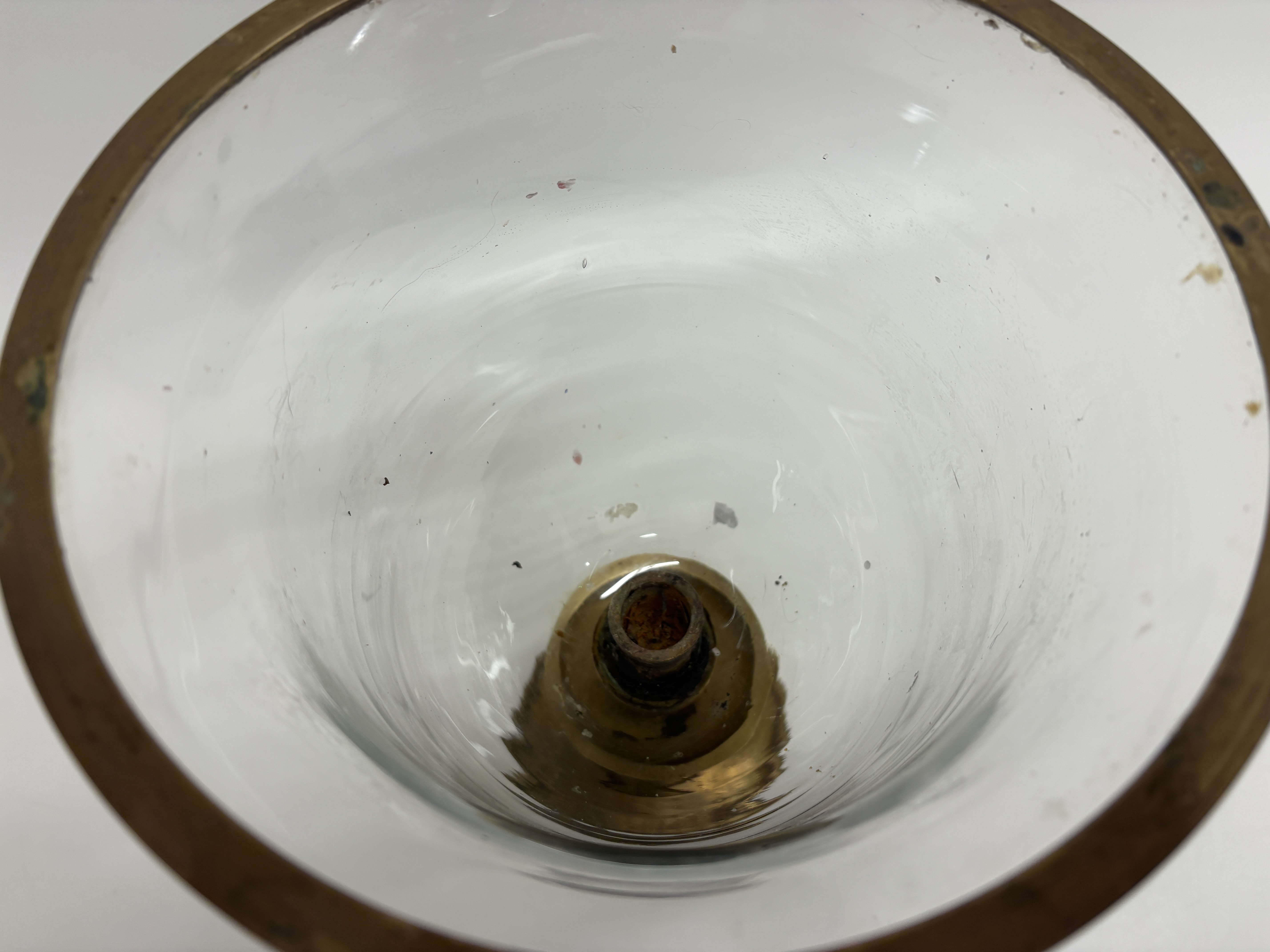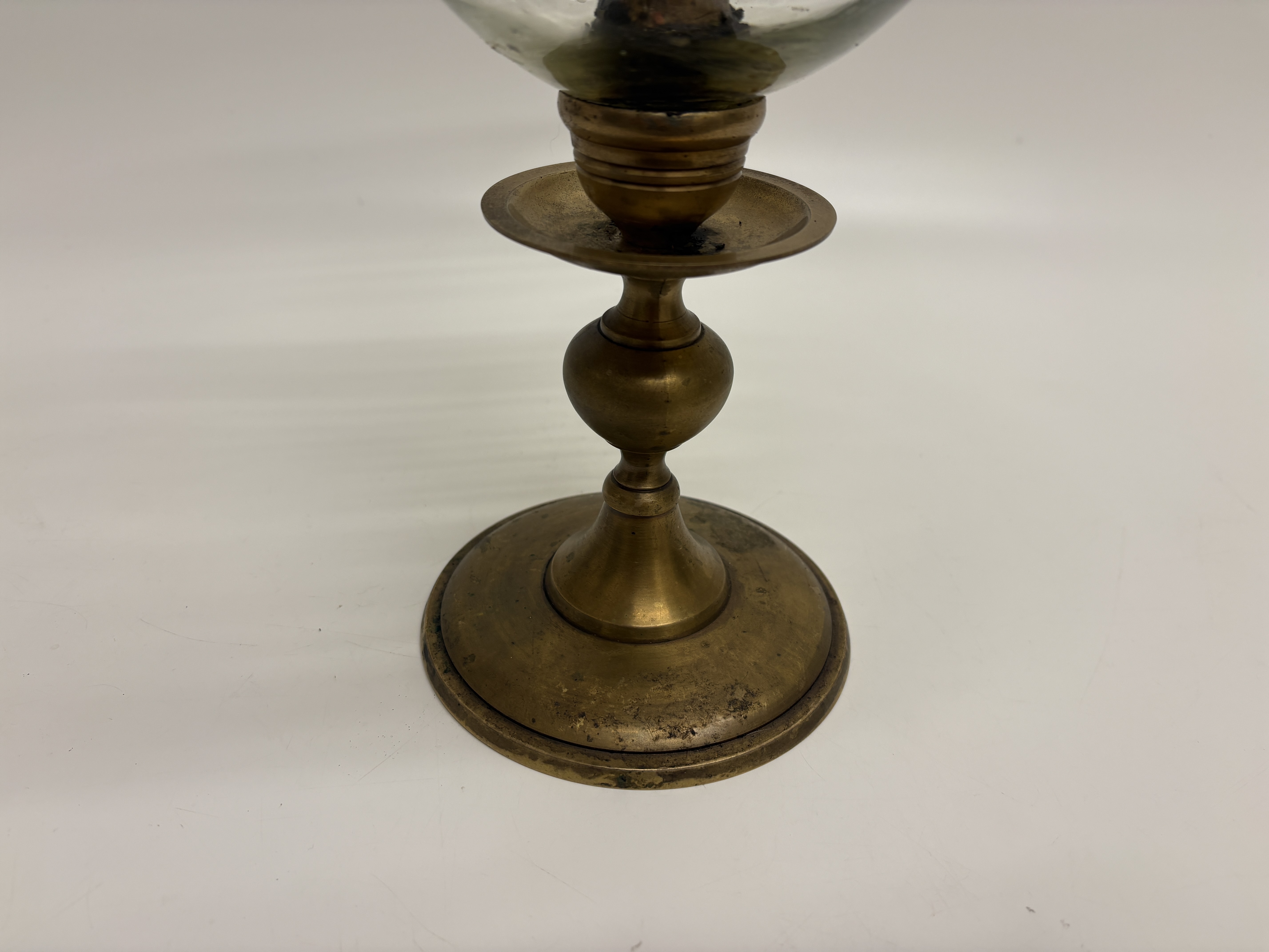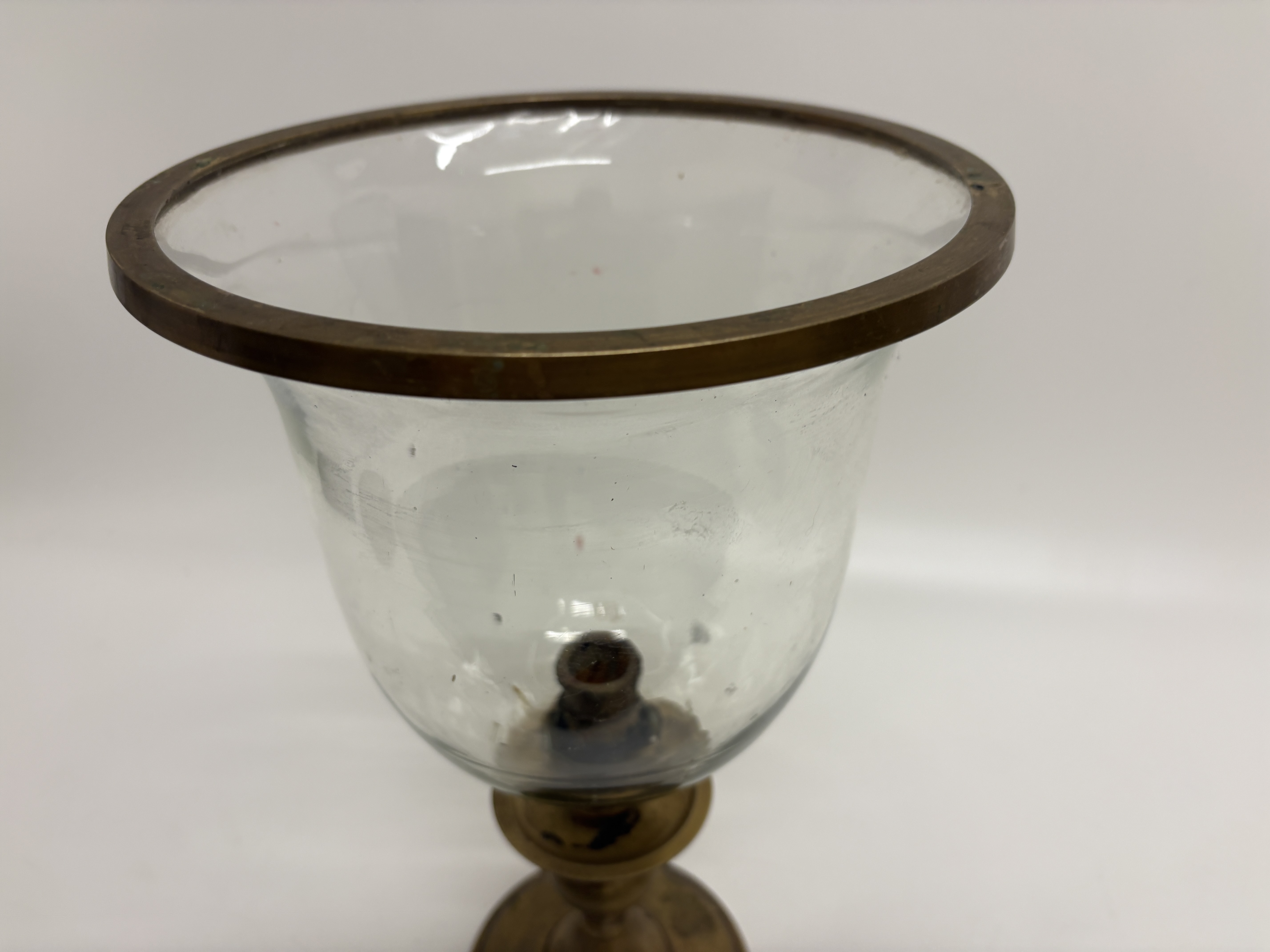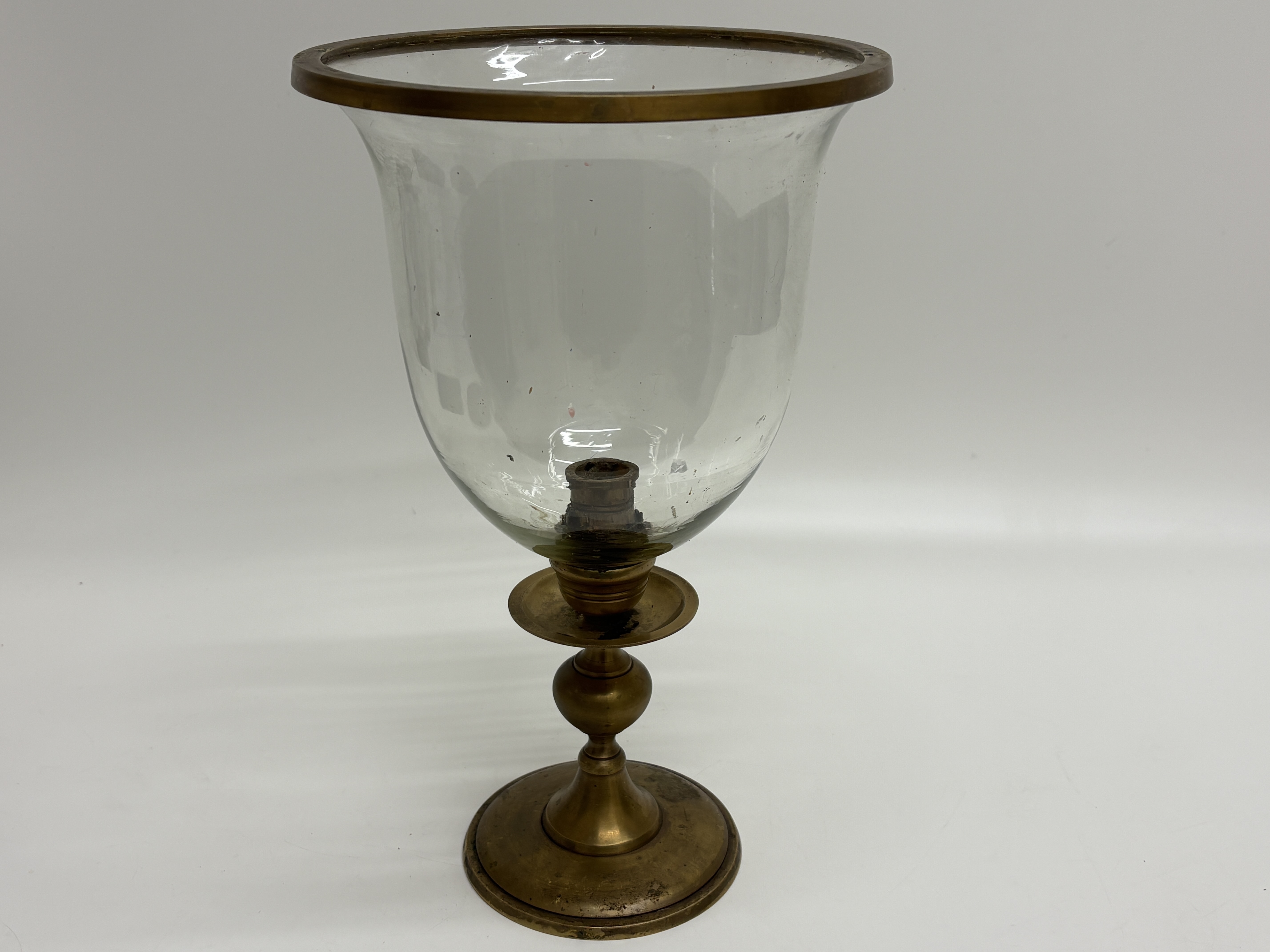 A traditional hurricane lamp, or photophore, featuring a flared campana-form clear glass shade with a brass-bound rim. The shade is seated upon a turned brass pedestal base, which includes a central candle socket and a shallow bobeche. The support consists of a baluster-form stem and a tiered circular foot. No maker’s marks or signatures are present. Dimensions: Height not recorded.