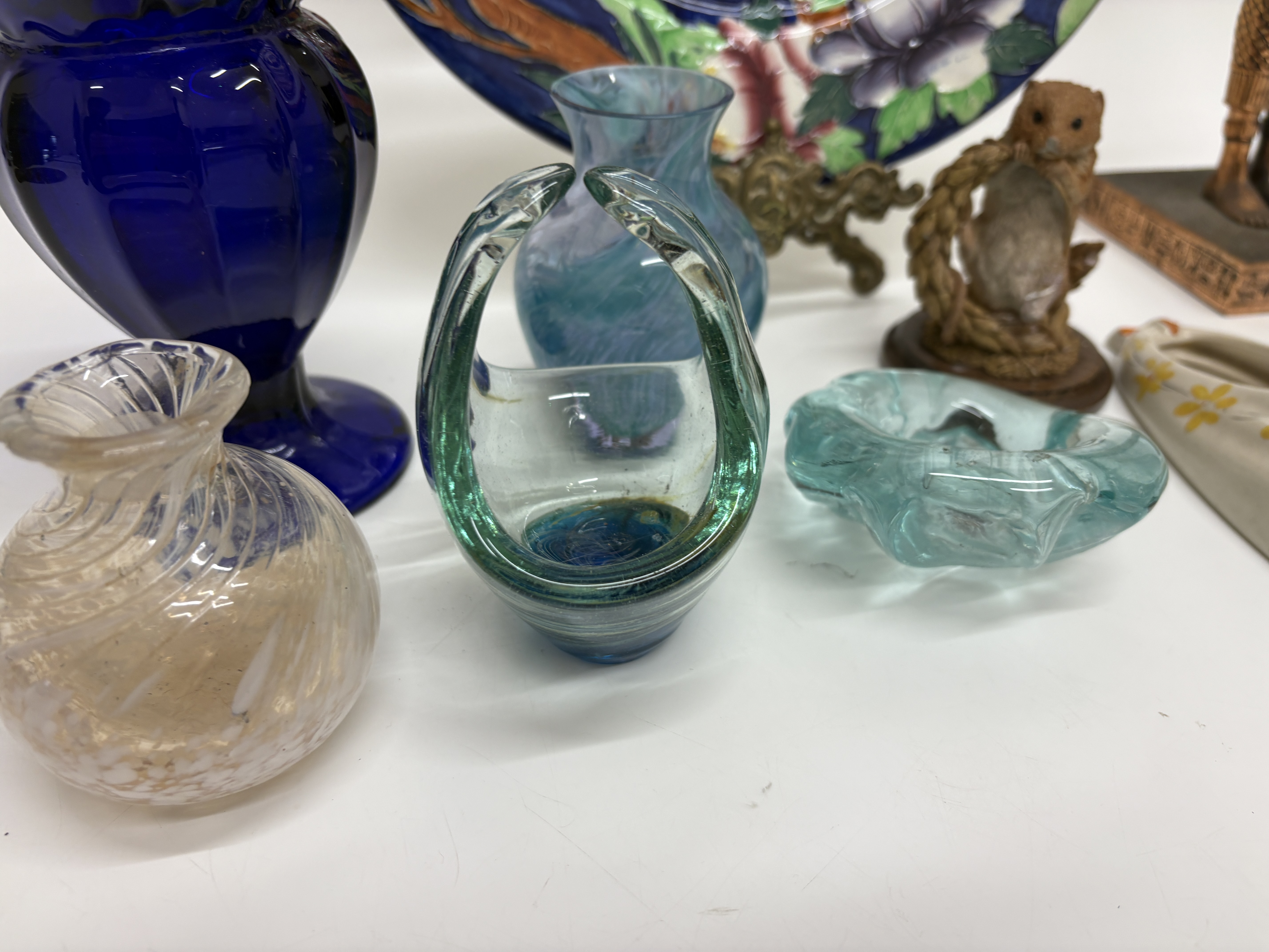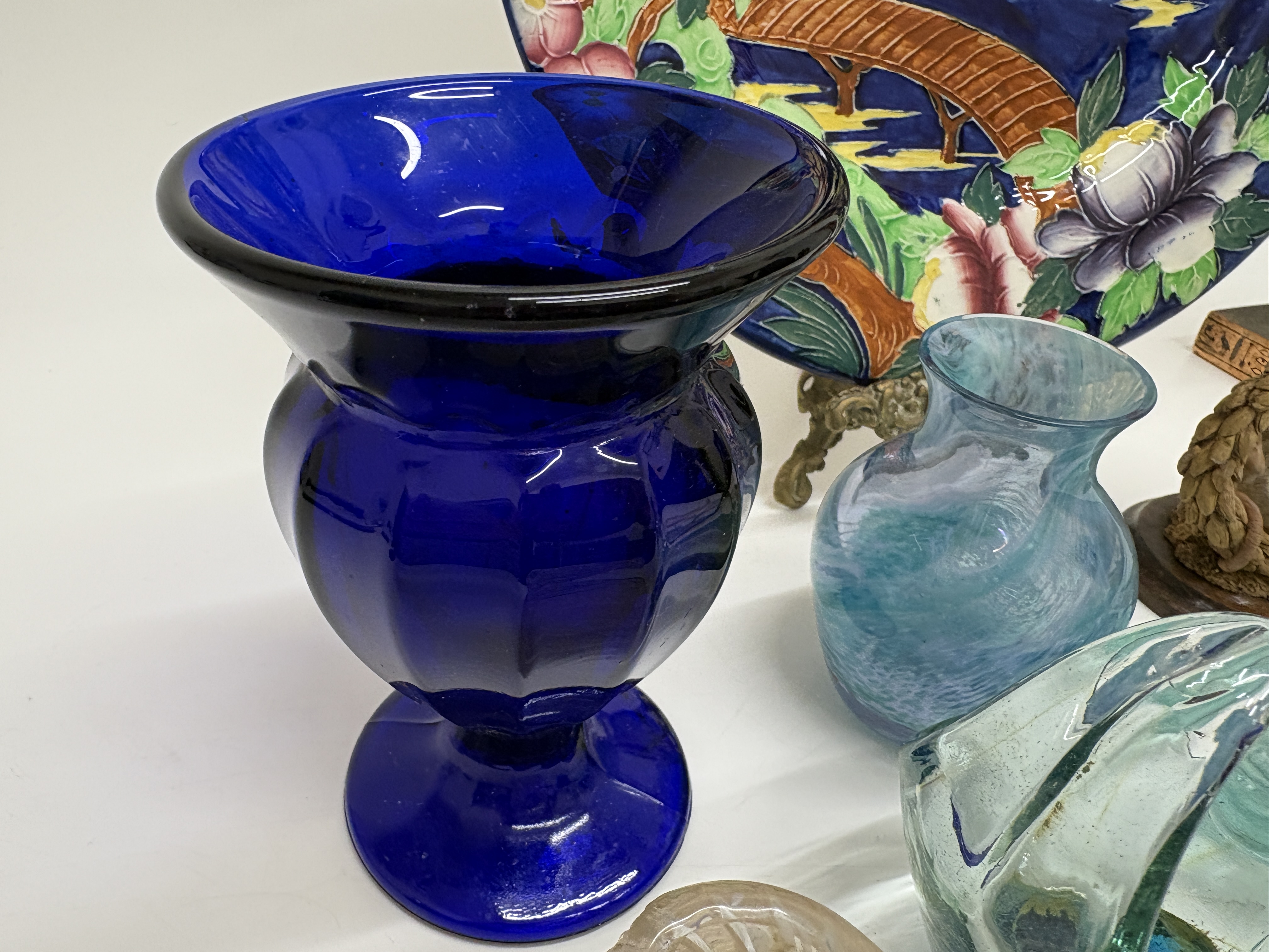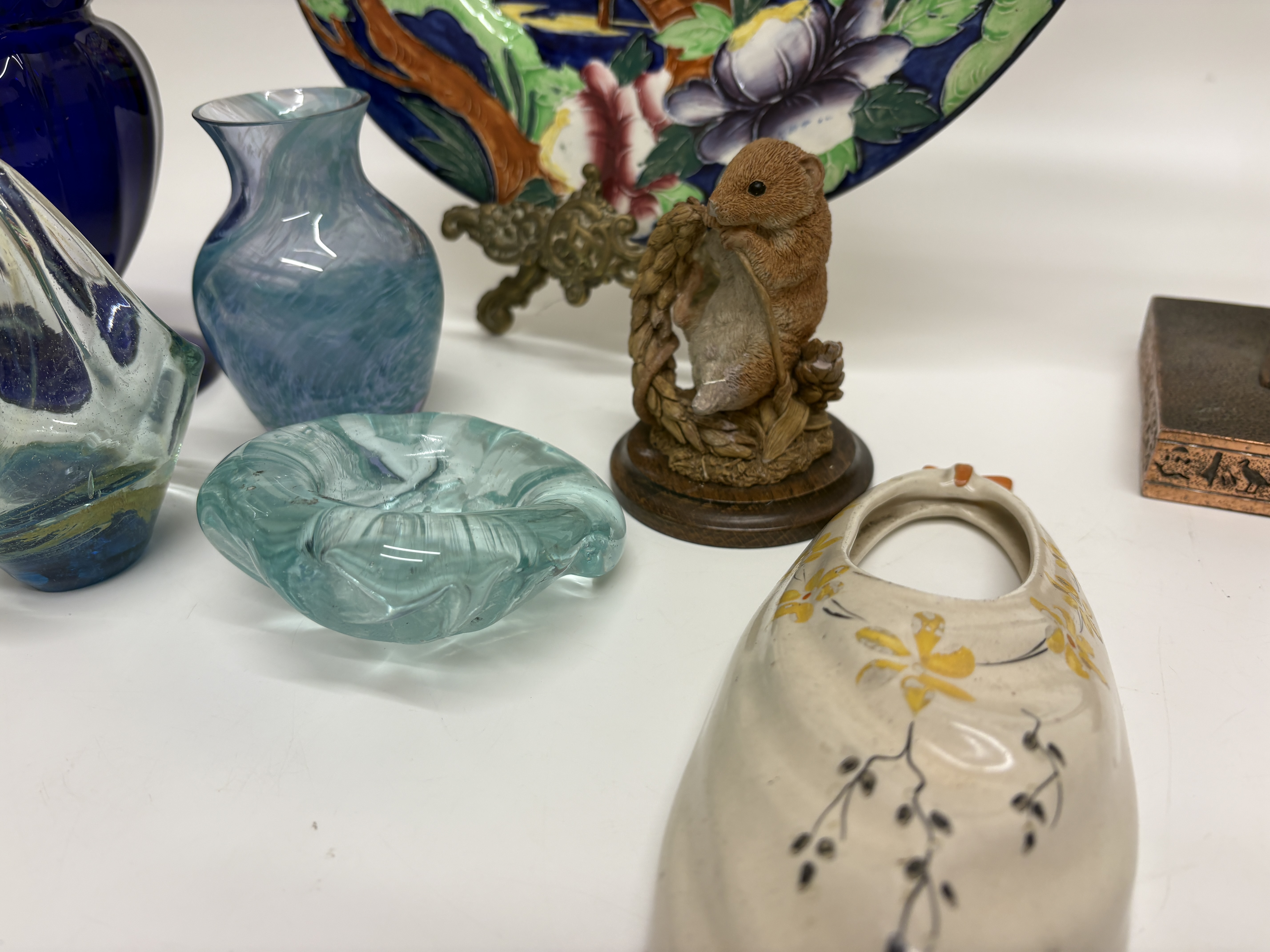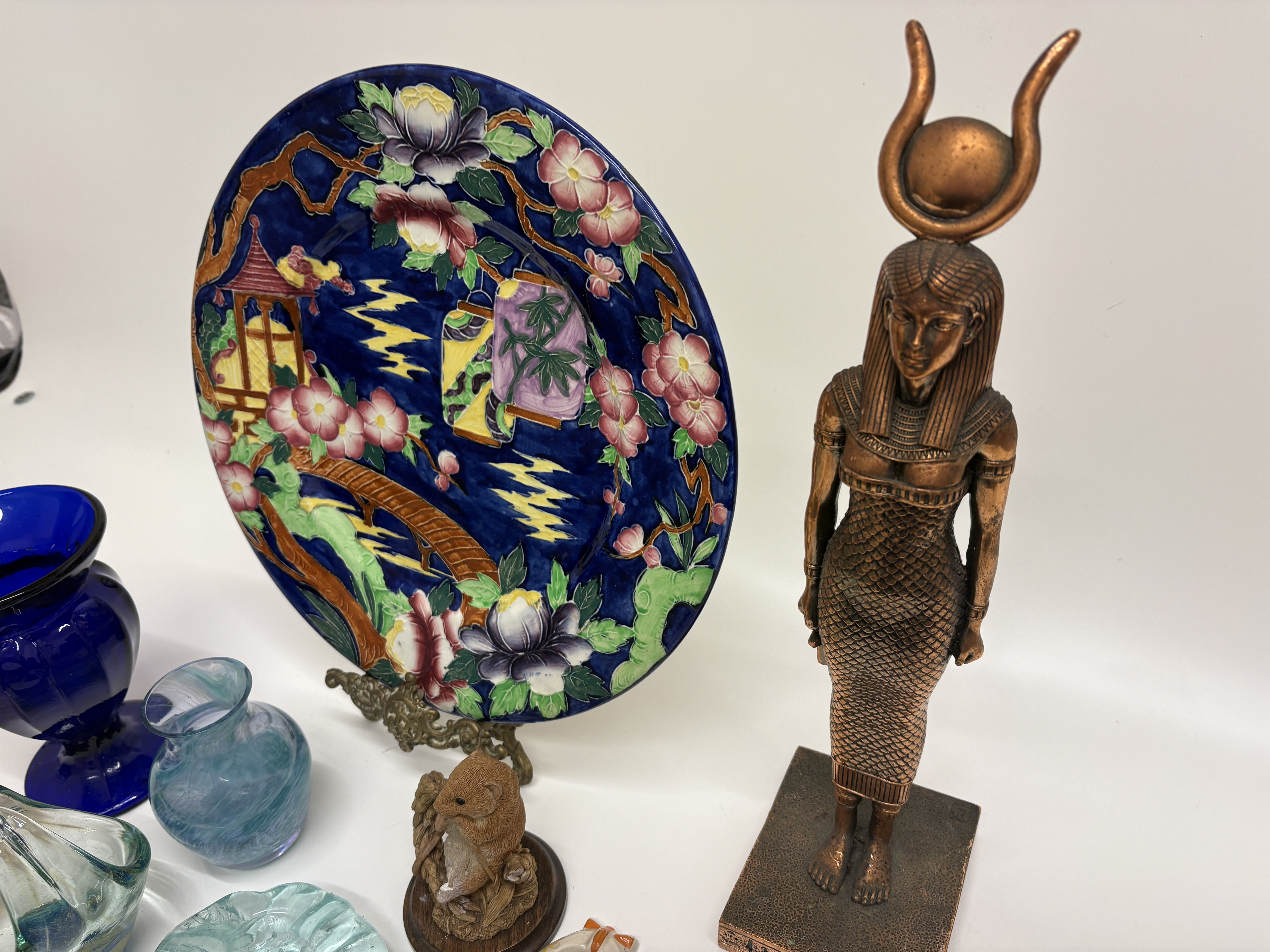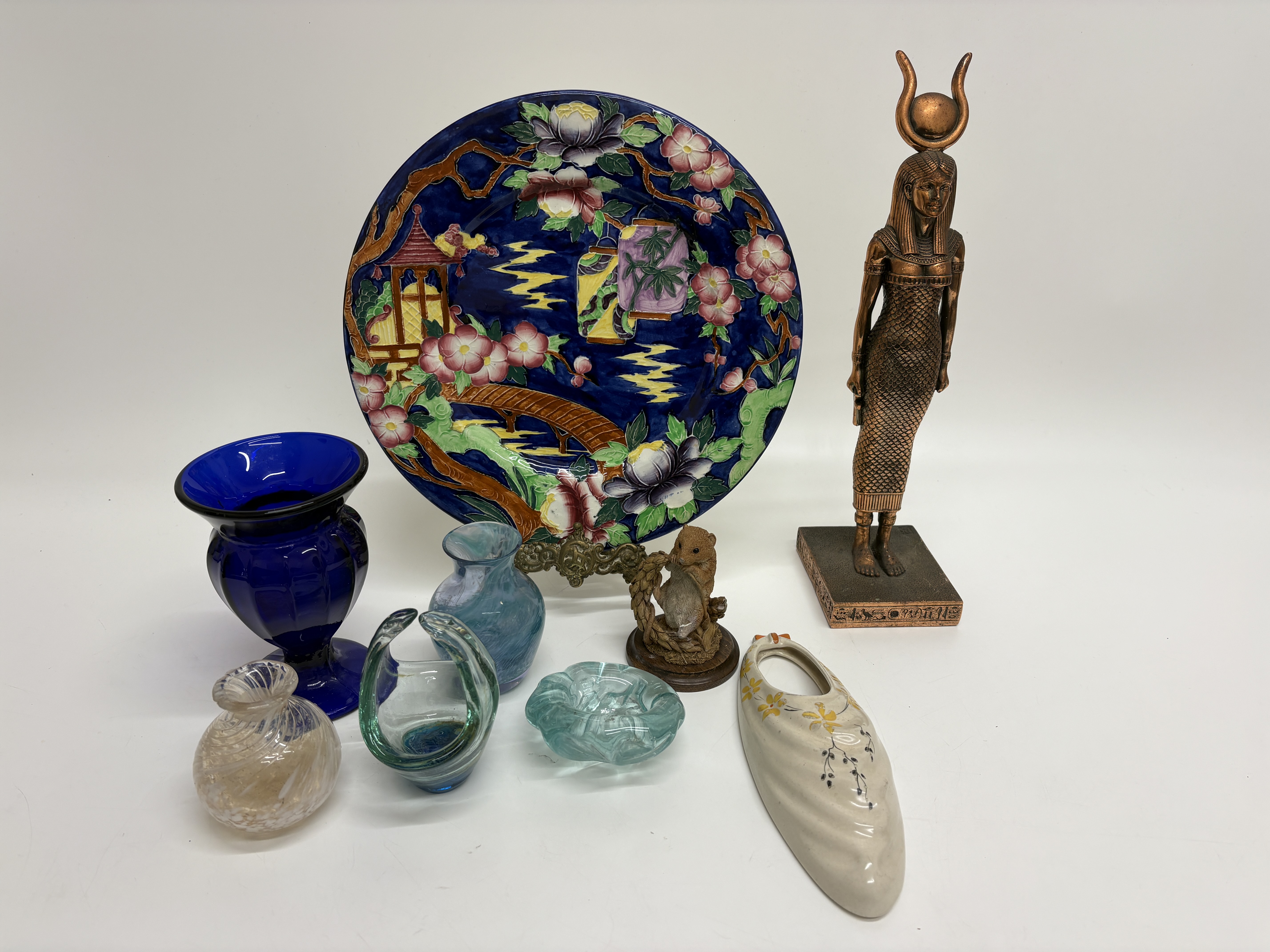 A varied collection of decorative arts featuring a Maling pottery cabinet plate, pattern number 6067, produced in Newcastle on Tyne, England, circa 1937. The earthenware plate is decorated with the Japanese Lantern pattern on a cobalt blue ground, depicting a hand-painted landscape with a pagoda, bridge, and floral borders. The reverse is stamped MALING MADE IN ENGLAND with the hand-painted pattern number 6067 and initial J. The lot includes a bronze-finished revival figure of a goddess wearing a sun disk and horn headdress, standing on a hieroglyphic-decorated plinth. Glassware comprises a large cobalt blue panelled and moulded vase with a flared rim, an iridescent ribbed globular vase, a swirling blue-green blown glass vase, a small aqua glass basket with an applied handle, and a textured light blue pressed glass dish. Completing the lot is a naturalistic resin figurine of a mouse on a wooden base and a cream-glazed ceramic wall pocket shaped as a slipper with hand-painted yellow floral accents. Plate diameter approximately 28cm; other items of varying sizes.