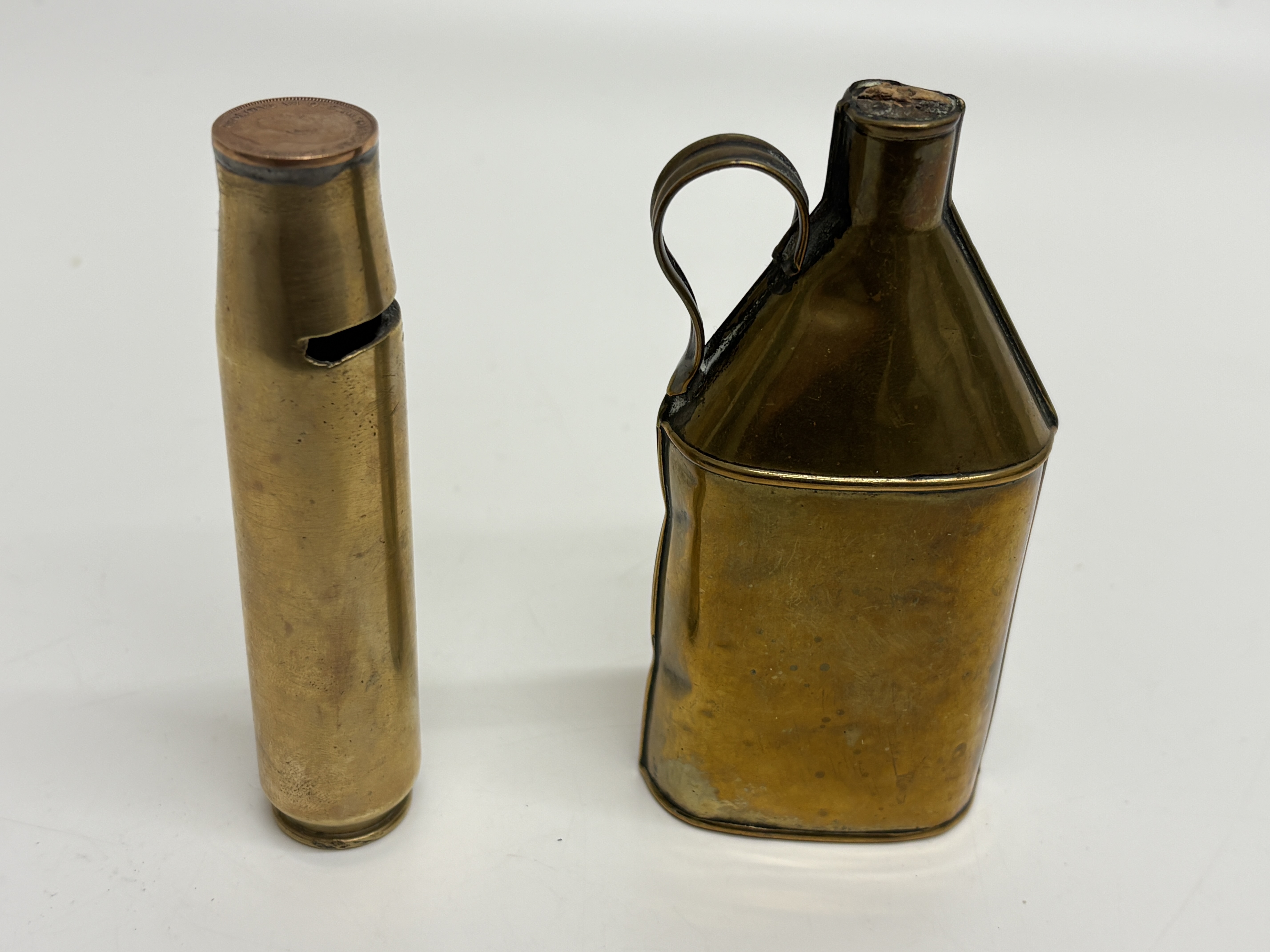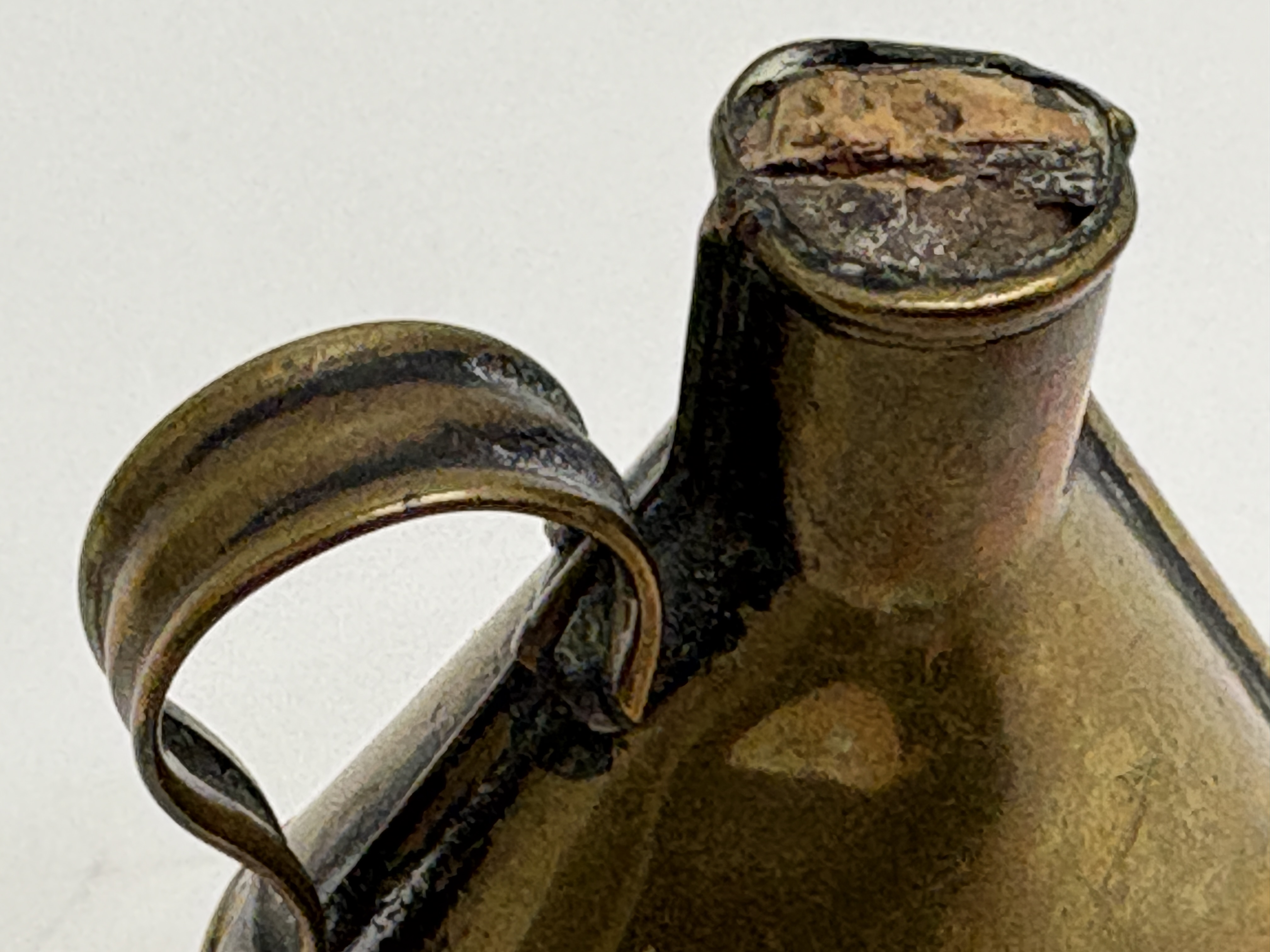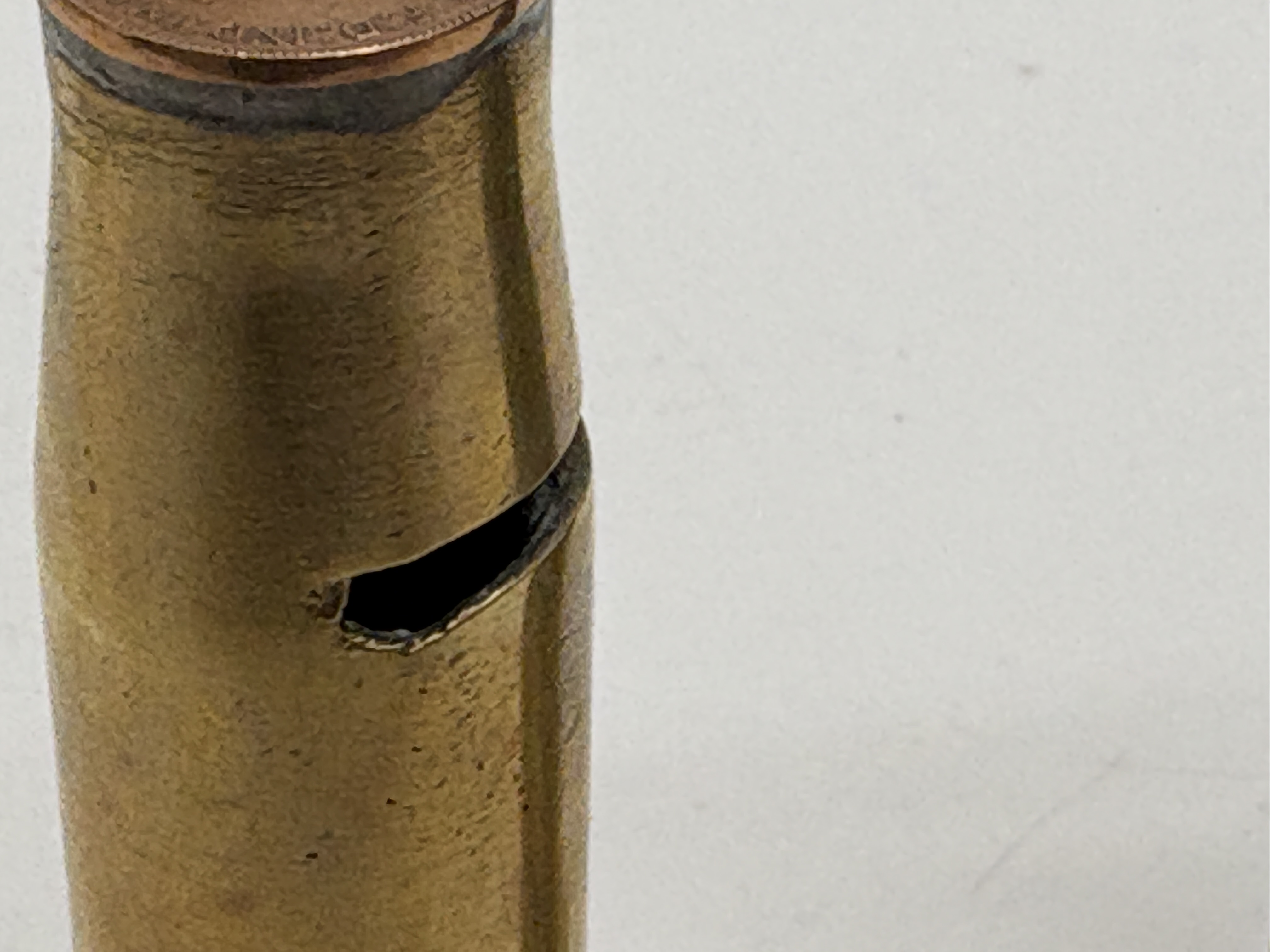A whistle and a small oil canister, both of brass construction and dating to the World War II period. The whistle is fashioned from a .30 calibre brass cartridge case, with the headstamp marked 1943, WE, and CAL .30. It is capped with a British copper coin depicting King George VI, bearing the inscription GEORGIVS VI D:G:BR:OMN:REX F:D:IND:IMP. The accompanying oil canister is of flattened oval form with a soldered handle and a spout currently fitted with a cork stopper. Both pieces demonstrate field-made construction with visible solder seams.