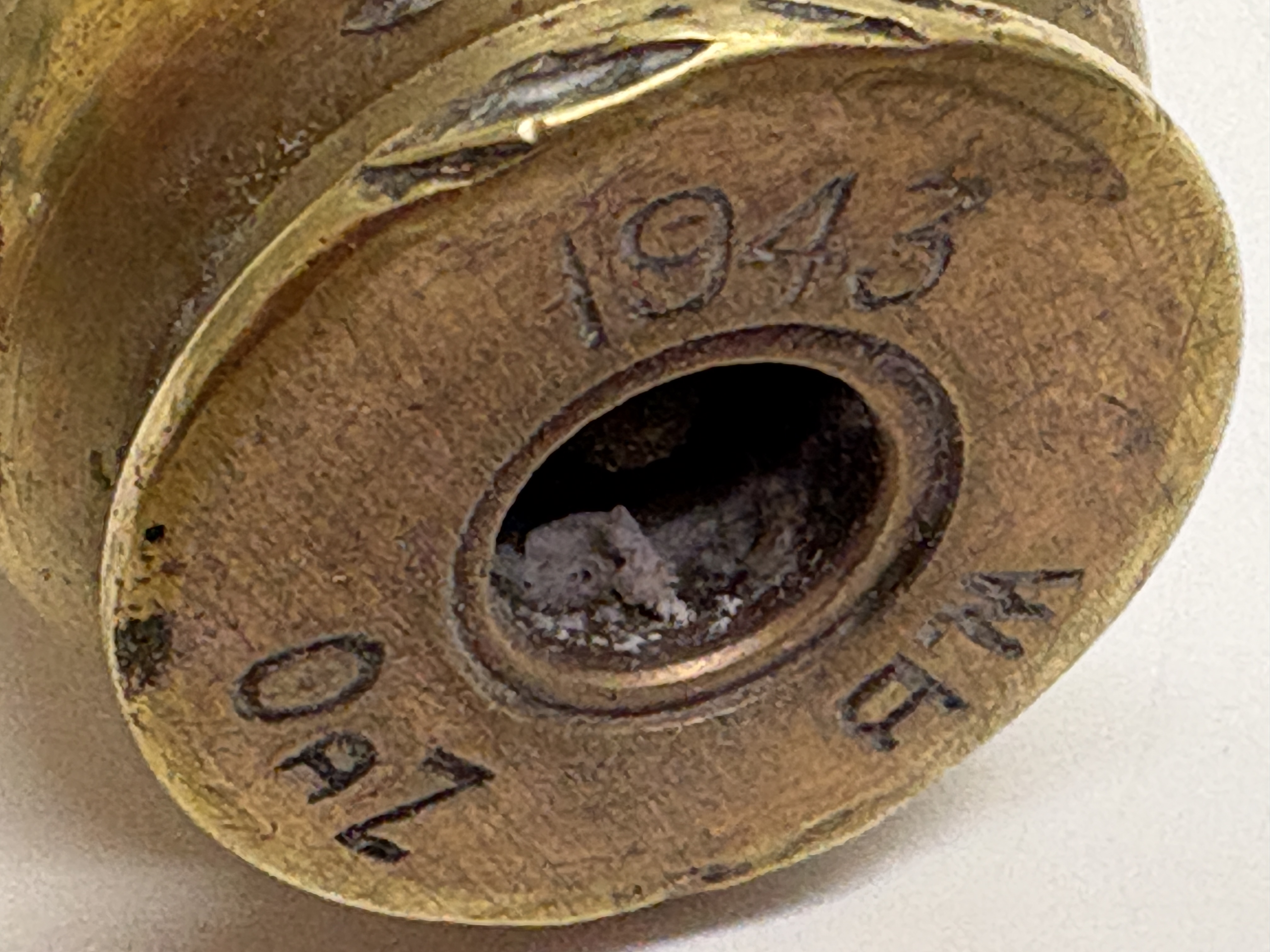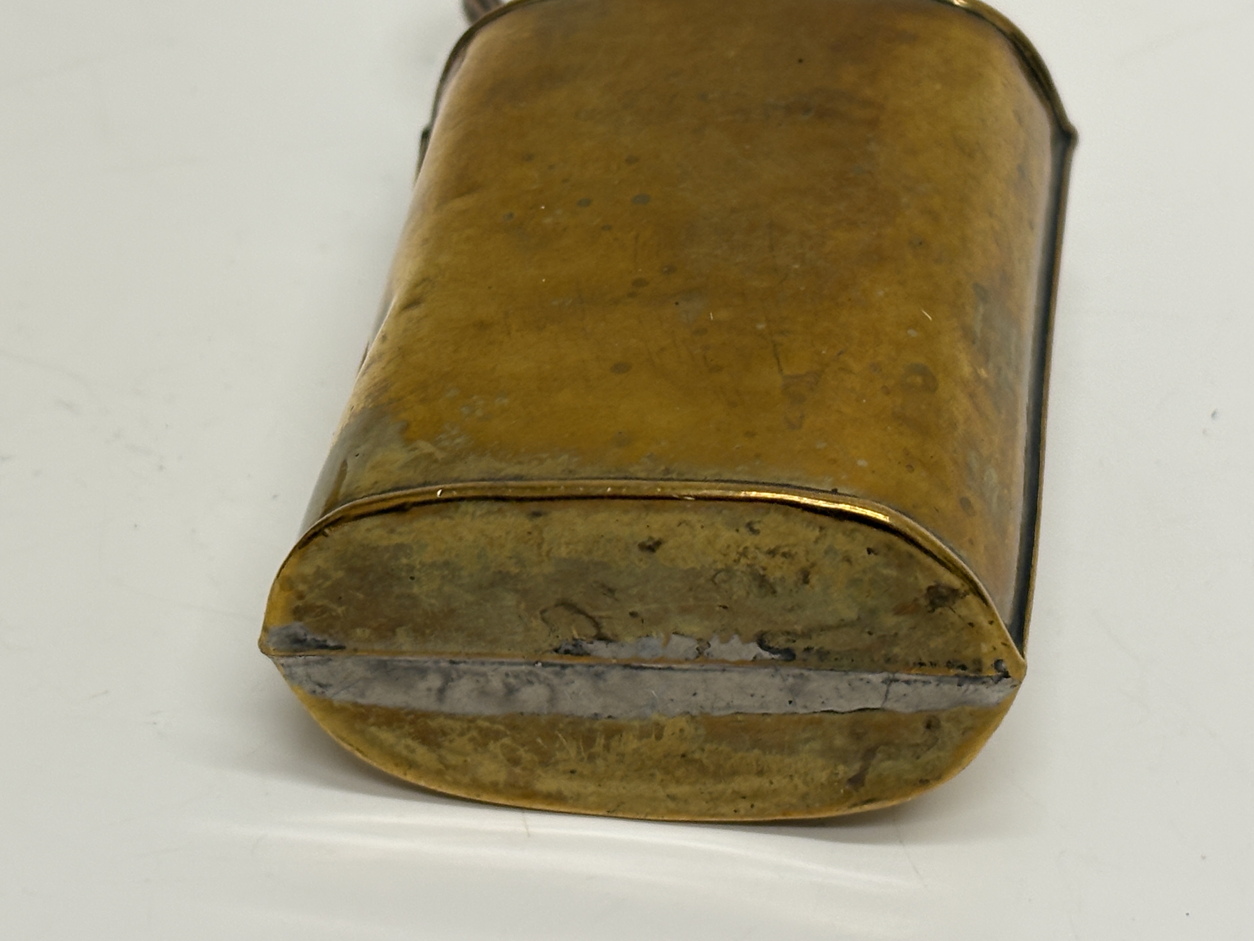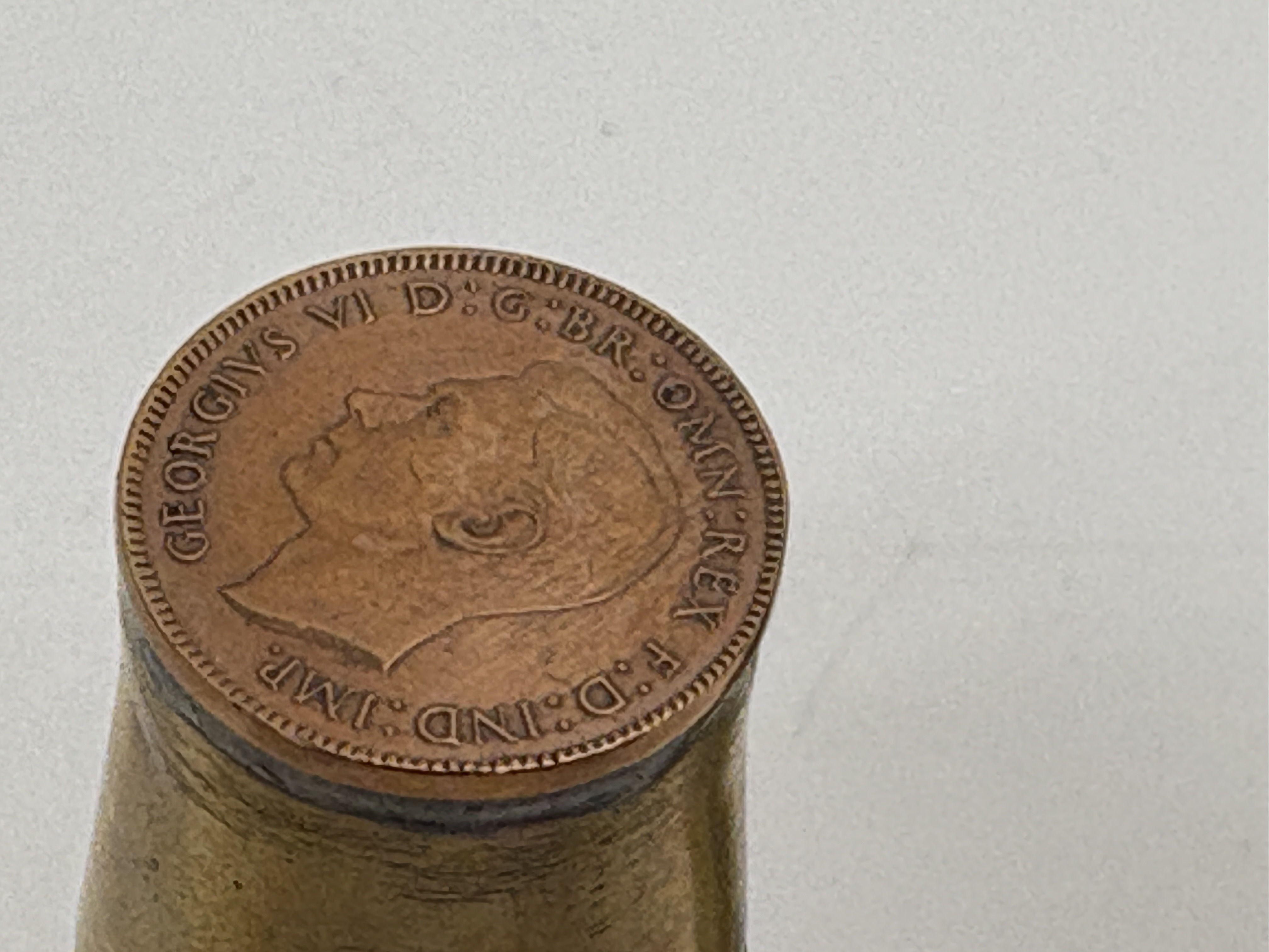 A whistle and a small oil canister, both of brass construction and dating to the World War II period. The whistle is fashioned from a .30 calibre brass cartridge case, with the headstamp marked 1943, WE, and CAL .30. It is capped with a British copper coin depicting King George VI, bearing the inscription GEORGIVS VI D:G:BR:OMN:REX F:D:IND:IMP. The accompanying oil canister is of flattened oval form with a soldered handle and a spout currently fitted with a cork stopper. Both pieces demonstrate field-made construction with visible solder seams.