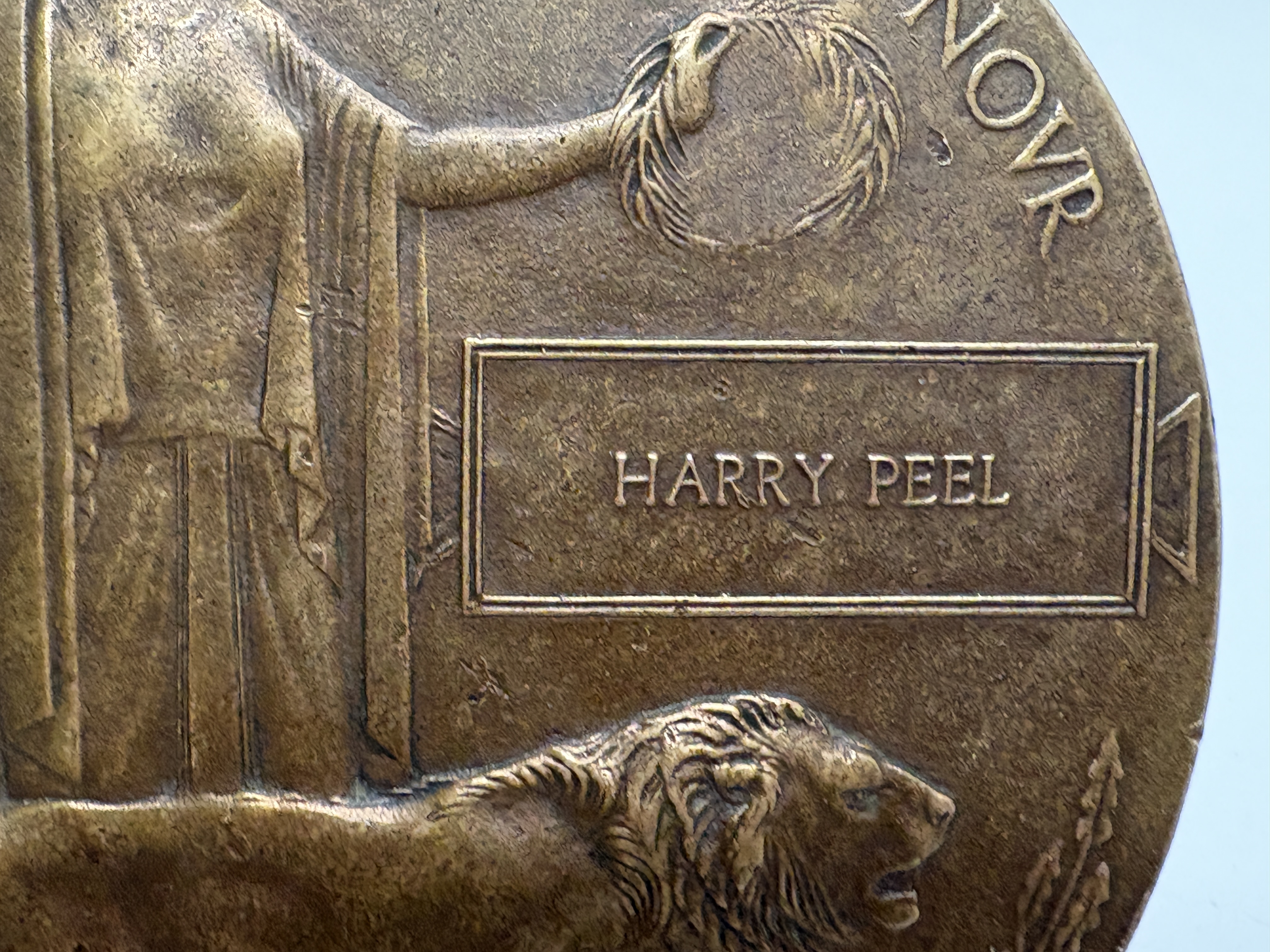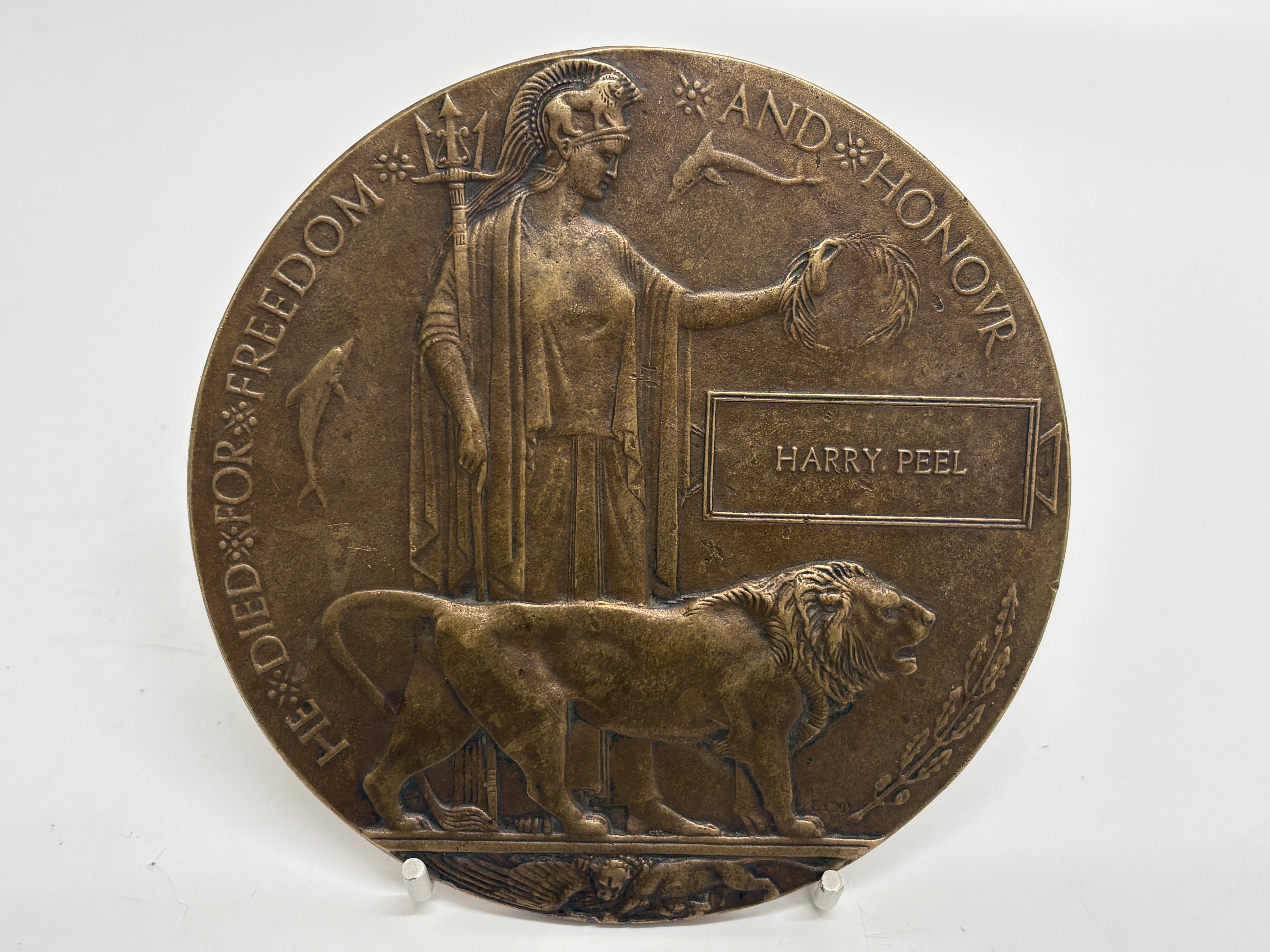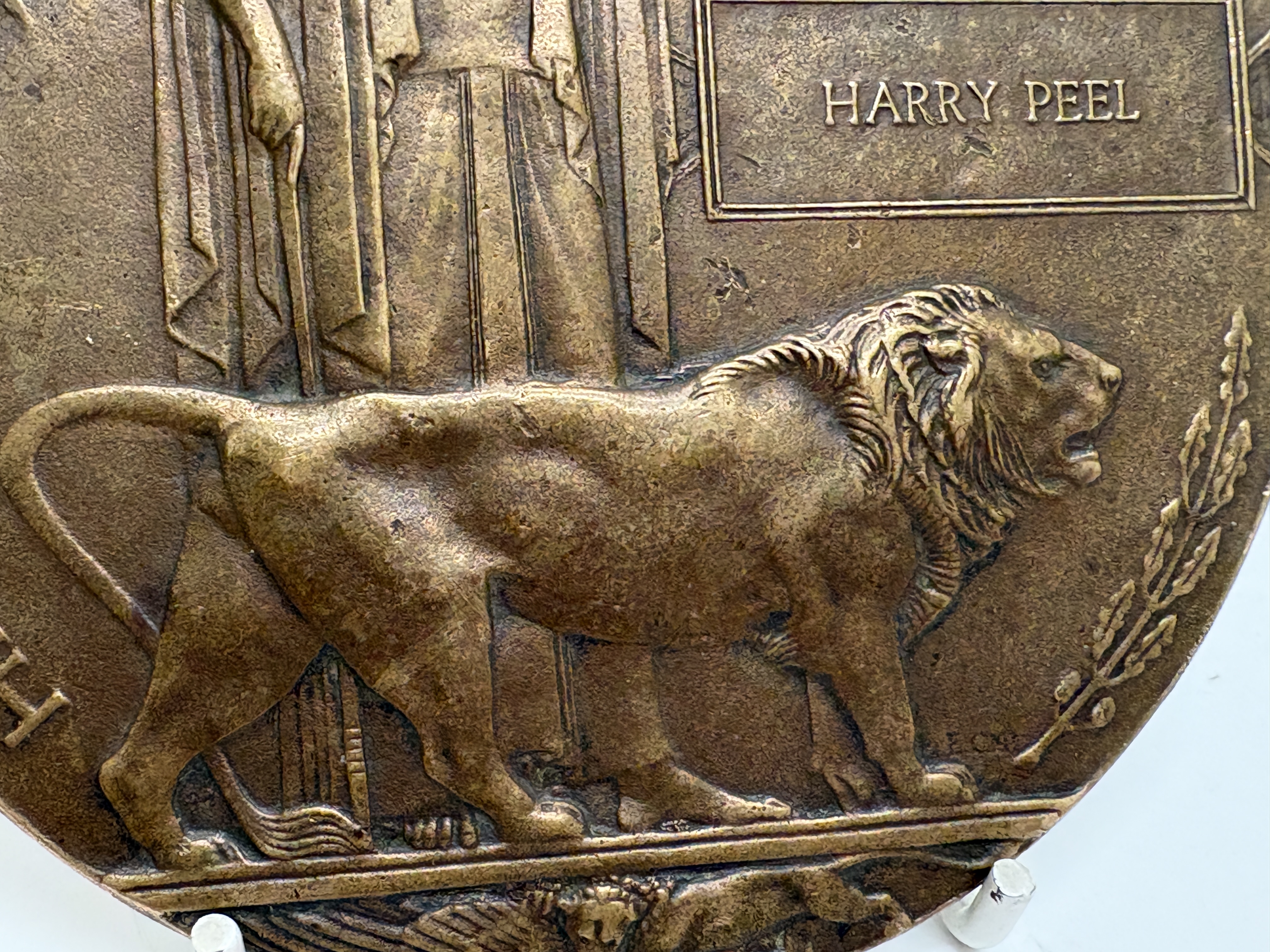 Designer: Edward Carter Preston (initials E.CR.P.). Britannia and Lion obverse type. Key identifier: embossed name HARRY PEEL within a raised rectangular cartouche. Inscribed HE DIED FOR FREEDOM AND HONOVR. This commemorative item was issued to the next-of-kin of British and Empire service personnel who perished as a result of the First World War.