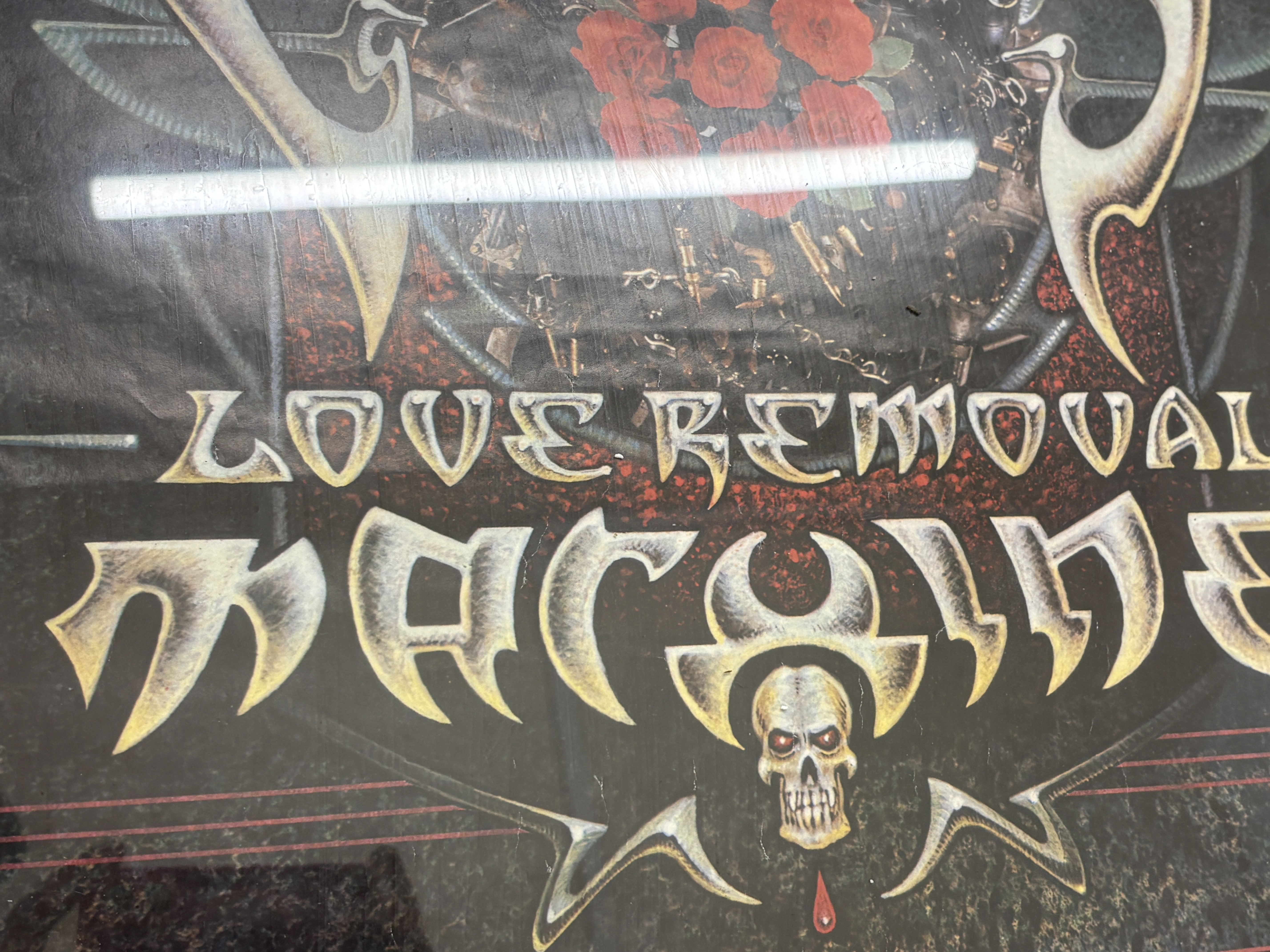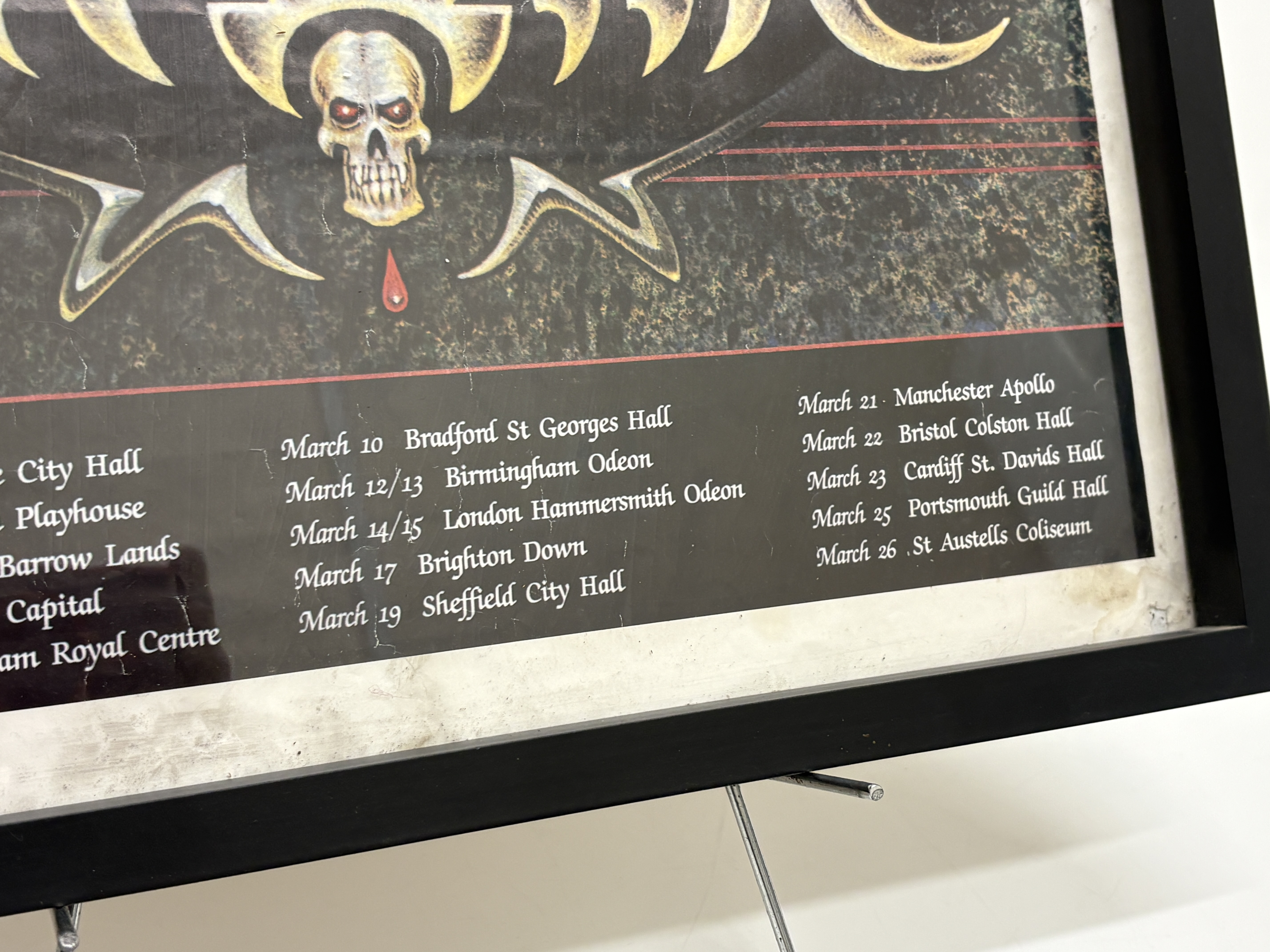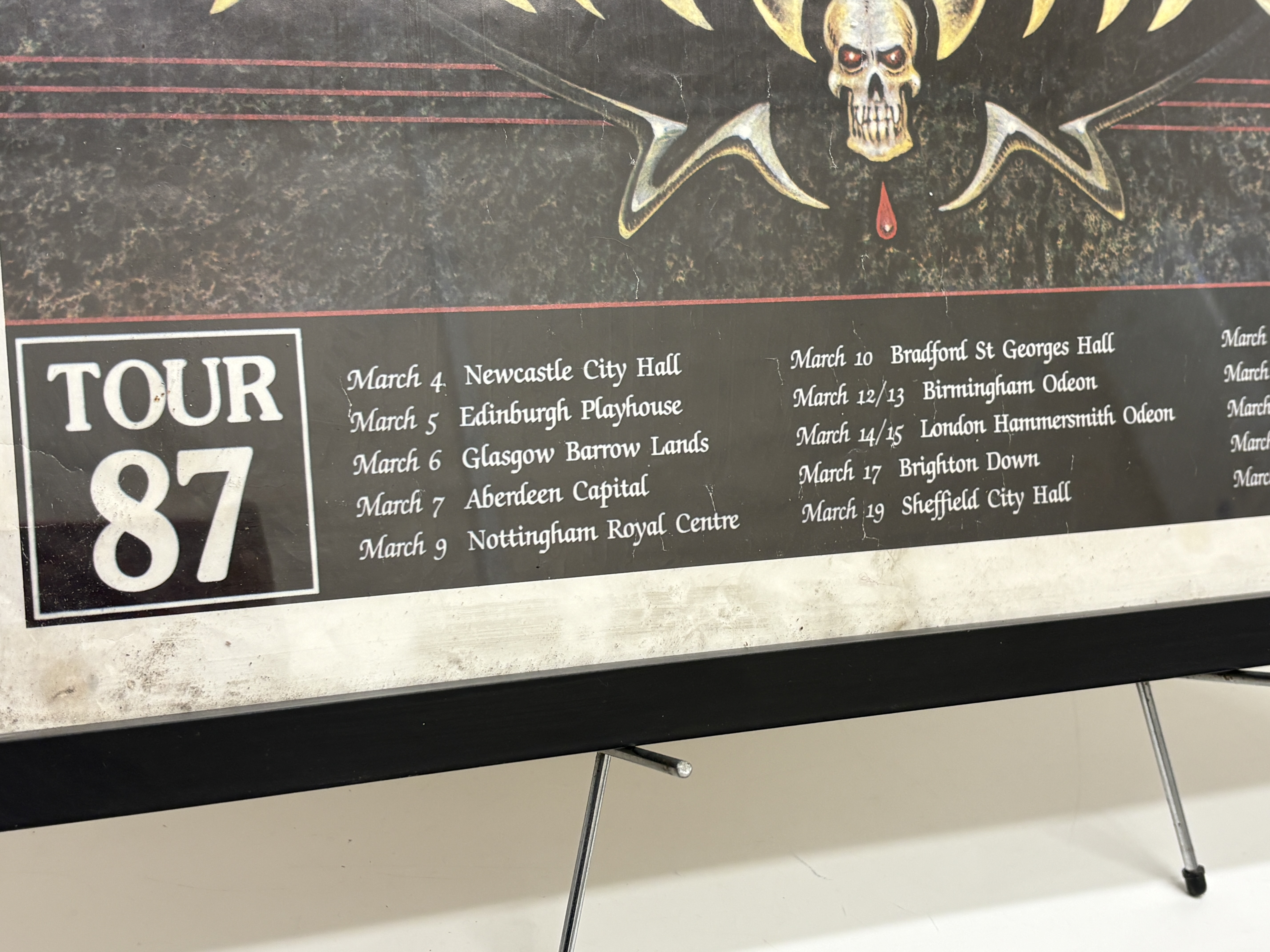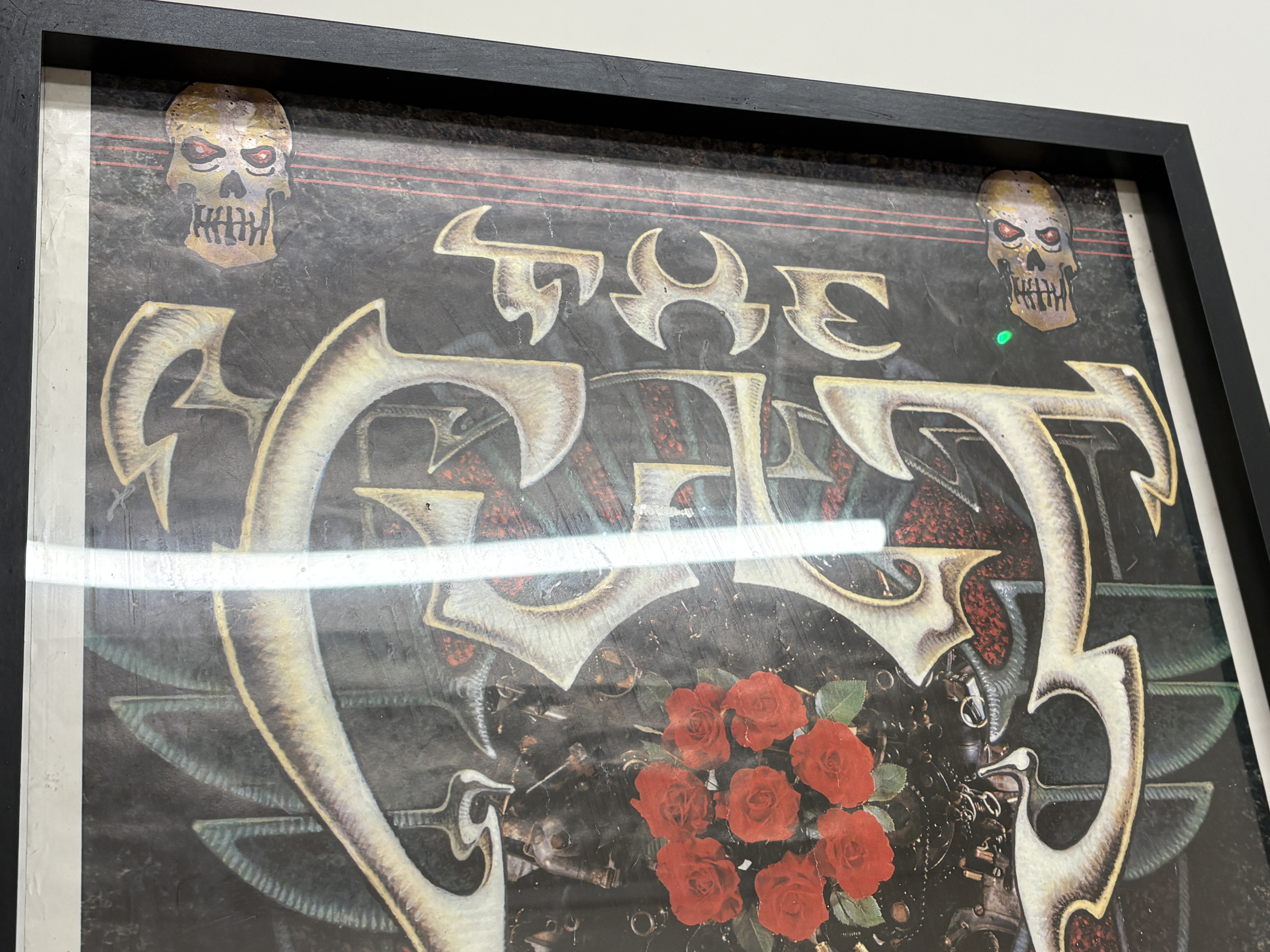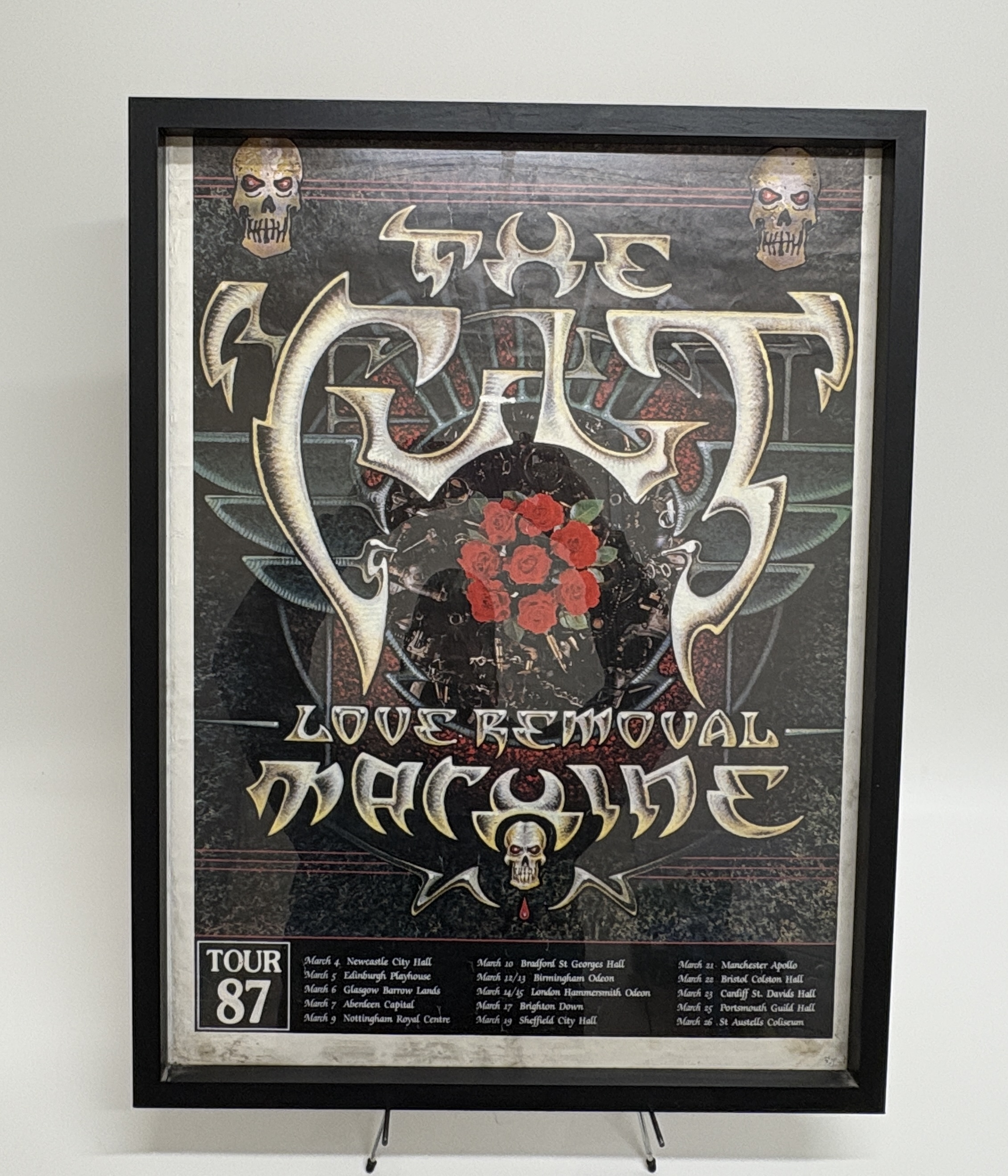 This is an original concert tour poster for the English rock band The Cult, promoting their landmark 1987 Love Removal Machine tour. The graphic design incorporates the band’s signature stylized logo, skull iconography with striking red eyes, and a central cluster of red roses, reflecting the aesthetic of the Electric album era. The lower portion of the poster features a complete Tour 87 itinerary, detailing performances across various UK venues from 4 March to 26 March 1987, including stops at the Hammersmith Odeon and Manchester Apollo. As an authentic piece of vintage music ephemera, it captures a pivotal era in British rock history. The poster is professionally presented in a simple black frame.