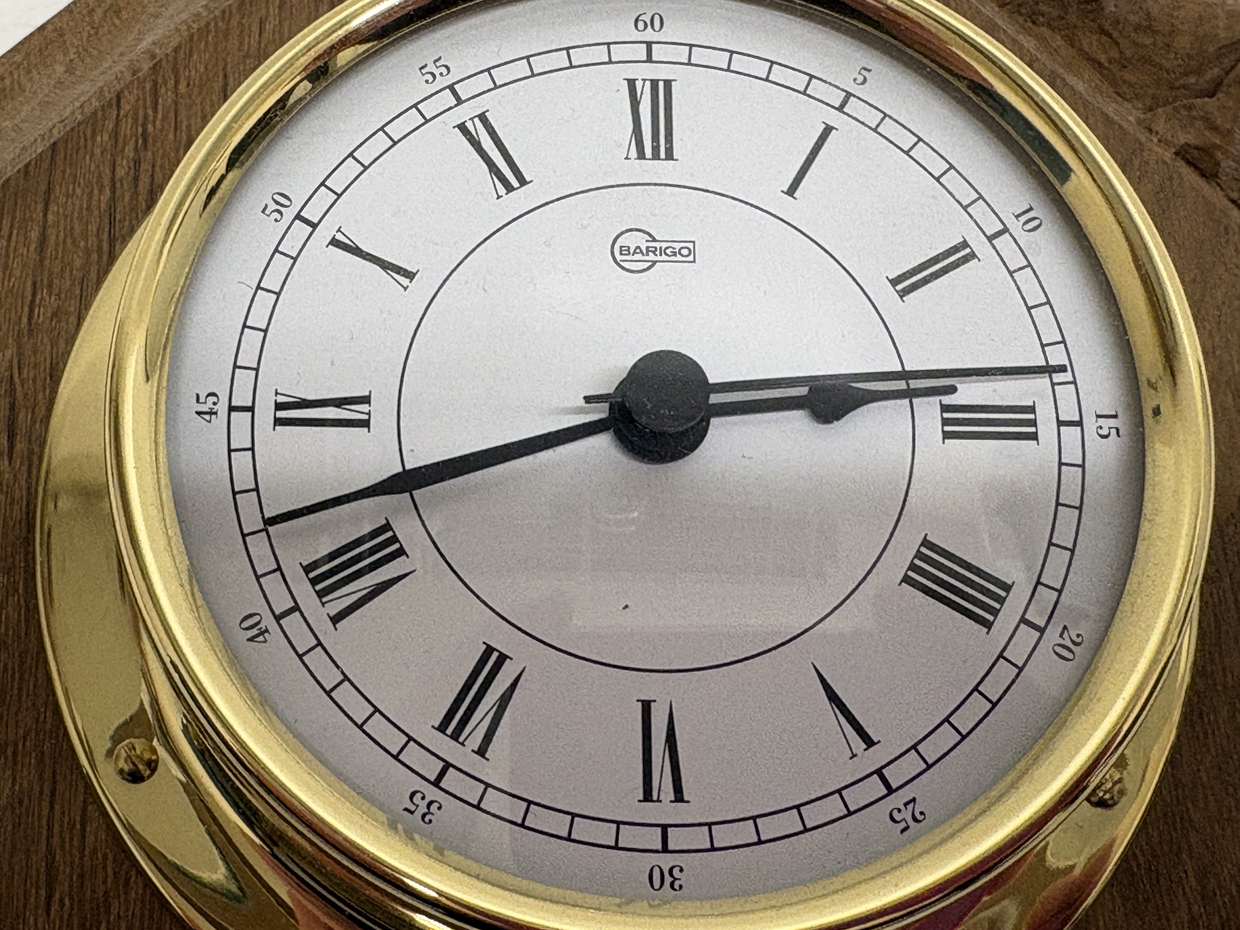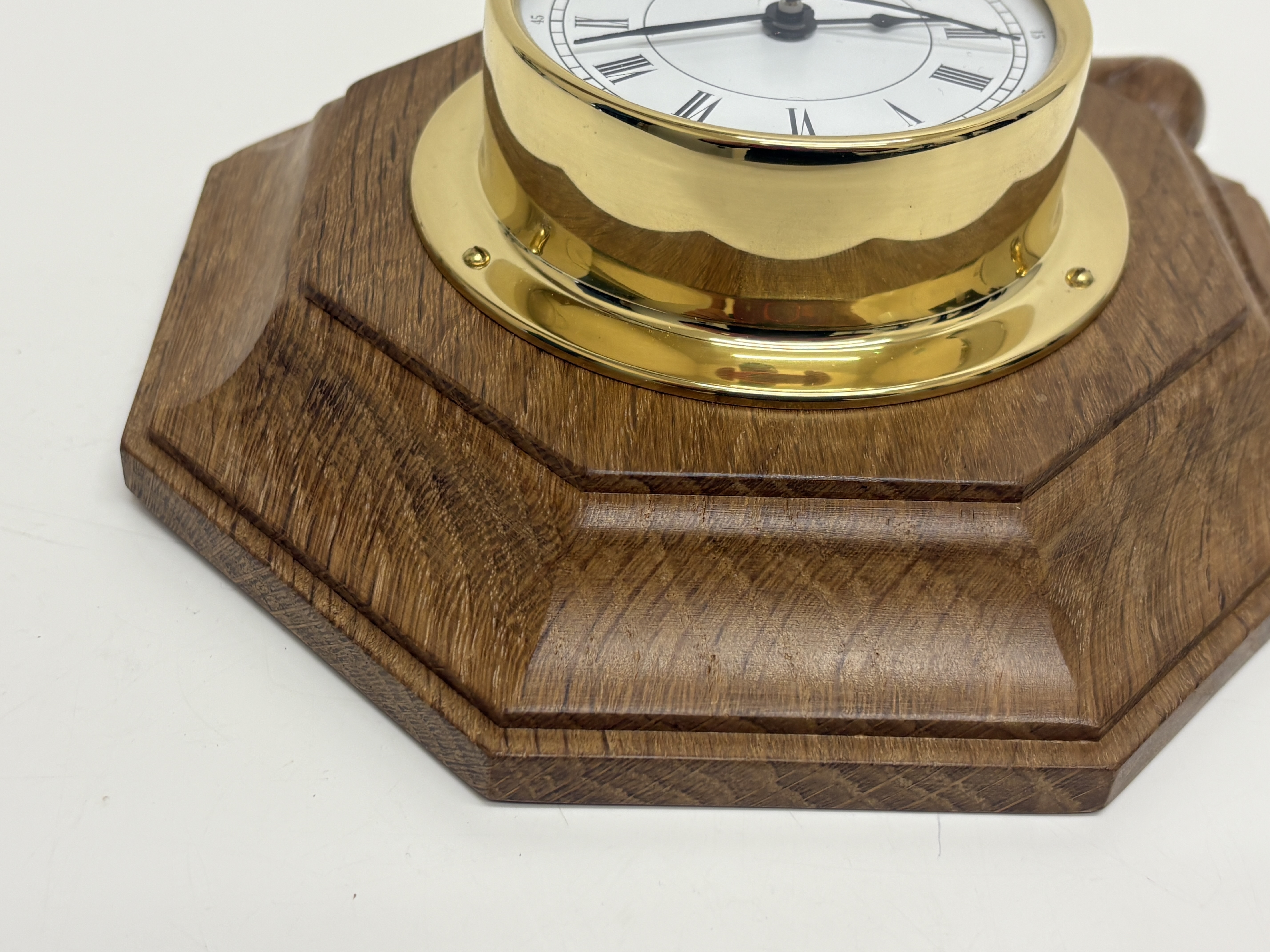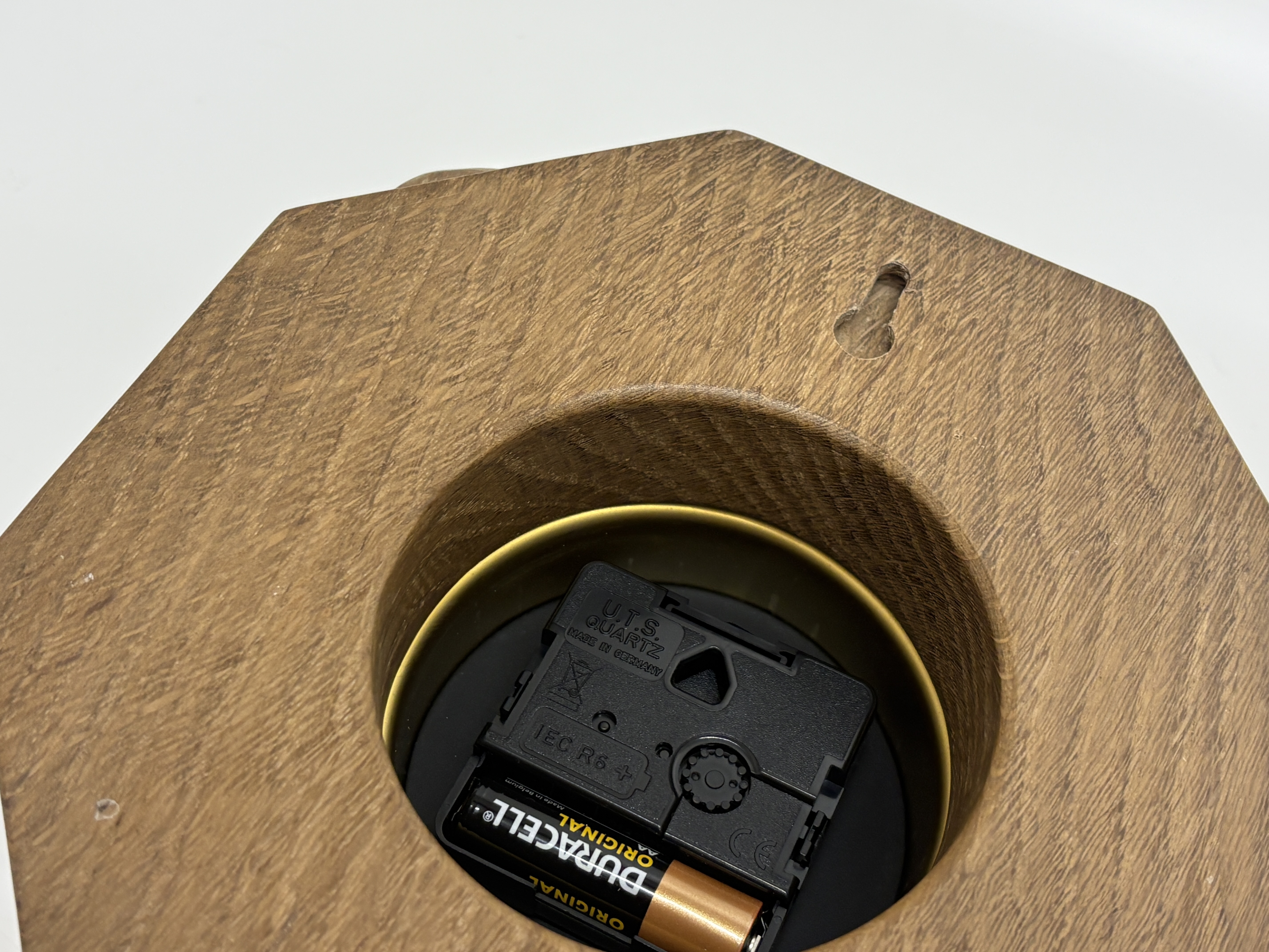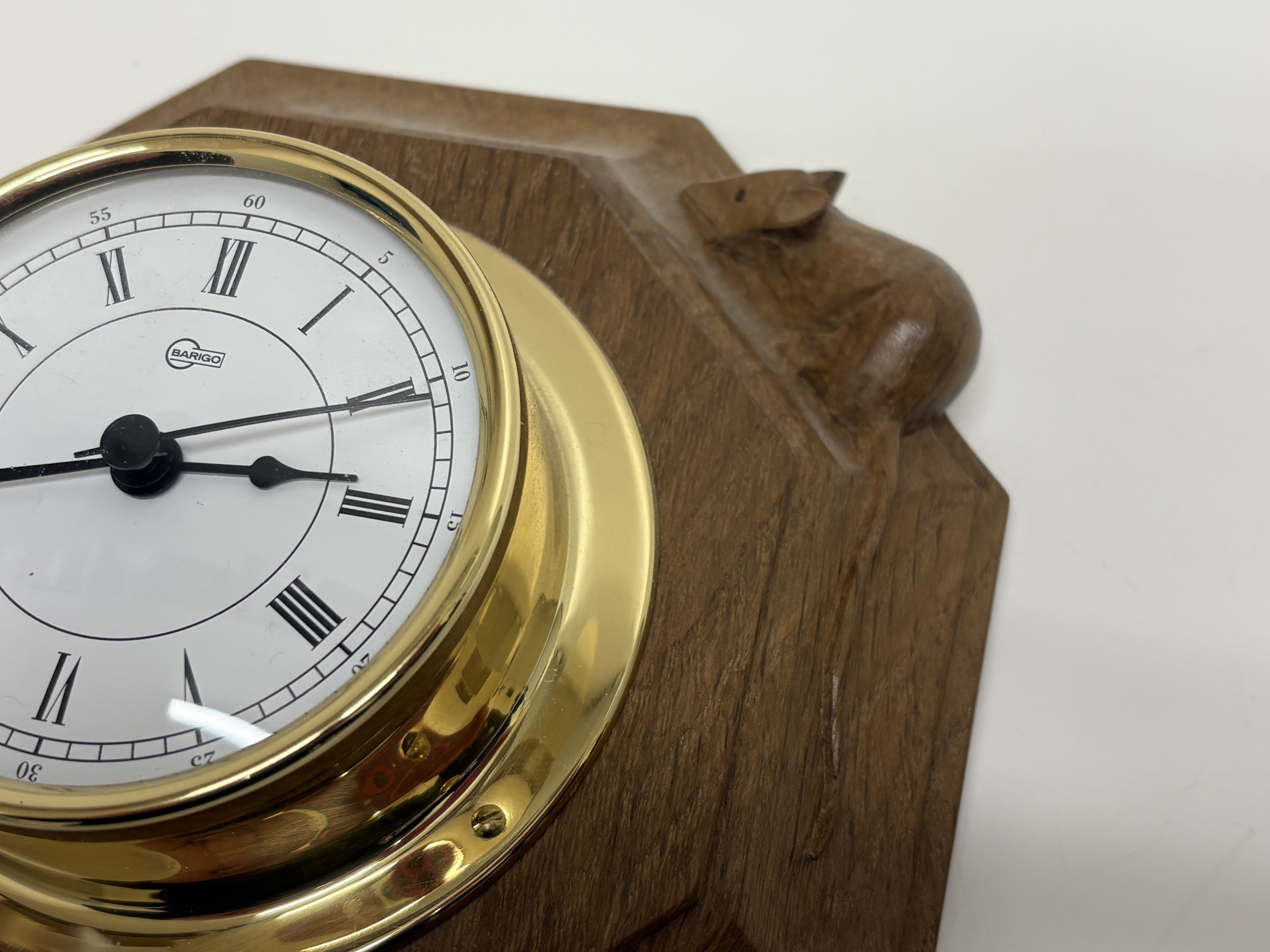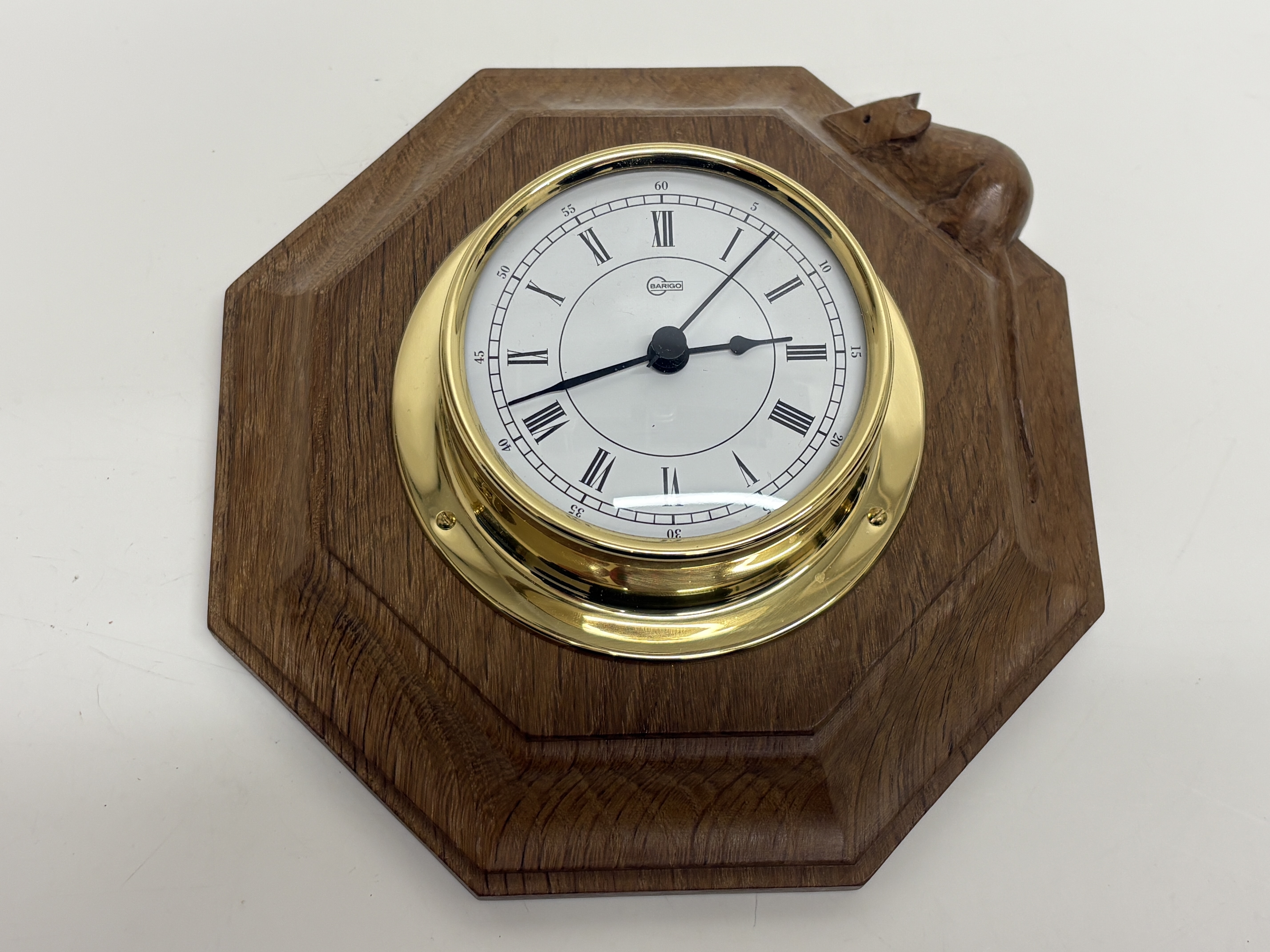 A hand-carved oak octagonal wall clock from the workshop of Robert ‘Mouseman’ Thompson of Kilburn. The oak plaque features the signature high-relief mouse carved onto the upper right-hand bevelled edge. The clock is a Barigo (Germany) unit housed in a polished brass circular case. The silvered dial features black Roman numeral hour markers, an outer minute track with Arabic numerals at five-minute intervals, and black hands including a sweep second hand. It is powered by a U.T.S. (Germany) quartz movement requiring one AA battery. This model does not feature chimes. Dimensions: 19cm x 19cm.