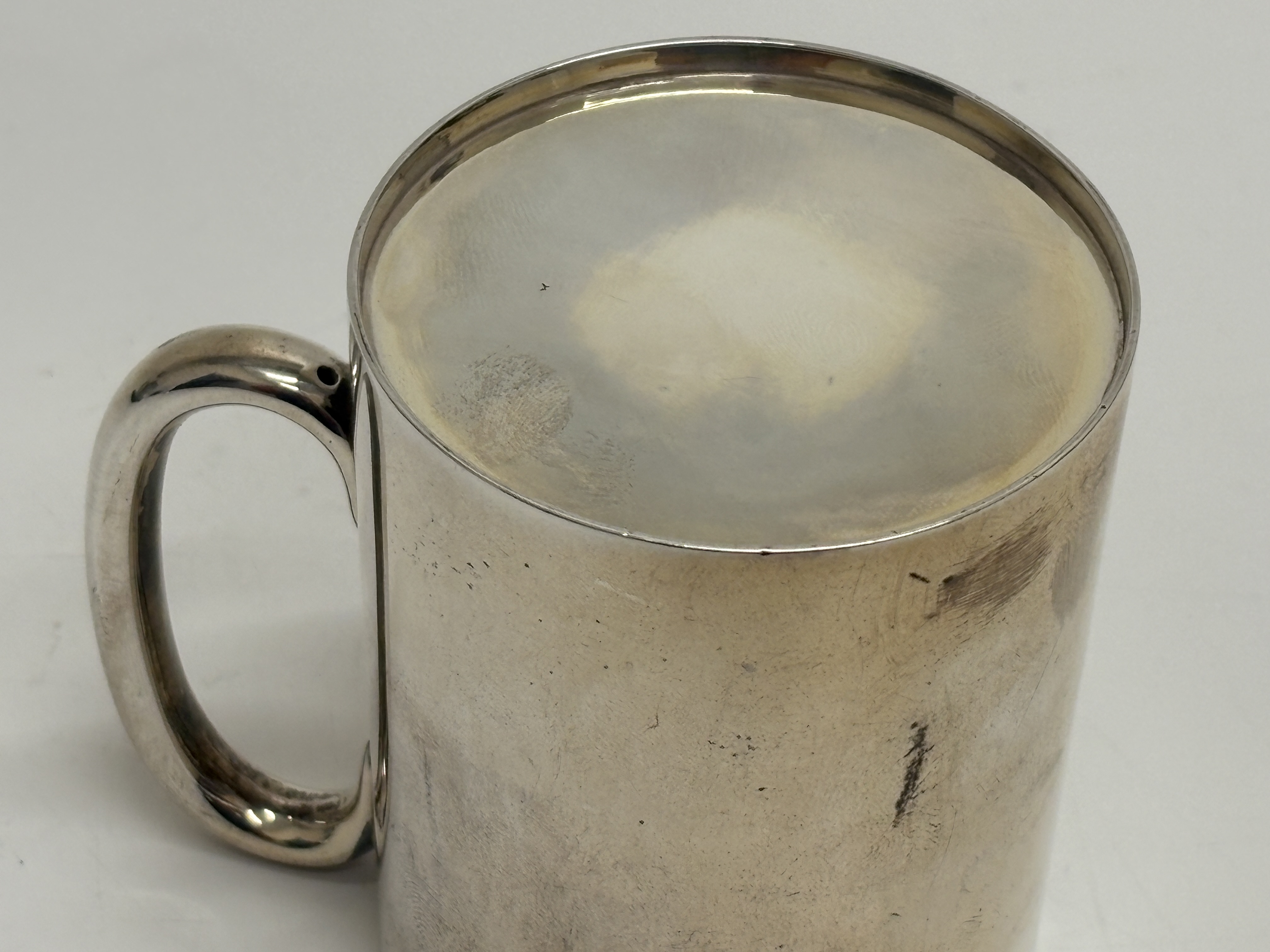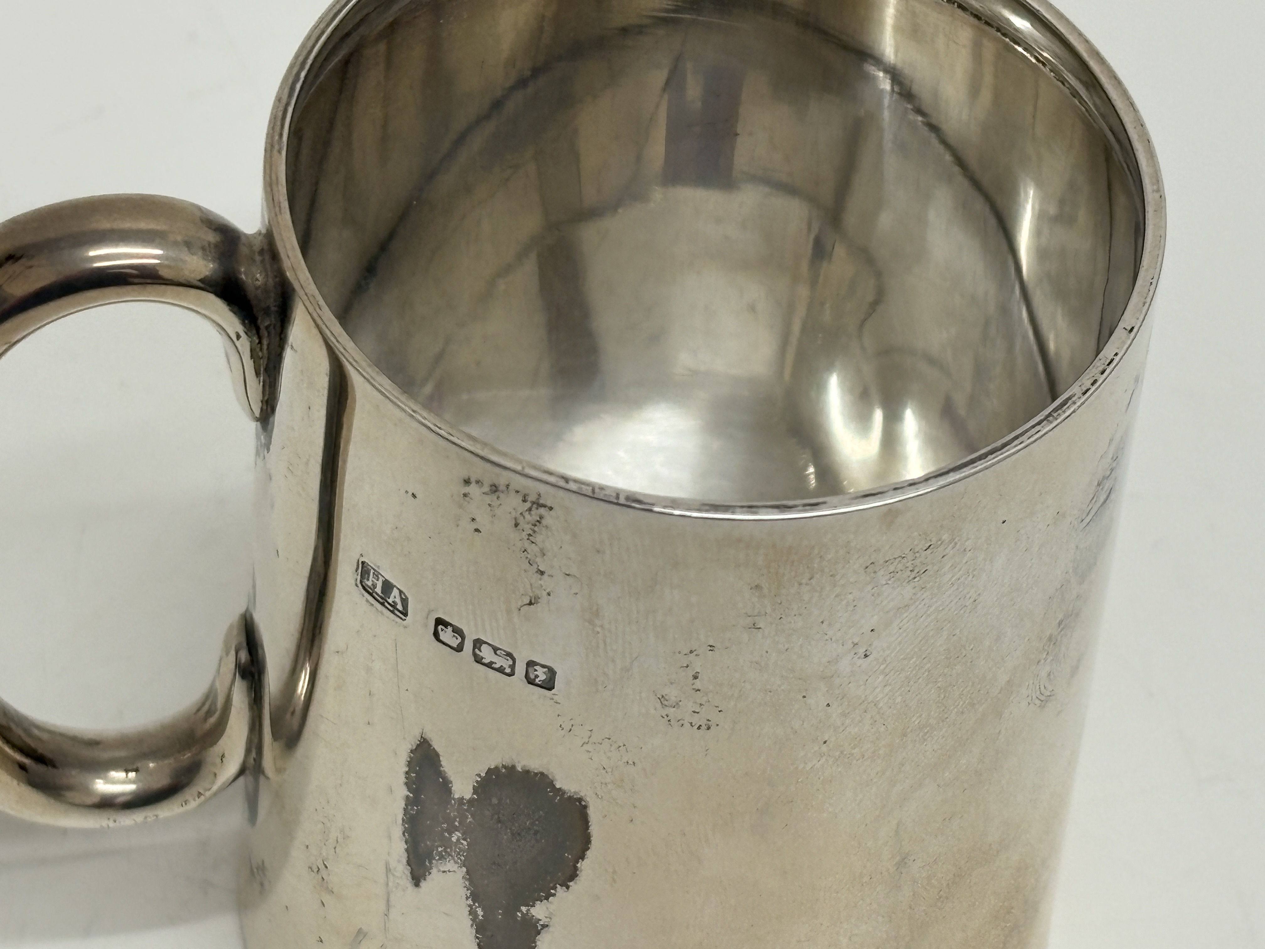 A sterling silver mug of plain cylindrical form, crafted by Harry Atkin for Atkin Brothers. This Edwardian period piece features a formed sheet body with a reinforced rim and a sturdy cast C-scroll loop handle. The exterior is struck with a full set of British hallmarks including the maker’s mark HA, the Sheffield crown assay mark, the lion passant indicating sterling fineness, and the date letter q for 1908. Height: 9.5cm, Weight: 165g.