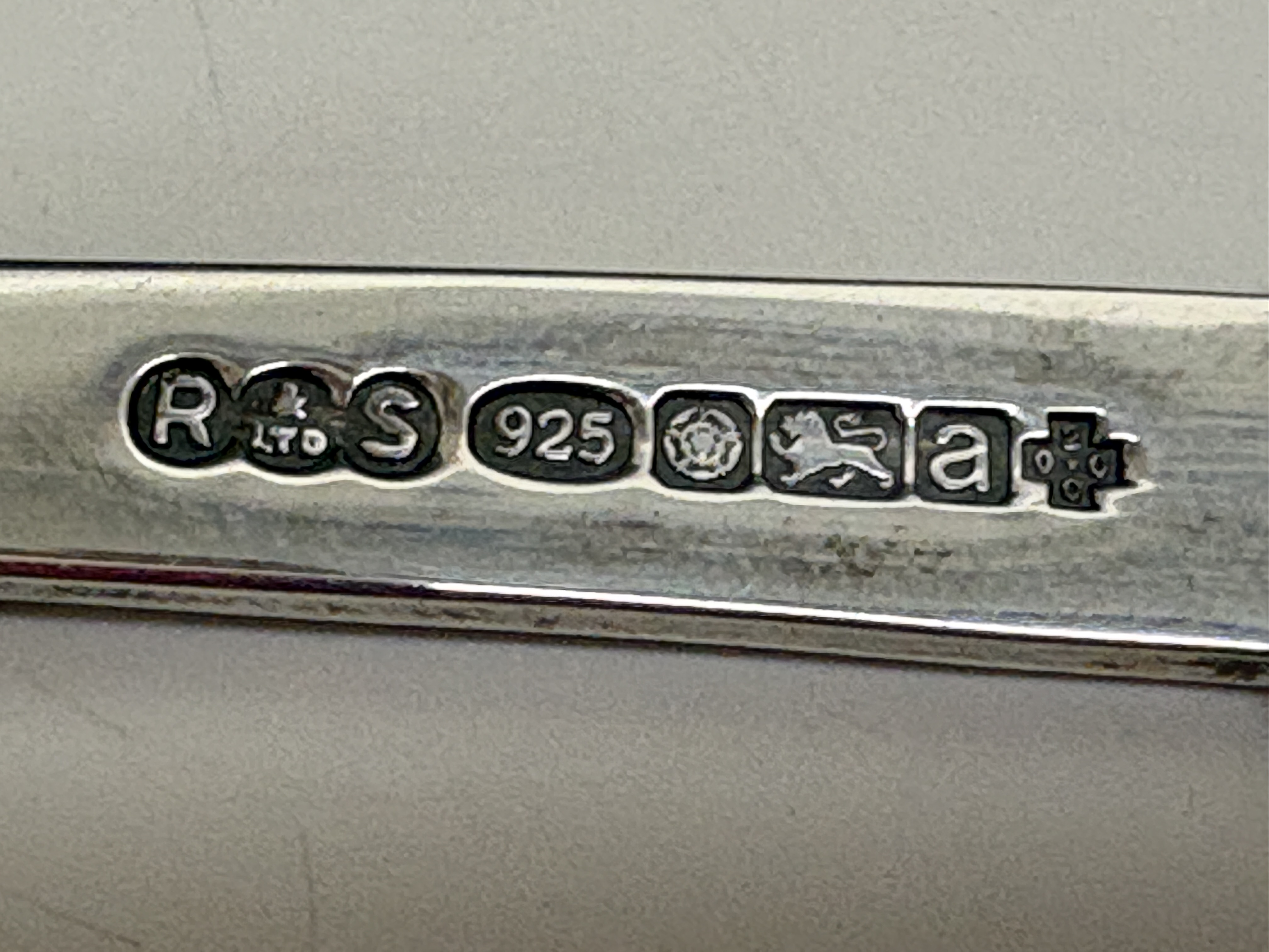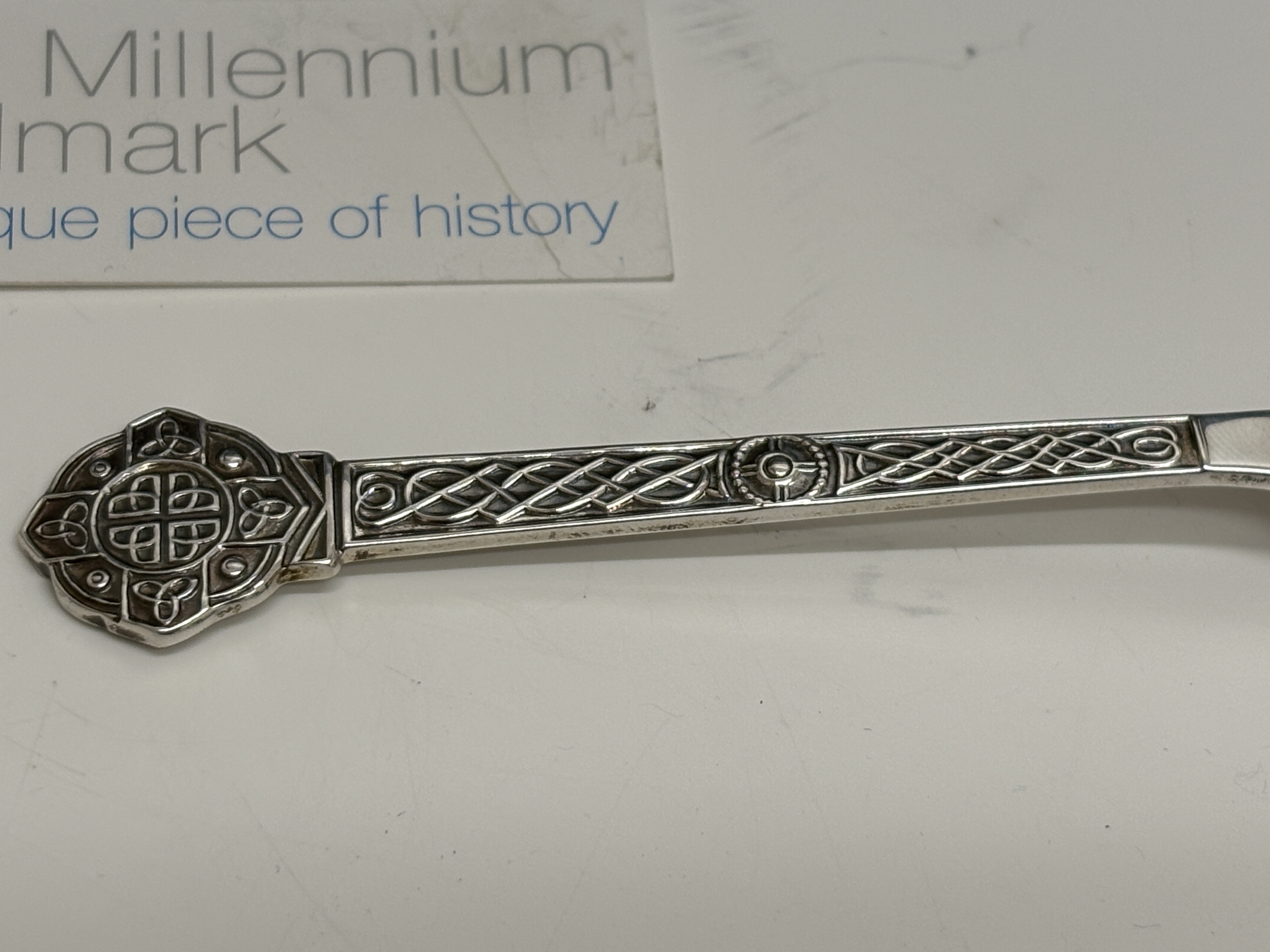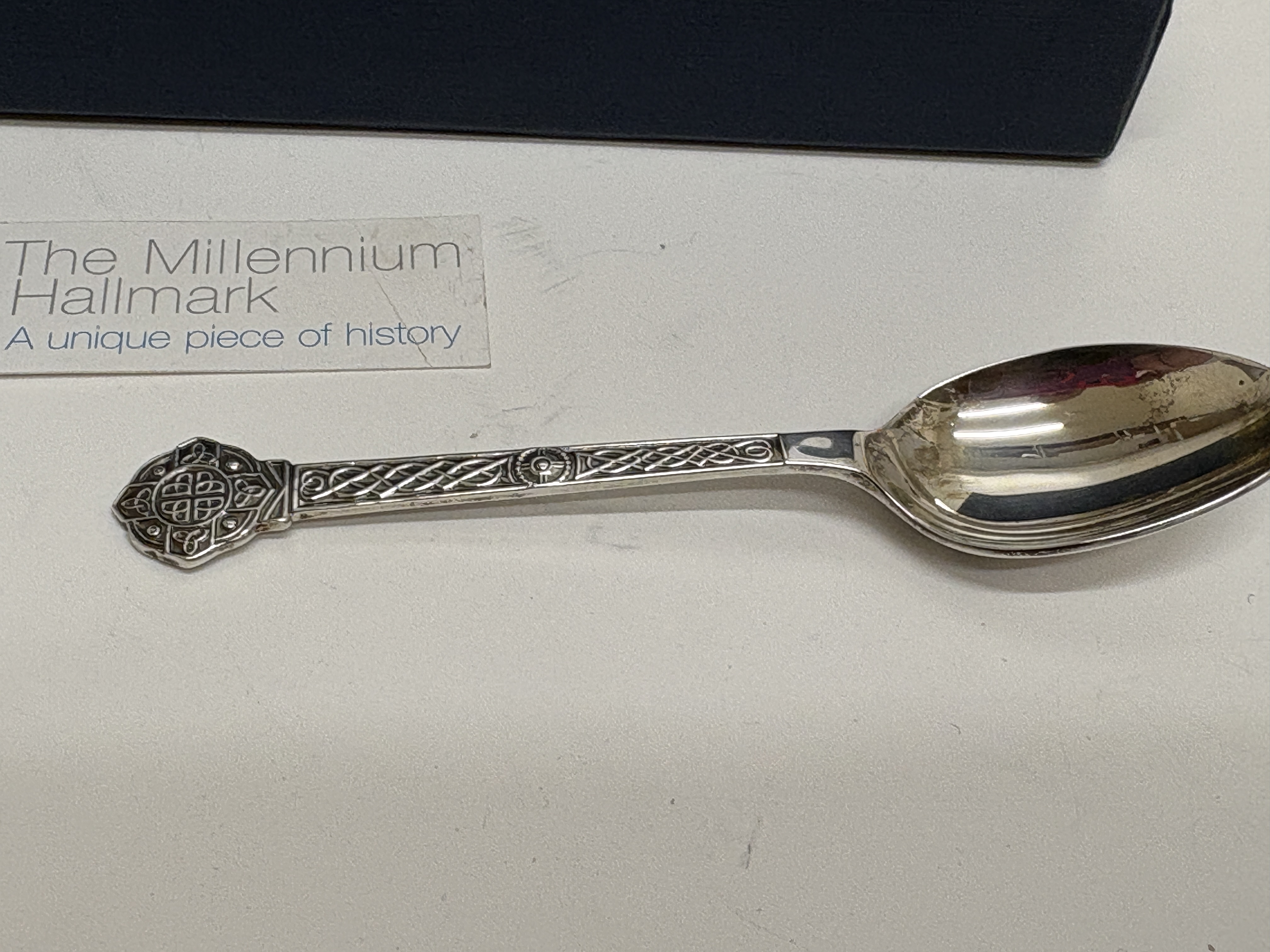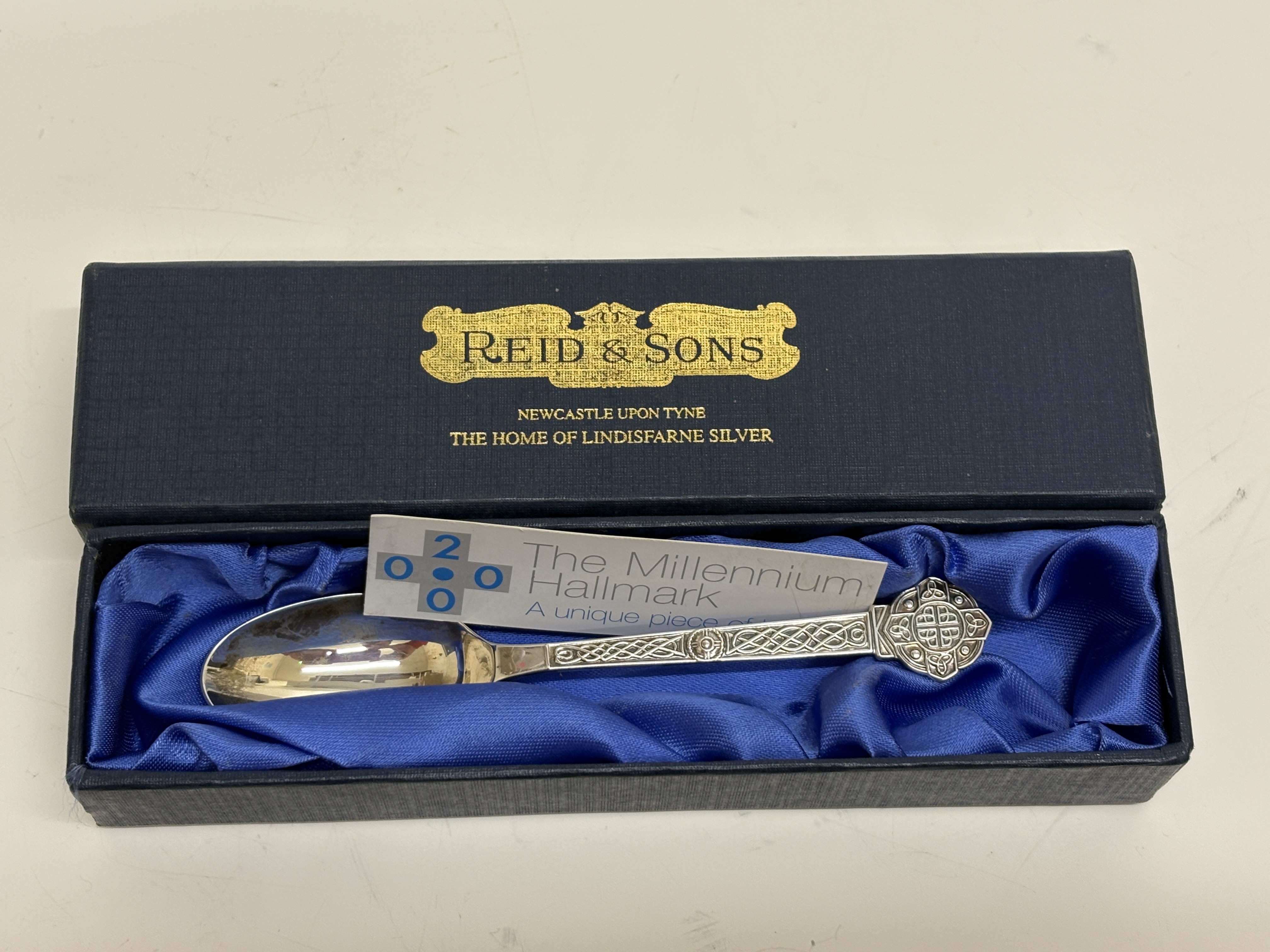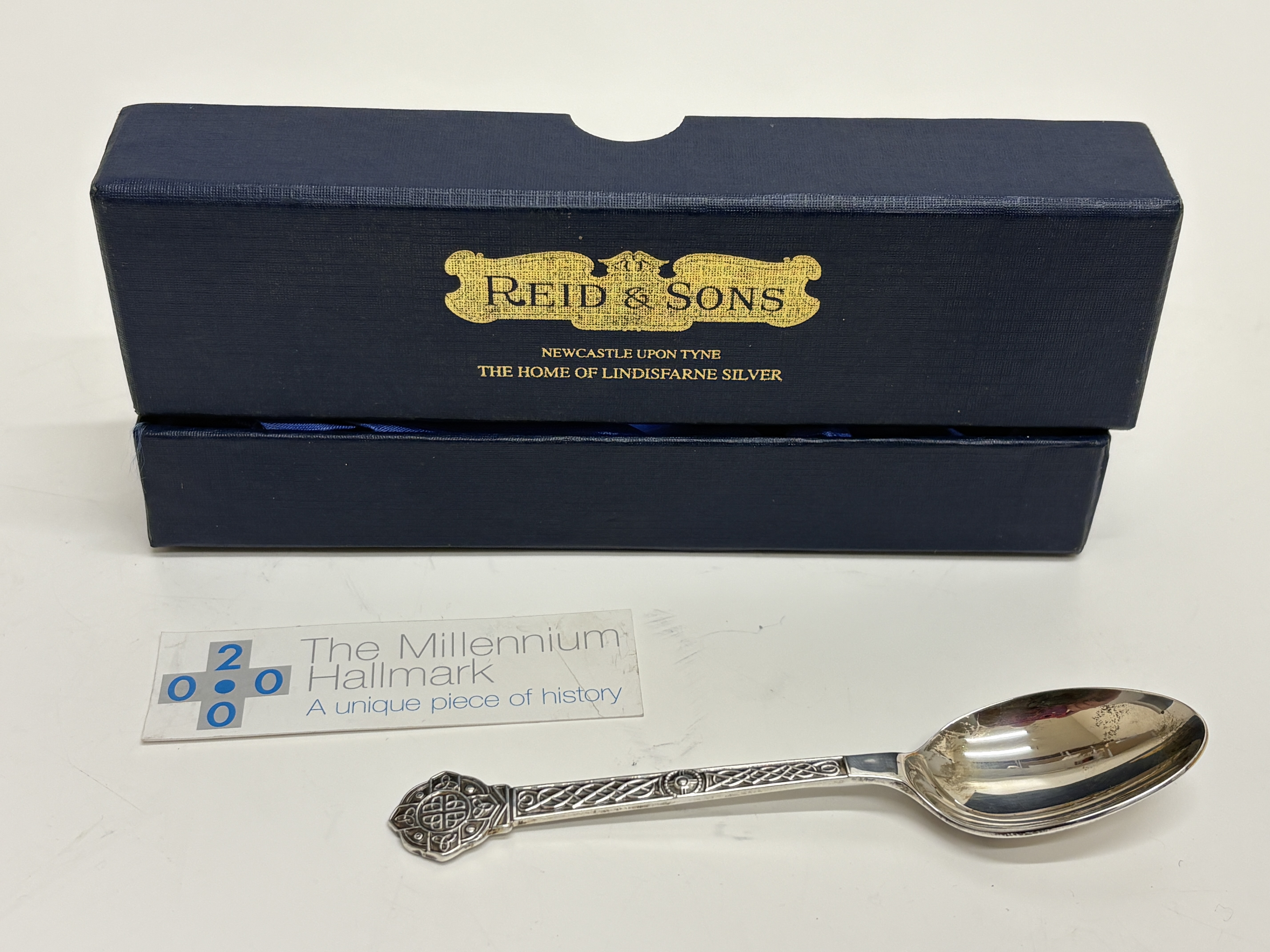 A sterling silver spoon in the Lindisfarne pattern, crafted by Reid & Sons Ltd. The piece features a handle and terminal decorated with traditional Celtic knotwork. Hallmarked for the Sheffield assay office with the date letter a for the year 2000, the .925 fineness mark, the lion passant, and the special Millennium commemorative mark. Presented in the original blue Reid & Sons fitted case with a descriptive Millennium Hallmark card.