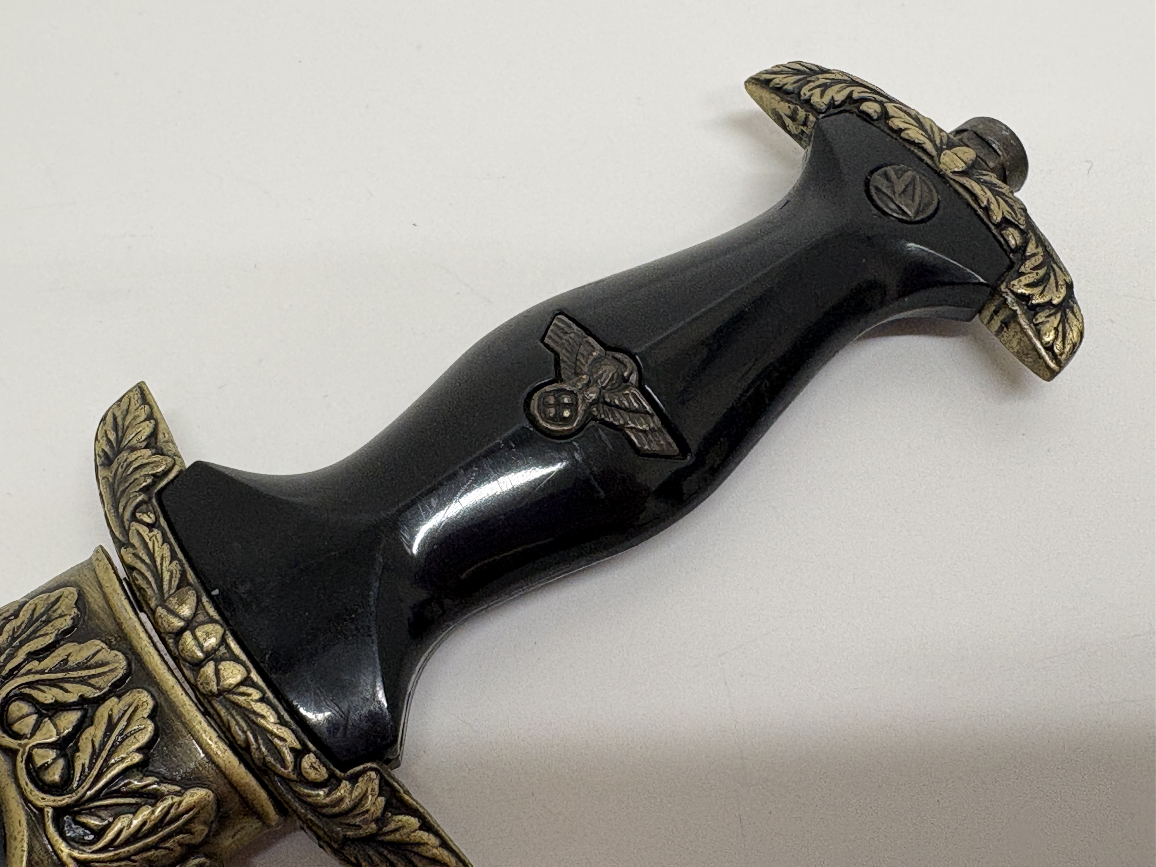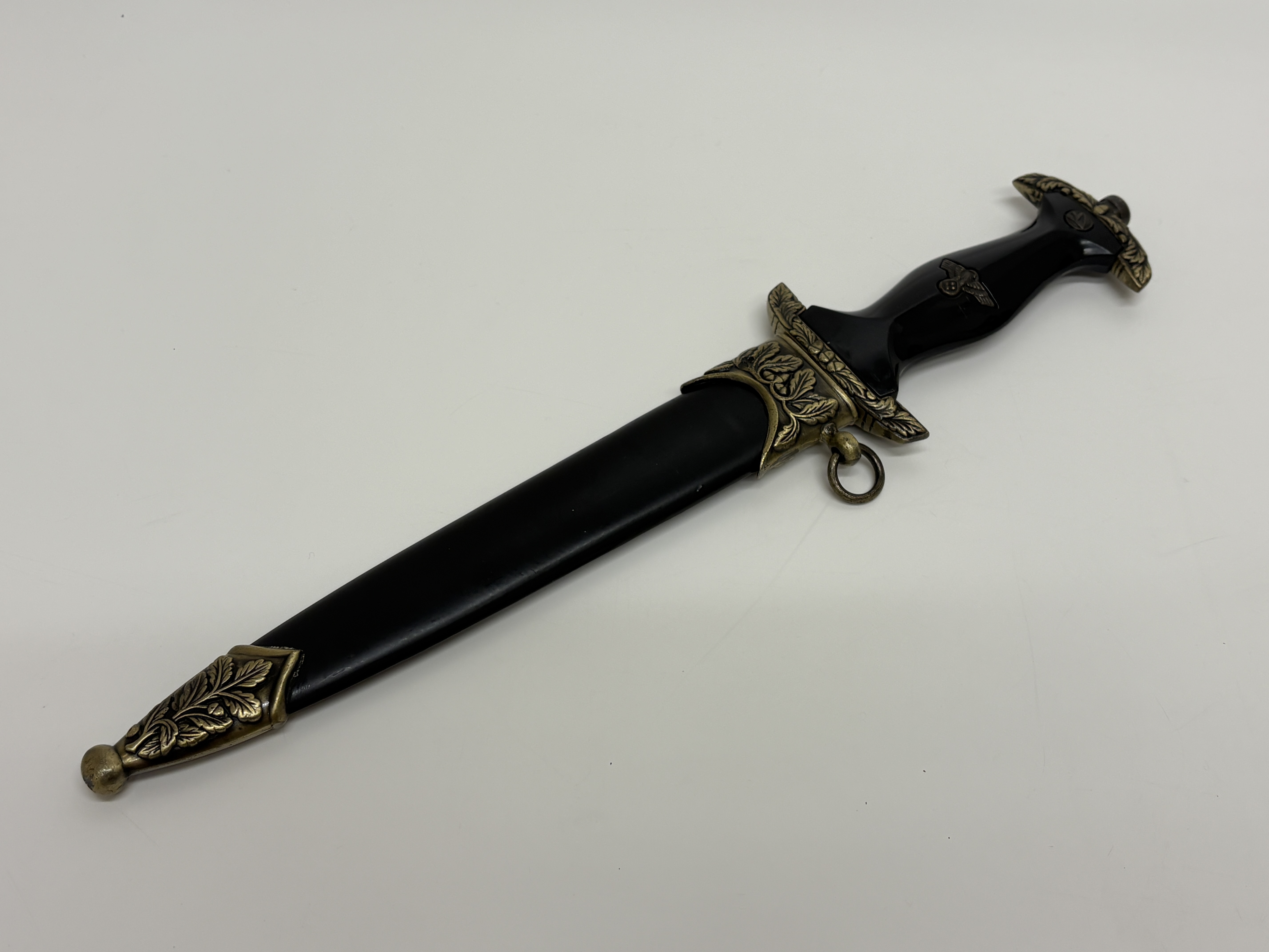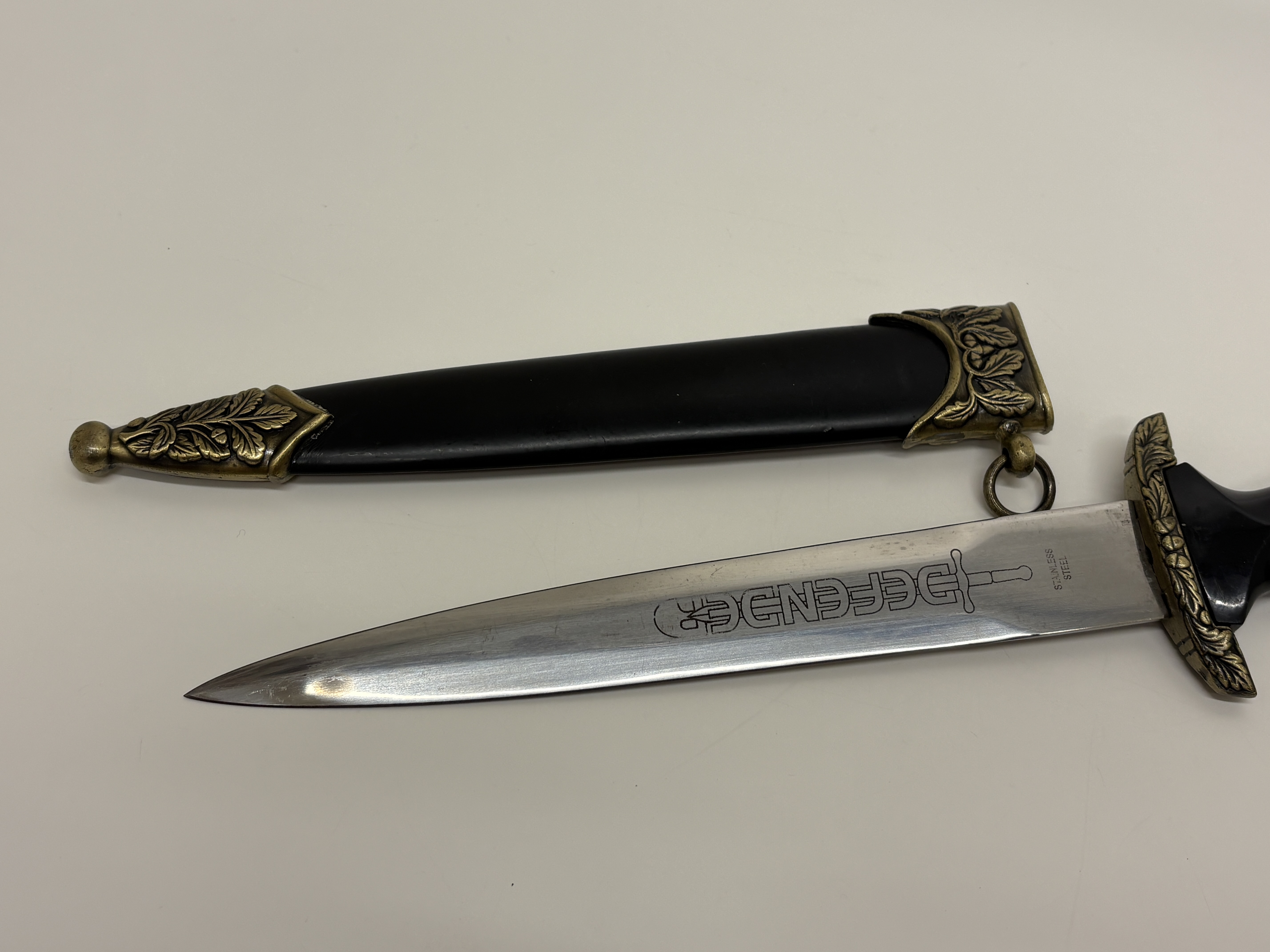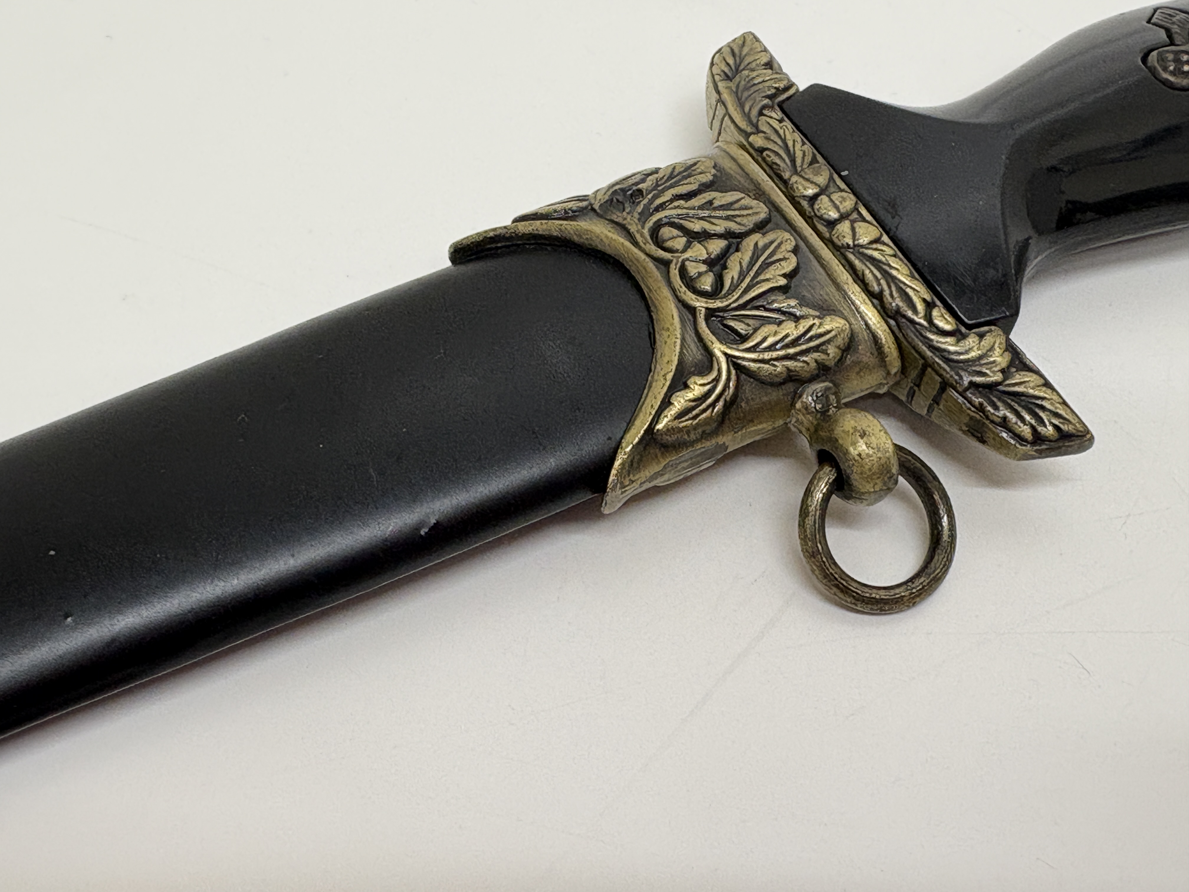This item is a modern, decorative novelty dagger produced in the style of a German Second World War Schutzstaffel (SS) service dagger. It is a non-authentic reproduction featuring a stainless steel blade and an injection-moulded black synthetic grip. The grip is inset with a silvered eagle clutching a swastika and a circular runic emblem at the pommel. The crossguard, pommel, and scabbard fittings are constructed from cast metal with an antiqued brass-coloured finish, decorated with ornate, raised oak leaf and acorn patterns. These ornate castings are a fantasy design element typical of contemporary decorative knives and were never utilised on standard-issue period daggers, which featured smooth hilt and scabbard fittings made of nickel-plated brass or nickel-silver. The blade bears modern commercial markings, including a stylised logo for the brand Defender and a Stainless Steel stamp near the crossguard. It lacks any authentic period manufacturer logos or Reichszeugmeisterei (RZM) codes required for genuine Third Reich edged weapons.