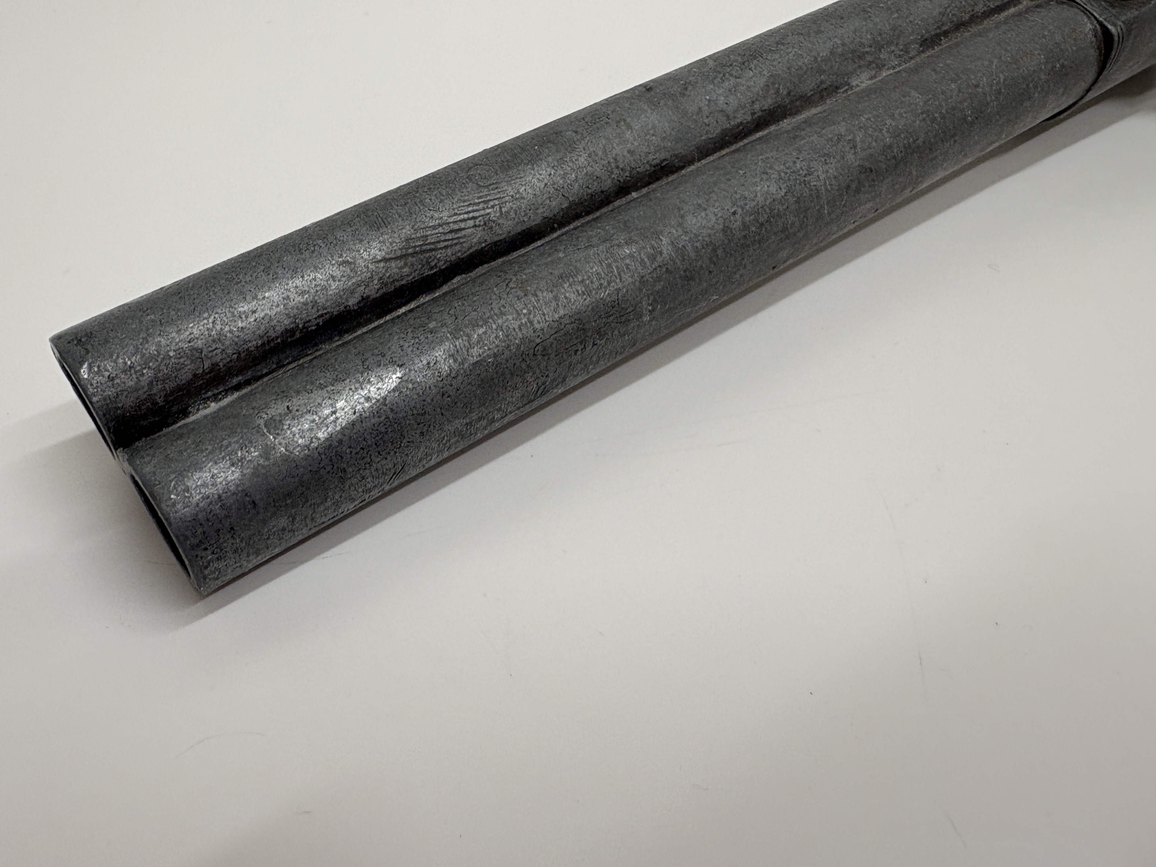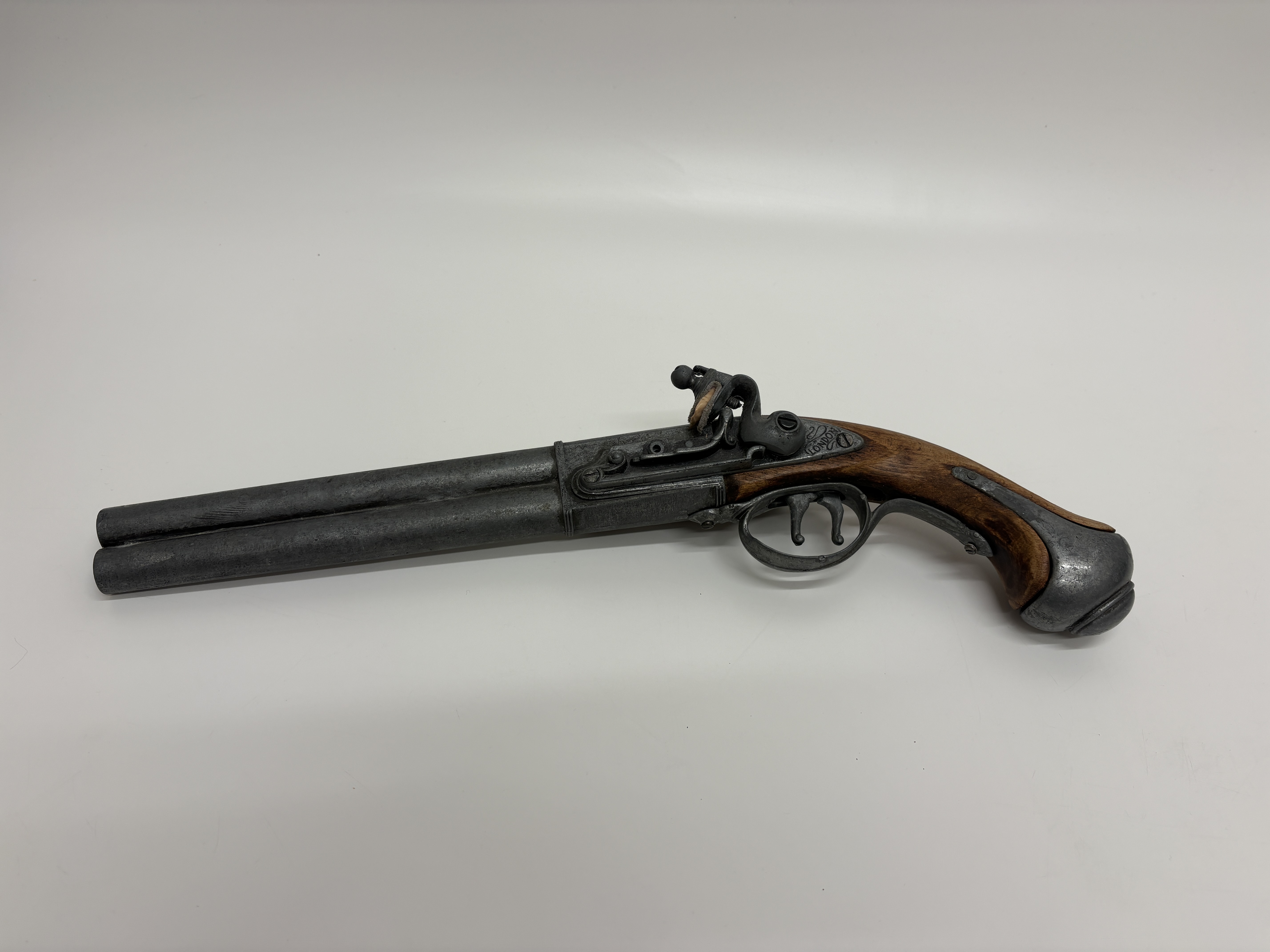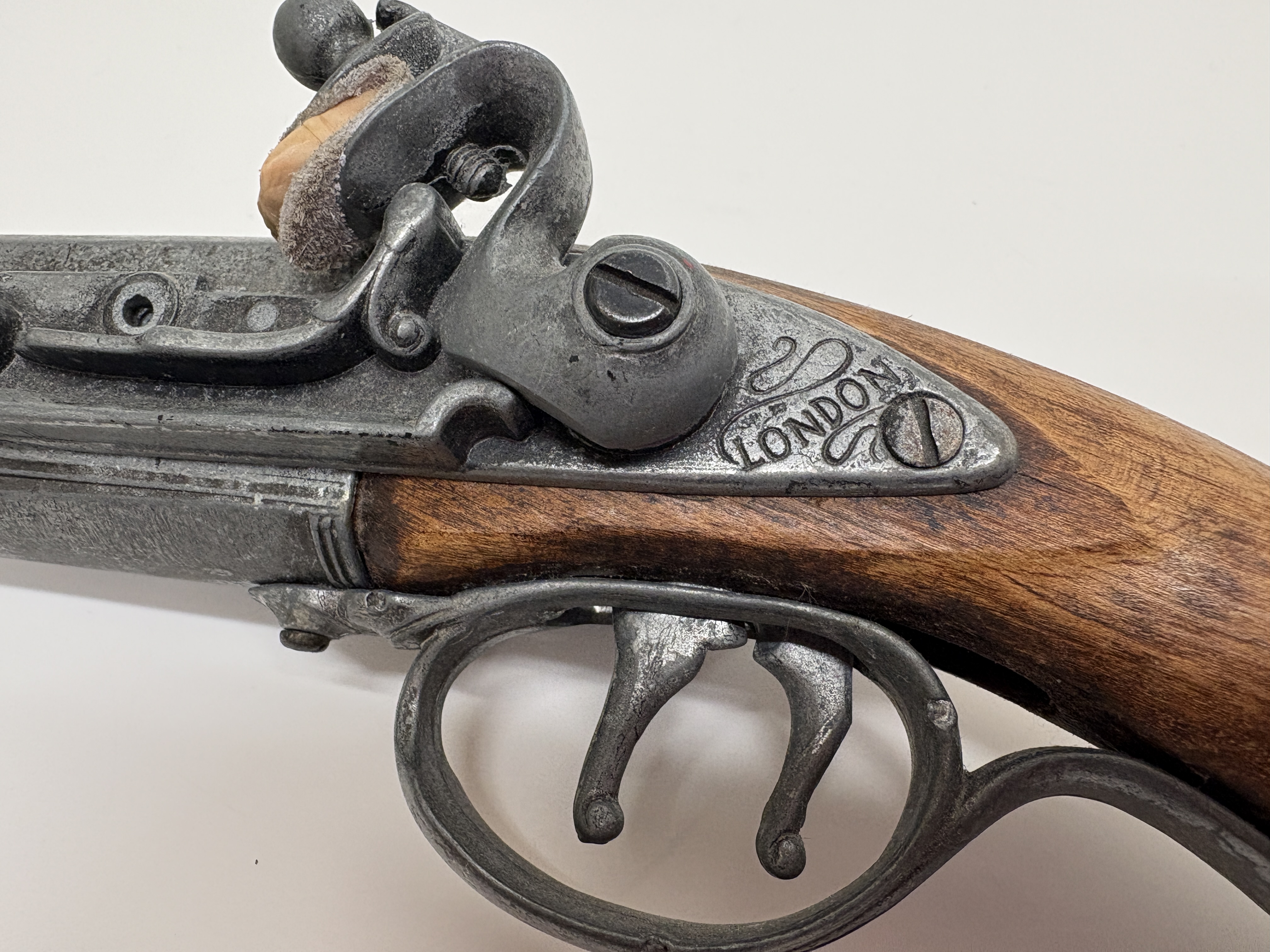 Manufacturer: Denix. Model: Box-lock Coach Pistol. Serial Number: None. Caliber: N/A (Non-firing replica). Action Type: Simulated flintlock box-lock mechanism with dual triggers. Barrel Length: 7 inches. Overall Length: Approximately 12 inches. Stock Material: Hardwood. Proof Marks: None; features decorative LONDON script cast into the frame. Production Date: Contemporary. Parts: All original components. Legal disclaimer: All applicable laws apply to purchase and transfer.