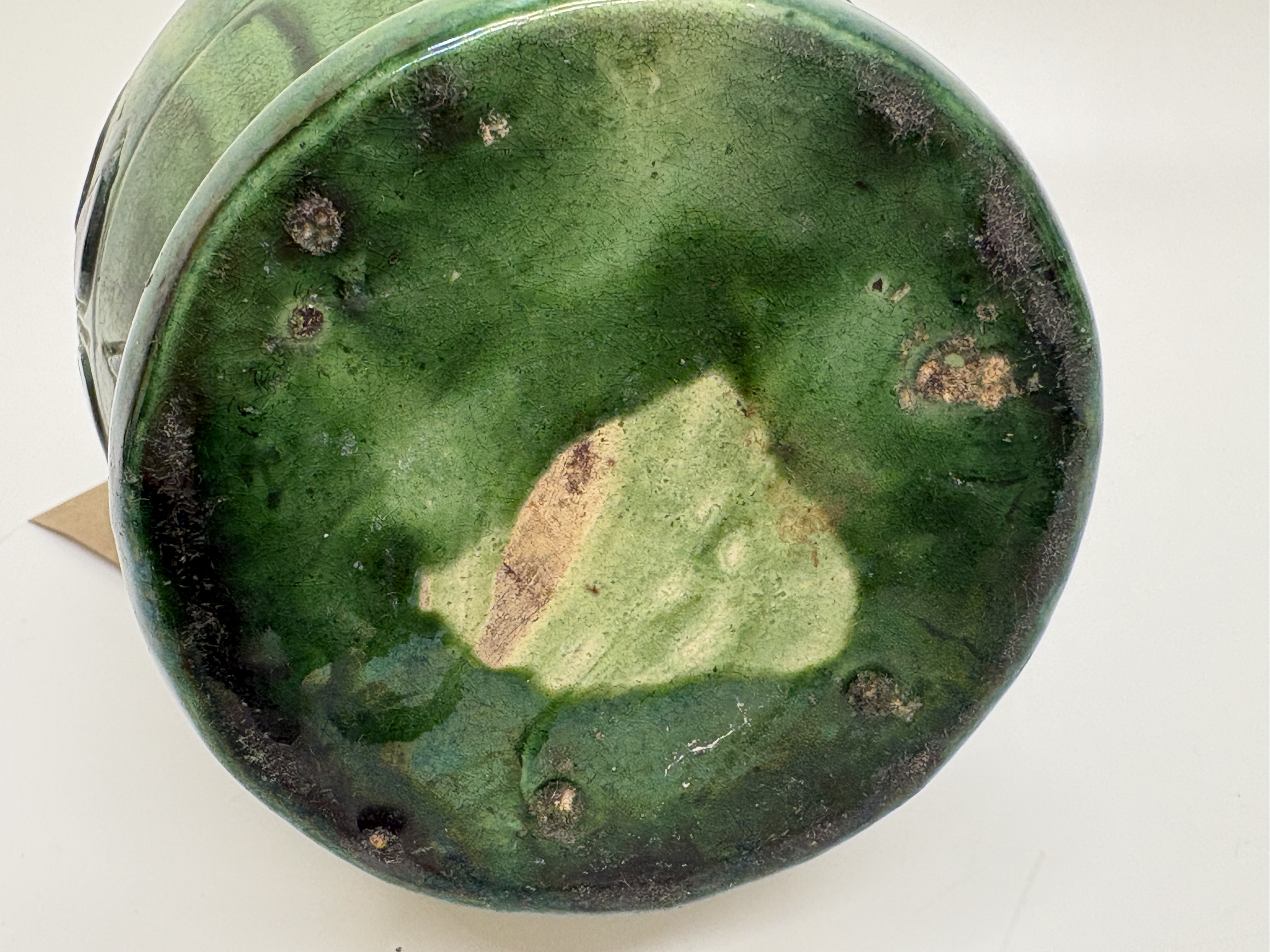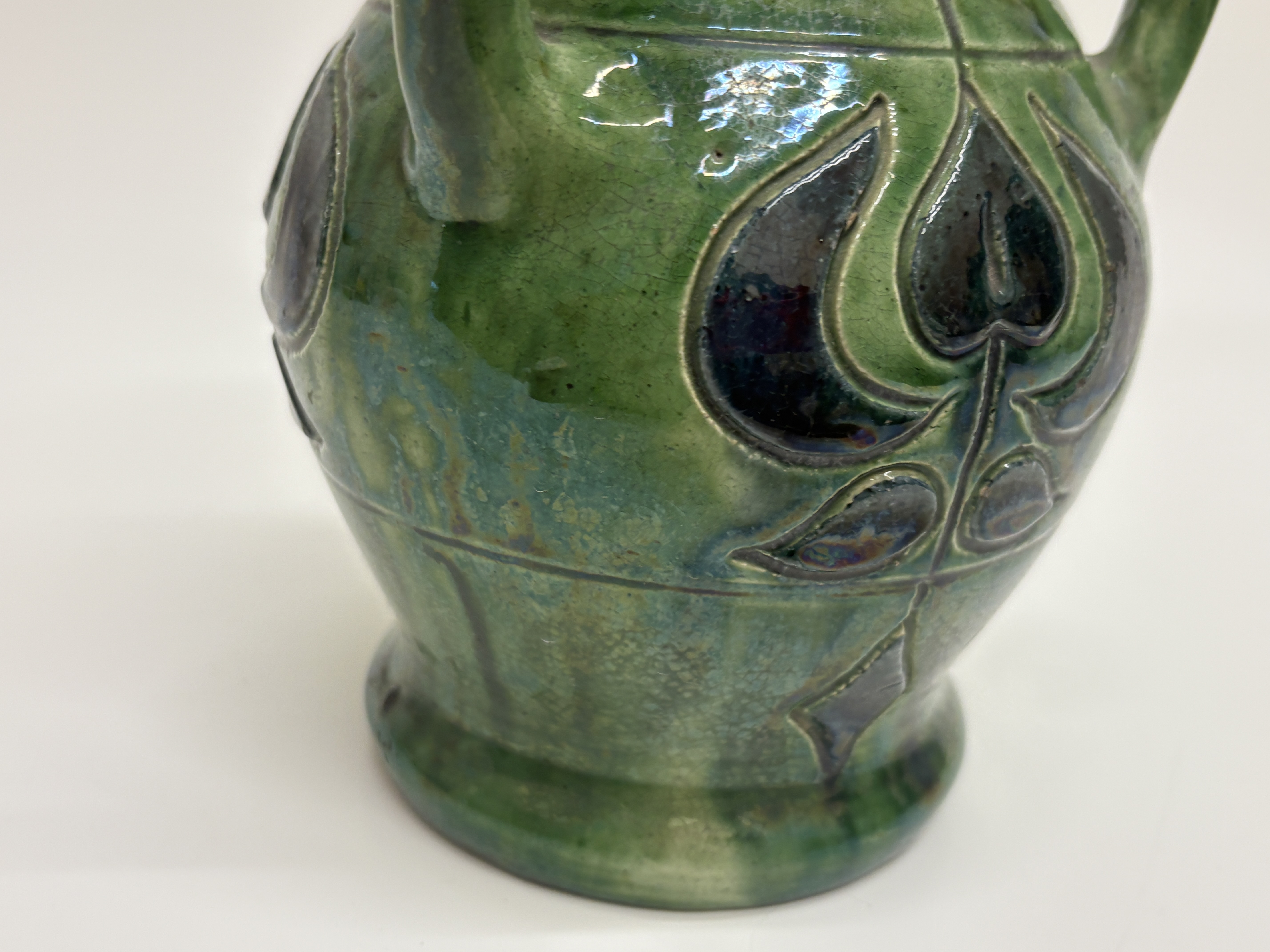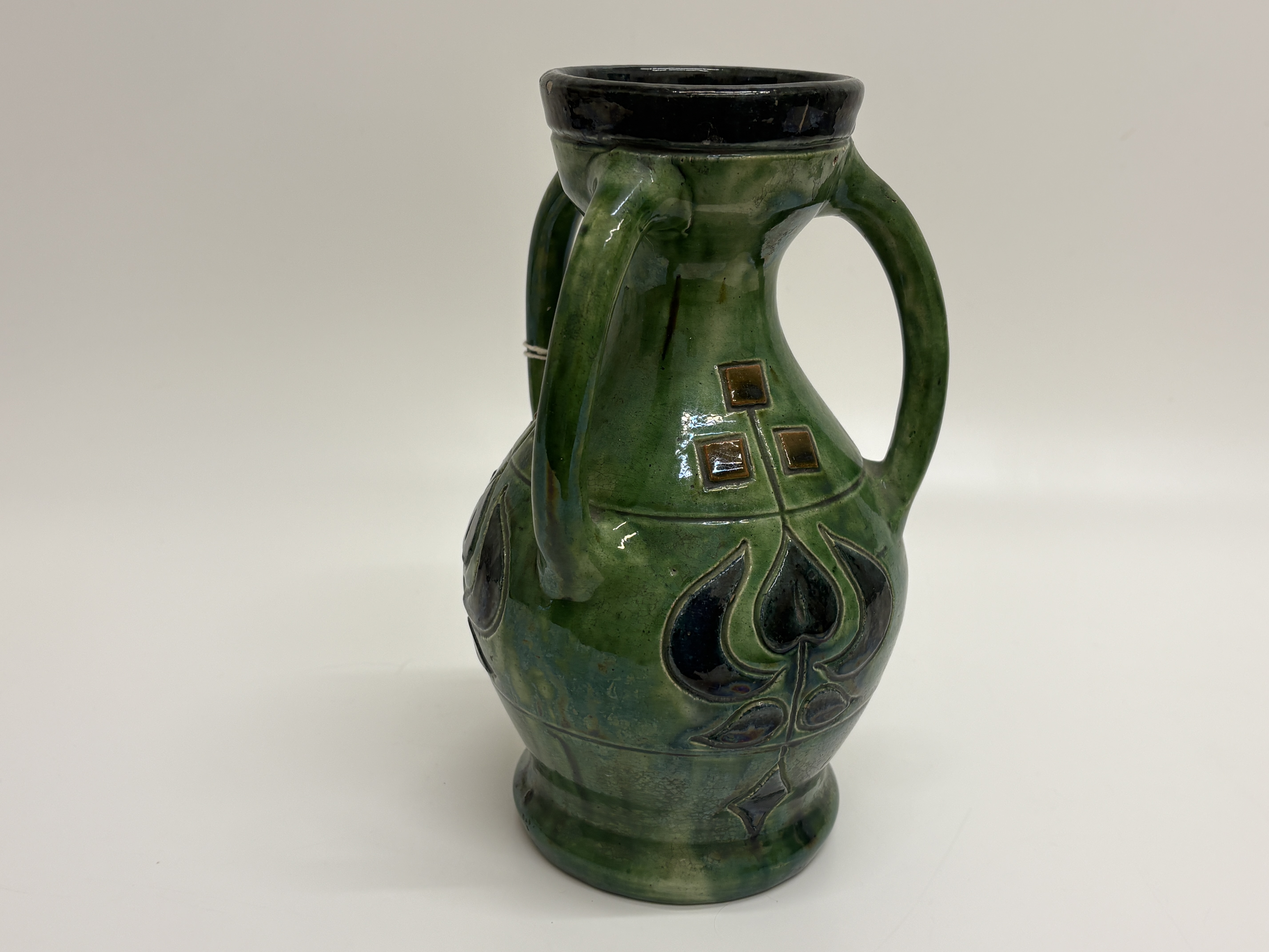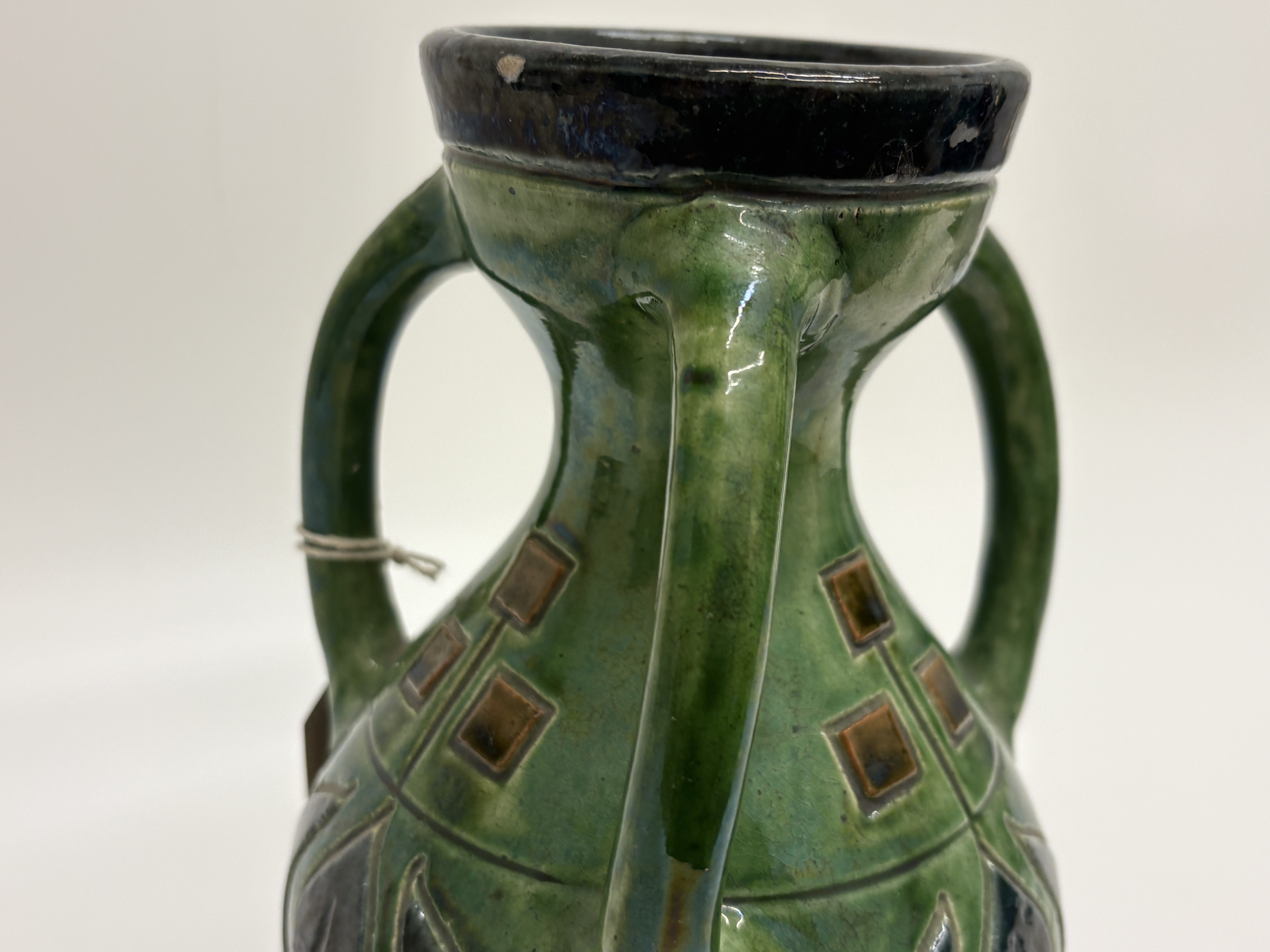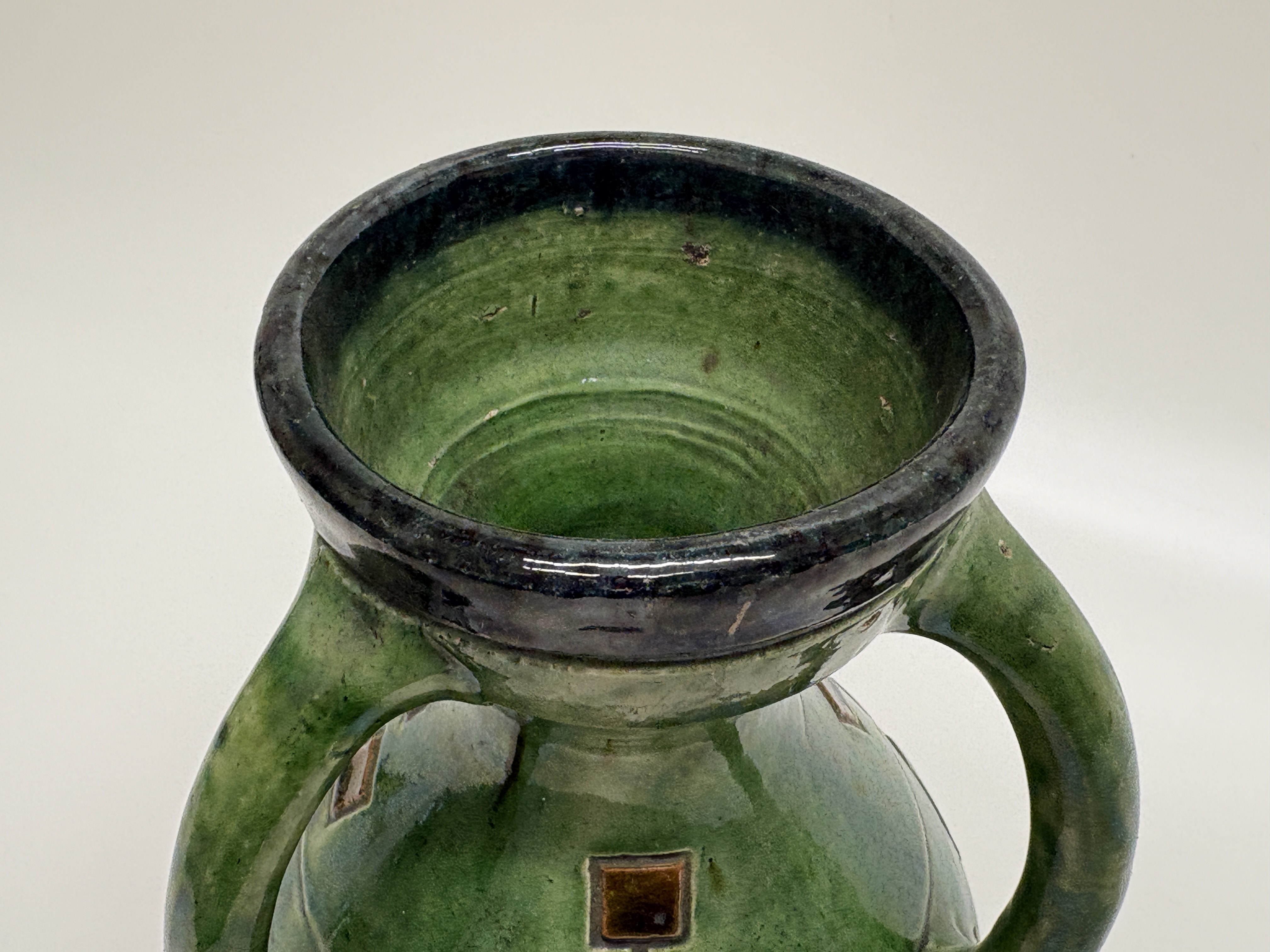 A Belgian earthenware three-handled vase, likely produced by Faiencerie de Thulin. The vessel is finished in a vibrant green drip glaze with dark blue and brown accents, exhibiting a prominent crazed surface and subtle iridescence within the recessed areas. The form features a flared rim with a dark-glazed border, a tapering neck, and three integral handles extending to a bulbous body supported by a flared pedestal base. The exterior is decorated with moulded stylised organic motifs and geometric square patterns in relief, reflecting the Art Nouveau aesthetic of the late 19th to early 20th century. The underside displays an irregular unglazed patch and several kiln-stilt marks, with no visible maker’s marks. Dimensions: Height and width not measured.