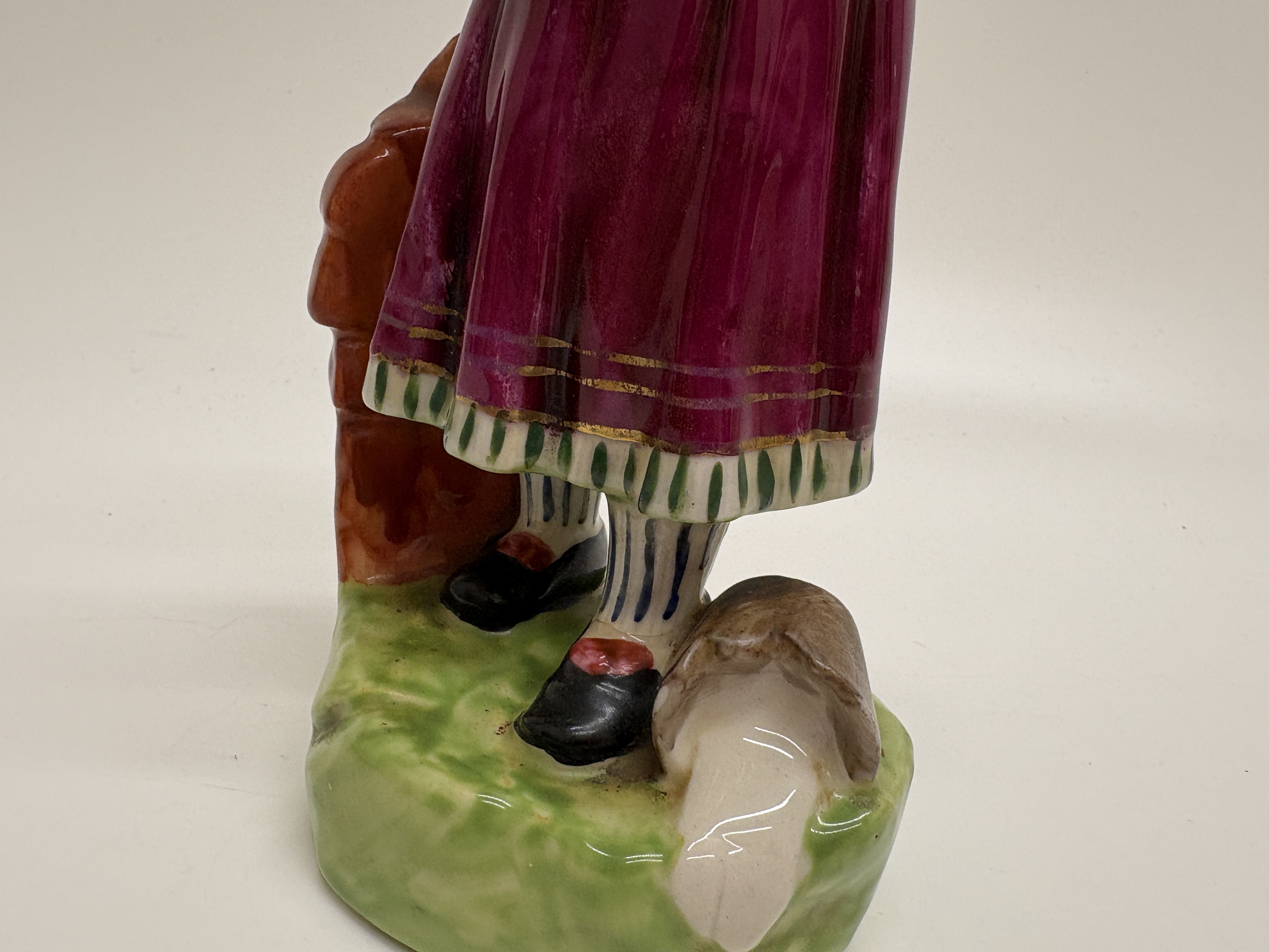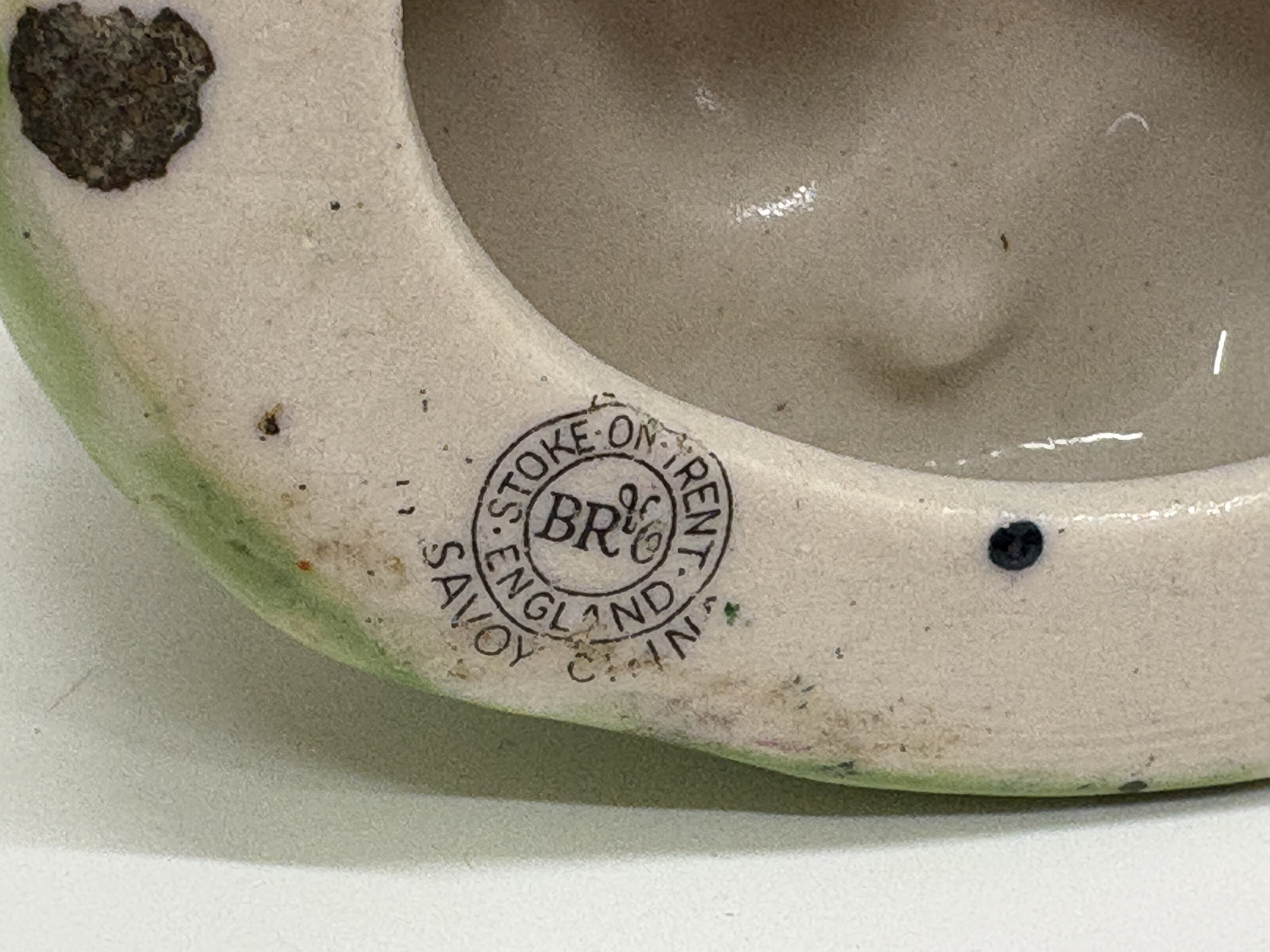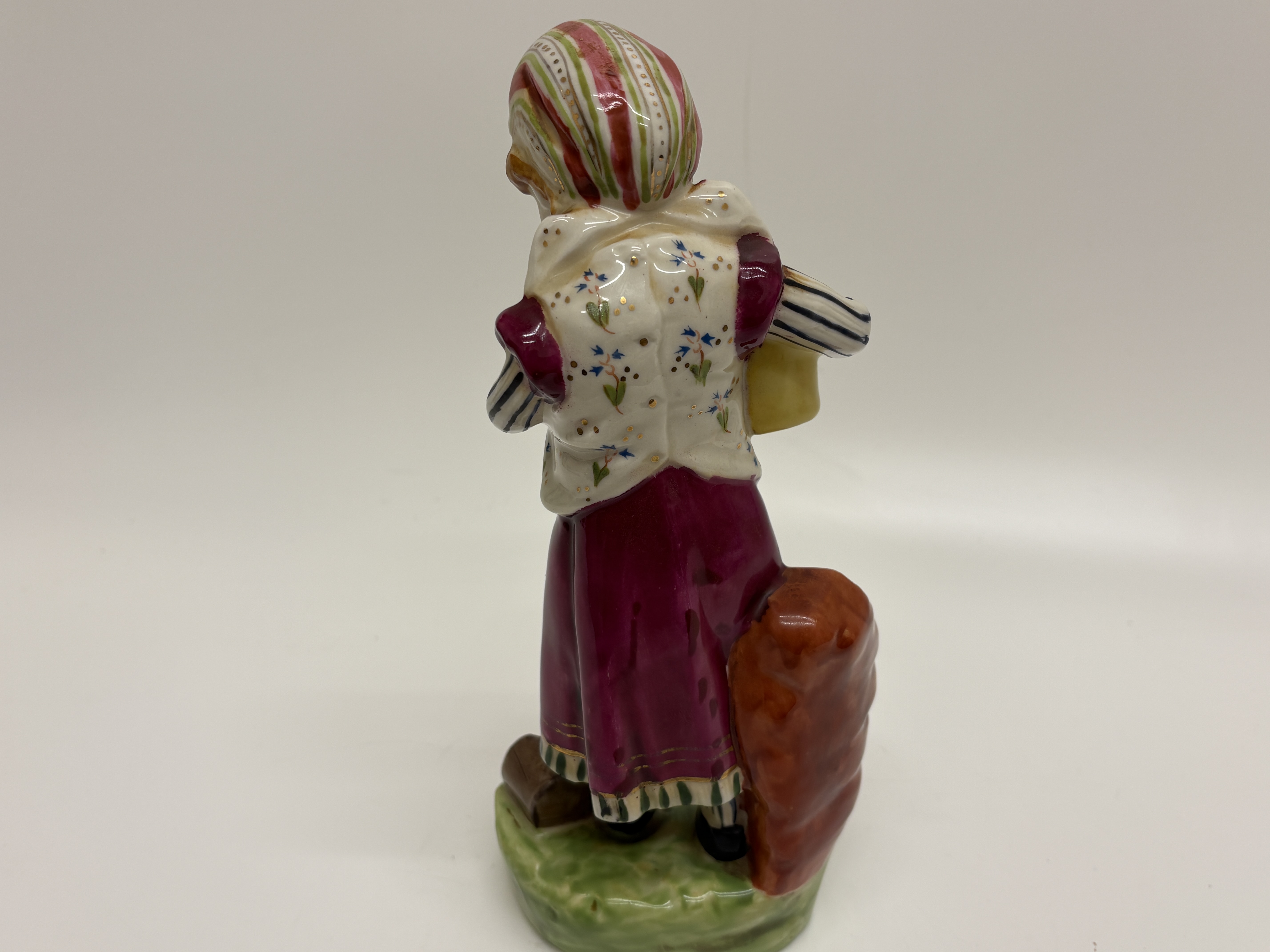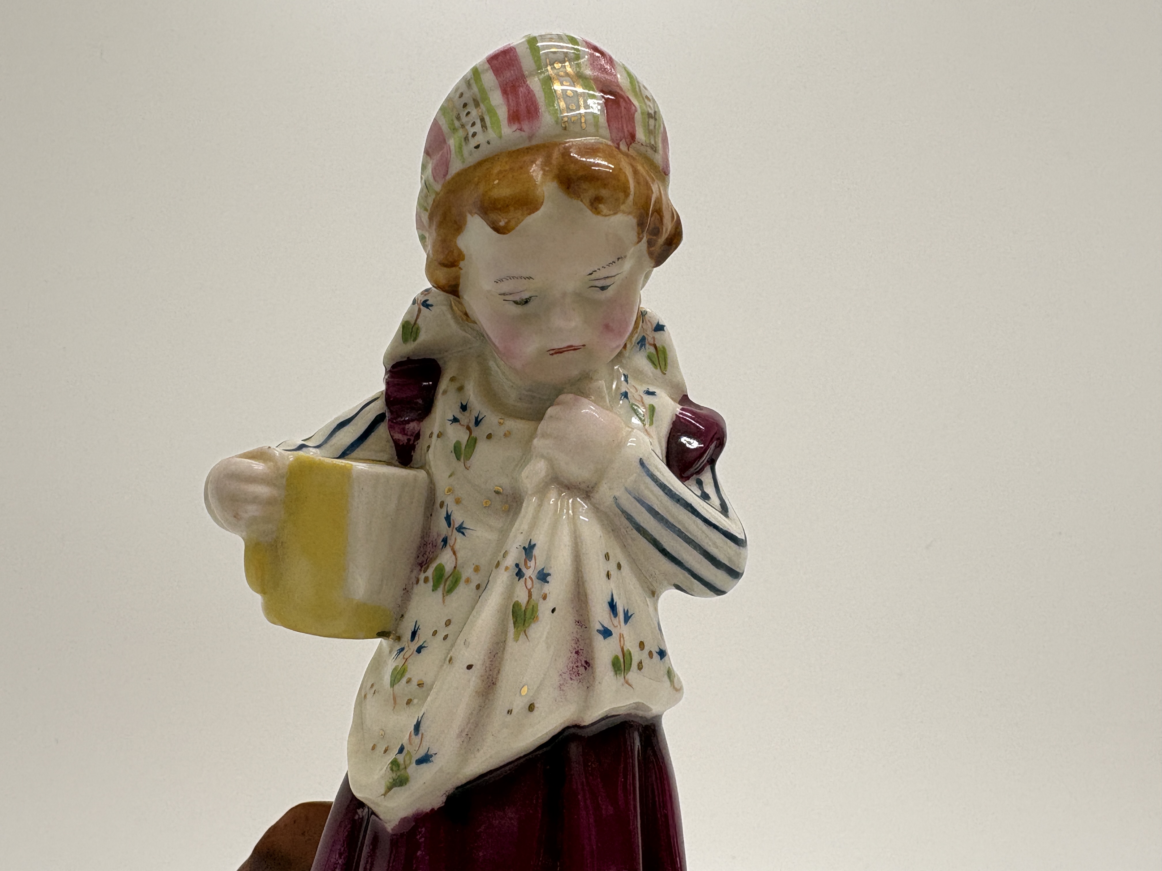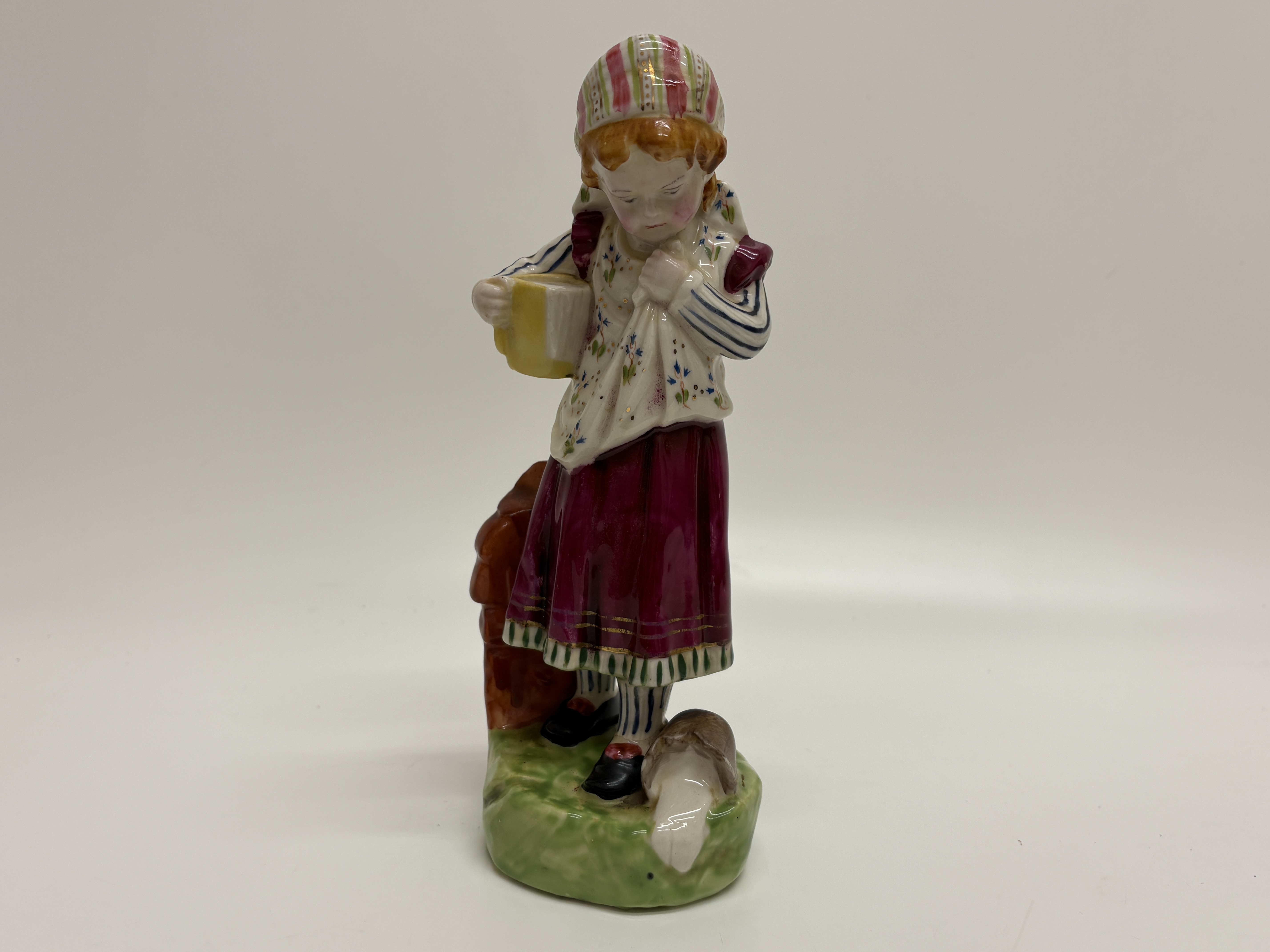 A charming Birks, Rawlins & Co. Savoy China polychrome porcelain figurine depicting a young girl in traditional European folk costume. The figure is shown in a pensive pose, holding a yellow mug or pitcher in her right hand, with her left hand tucked into her bodice. She wears a striped bonnet, a floral-patterned vest over a blue and white striped blouse, and a long magenta skirt with a decorative green and gold border. The figure stands on a grassy base beside a large sculpted mushroom and a low textured wall. The underside features a circular black transfer-printed factory mark for Birks, Rawlins & Co. (BR & Co.), Stoke-on-Trent, England, with the trade name SAVOY CHINA. An underglaze blue dot decorator mark is present on the unglazed foot rim. Height 14cm.