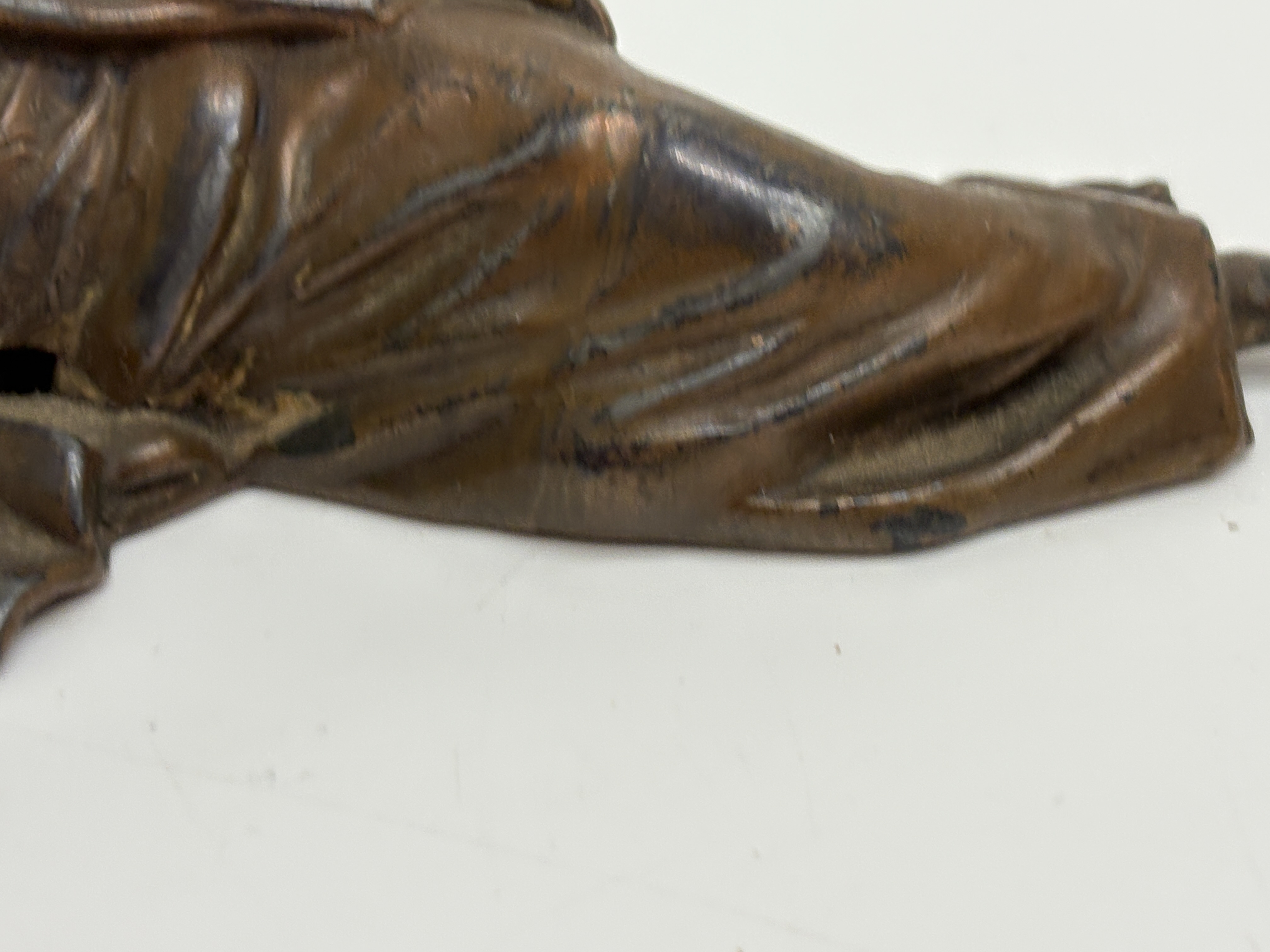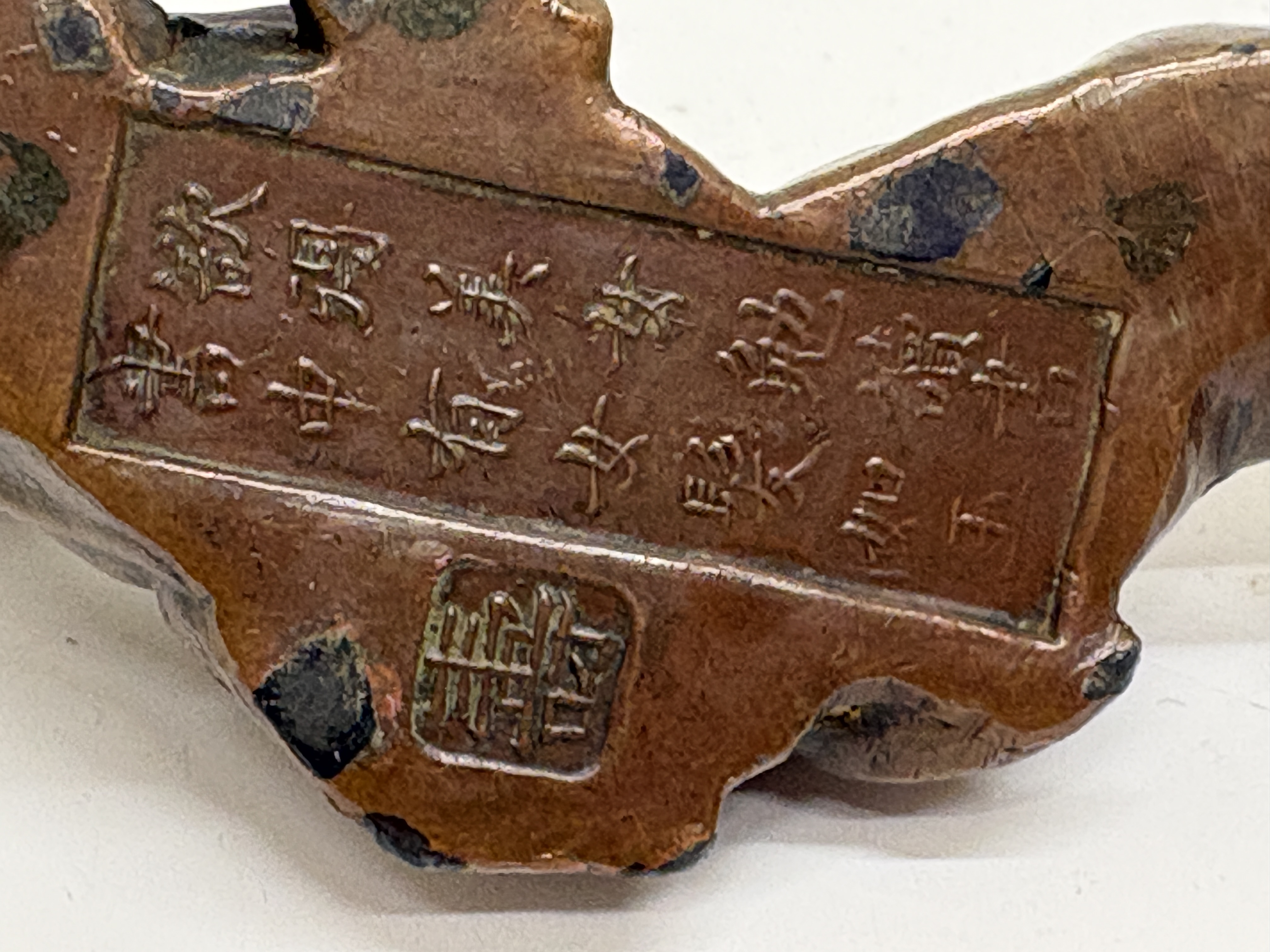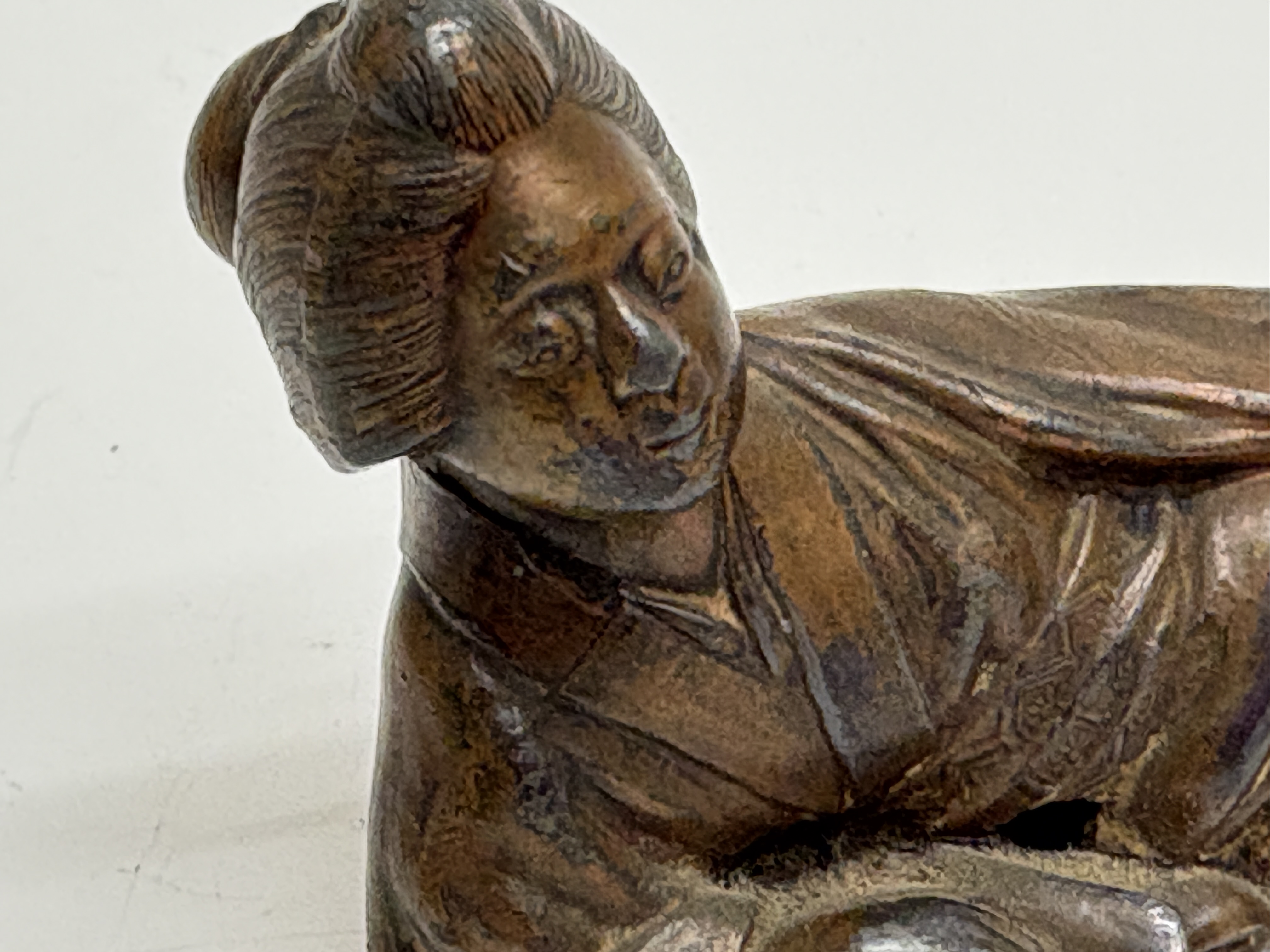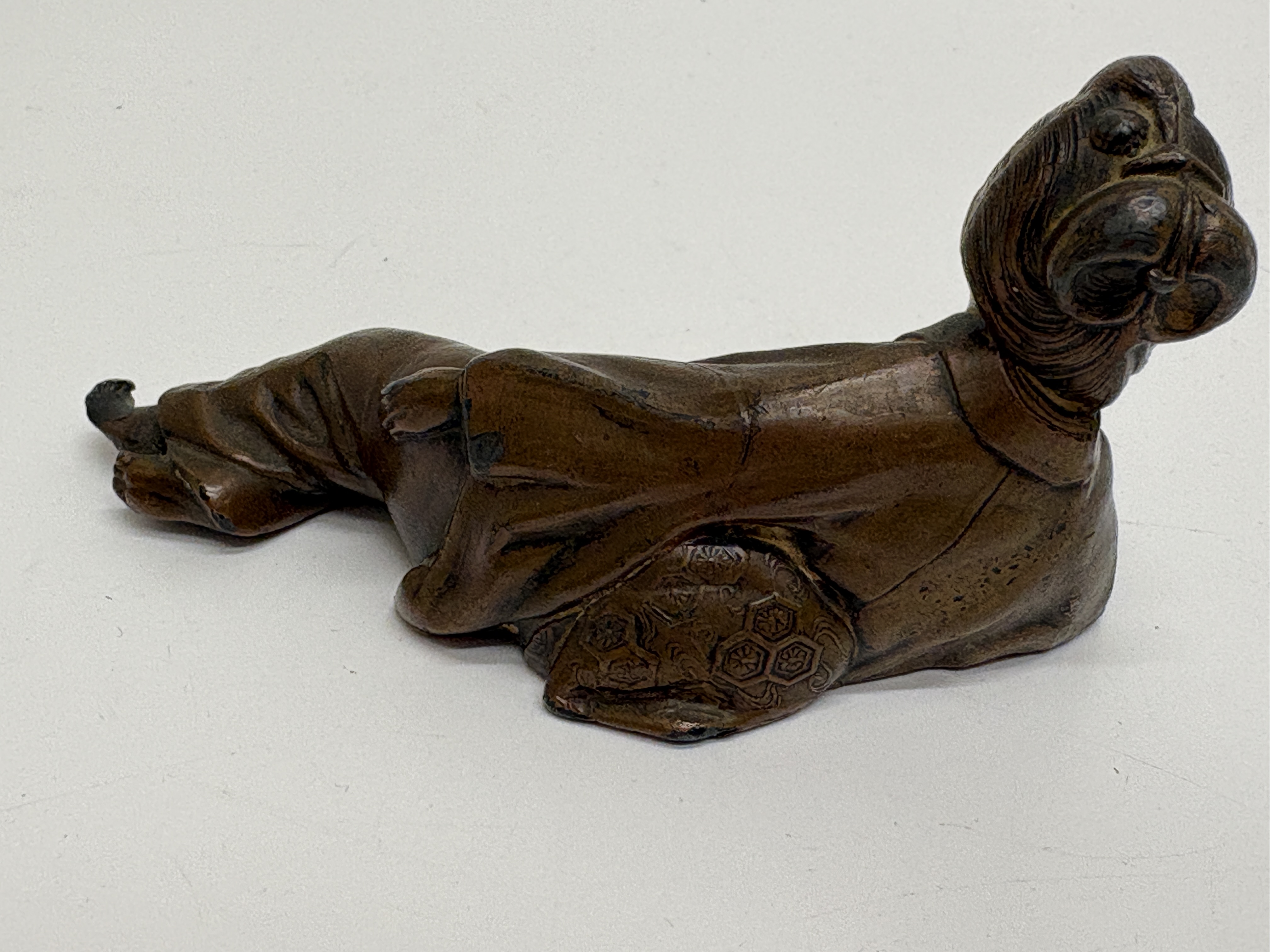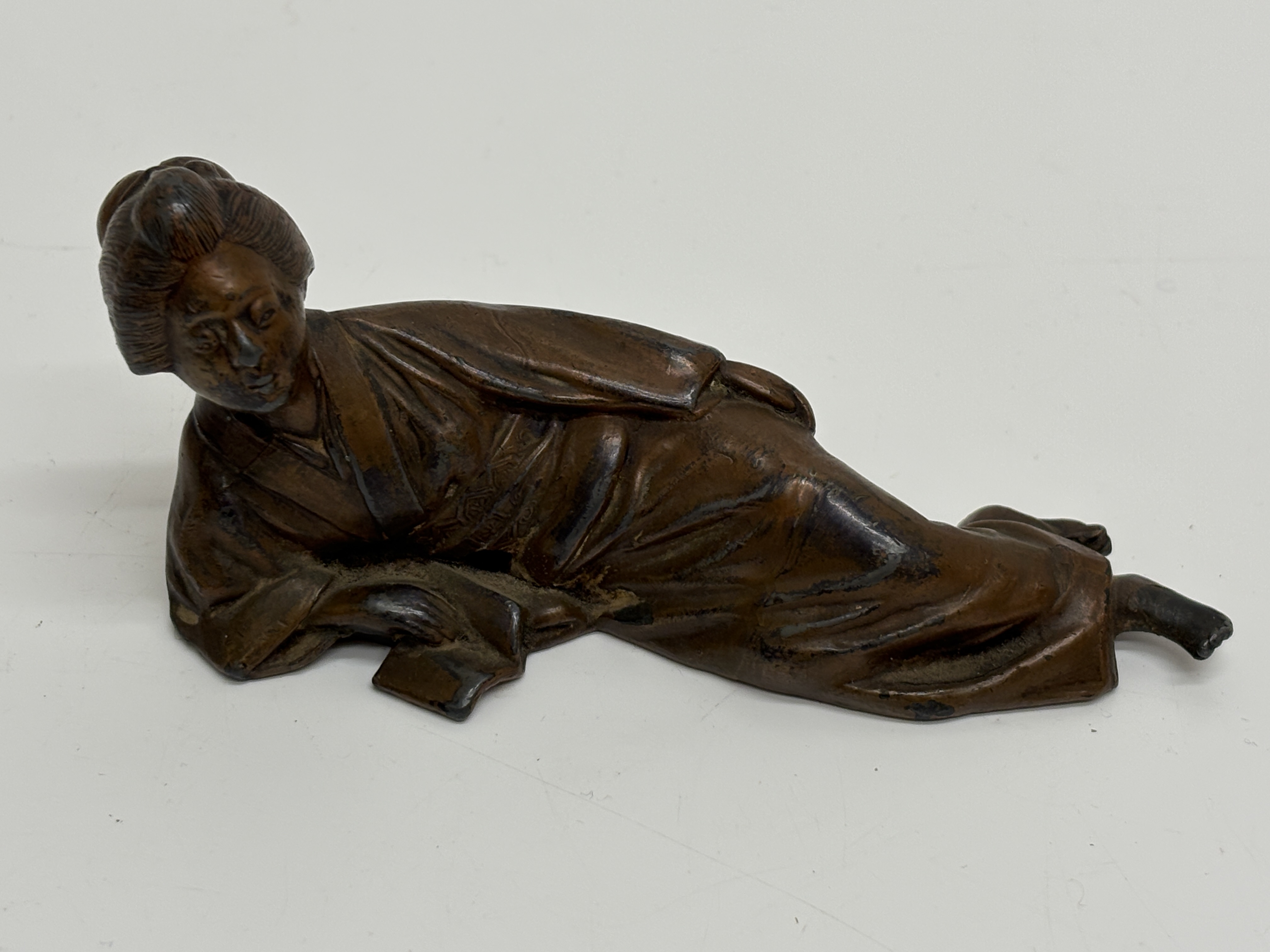 A cast copper alloy okimono or paperweight depicting a reclining bijin (beautiful woman). The figure is portrayed in a relaxed pose, dressed in a traditional kimono decorated with finely incised floral and geometric patterns, including hexagonal motifs. Her hair is arranged in an elaborate traditional coiffure. The bronze is finished with a deep reddish-brown patina. The underside features a cast rectangular cartouche containing a two-line Chinese inscription from a famous Song Dynasty poem regarding the rewards of academic pursuit: Within books, there are houses of gold; within books, there are beauties like jade (Shu zhong zi you huang jin wu; shu zhong zi you yan ru yu). A square workshop seal mark is positioned below the inscription. This piece represents the cross-cultural exchange of literati values between Japan and China during the late Meiji and Taisho periods. Dimensions: Length approx. 12 cm; Weight approx. 350 g. (Note: Scale estimated as no physical measurements were provided).