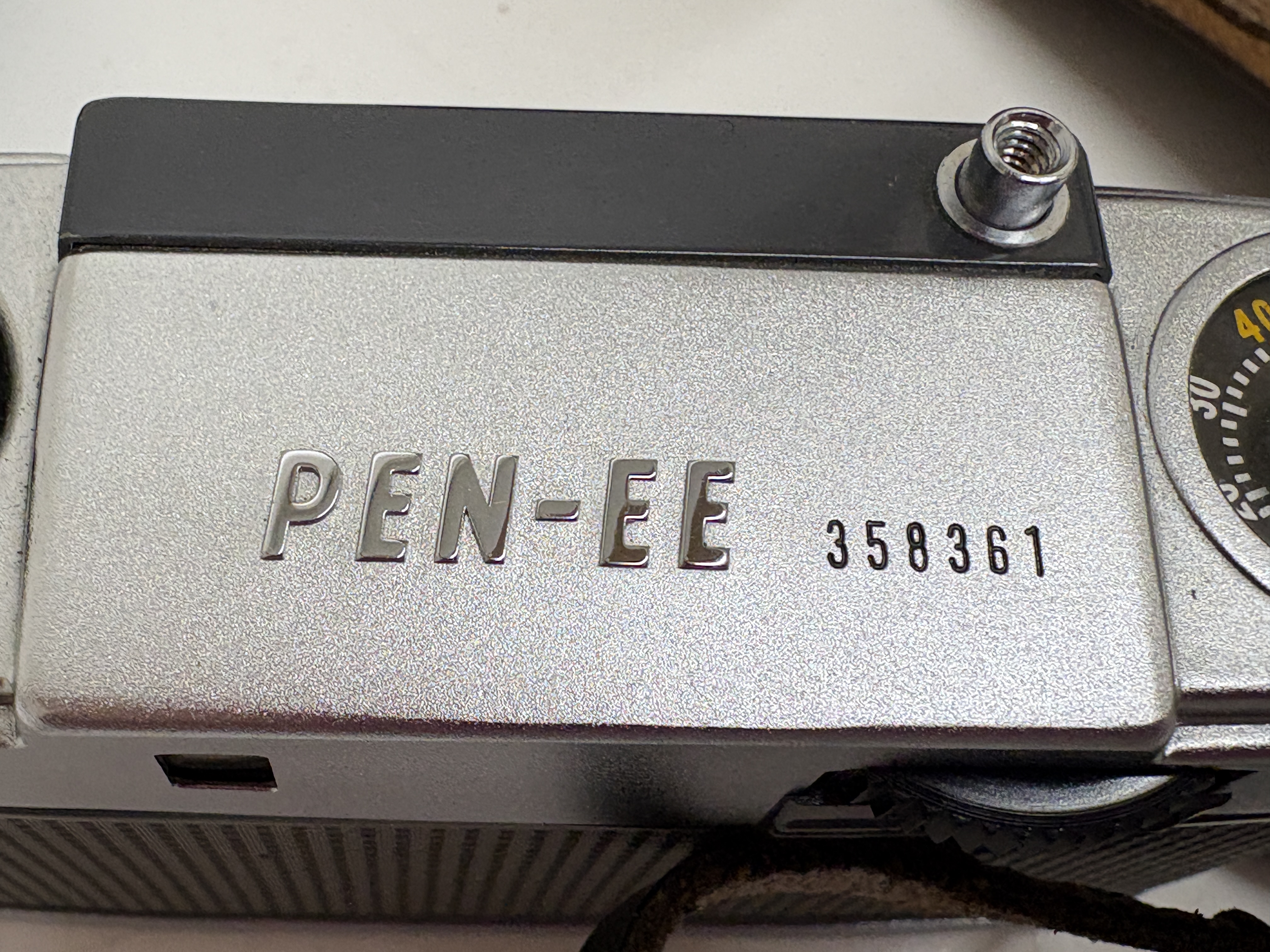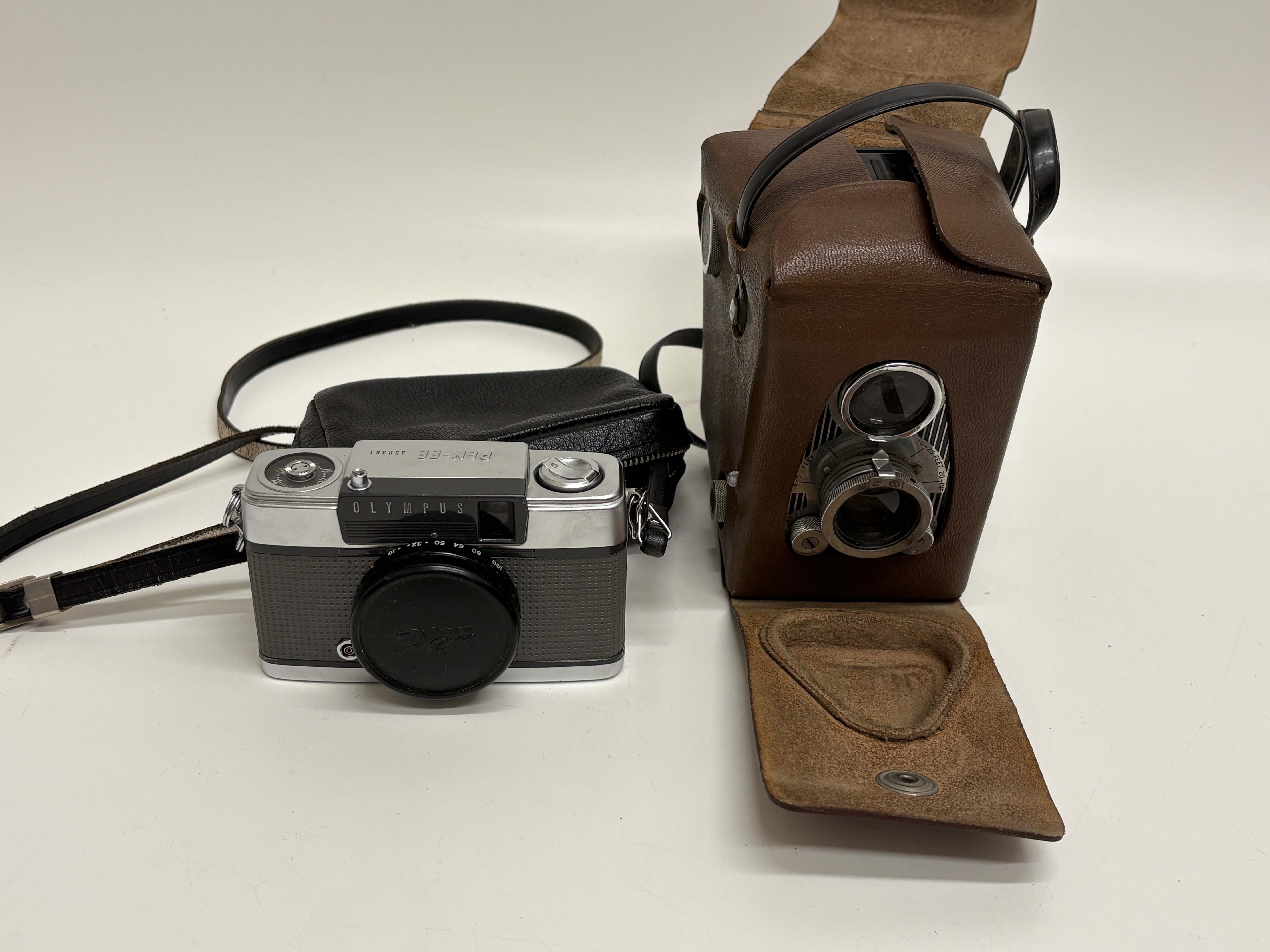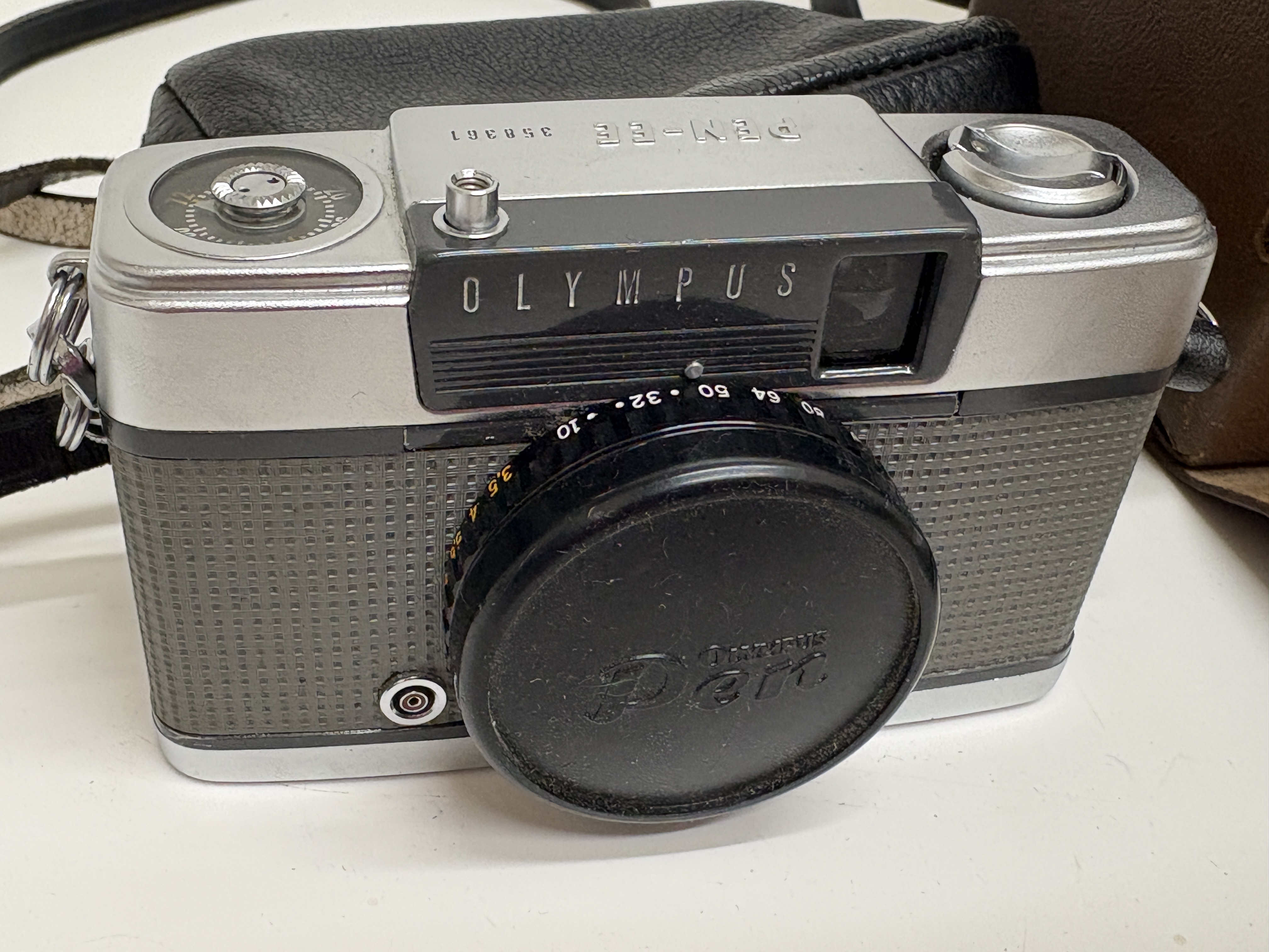 This lot features two vintage cameras. The first is an Olympus Pen-EE 35mm half-frame camera, serial number 358361, produced circa 1961-1966. It is equipped with a fixed Olympus 2.8cm f/3.5 lens and is designed to produce 72 exposures on a standard 36-exposure roll. The body is constructed with metal plates and a grey textured synthetic wrap. Accessories include a branded Olympus Pen plastic lens cap, an SL 39.3C (UV) 22.5mm screw-in filter, a black pebble-grain soft zippered carrying case, and a black leather neck strap. The second item is a Craftsman pseudo-TLR box camera, manufactured for Sears, Roebuck & Co. during the mid-20th century. This medium format camera features a dual-lens design with a brilliant viewfinder and zone focusing increments. The body is finished in a black crinkle-paint metal and is accompanied by its original brown leather ever-ready carrying case and strap.