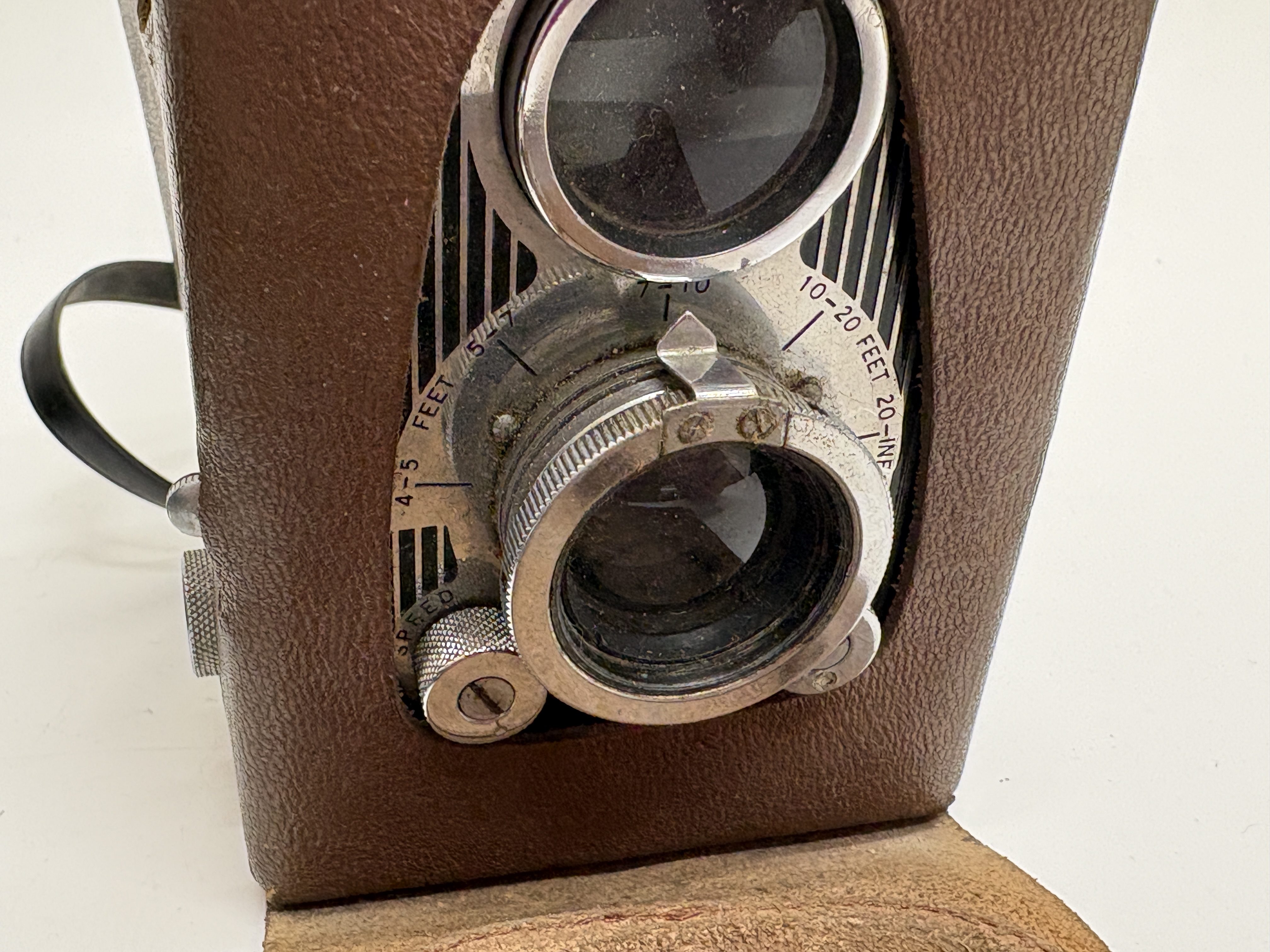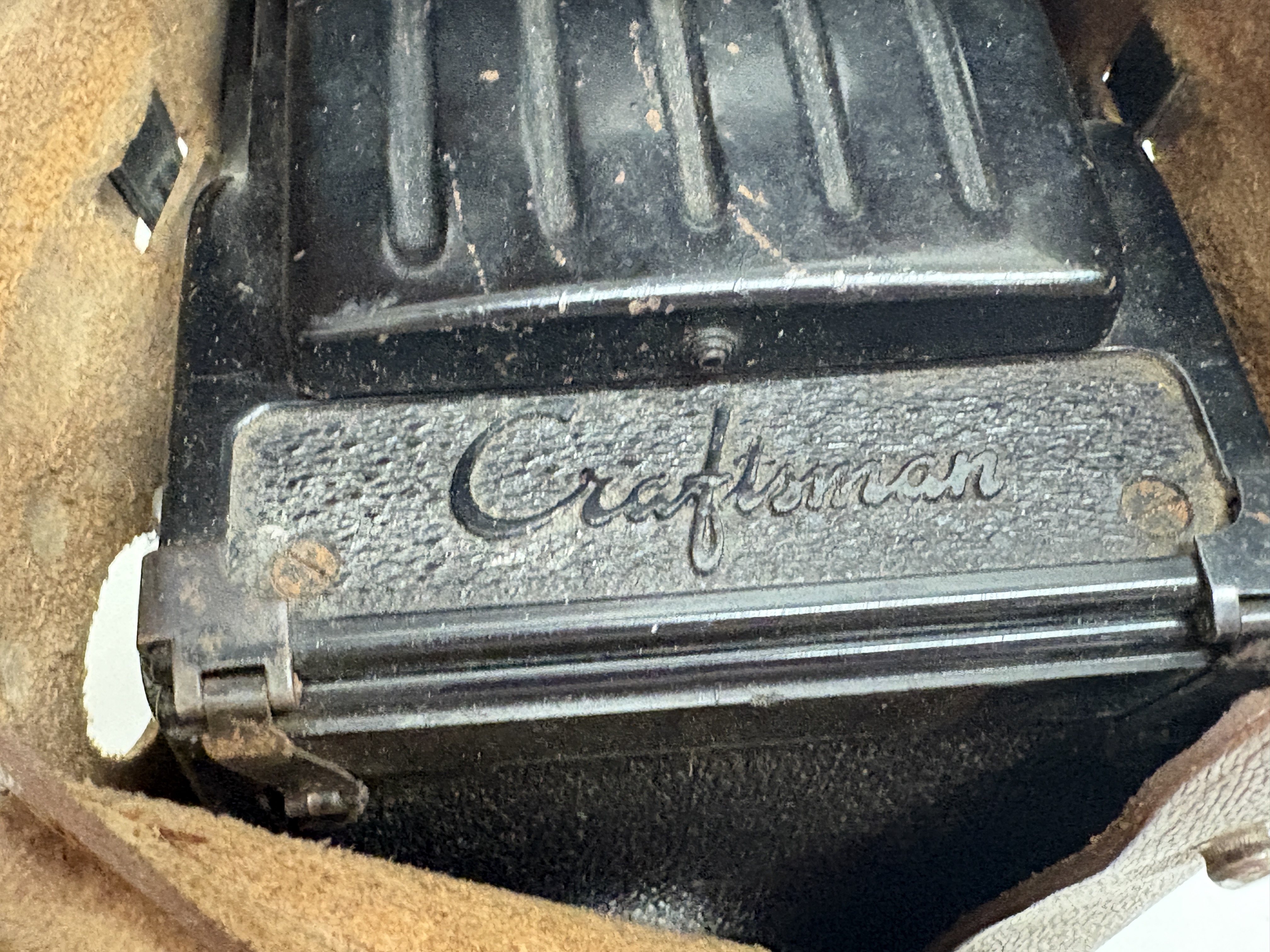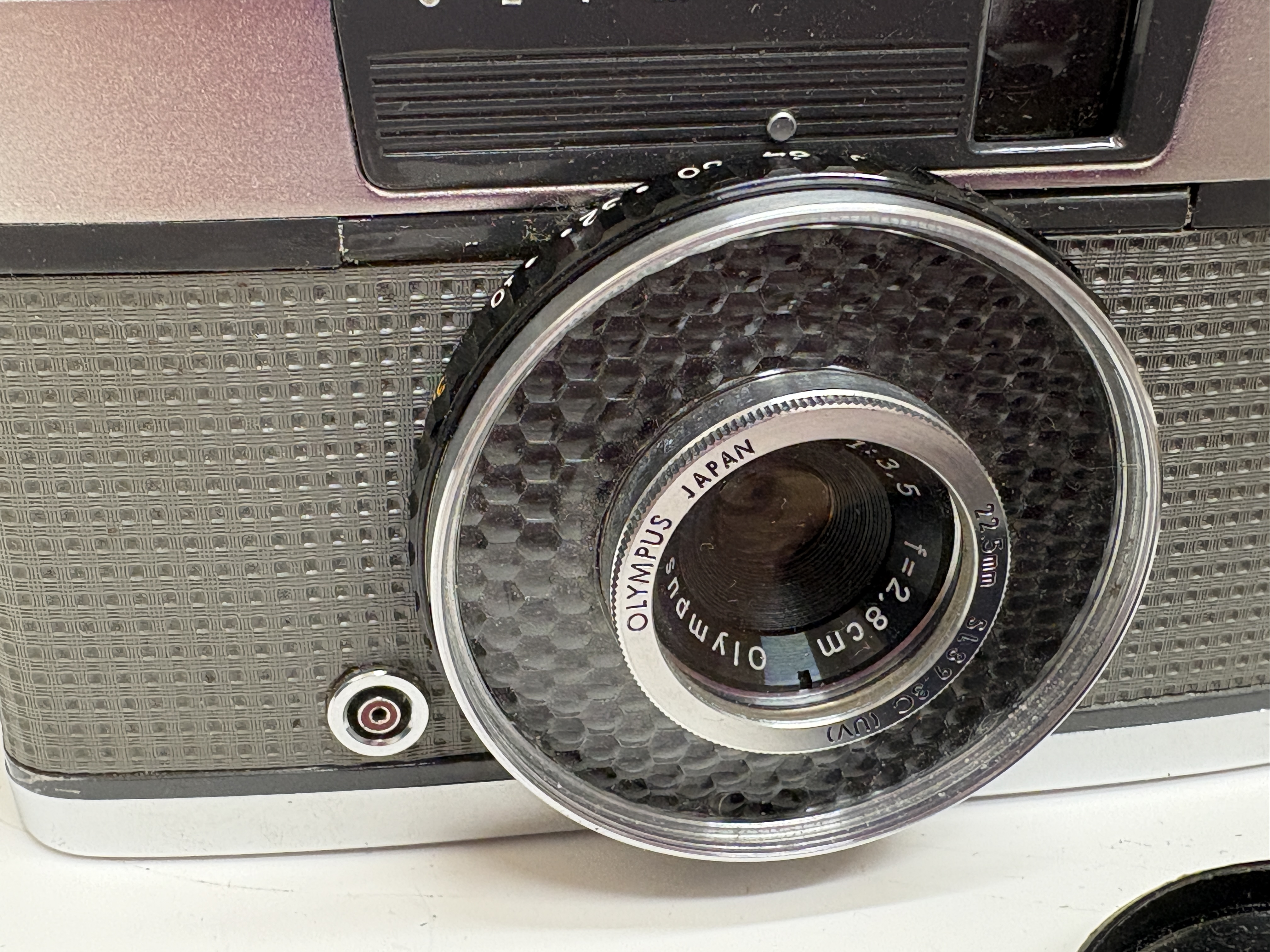 This lot features two vintage cameras. The first is an Olympus Pen-EE 35mm half-frame camera, serial number 358361, produced circa 1961-1966. It is equipped with a fixed Olympus 2.8cm f/3.5 lens and is designed to produce 72 exposures on a standard 36-exposure roll. The body is constructed with metal plates and a grey textured synthetic wrap. Accessories include a branded Olympus Pen plastic lens cap, an SL 39.3C (UV) 22.5mm screw-in filter, a black pebble-grain soft zippered carrying case, and a black leather neck strap. The second item is a Craftsman pseudo-TLR box camera, manufactured for Sears, Roebuck & Co. during the mid-20th century. This medium format camera features a dual-lens design with a brilliant viewfinder and zone focusing increments. The body is finished in a black crinkle-paint metal and is accompanied by its original brown leather ever-ready carrying case and strap.