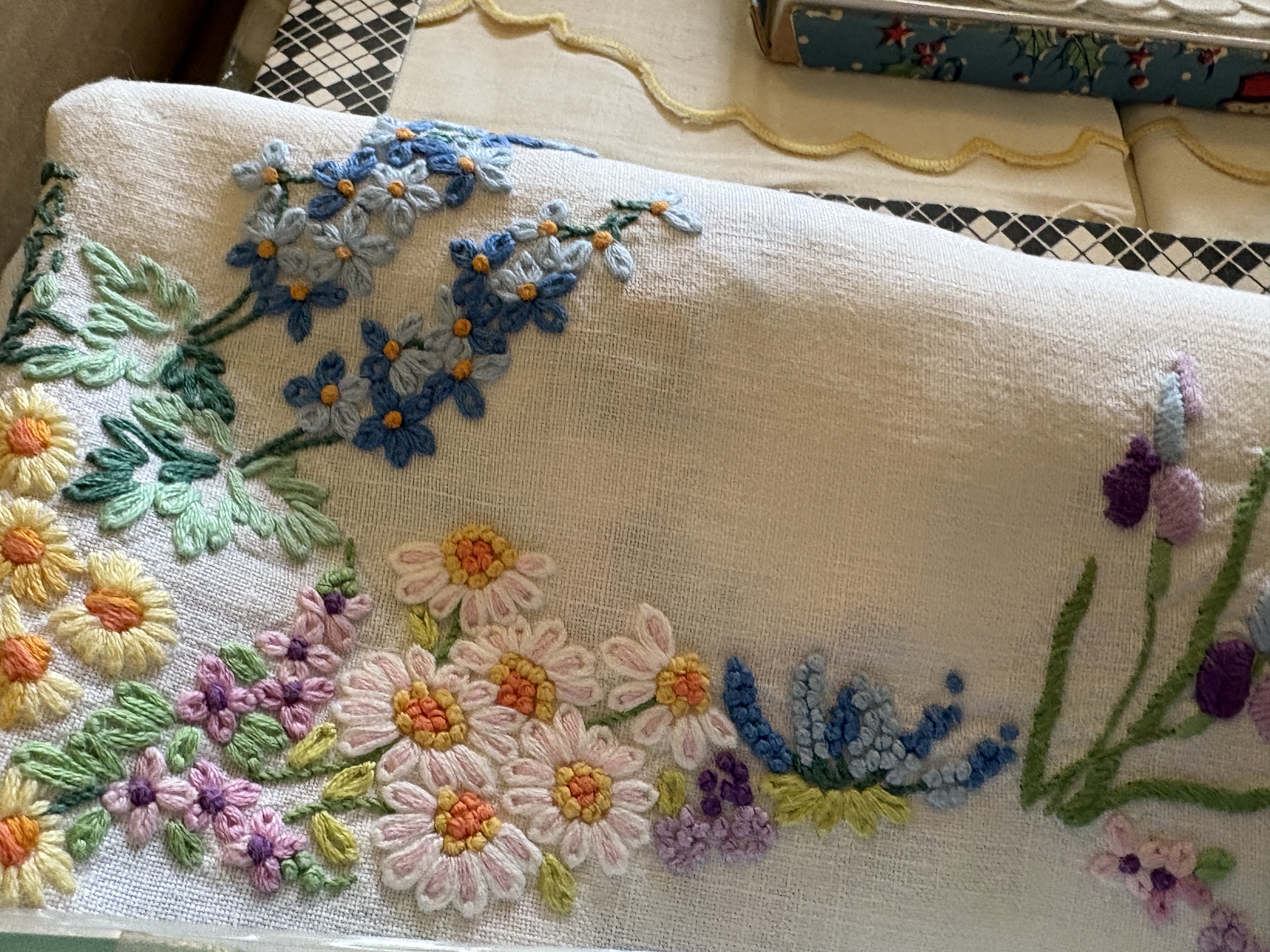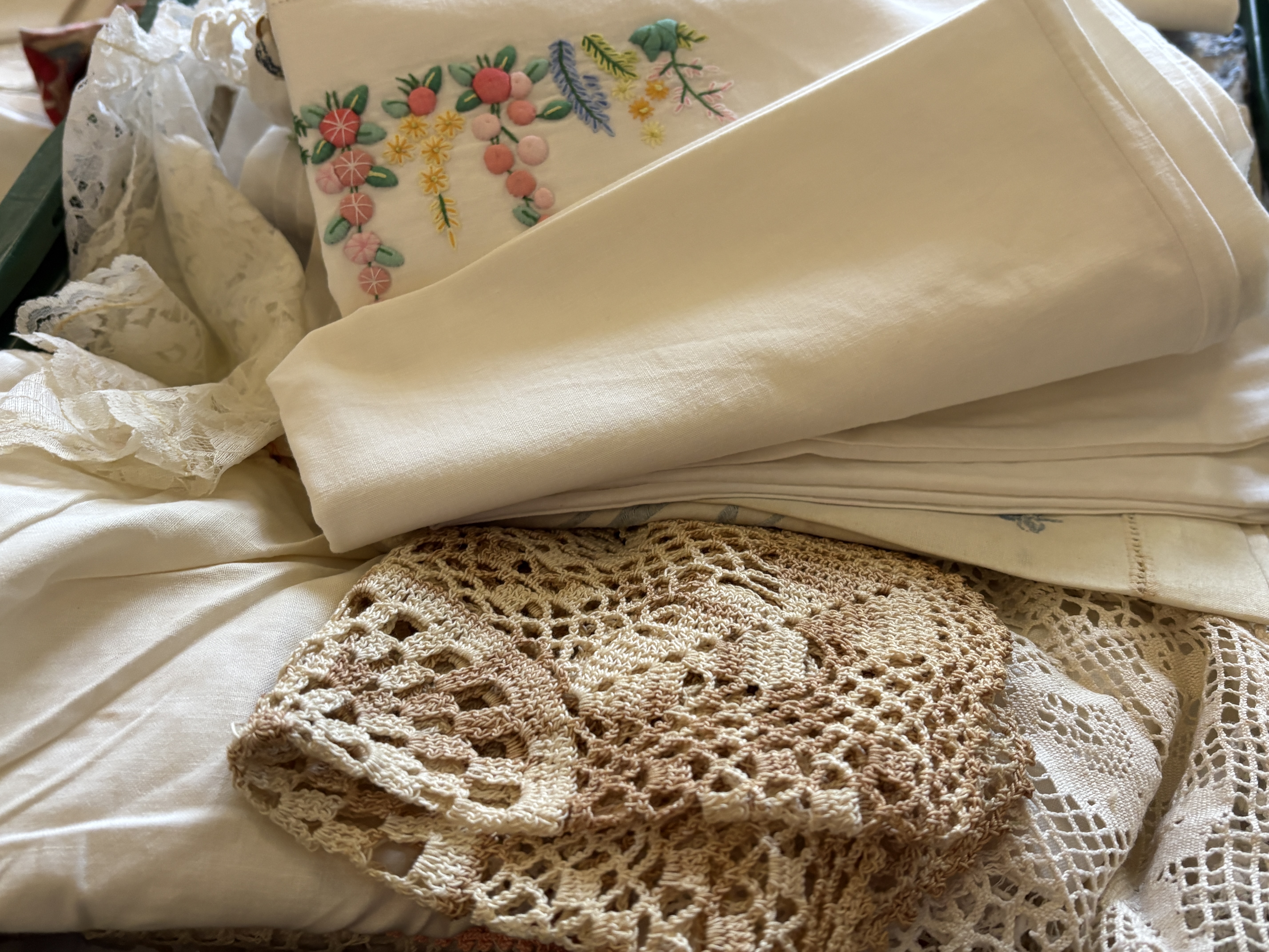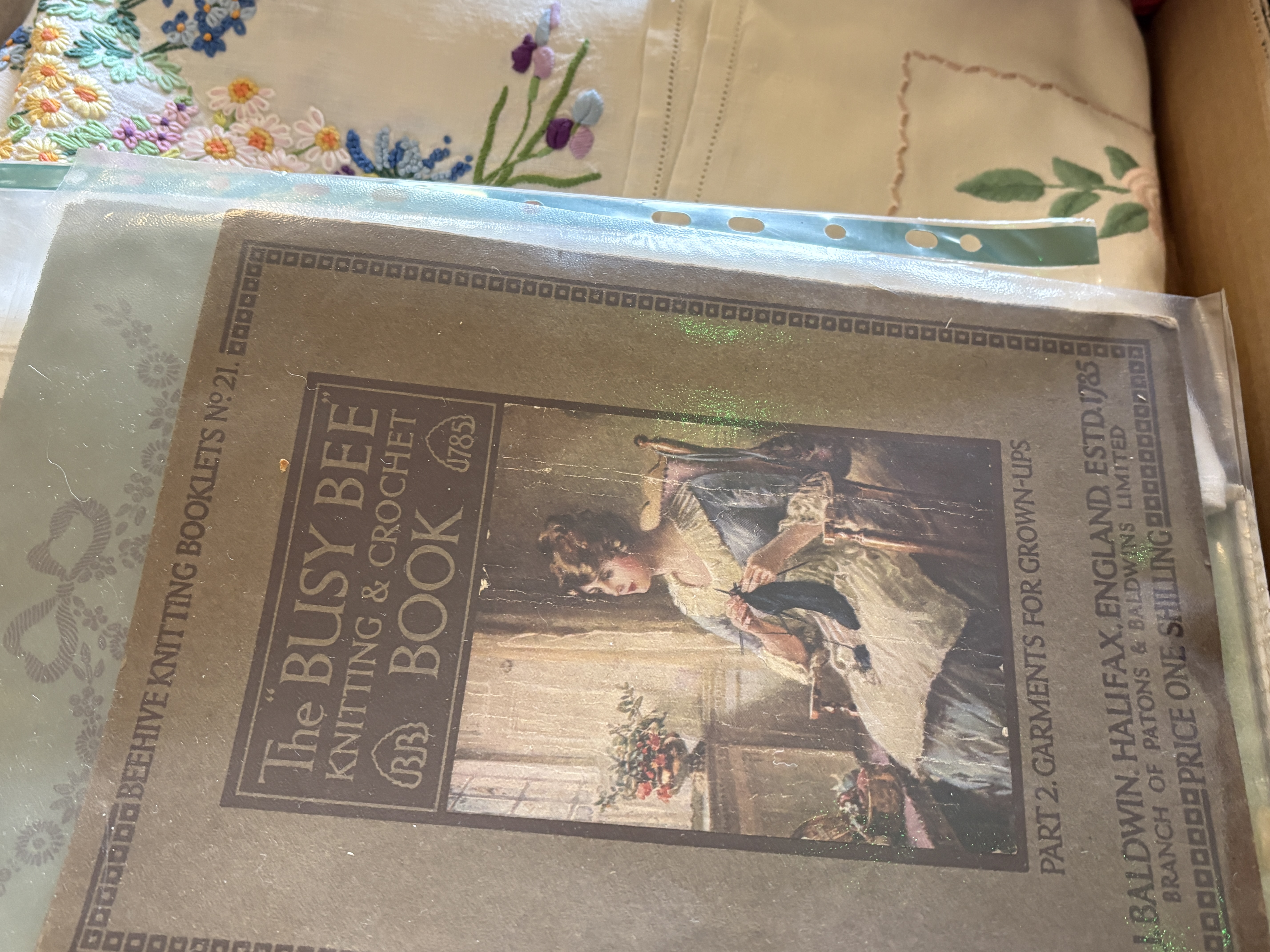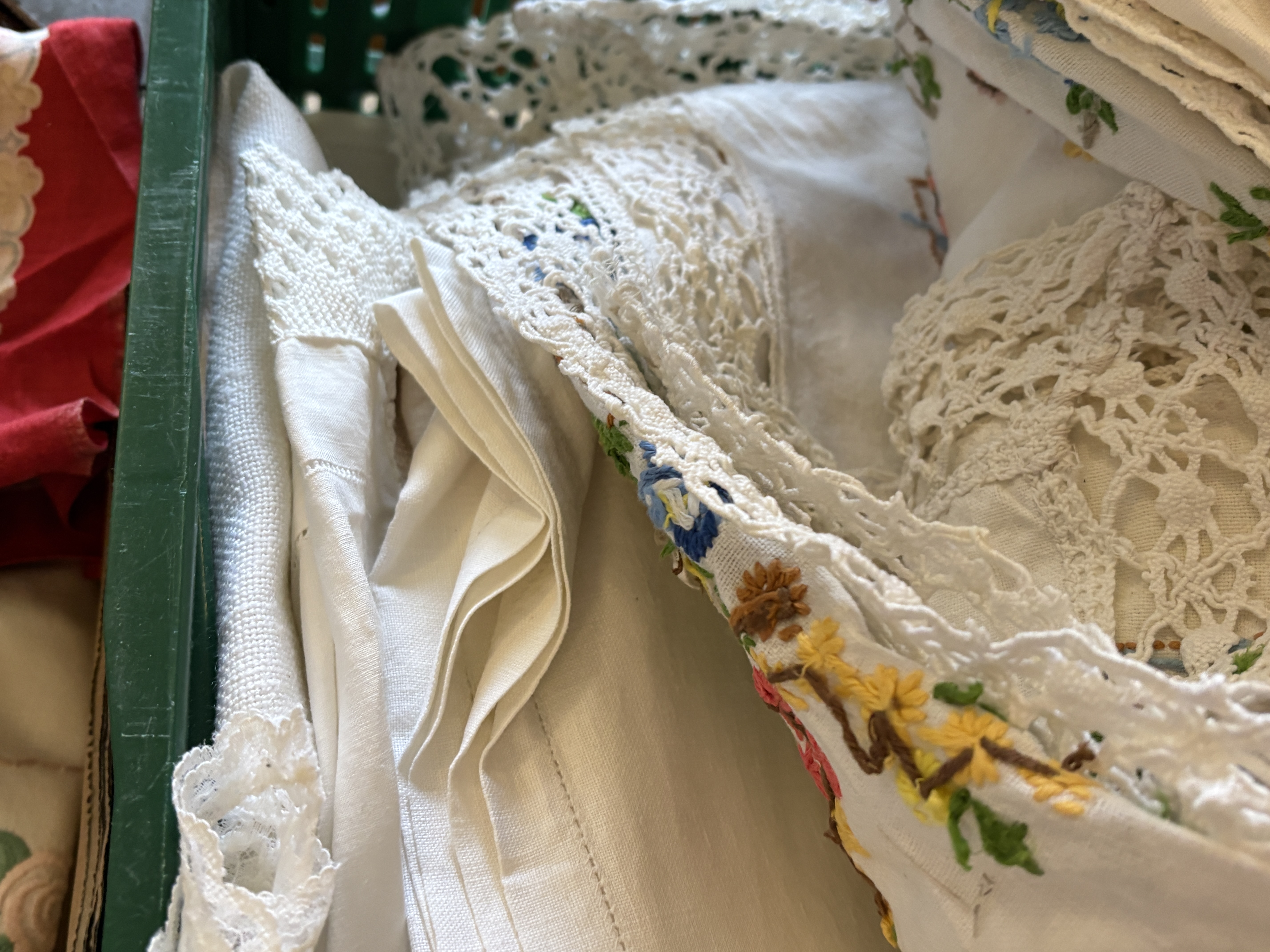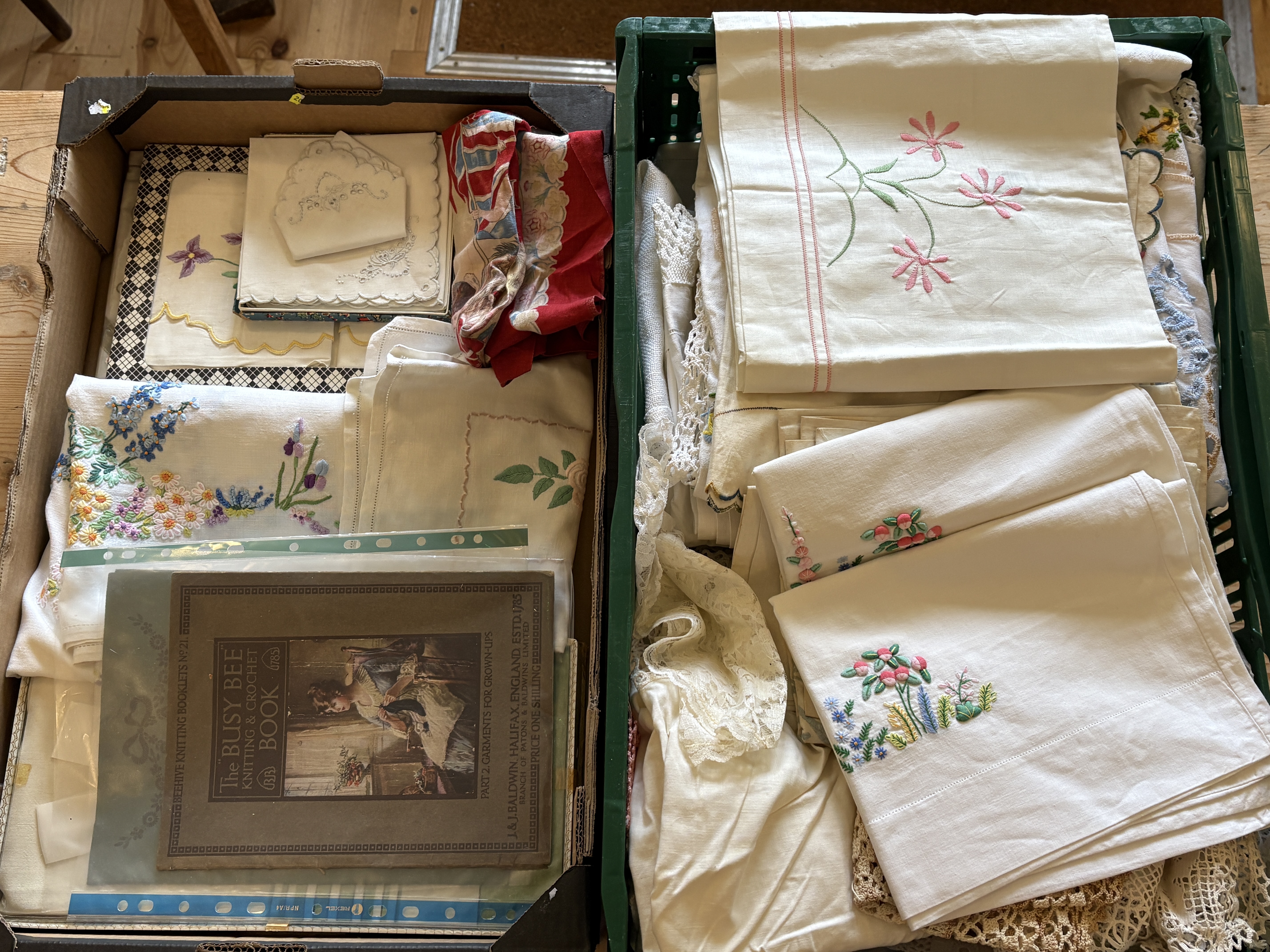 This extensive lot comprises two containers of vintage household linens and textile ephemera, dating from the early to mid-20th century. The collection features a variety of white cotton and linen pieces, including tablecloths, napkins, and runners. Many items are decorated with intricate hand-embroidered floral motifs such as daisies, forget-me-nots, and irises in vibrant colours. The lot also includes several crocheted doilies and lace-trimmed textiles. Accompanying the linens is a vintage paper booklet titled The Busy Bee Knitting & Crochet Book No. 21, published by J. & J. Baldwin of Halifax, England. Dimensions: Various sizes.