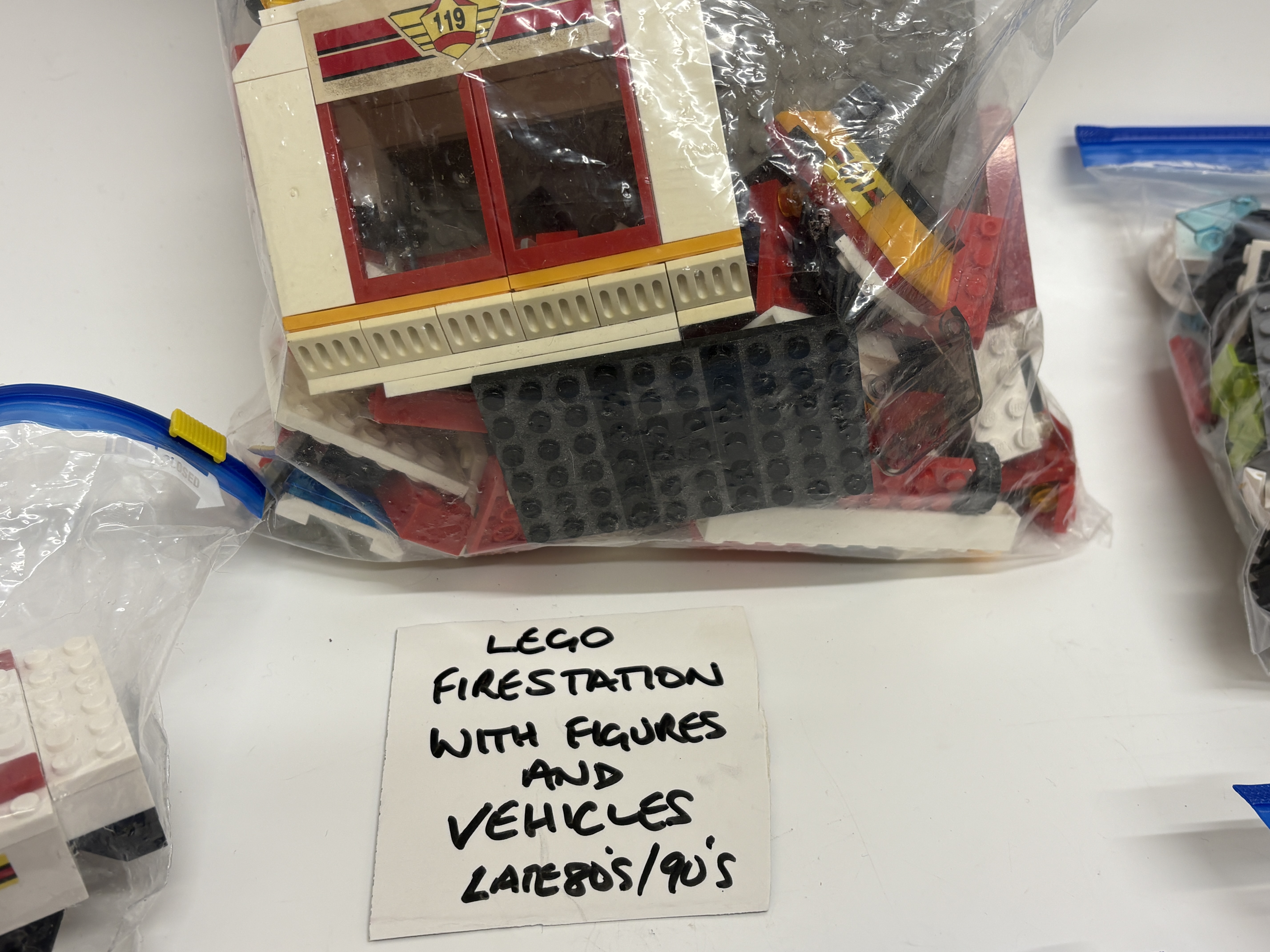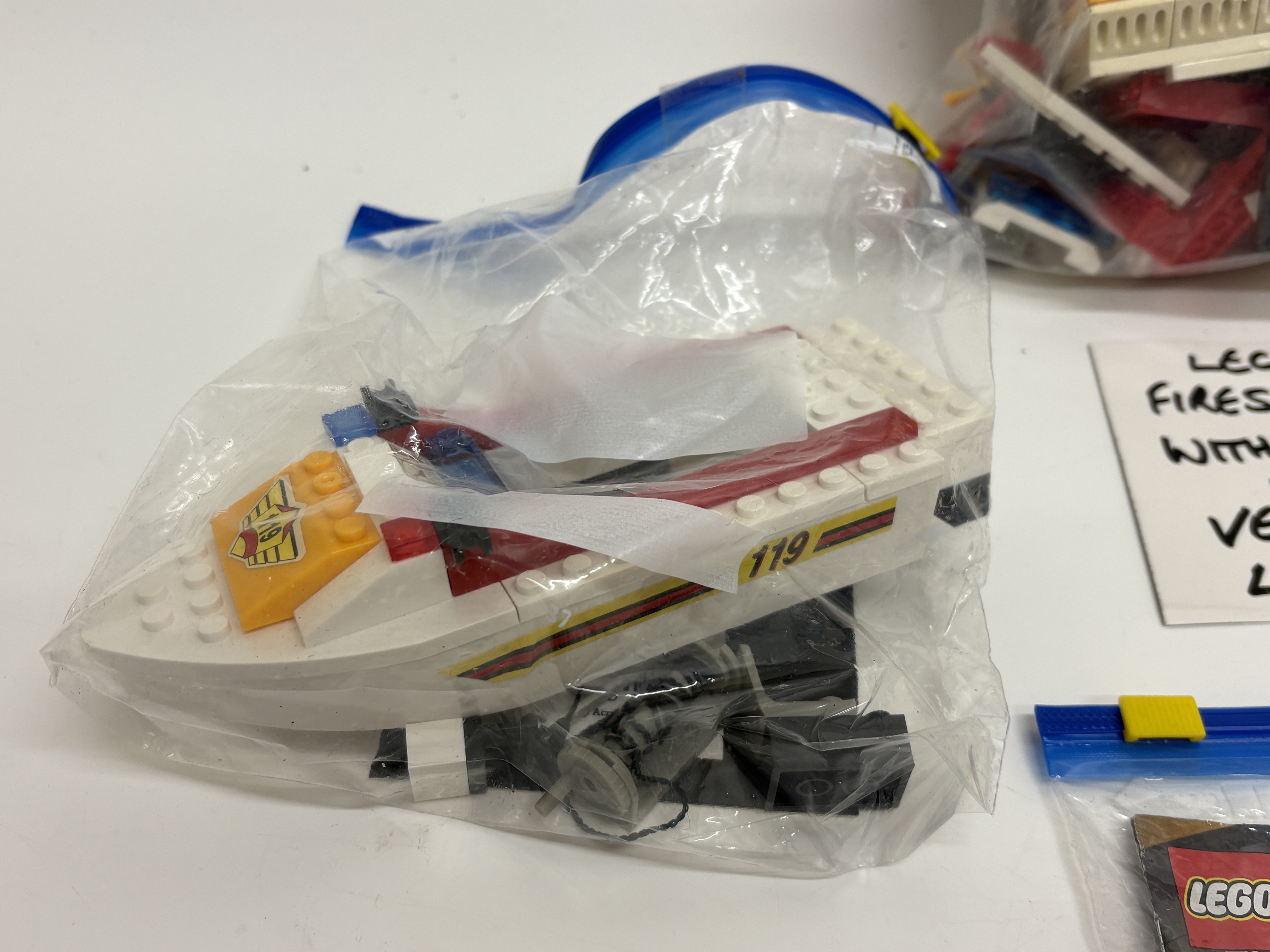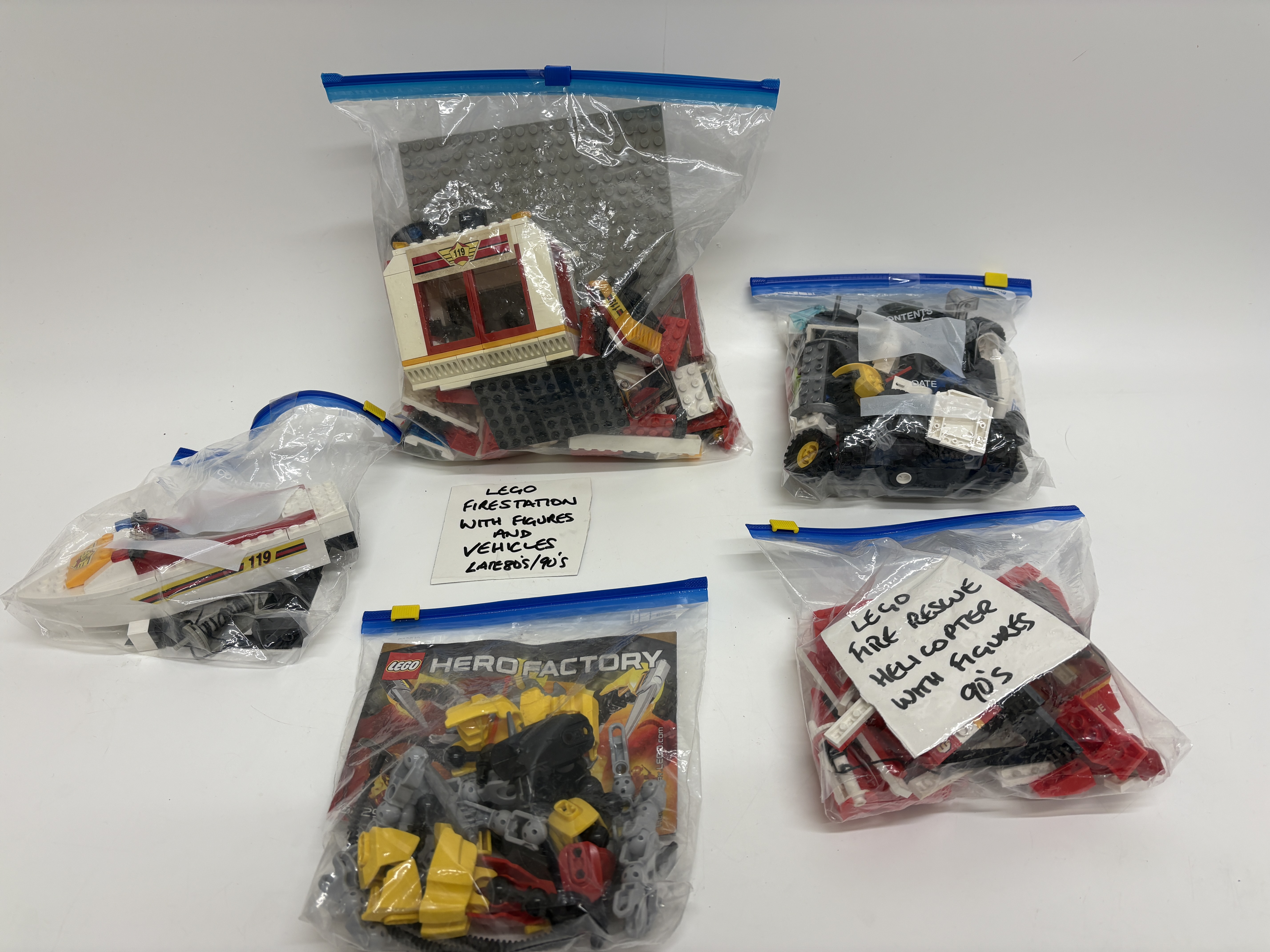 A diverse collection of LEGO building sets and components manufactured by the LEGO Group. The lot primarily focuses on the vintage Town Fire Rescue subtheme from the late 1980s and 1990s, alongside modern action figure components. Included is a partially constructed fire boat featuring 119 decals and fire department livery, a vintage fire station with associated figures and vehicles, and a fire rescue helicopter likely dating from the mid-1990s. The collection also contains a significant quantity of assorted black and white components, including various tyres and wheel rims. Representing the modern era is a LEGO Hero Factory set consisting of yellow, grey, and black articulated specialty parts, accompanied by its original colour-printed instruction manual. All items are constructed from injection-moulded ABS plastic.