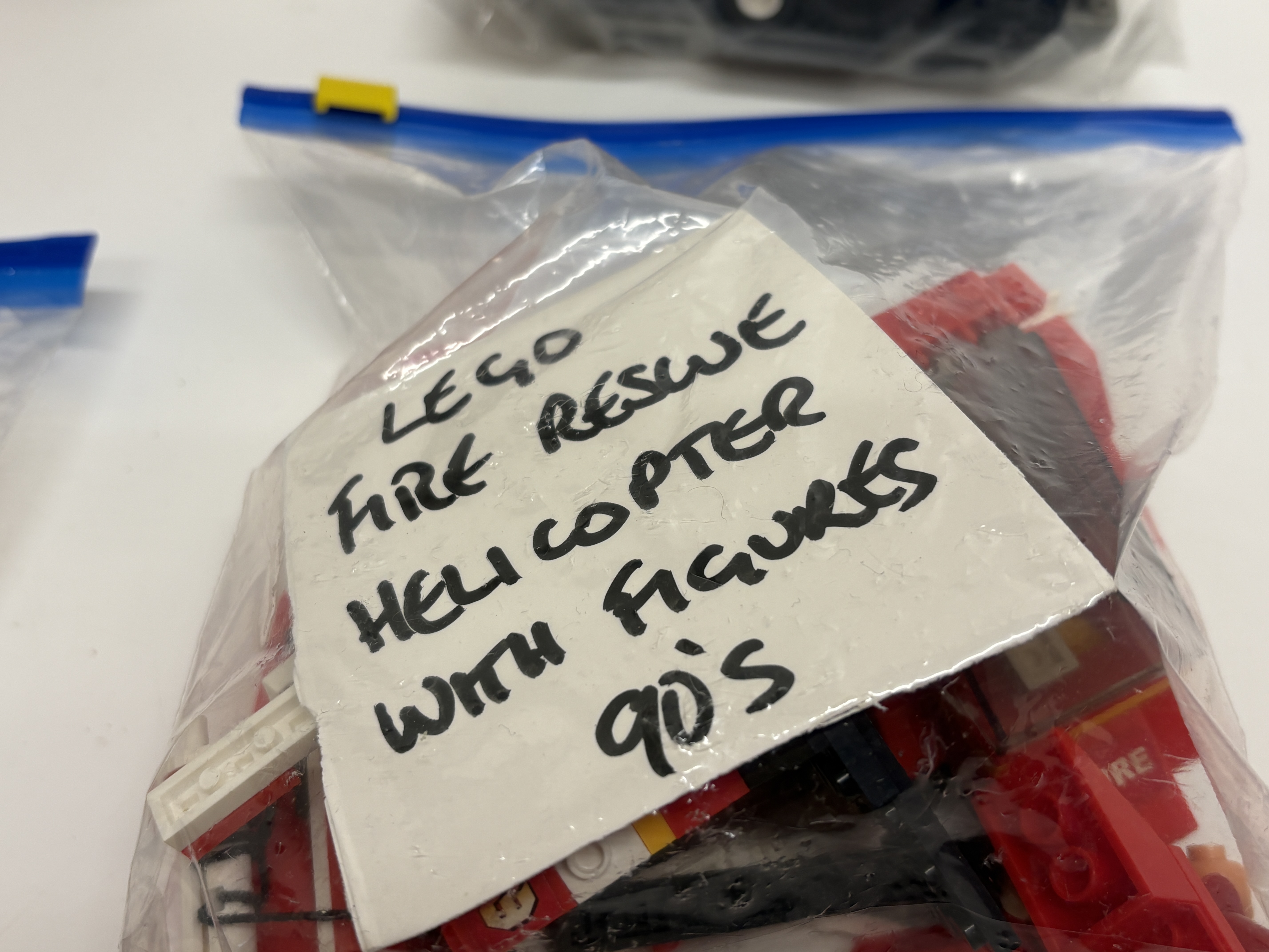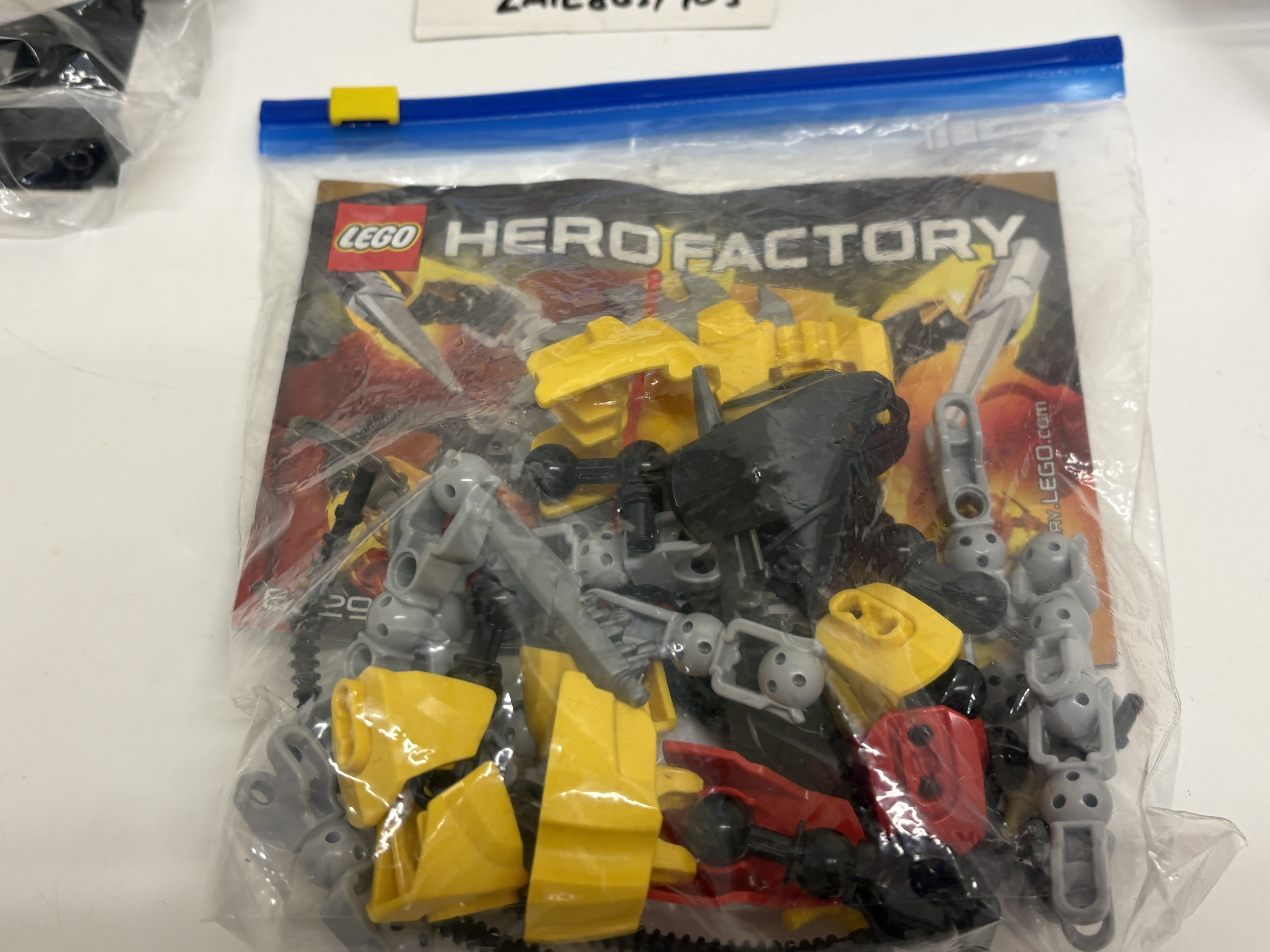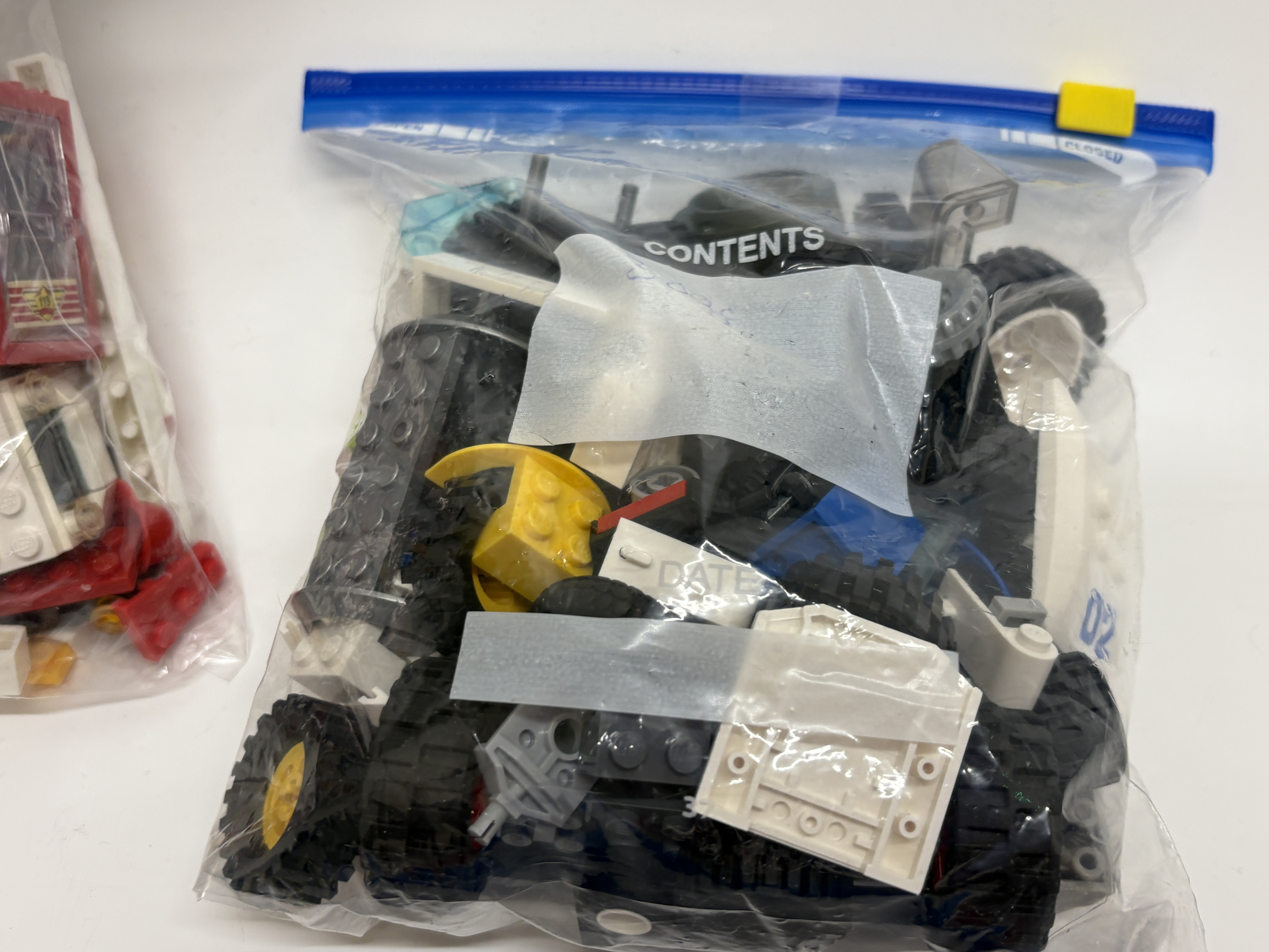 A diverse collection of LEGO building sets and components manufactured by the LEGO Group. The lot primarily focuses on the vintage Town Fire Rescue subtheme from the late 1980s and 1990s, alongside modern action figure components. Included is a partially constructed fire boat featuring 119 decals and fire department livery, a vintage fire station with associated figures and vehicles, and a fire rescue helicopter likely dating from the mid-1990s. The collection also contains a significant quantity of assorted black and white components, including various tyres and wheel rims. Representing the modern era is a LEGO Hero Factory set consisting of yellow, grey, and black articulated specialty parts, accompanied by its original colour-printed instruction manual. All items are constructed from injection-moulded ABS plastic.