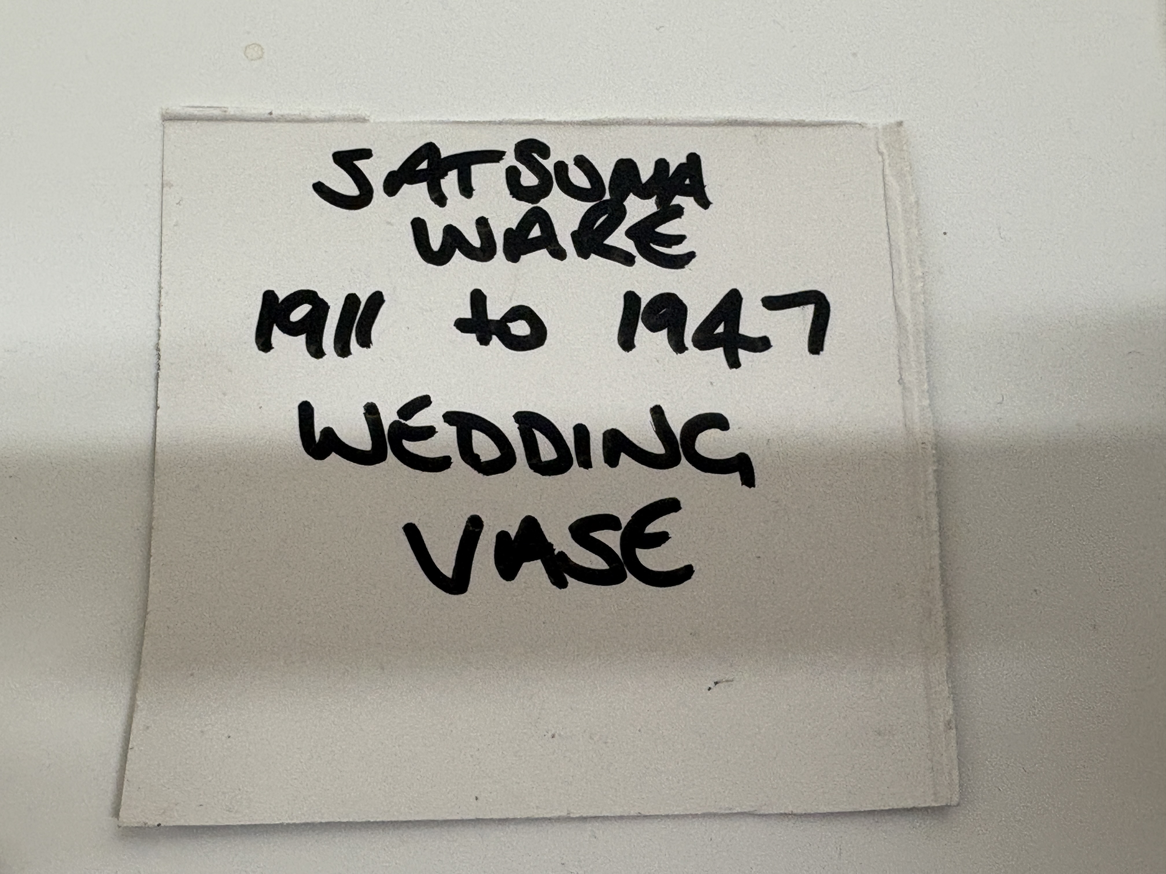 A Japanese Satsuma-style earthenware vase dating from the Taisho to early Showa era, circa 1911-1947. The vessel is decorated in polychrome enamels and moriage (raised) techniques. The primary decorative reserve depicts a traditional landscape featuring figures (bijin) and a procession near a river with mountains in the distance. The neck and sides are finished with a black ground, accented by turquoise moriage beadwork and floral cartouches. The flared rim and shoulder are further embellished with geometric and floral borders in red and gold. The underside bears a faintly incised mark, likely reading Japan. This piece is accompanied by a handwritten note identifying it as a wedding vase. Measurements: Not provided.