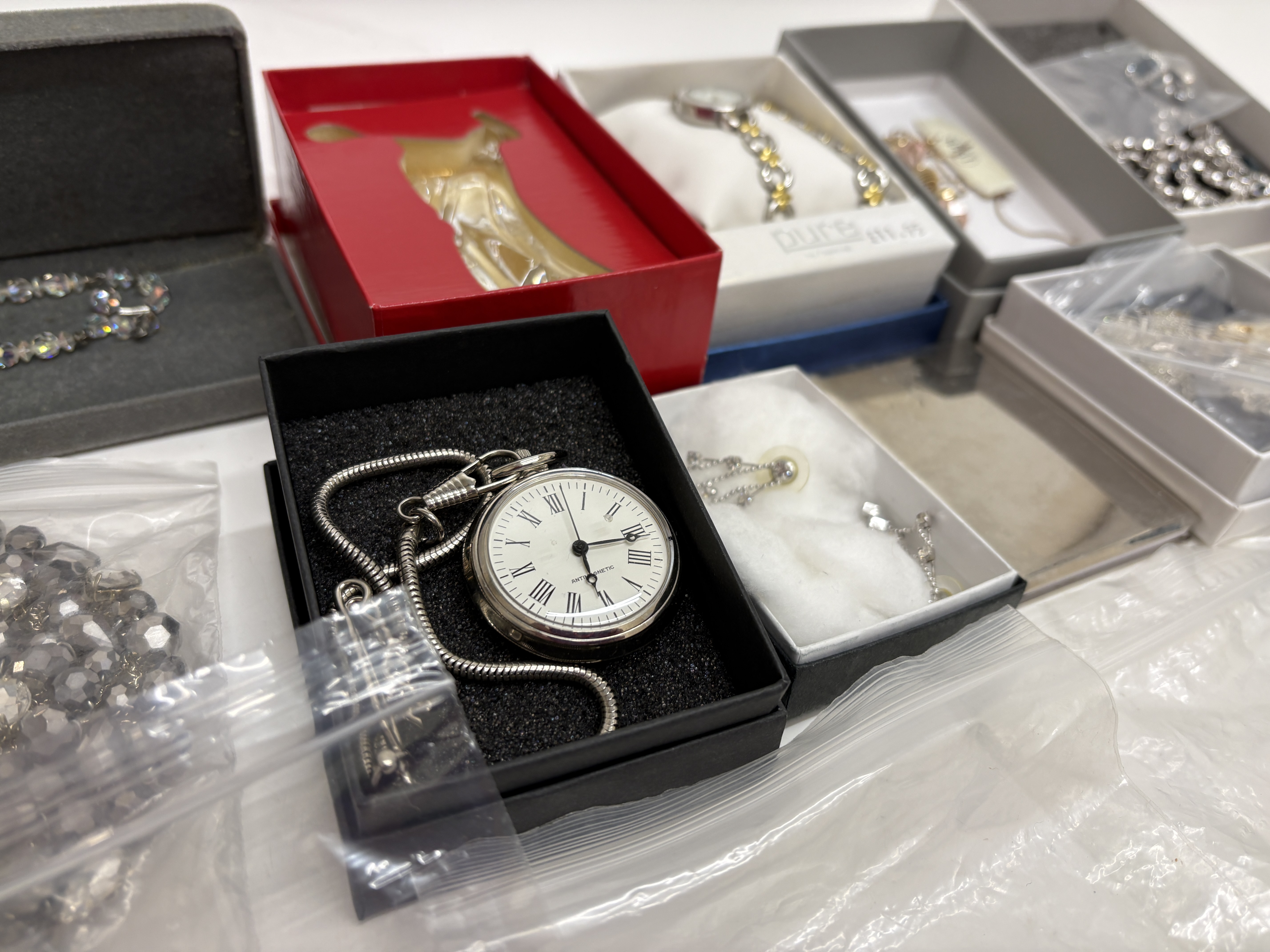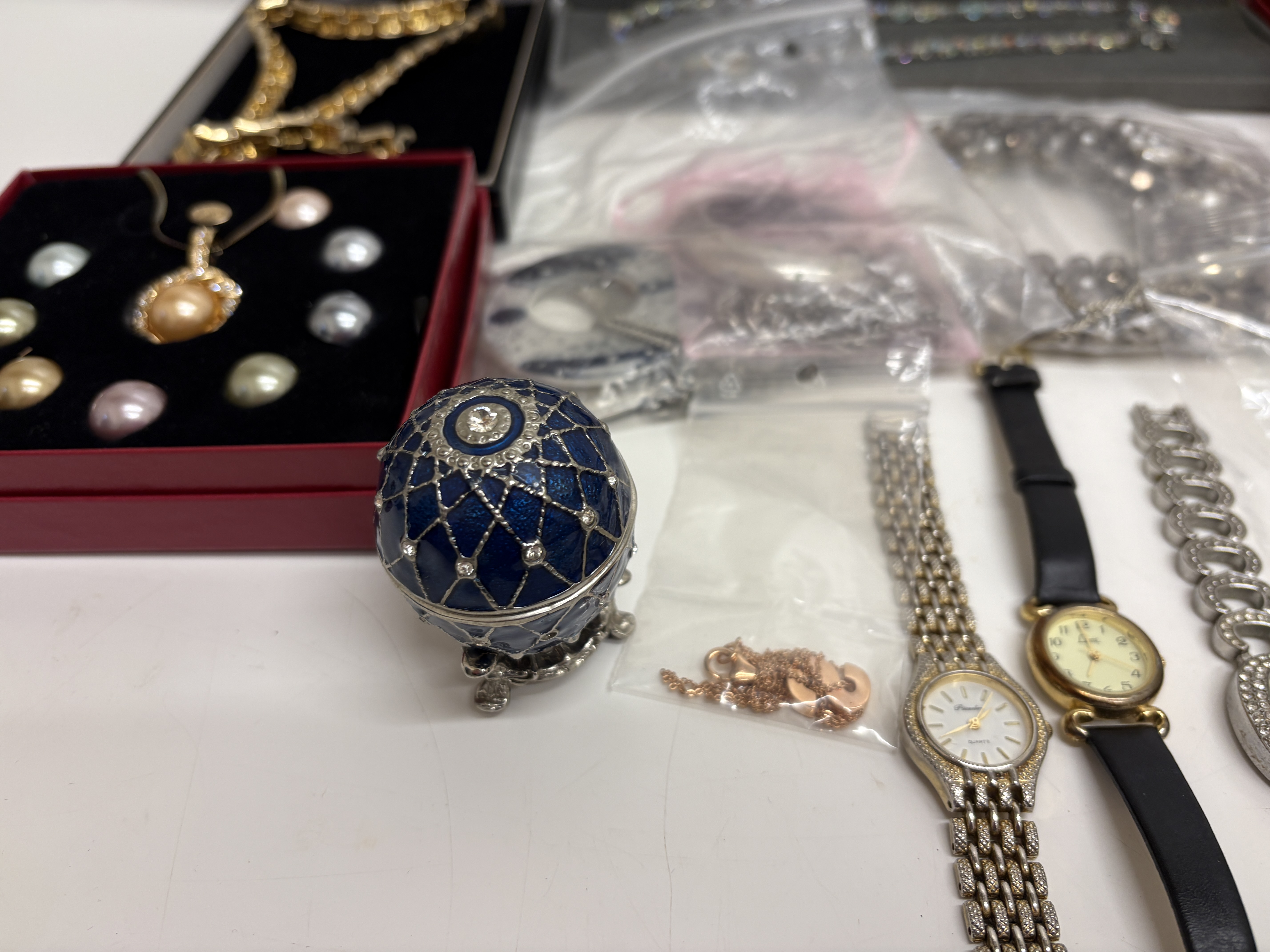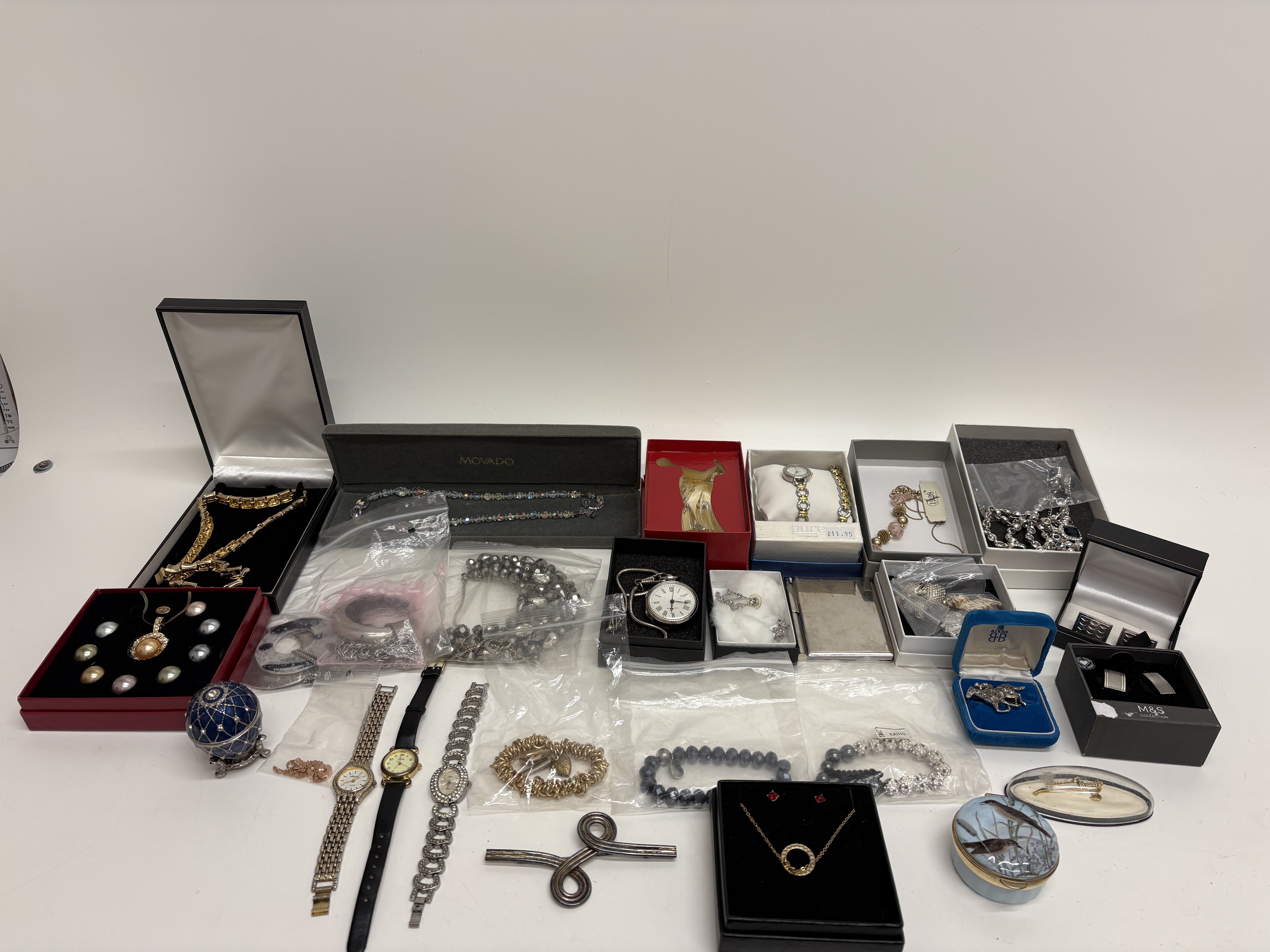 A comprehensive assortment of costume jewellery, wristwatches, and decorative objects. The collection features a variety of timepieces, including a silver-tone open-face pocket watch with a white Roman numeral dial and Antimagnetic marking on a snake chain, a Limit quartz wristwatch on a black leather strap, a rhinestone-set silver-tone bracelet watch, and a Pure by Coppercraft two-tone bracelet watch. Jewellery items include a clear faceted bead necklace presented in a Movado-branded box, a pink bead and gold-tone necklace by 1928 Jewelry Co., a yellow gold-tone curb link chain, and several chunky gold-tone and faceted glass bead bracelets. Notable decorative pieces comprise a silver-tone horse and jockey brooch set with marcasite-style stones in a Birks-branded box, a large silver-tone abstract knot brooch, a miniature gold-tone sword in a display dome, and a blue enamelled Fabergé style decorative egg with silver-tone lattice work and rhinestone accents on a tripod stand. The lot also includes a boxed set of imitation pearls and M&S Collection cufflinks. Construction techniques include cast and assembled base metals, bead-stringing, and pavé-set rhinestones. No precious metal hallmarks are visible; items appear to be base metal or silver-plated. Weight and measurements not provided.