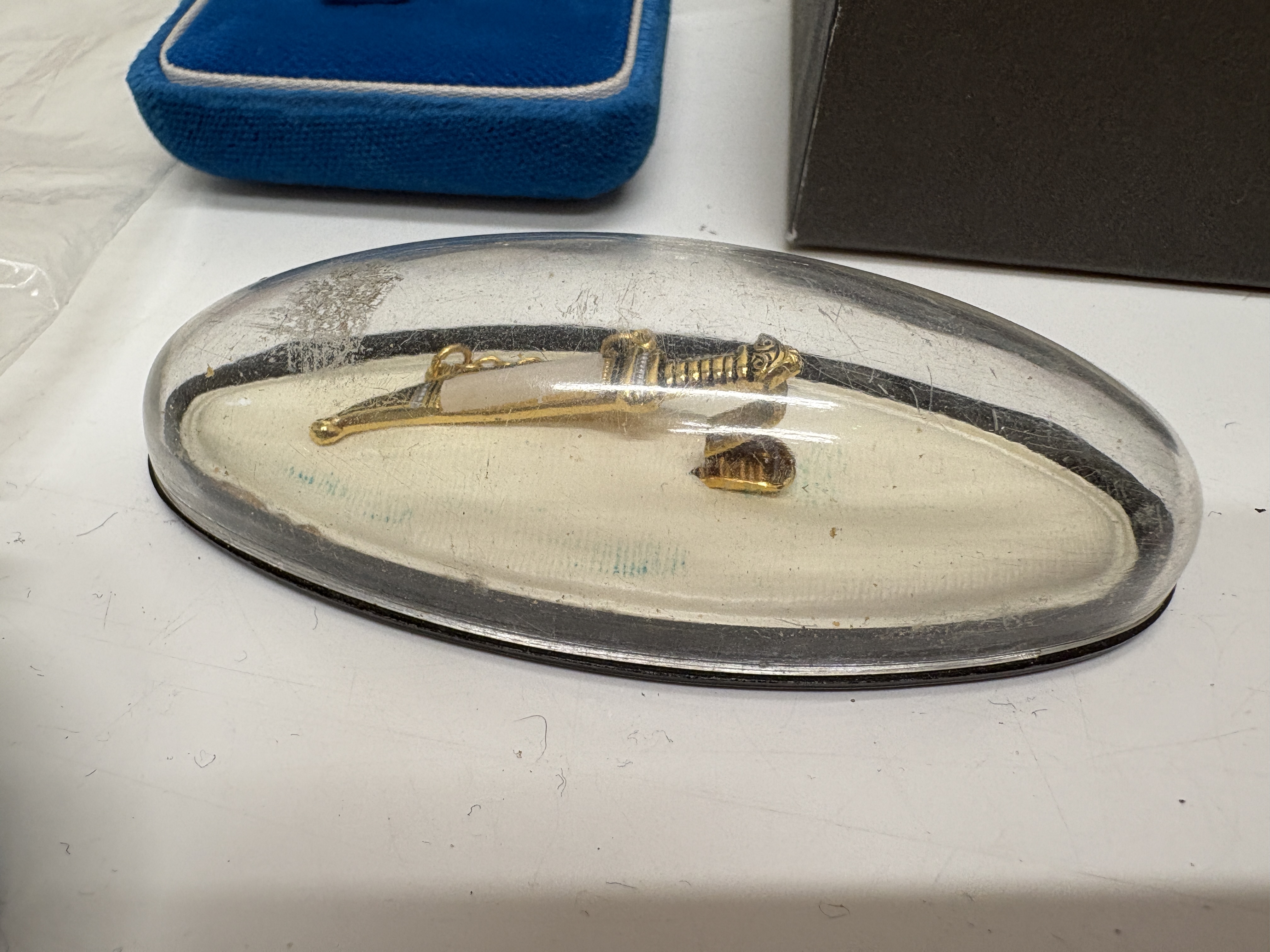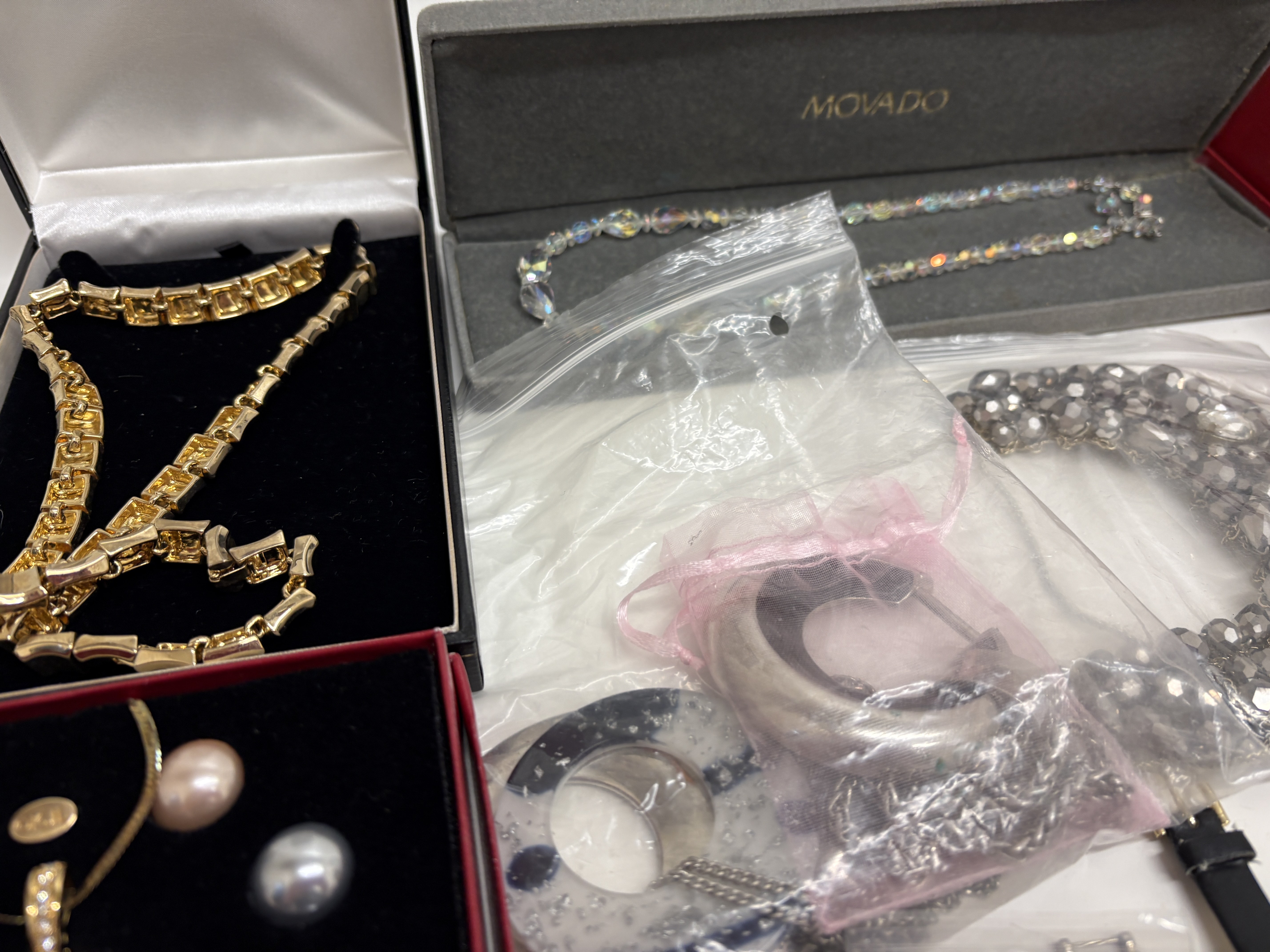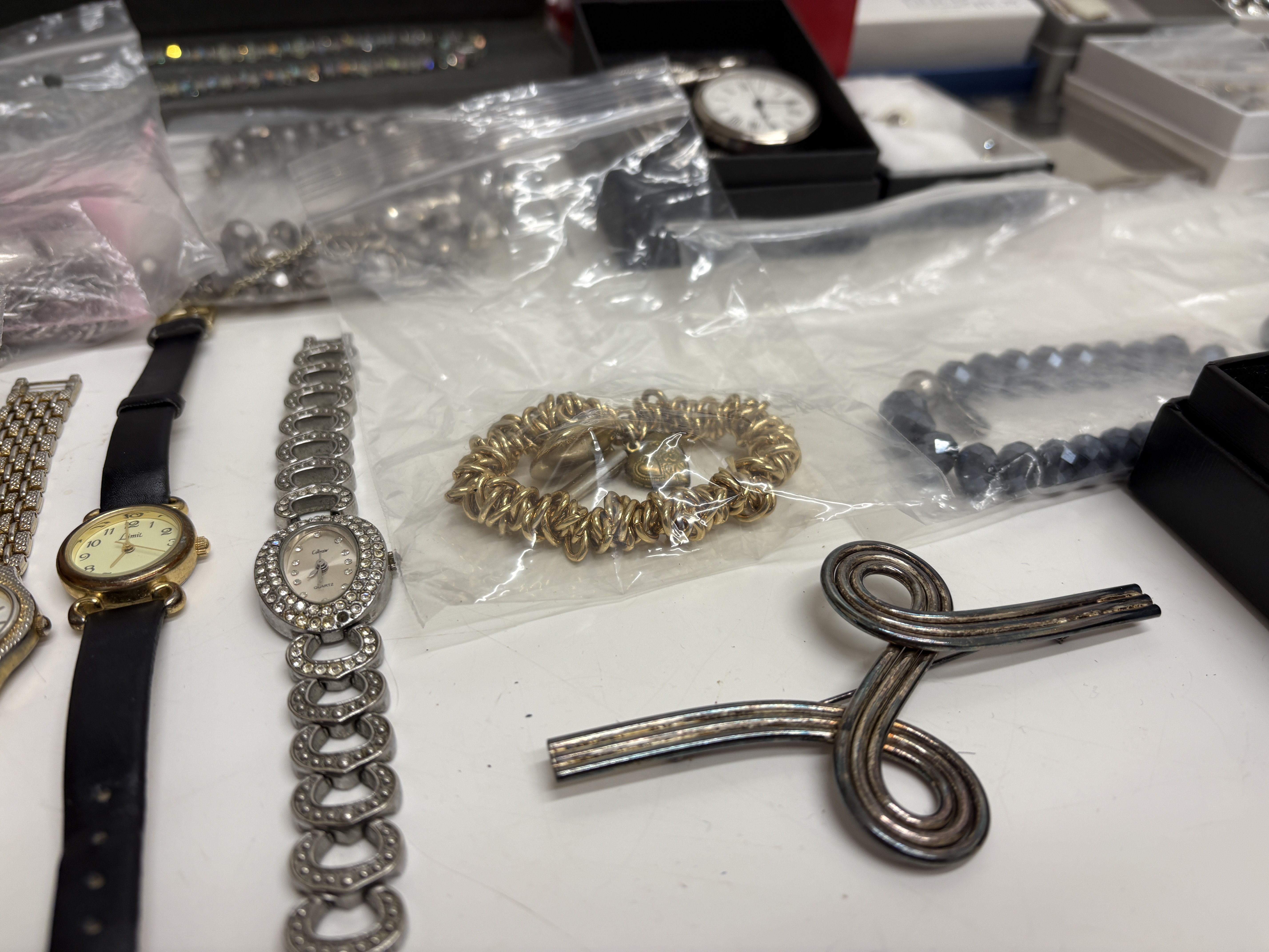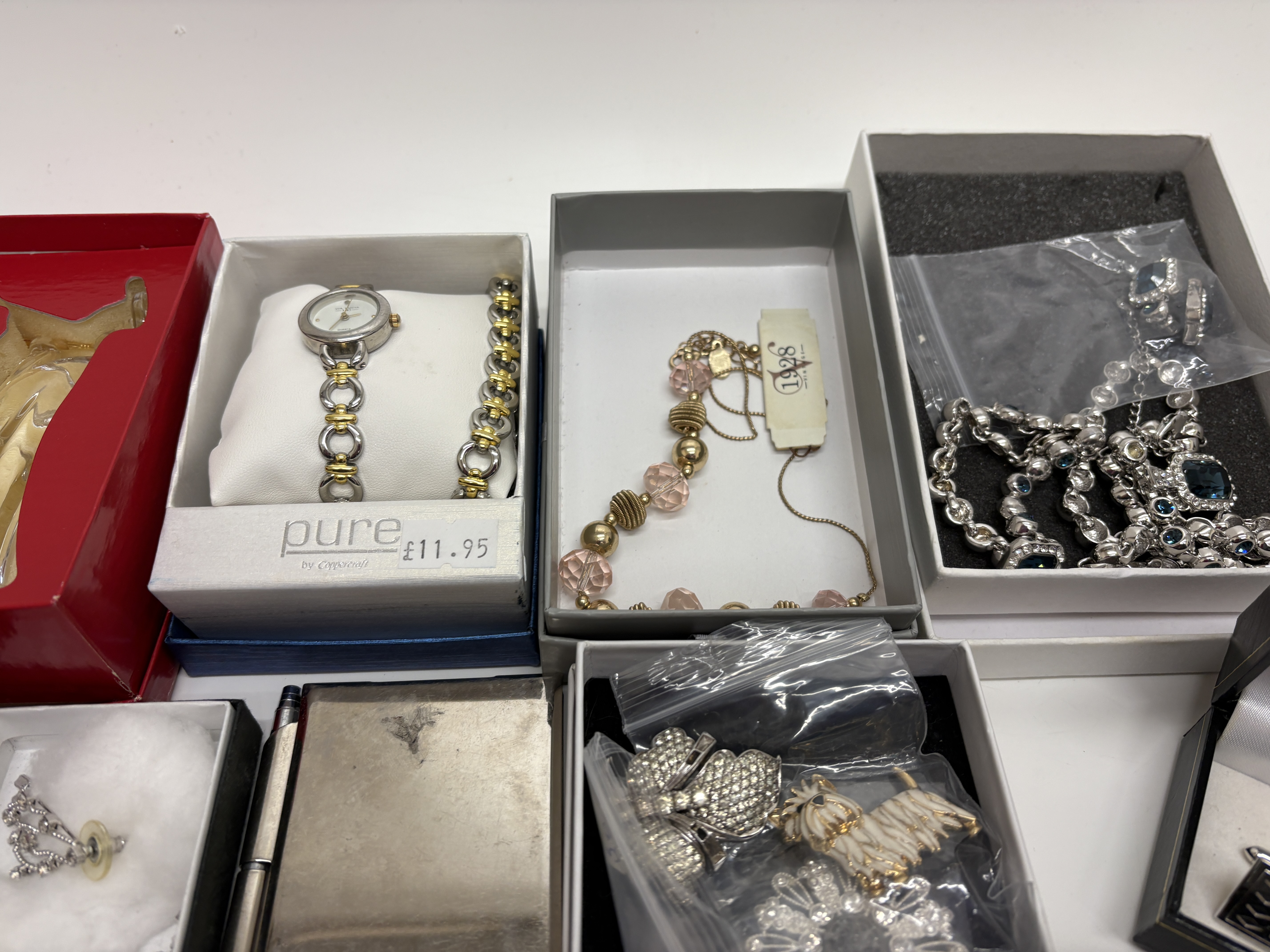 A comprehensive assortment of costume jewellery, wristwatches, and decorative objects. The collection features a variety of timepieces, including a silver-tone open-face pocket watch with a white Roman numeral dial and Antimagnetic marking on a snake chain, a Limit quartz wristwatch on a black leather strap, a rhinestone-set silver-tone bracelet watch, and a Pure by Coppercraft two-tone bracelet watch. Jewellery items include a clear faceted bead necklace presented in a Movado-branded box, a pink bead and gold-tone necklace by 1928 Jewelry Co., a yellow gold-tone curb link chain, and several chunky gold-tone and faceted glass bead bracelets. Notable decorative pieces comprise a silver-tone horse and jockey brooch set with marcasite-style stones in a Birks-branded box, a large silver-tone abstract knot brooch, a miniature gold-tone sword in a display dome, and a blue enamelled Fabergé style decorative egg with silver-tone lattice work and rhinestone accents on a tripod stand. The lot also includes a boxed set of imitation pearls and M&S Collection cufflinks. Construction techniques include cast and assembled base metals, bead-stringing, and pavé-set rhinestones. No precious metal hallmarks are visible; items appear to be base metal or silver-plated. Weight and measurements not provided.