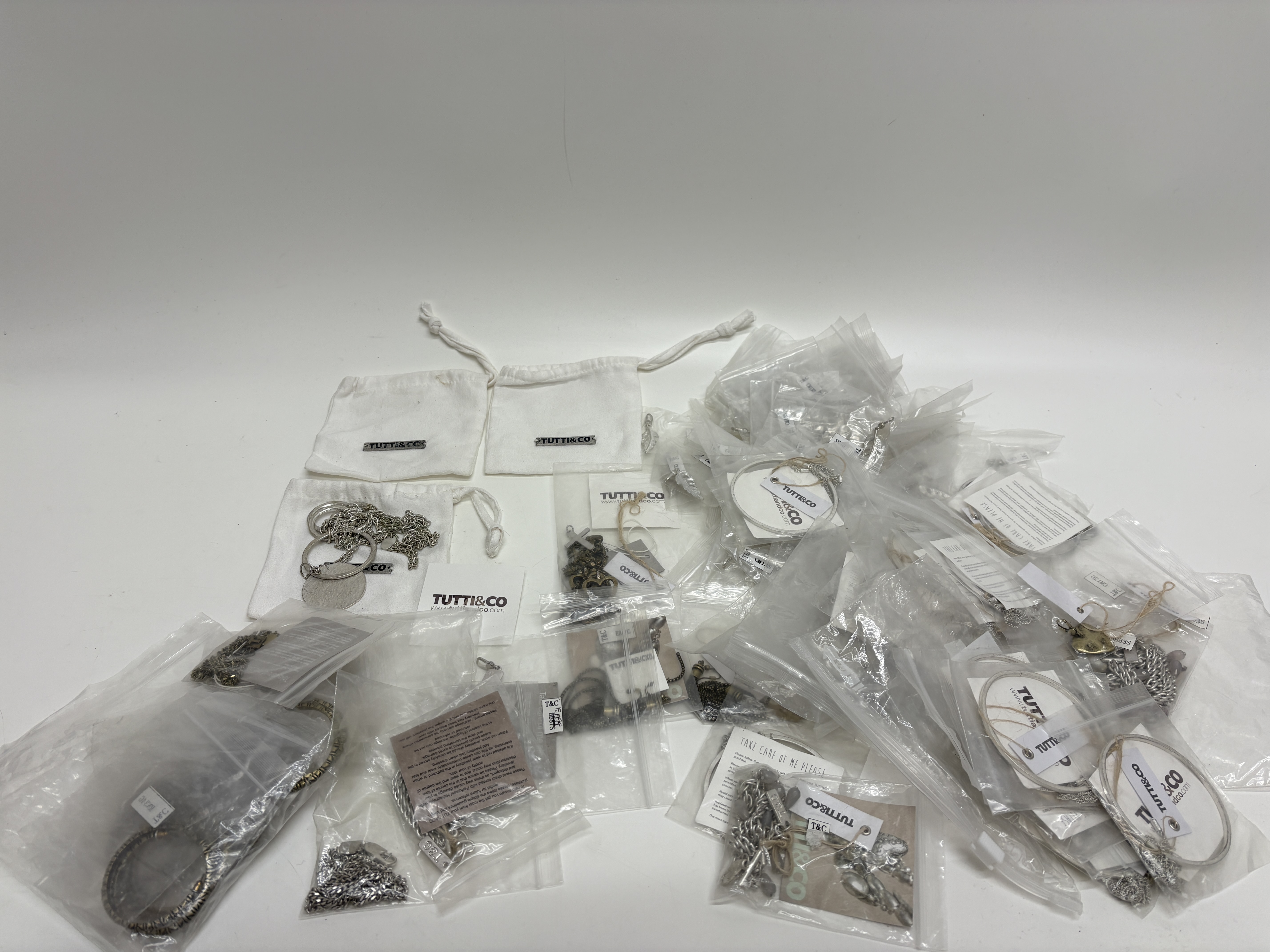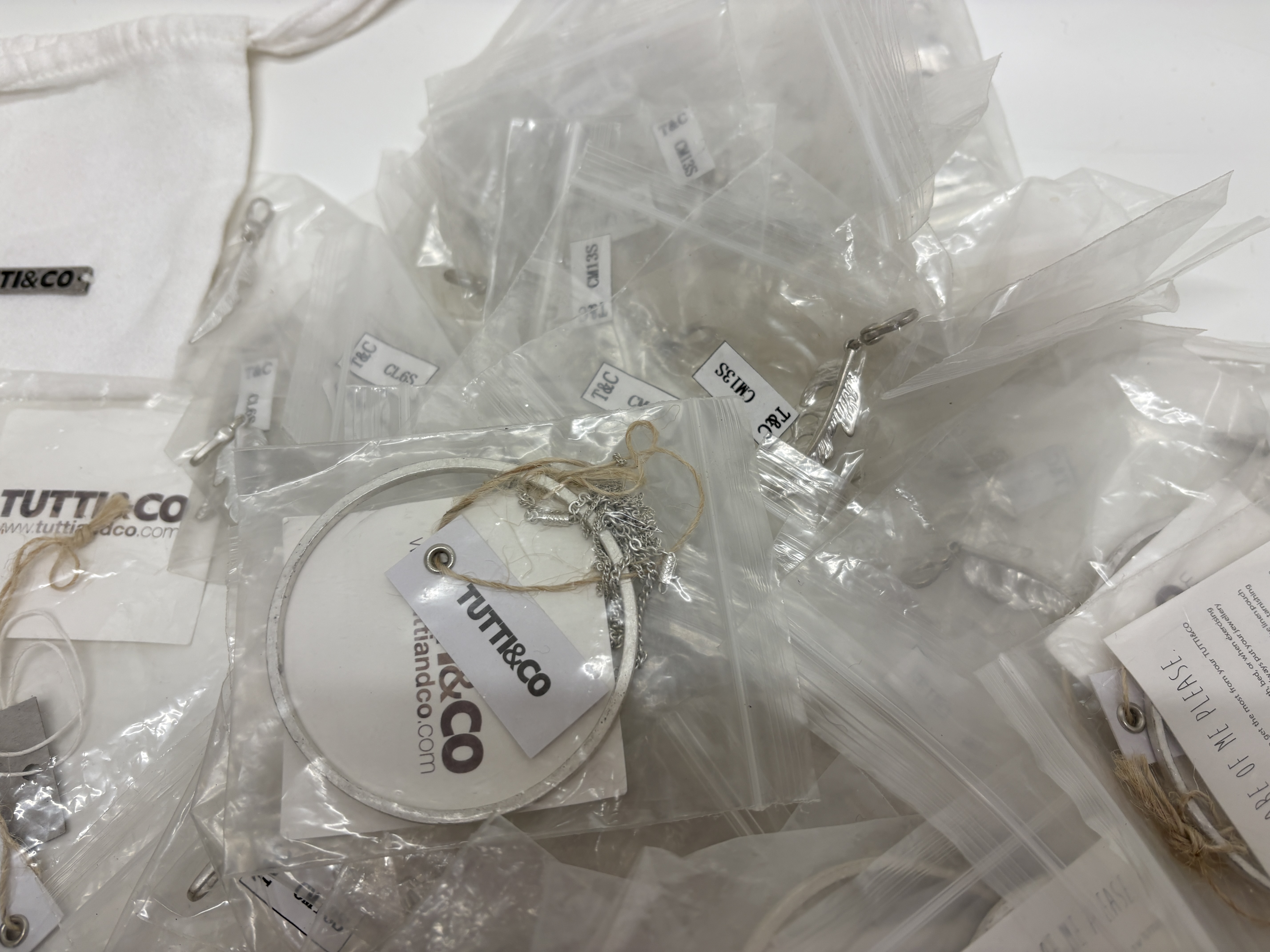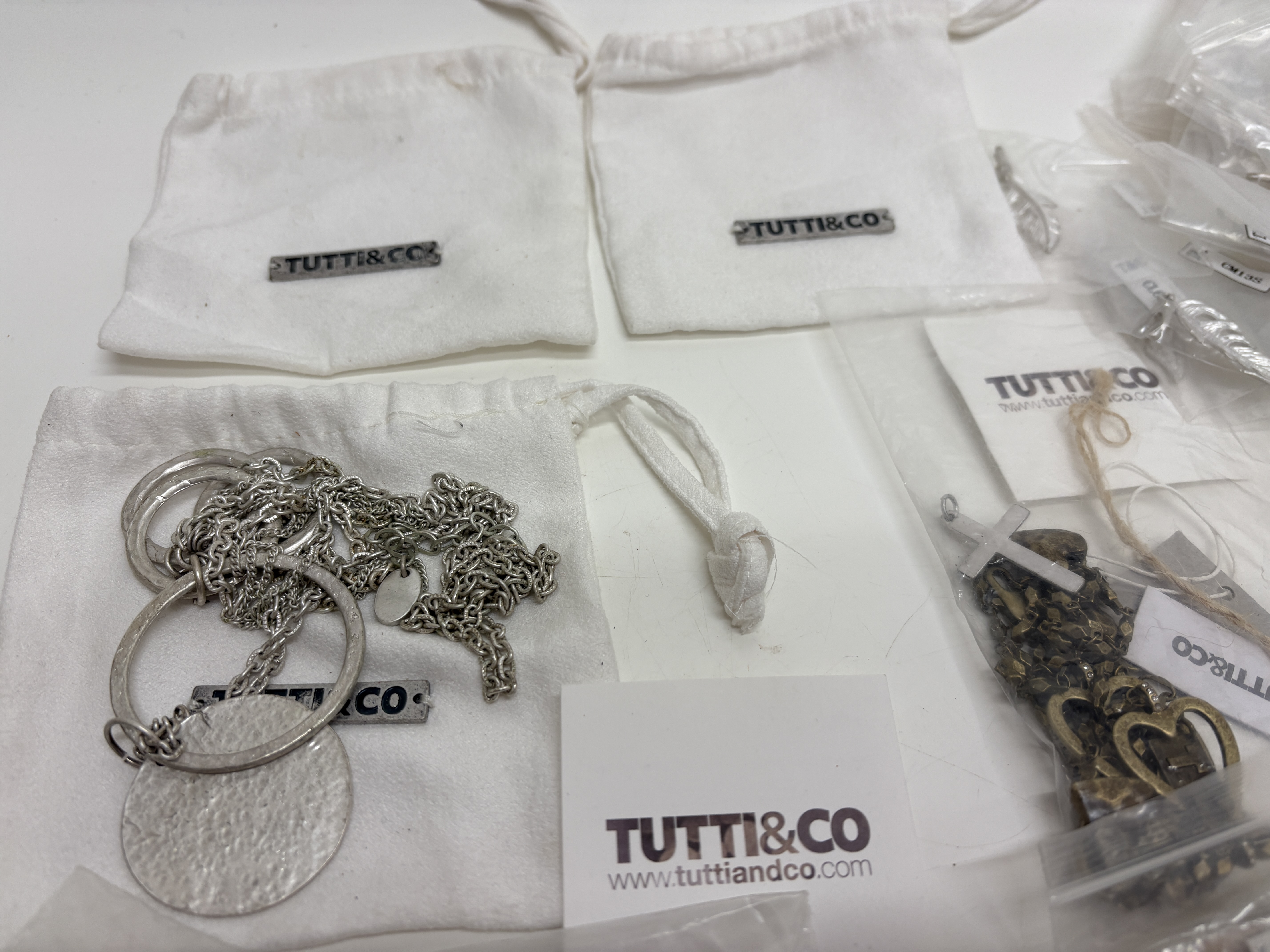 A comprehensive collection of contemporary costume jewellery by the designer Tutti & Co, comprising a variety of necklaces, bracelets, bangles, and pendants. The pieces are predominantly crafted from silver-tone and gold-tone base metals, featuring decorative hammered and textured finishes. Notable design elements include disc-shaped pendants, heart-motif charms, and semi-translucent grey beads which appear to be glass or synthetic. The collection is largely organised within original branded white fabric pouches and clear plastic bags, with many items retaining original retail tags, care cards, and alphanumeric labels such as T&C, CM13S, and B53S. No precious metal purity hallmarks were observed during inspection; the items are identified by the maker’s branding.