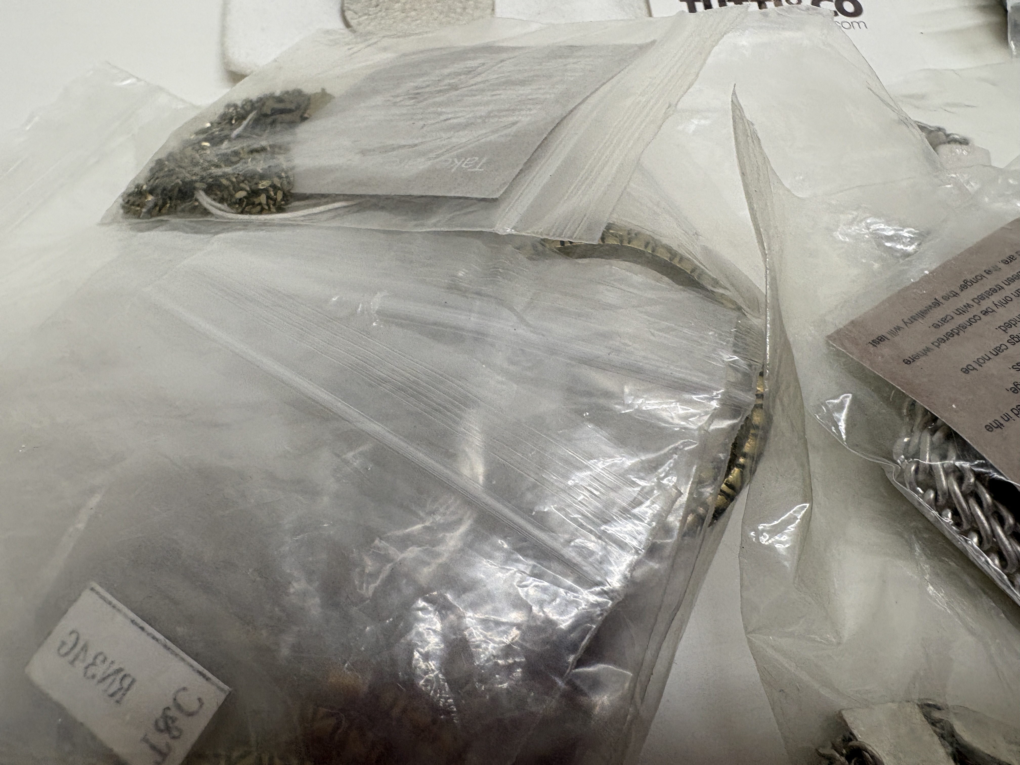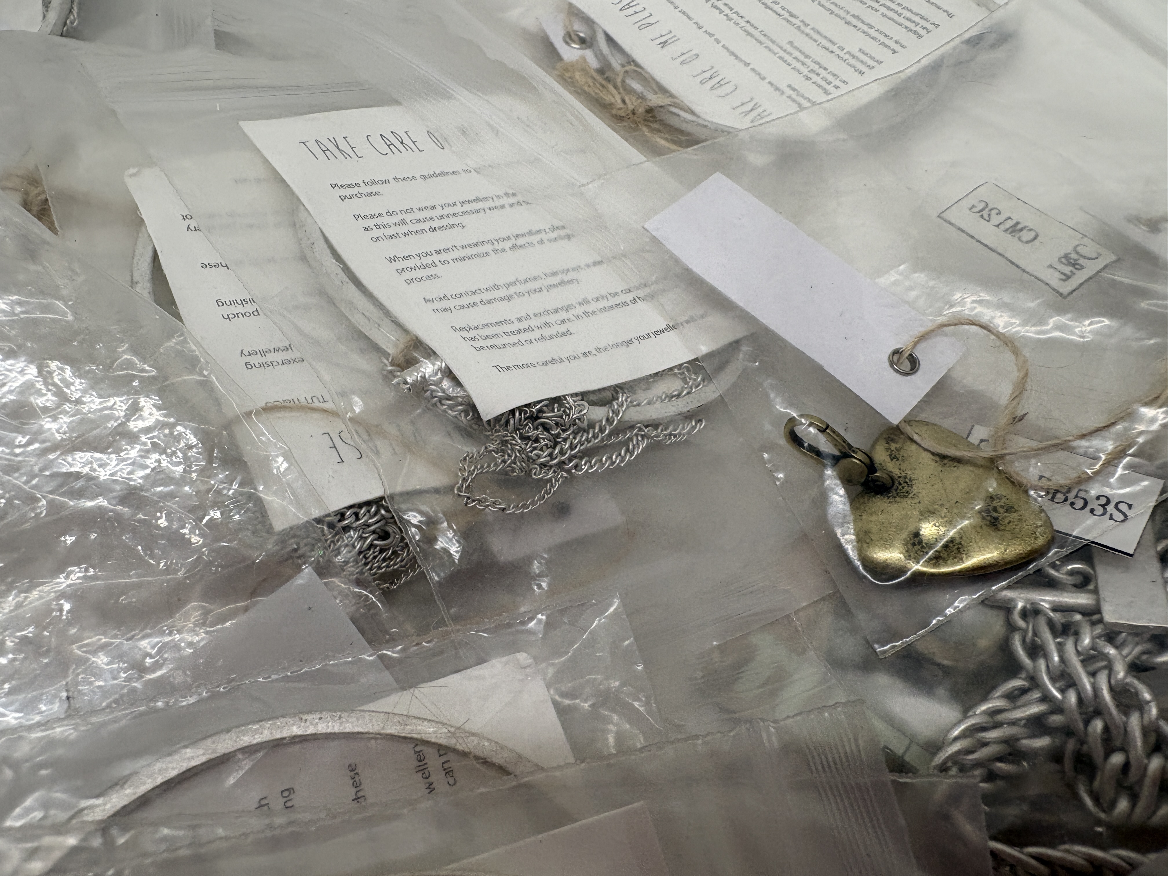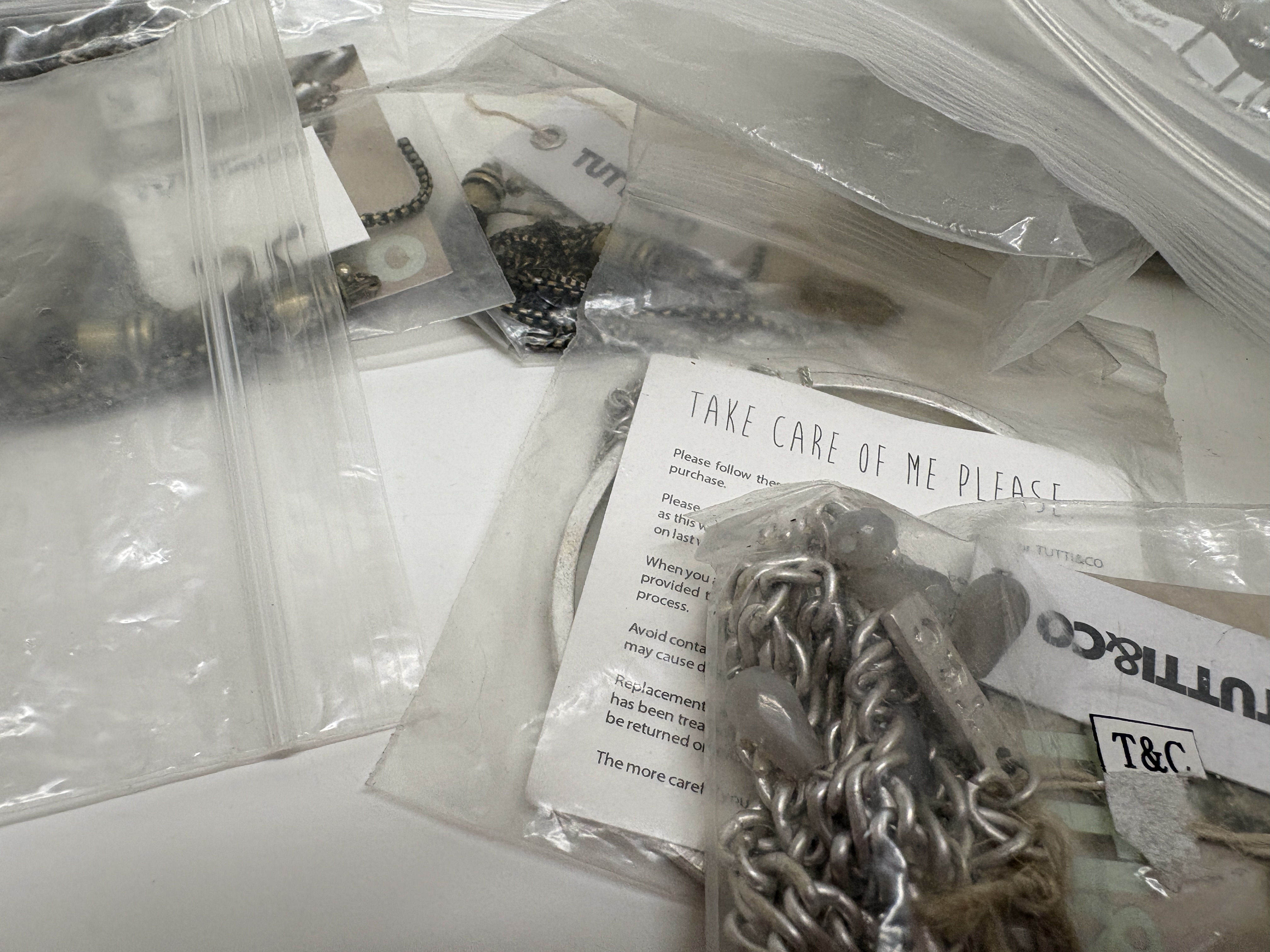 A comprehensive collection of contemporary costume jewellery by the designer Tutti & Co, comprising a variety of necklaces, bracelets, bangles, and pendants. The pieces are predominantly crafted from silver-tone and gold-tone base metals, featuring decorative hammered and textured finishes. Notable design elements include disc-shaped pendants, heart-motif charms, and semi-translucent grey beads which appear to be glass or synthetic. The collection is largely organised within original branded white fabric pouches and clear plastic bags, with many items retaining original retail tags, care cards, and alphanumeric labels such as T&C, CM13S, and B53S. No precious metal purity hallmarks were observed during inspection; the items are identified by the maker’s branding.