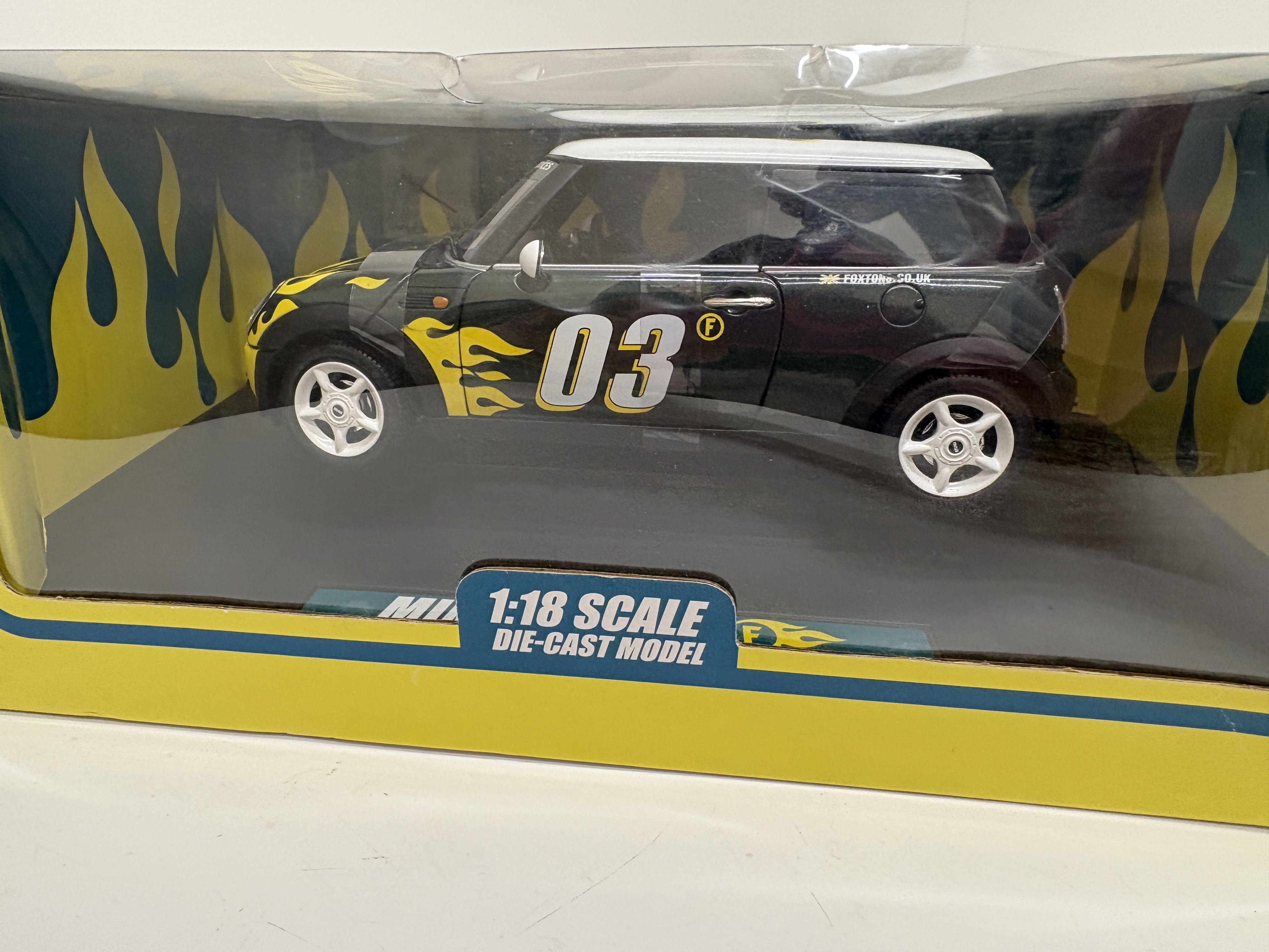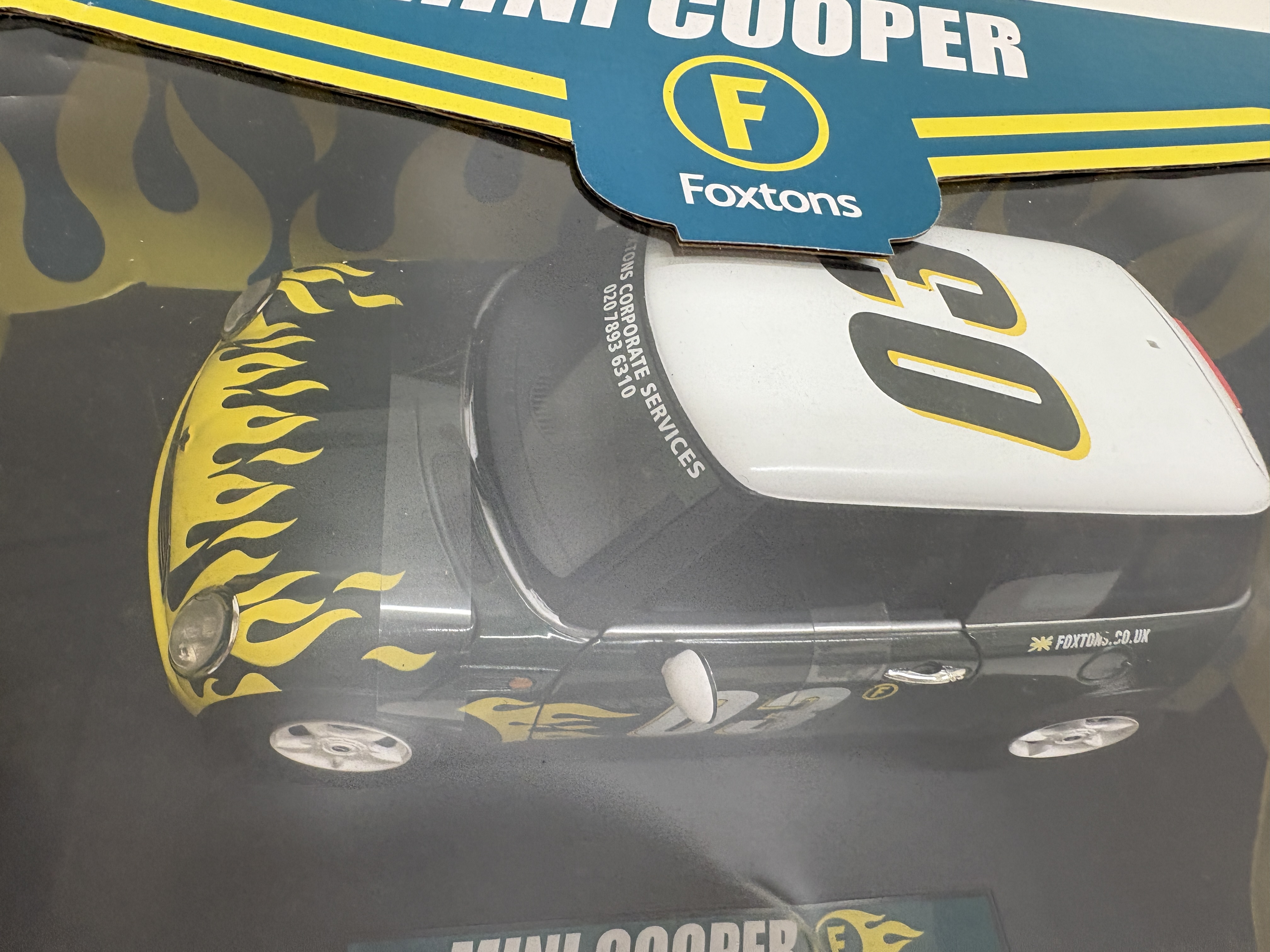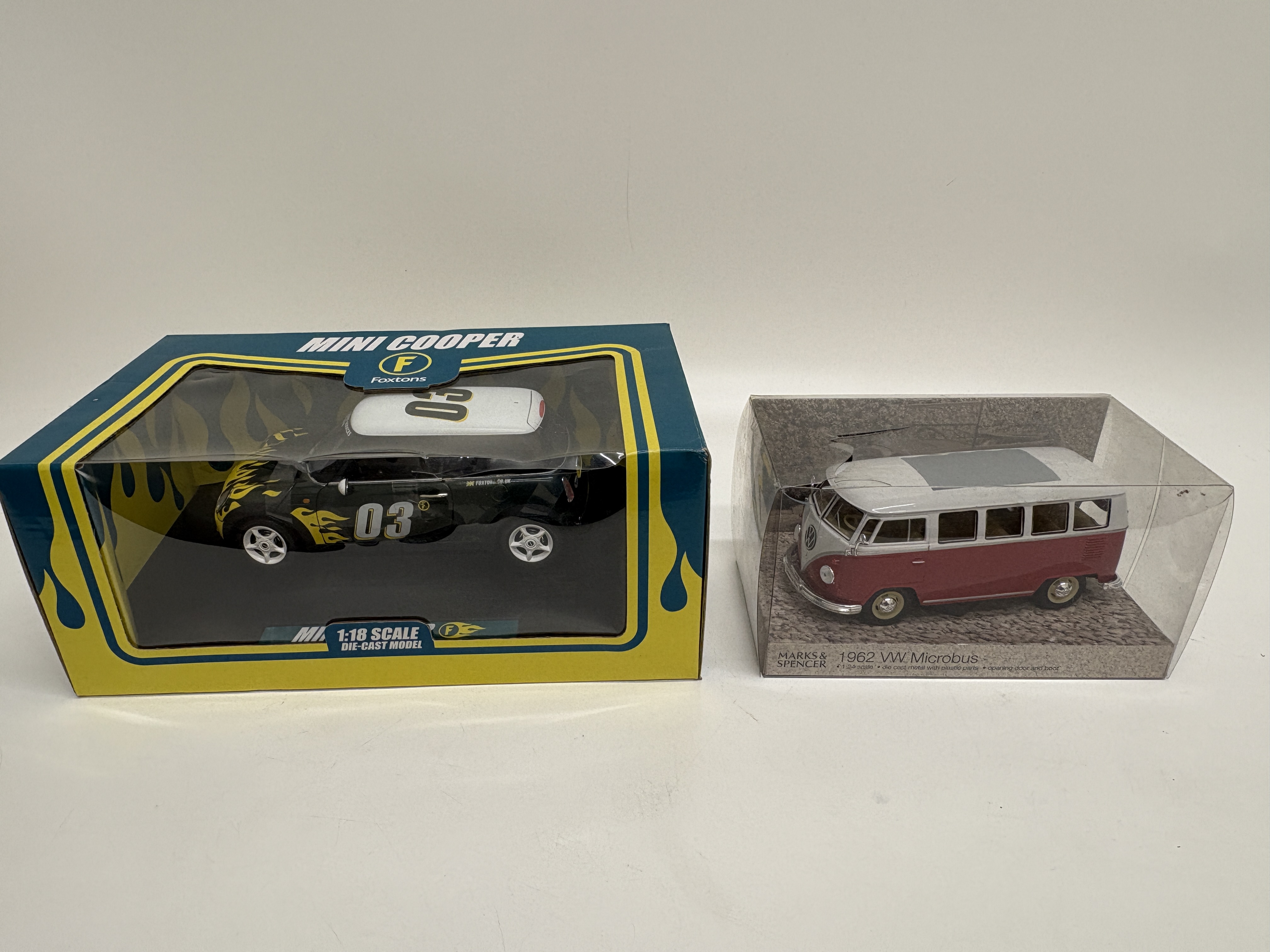 A collection of two boxed die-cast model vehicles featuring prominent British corporate branding. The first is a 1:18 scale Mini Cooper commissioned for the London estate agency Foxtons. The vehicle is finished in a black body colour with striking yellow flame graphics, a white roof numbered 03, and white five-spoke wheels. It features detailed promotional markings including Foxtons Corporate Services contact details on the windshield and the company web address on the rear quarters. The model is housed in its original blue and yellow window box. The second item is a 1:24 scale 1962 Volkswagen Microbus produced for Marks & Spencer. This model is finished in a classic red and white two-tone livery with chrome-effect bumpers and hubcaps. It features opening doors and a rear boot, presented in a clear acrylic display case with a decorative pebble-print base. Both models are constructed from die-cast metal with plastic components. Approximate measurements: Mini Cooper box 33cm x 16cm x 14cm; VW Microbus case 23cm x 11cm x 11cm.